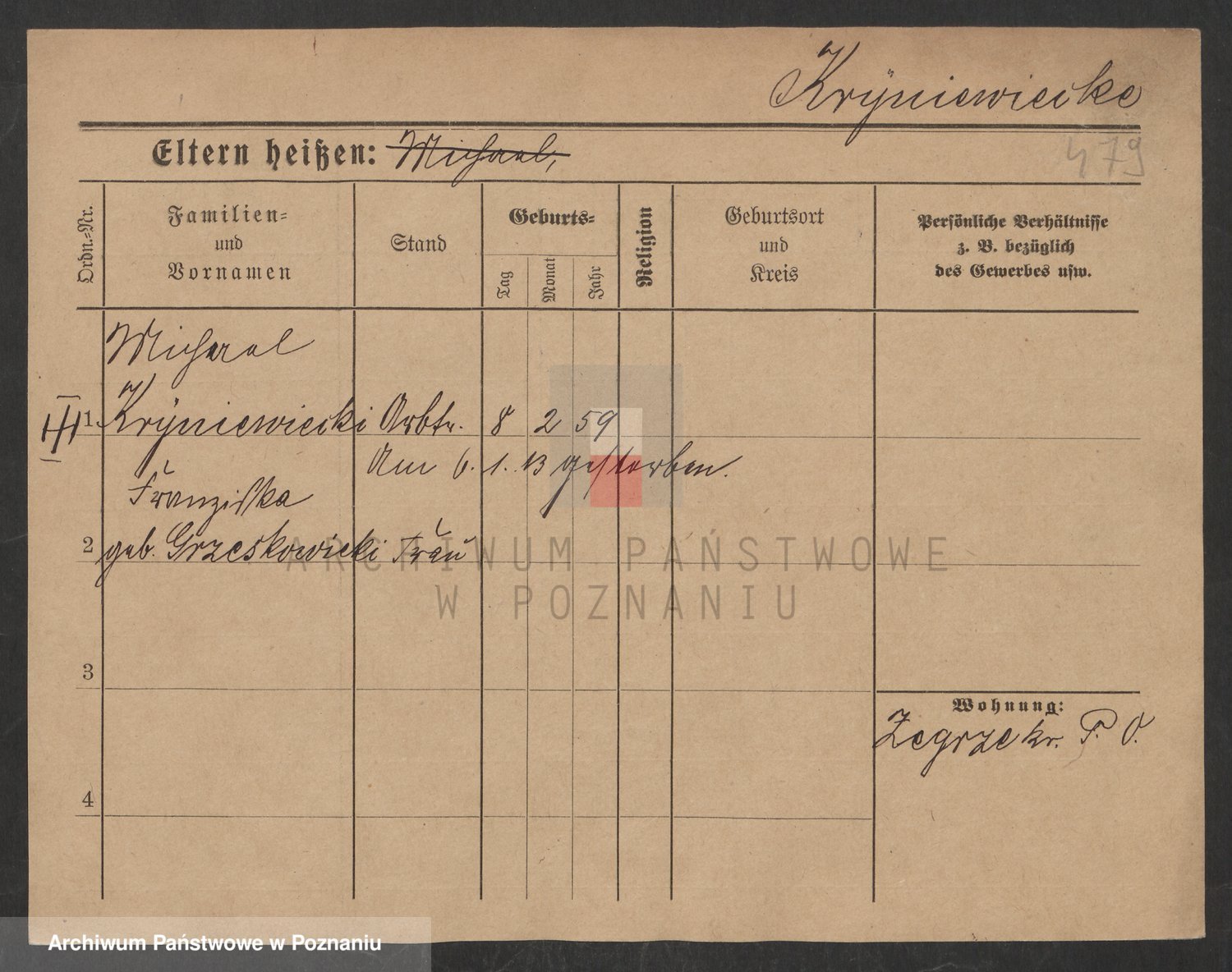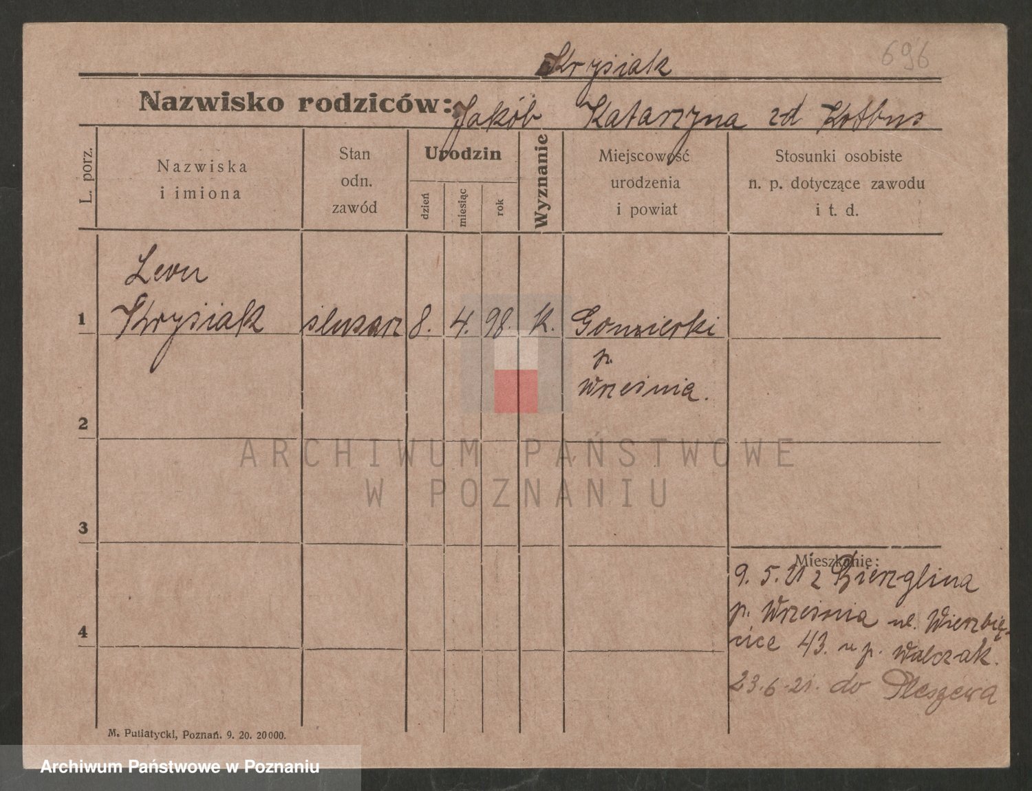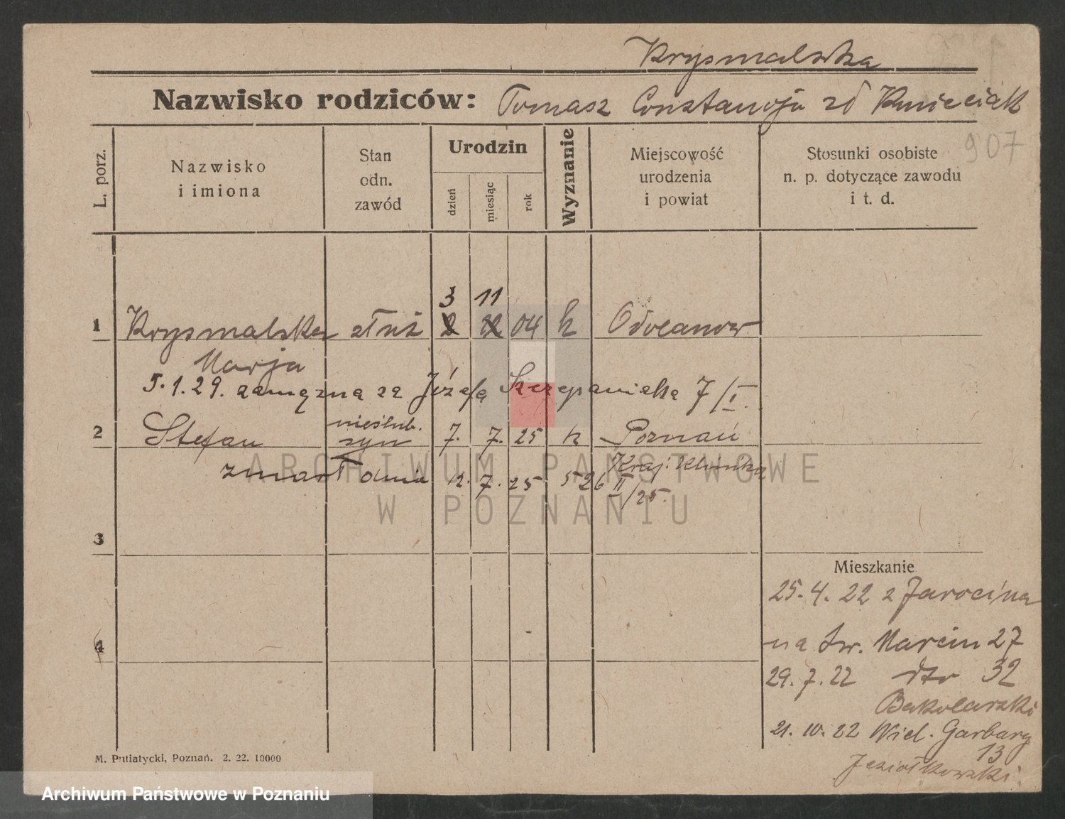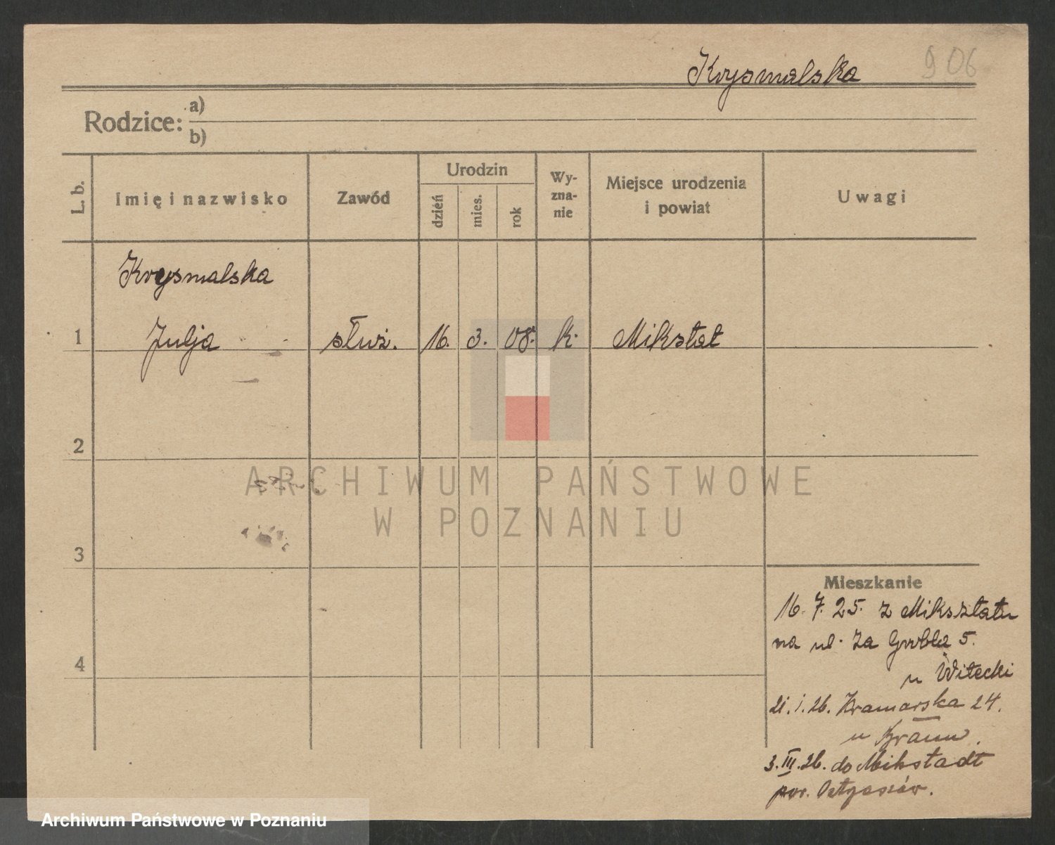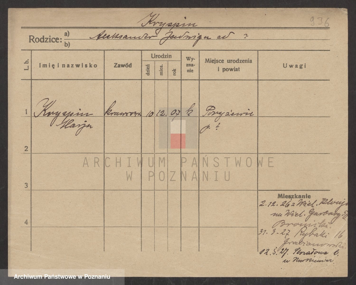 Podgląd karty osobowej dostępny jest po kliknięciu na nazwisko lub ikonkę karty. Można dokonywać powiększenia (ikony na górze) lub przechodzić między kolejnymi skanami (strzałki po bokach).
