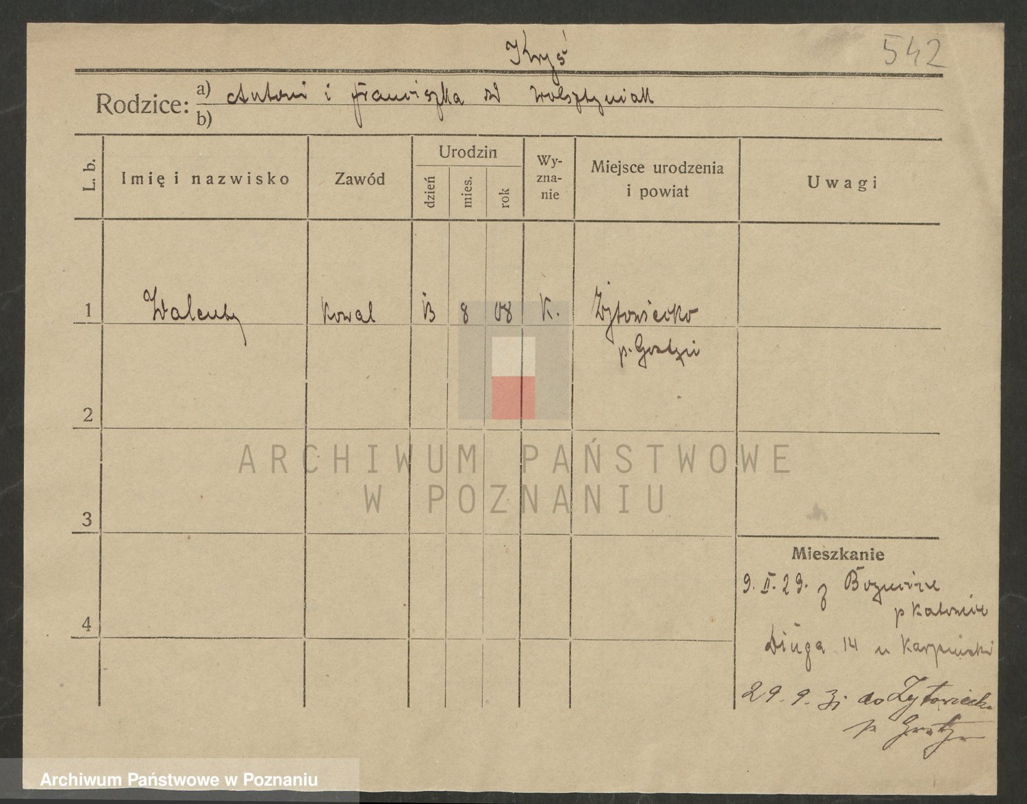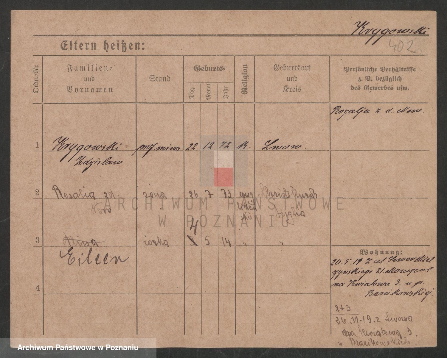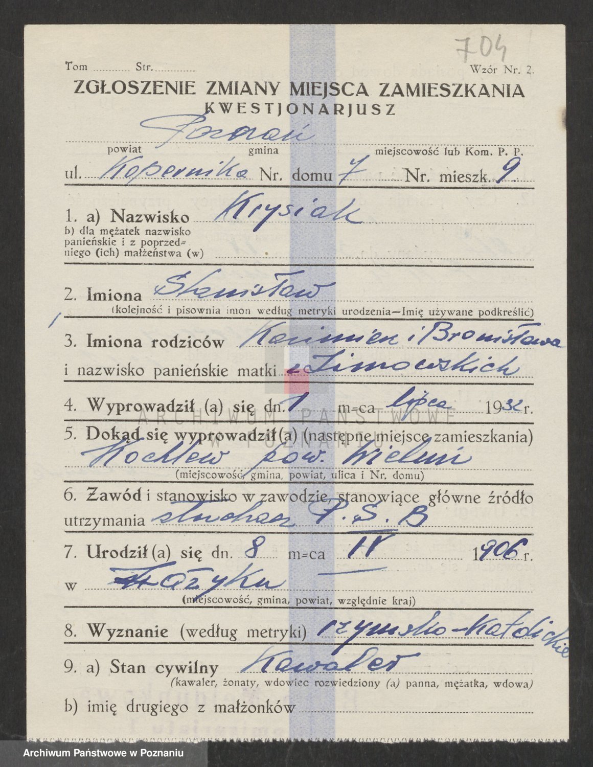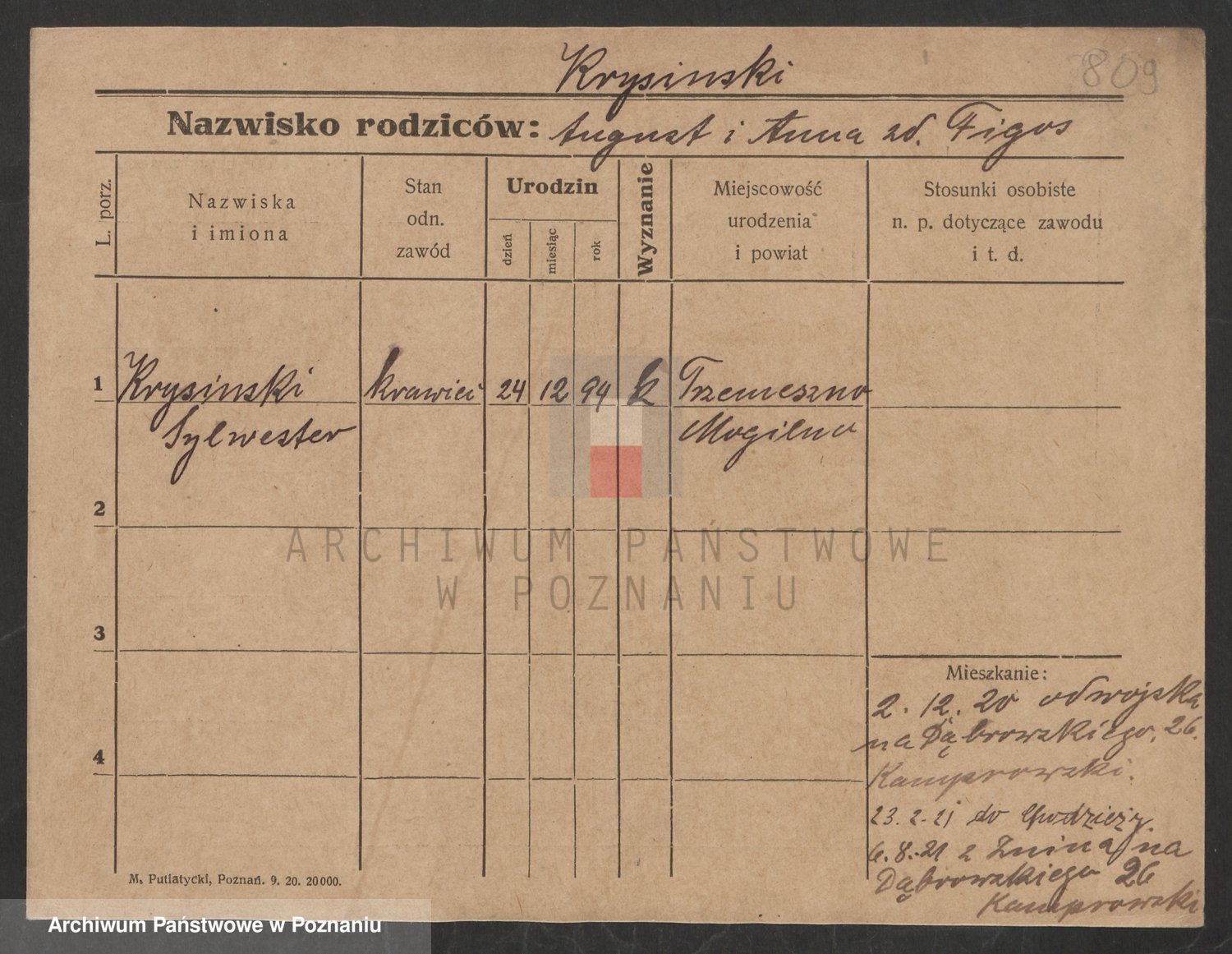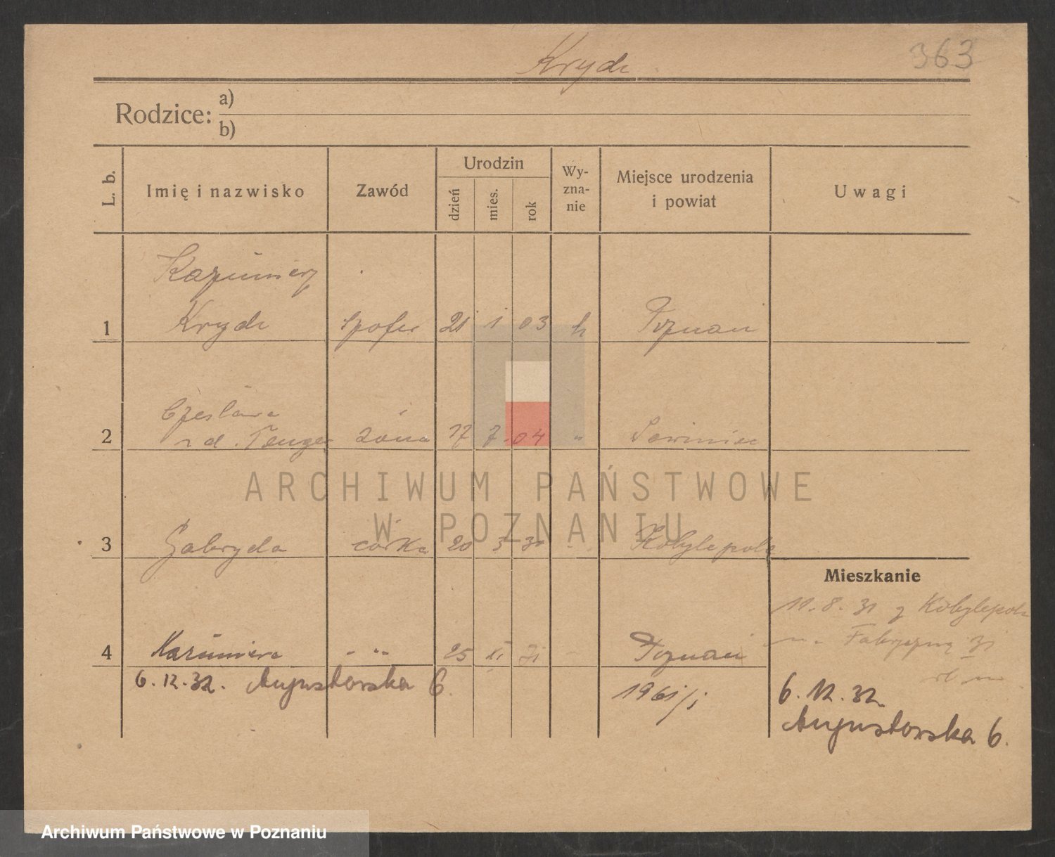 Podgląd karty osobowej dostępny jest po kliknięciu na nazwisko lub ikonkę karty. Można dokonywać powiększenia (ikony na górze) lub przechodzić między kolejnymi skanami (strzałki po bokach).