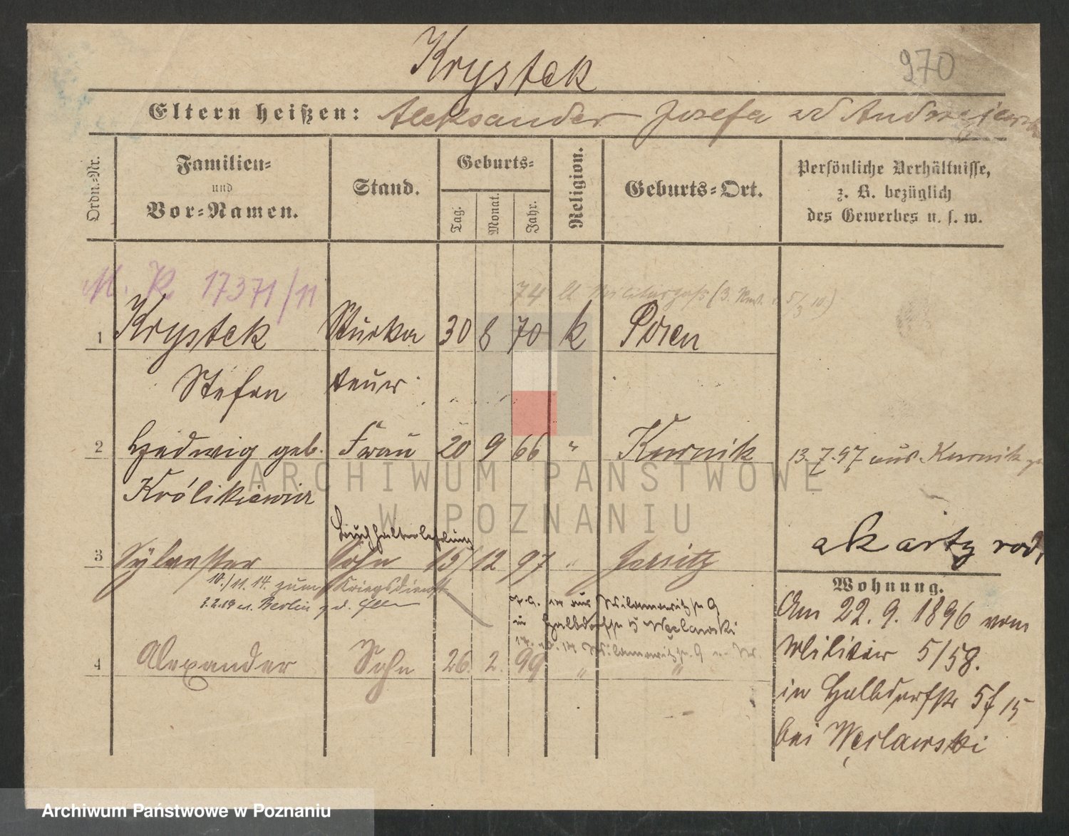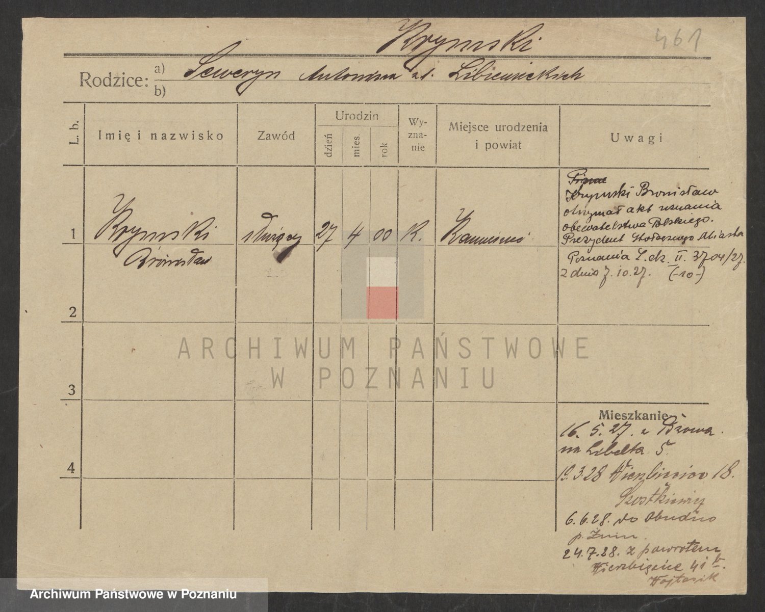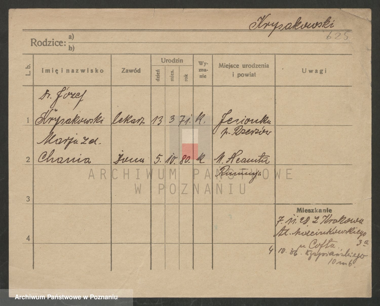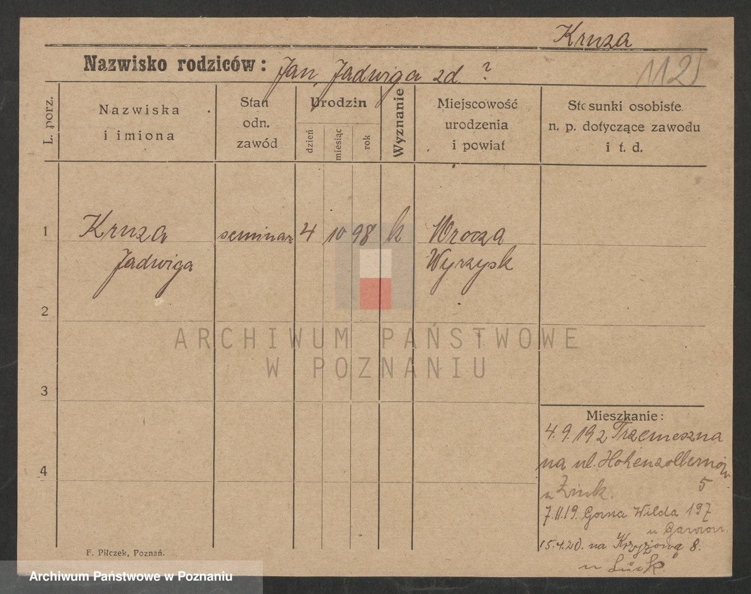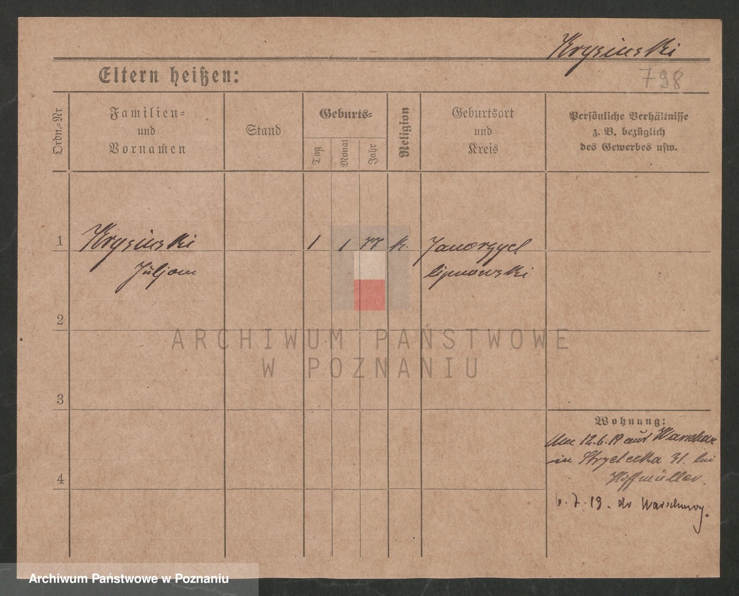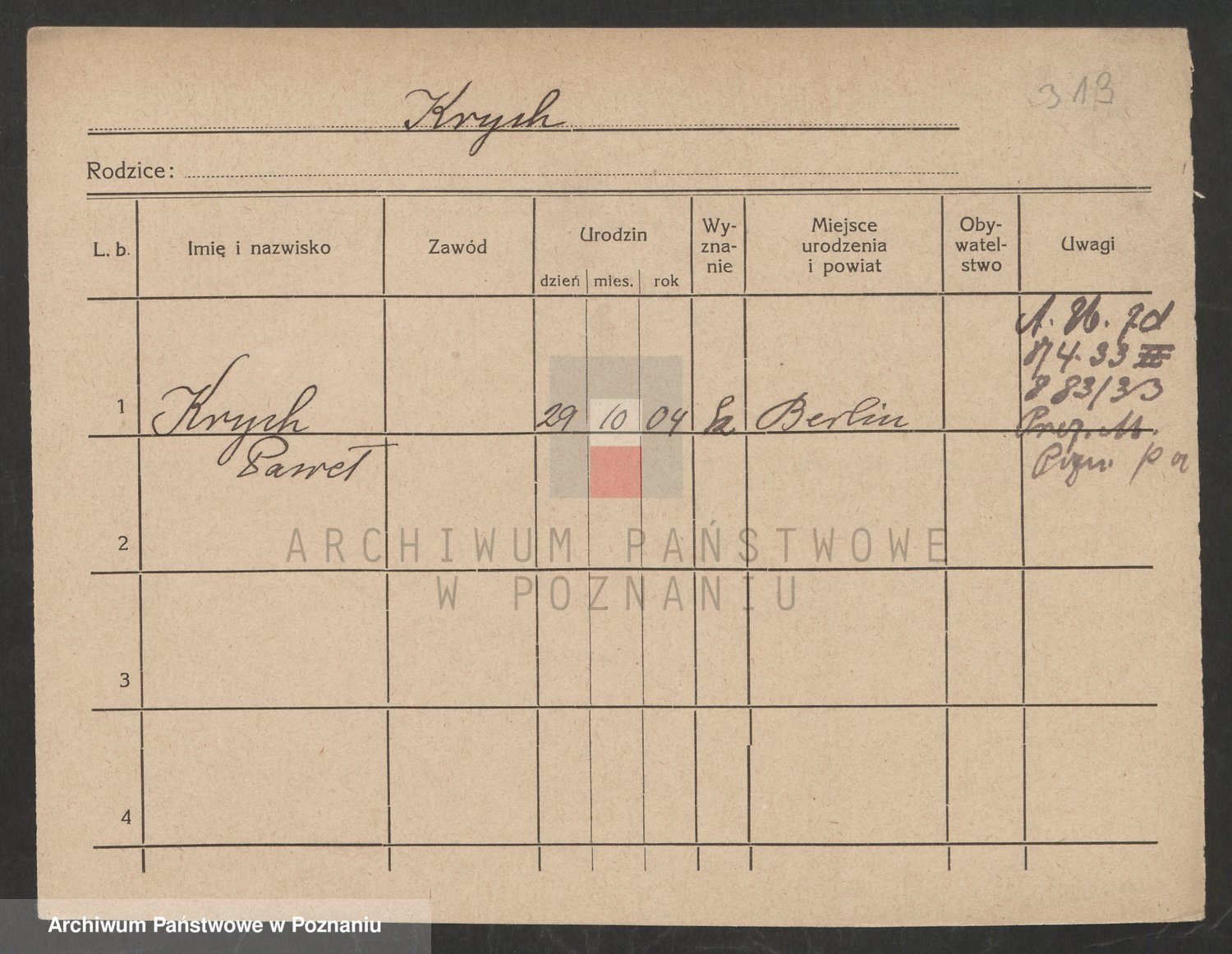 Podgląd karty osobowej dostępny jest po kliknięciu na nazwisko lub ikonkę karty. Można dokonywać powiększenia (ikony na górze) lub przechodzić między kolejnymi skanami (strzałki po bokach).