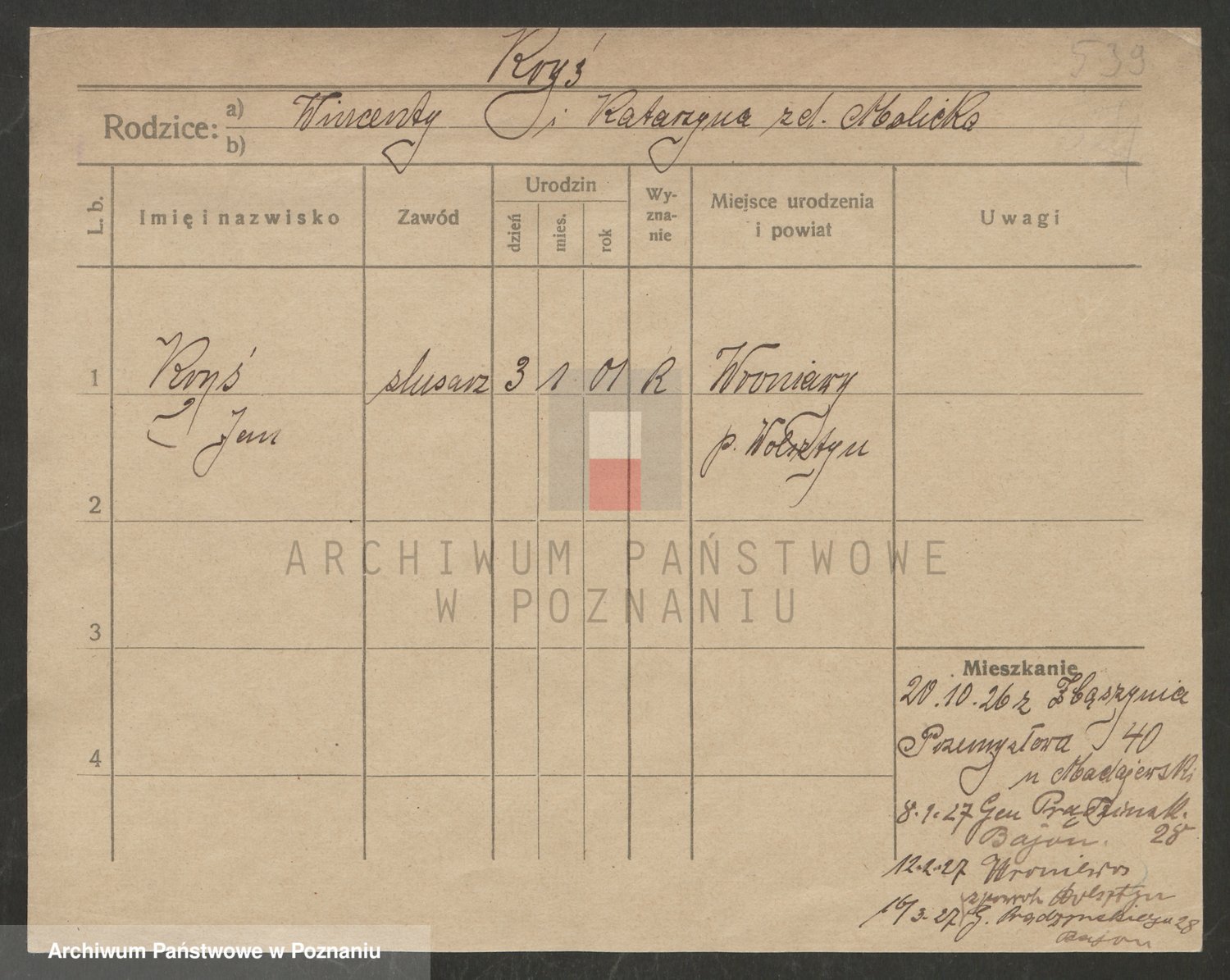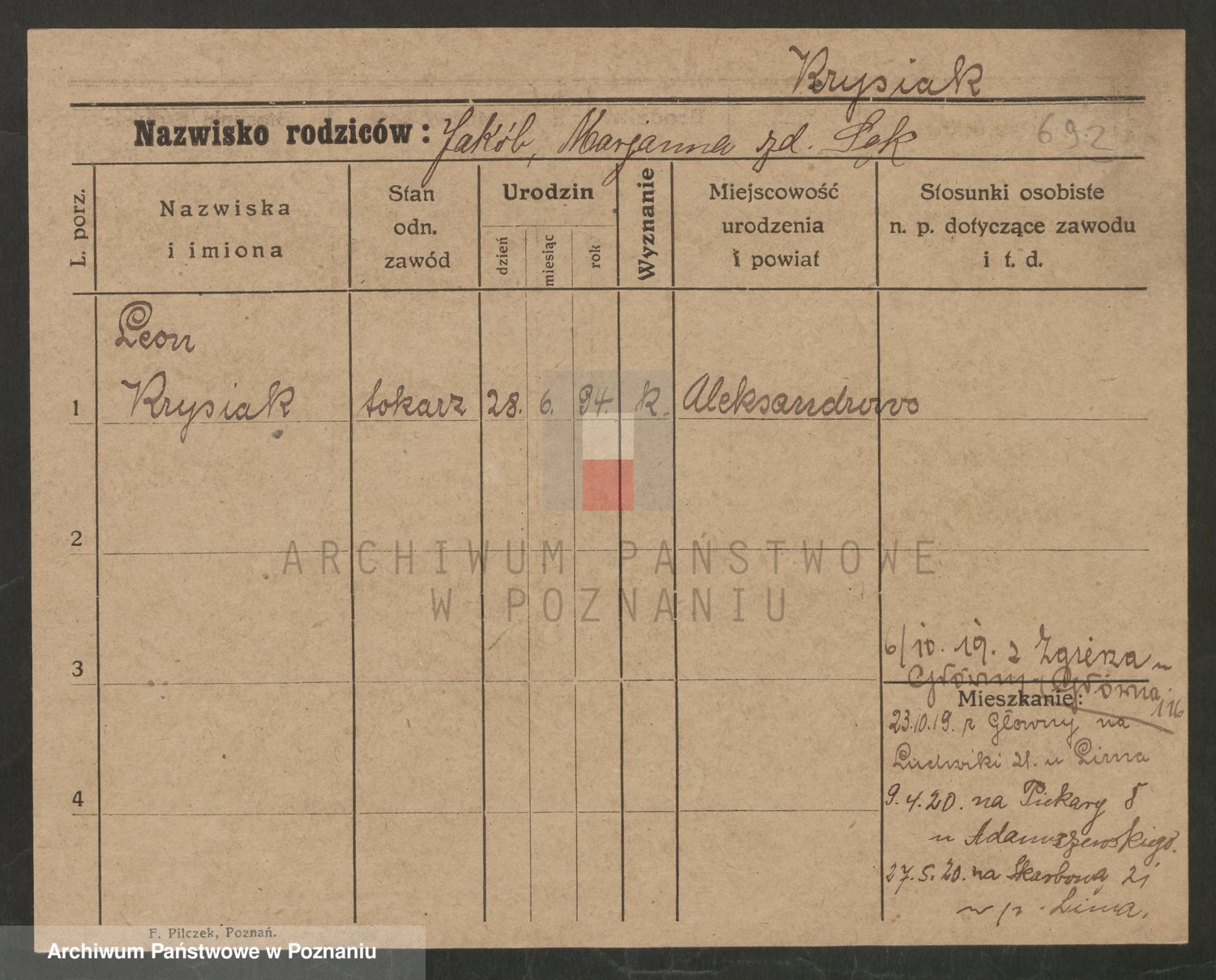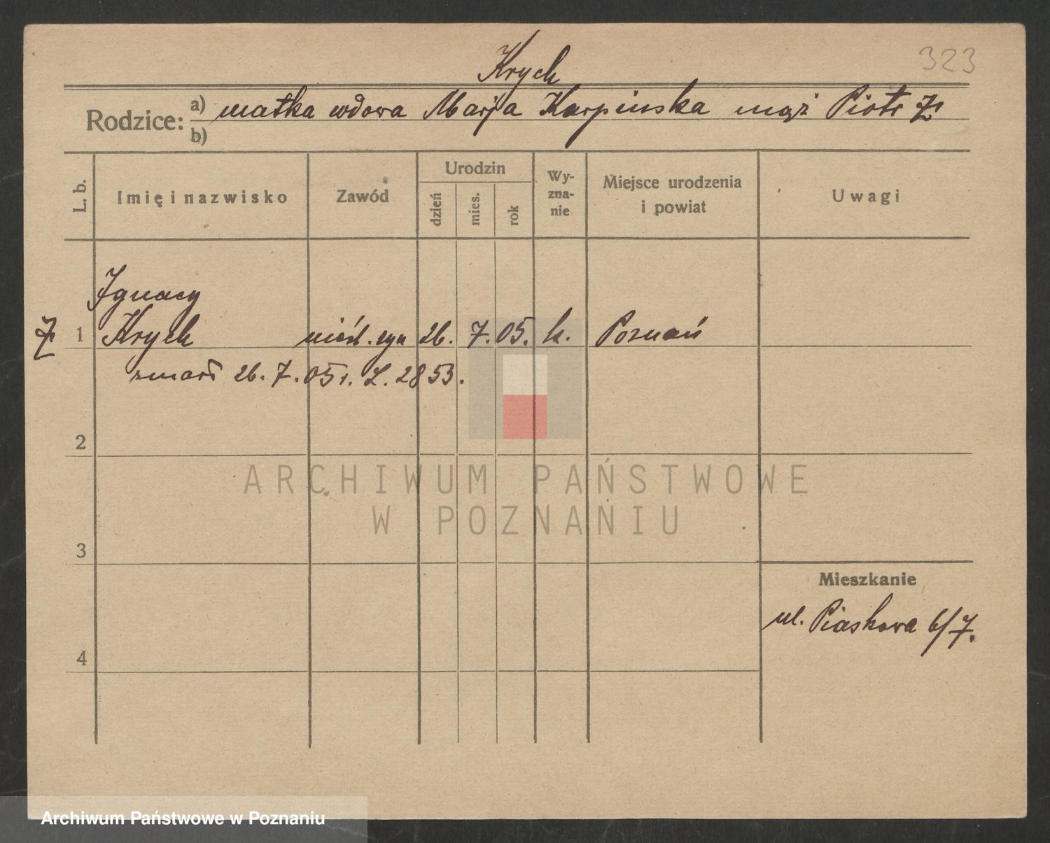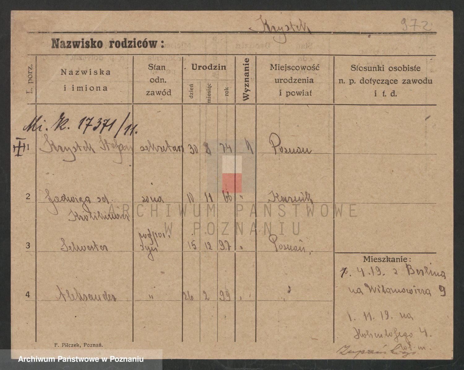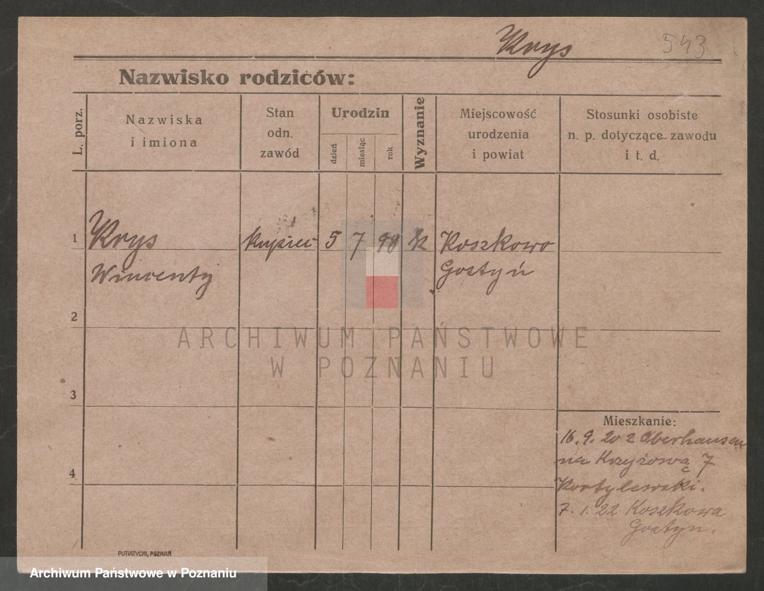 Podgląd karty osobowej dostępny jest po kliknięciu na nazwisko lub ikonkę karty. Można dokonywać powiększenia (ikony na górze) lub przechodzić między kolejnymi skanami (strzałki po bokach).
