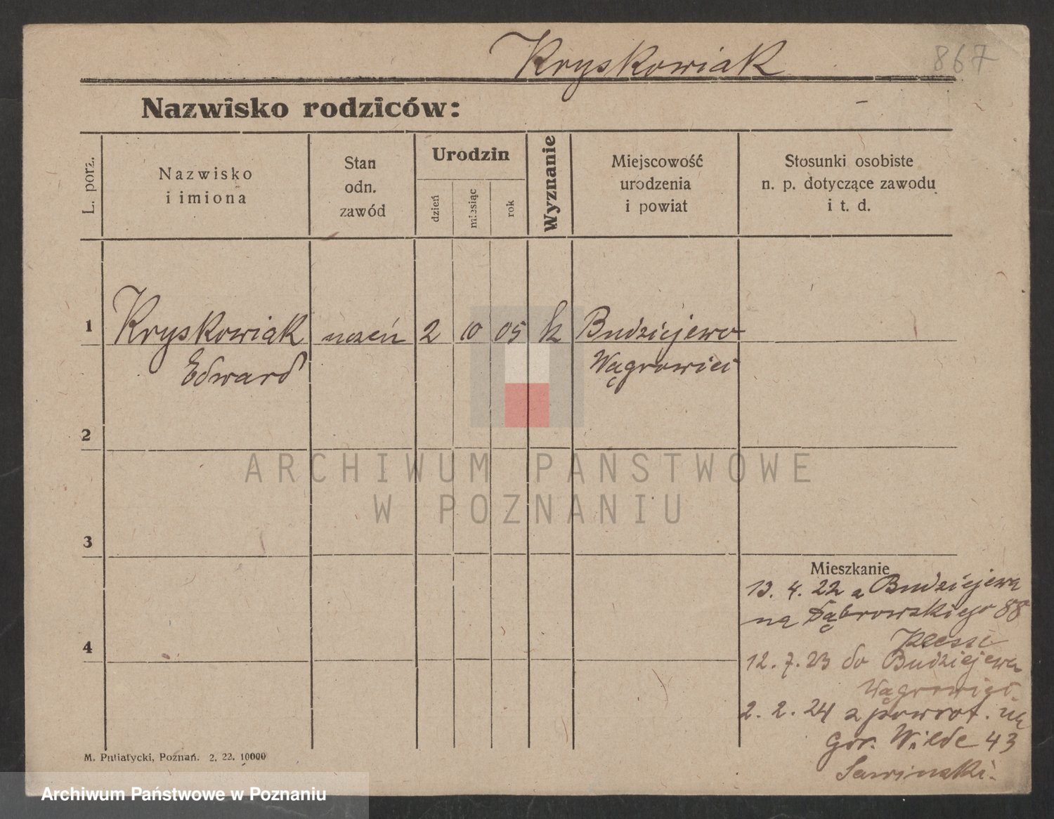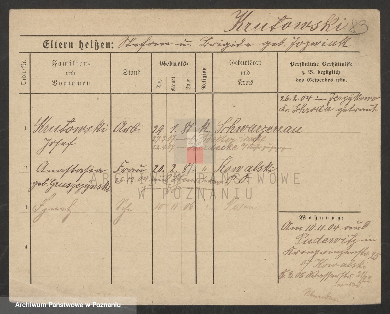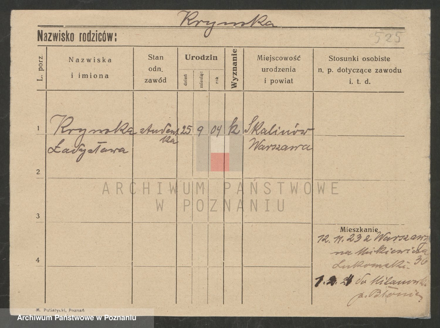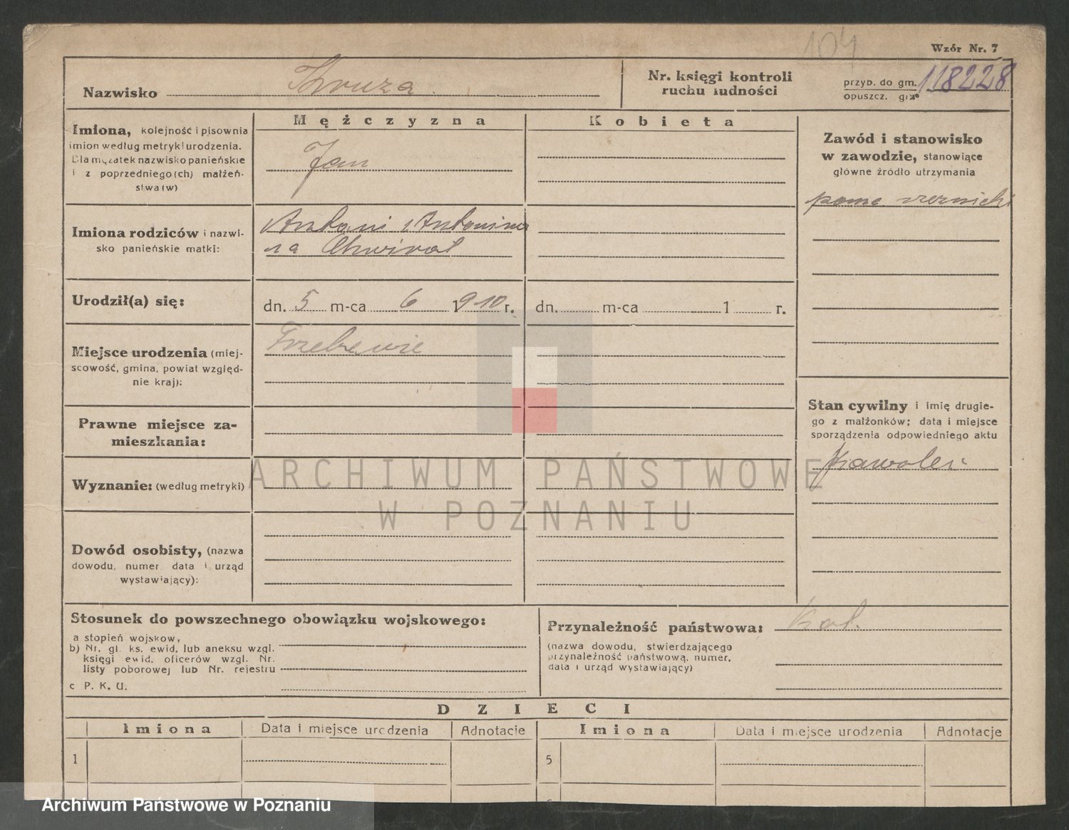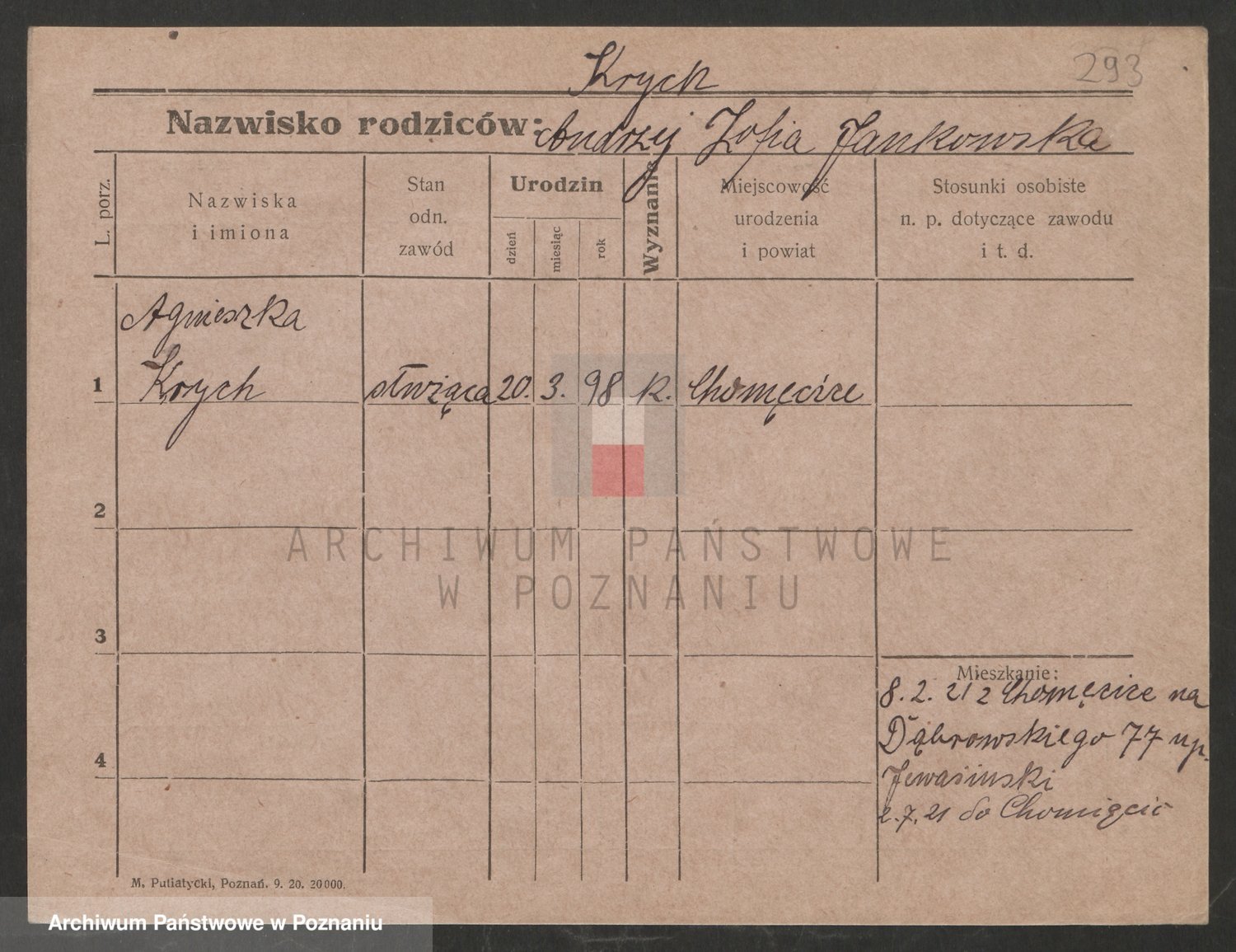 Podgląd karty osobowej dostępny jest po kliknięciu na nazwisko lub ikonkę karty. Można dokonywać powiększenia (ikony na górze) lub przechodzić między kolejnymi skanami (strzałki po bokach).