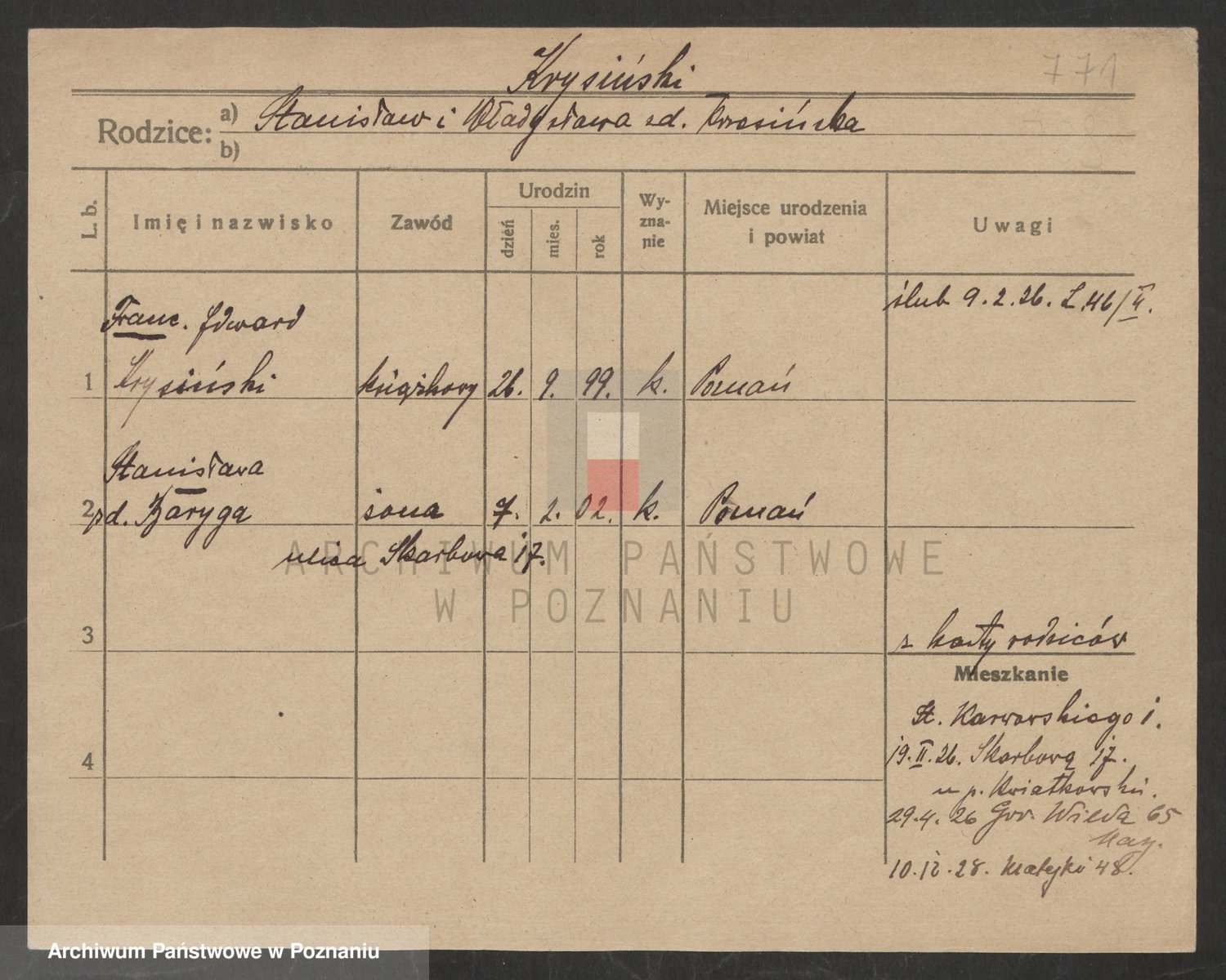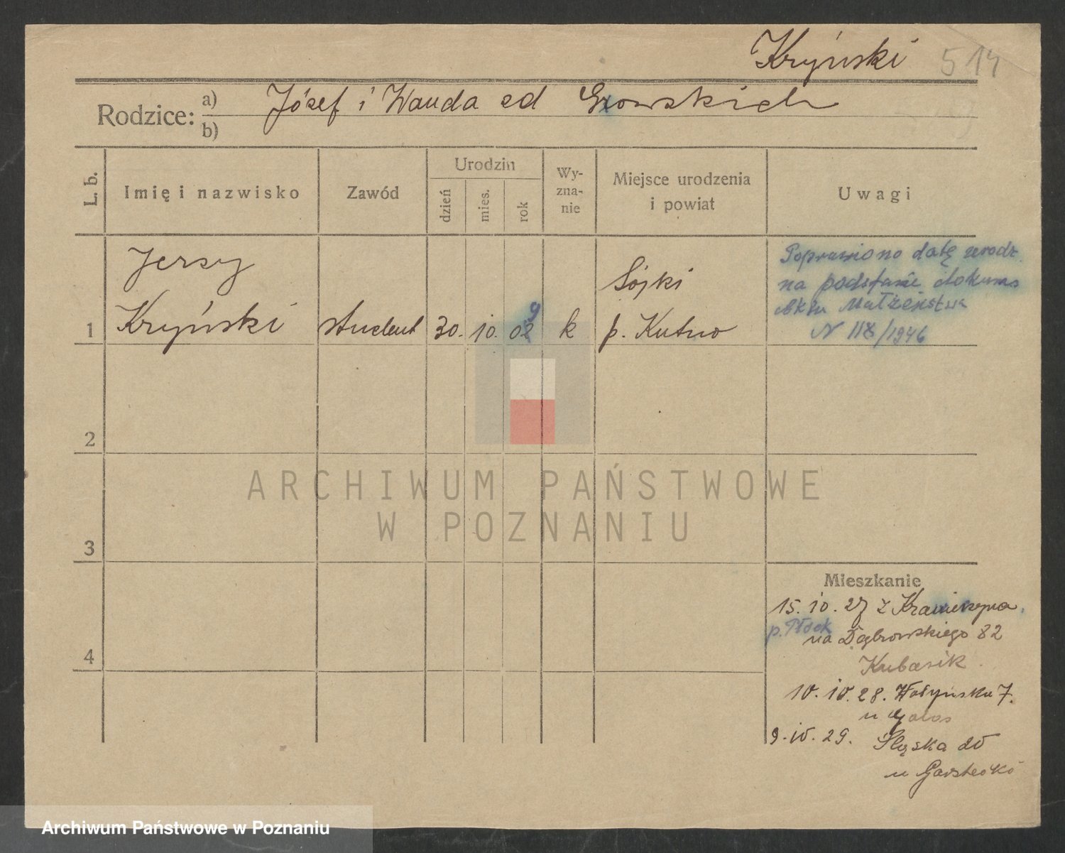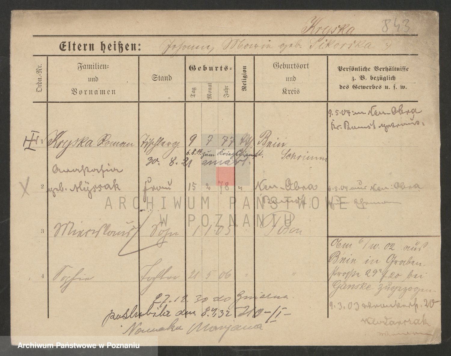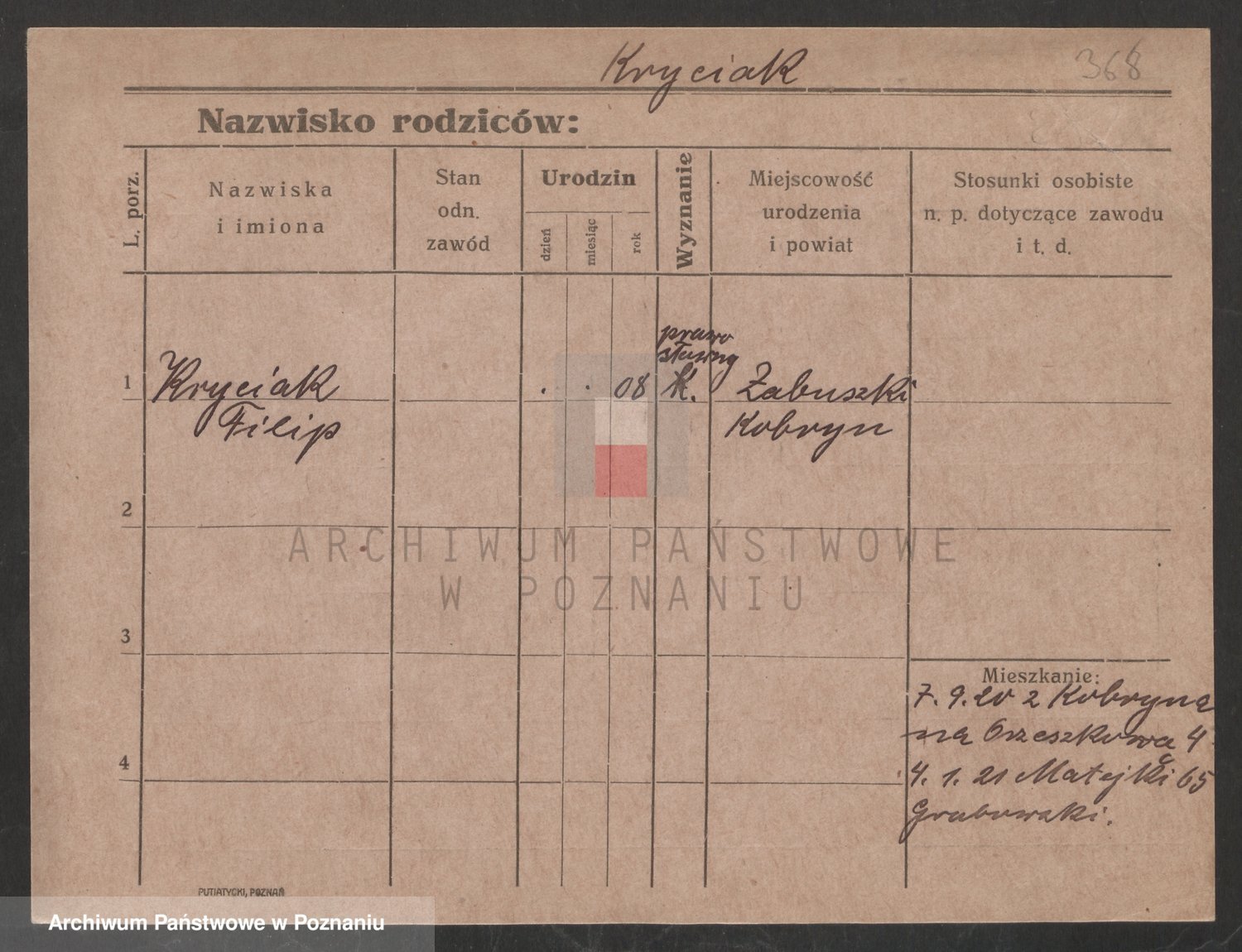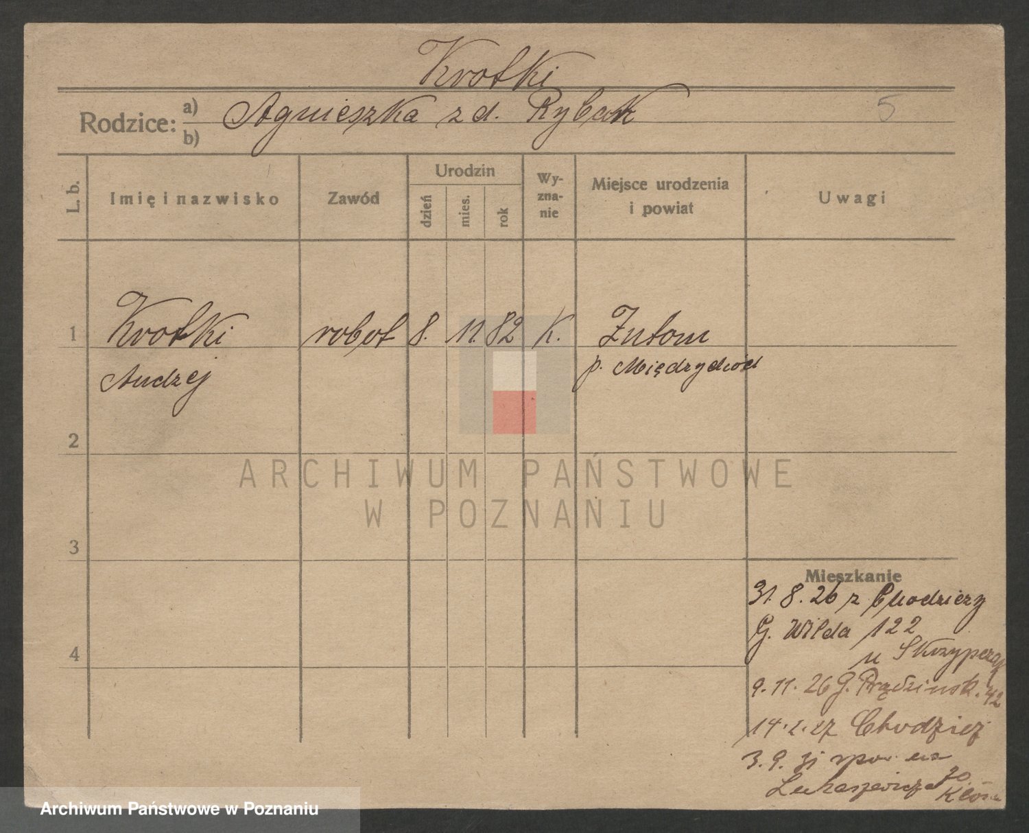 Podgląd karty osobowej dostępny jest po kliknięciu na nazwisko lub ikonkę karty. Można dokonywać powiększenia (ikony na górze) lub przechodzić między kolejnymi skanami (strzałki po bokach).