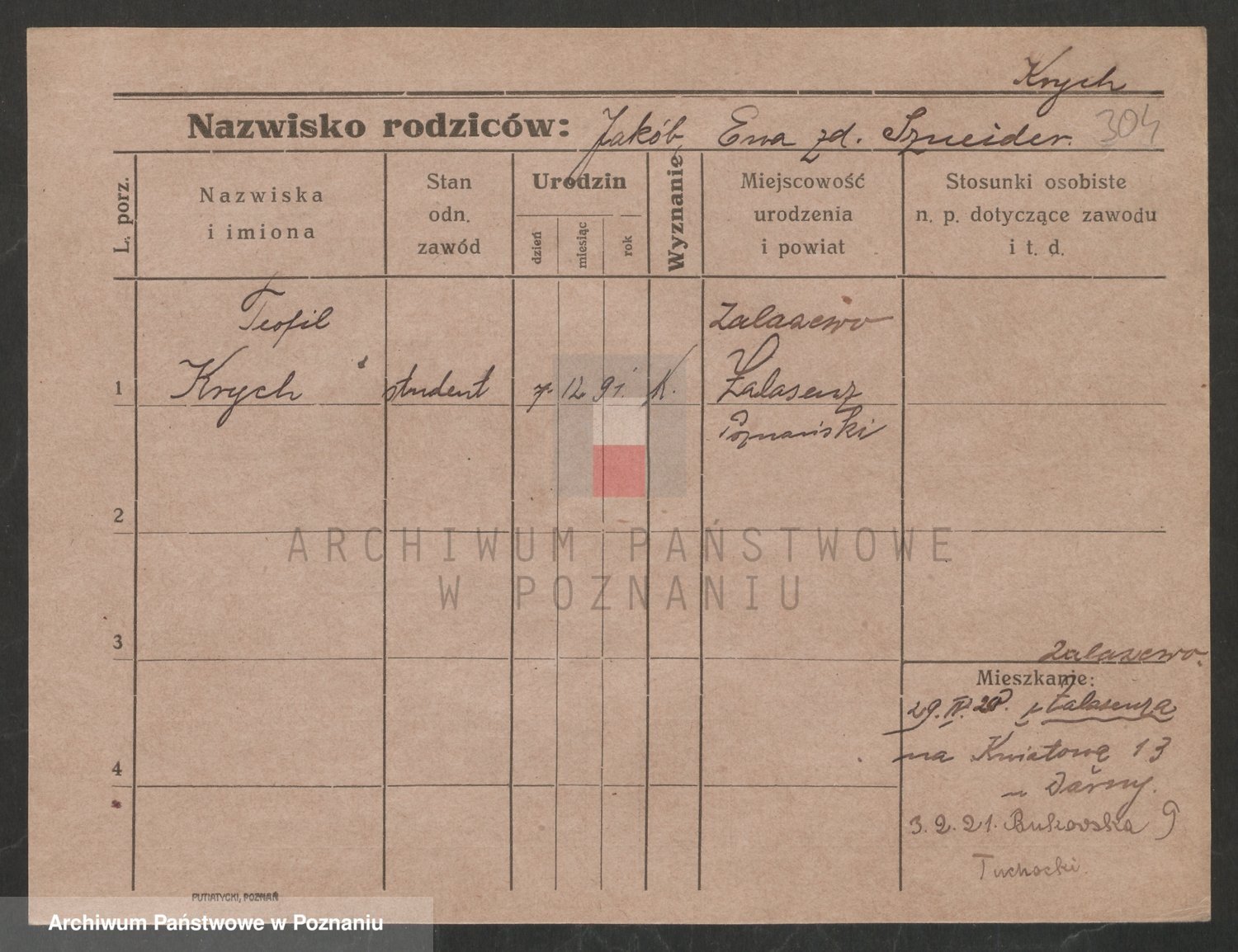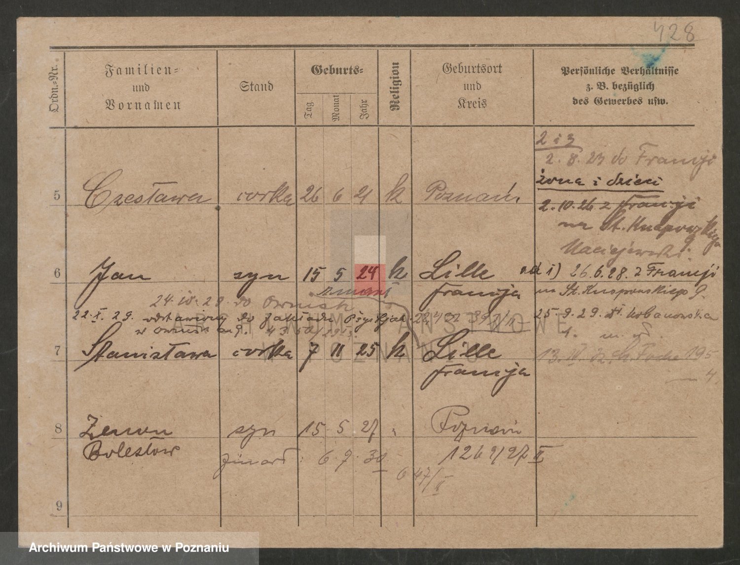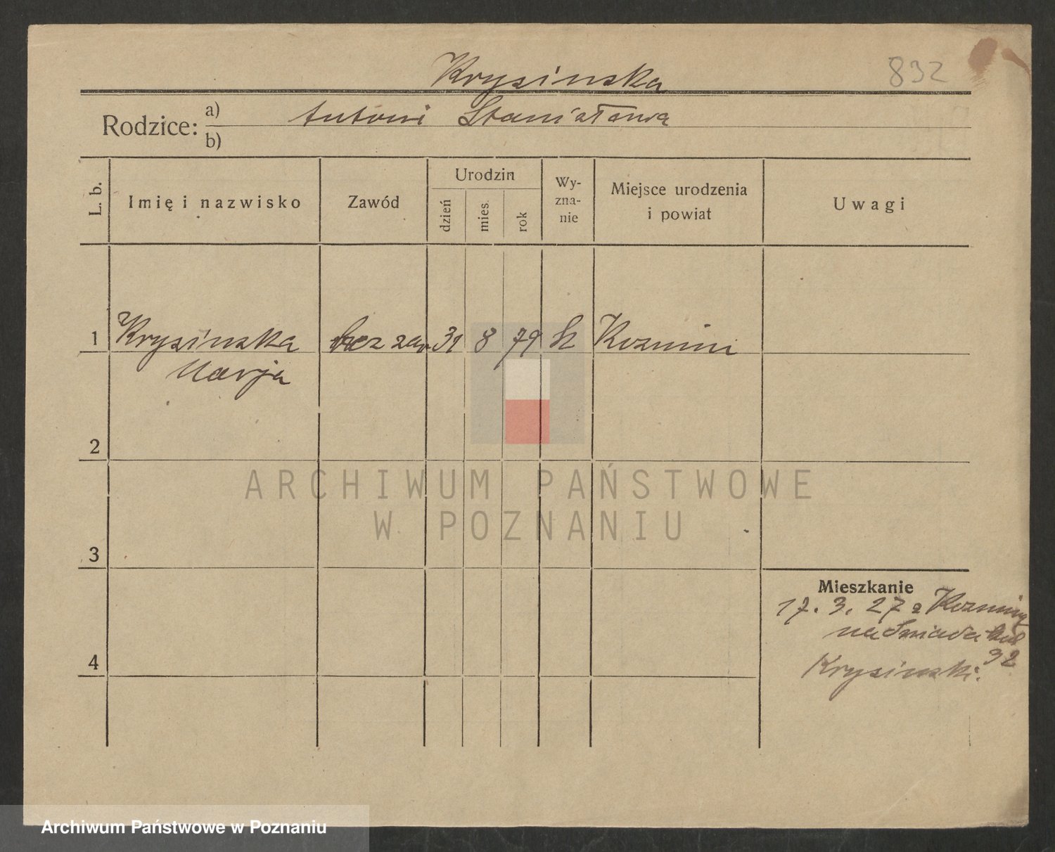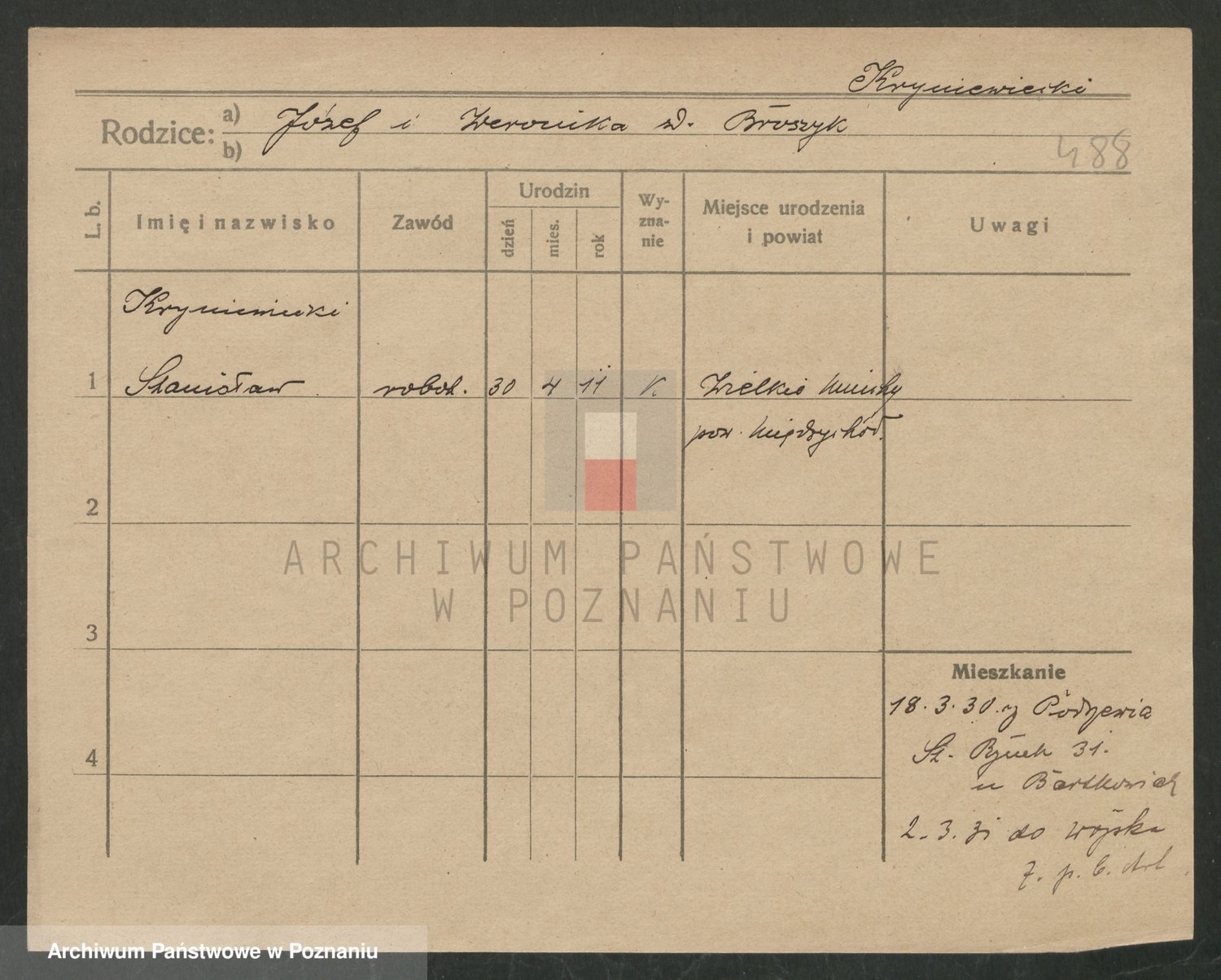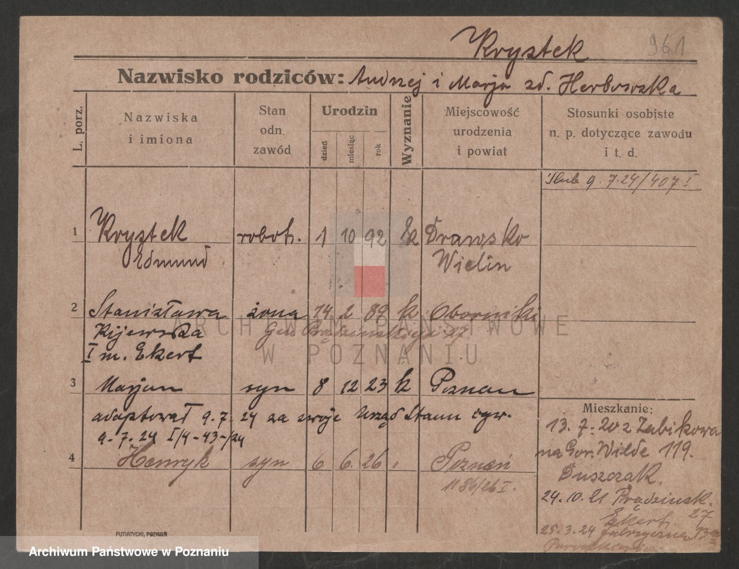 Podgląd karty osobowej dostępny jest po kliknięciu na nazwisko lub ikonkę karty. Można dokonywać powiększenia (ikony na górze) lub przechodzić między kolejnymi skanami (strzałki po bokach).