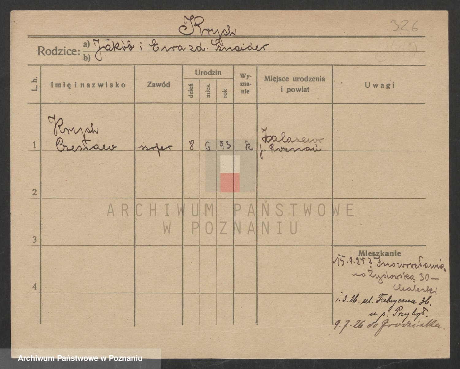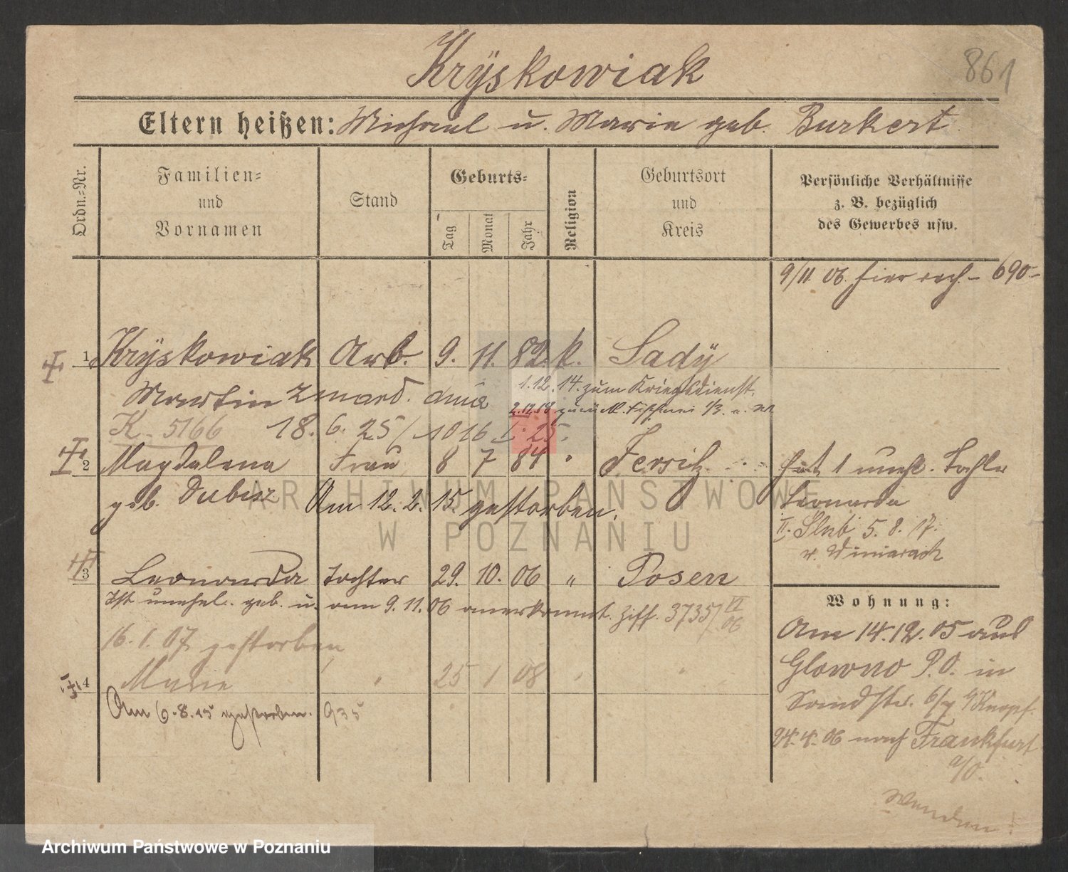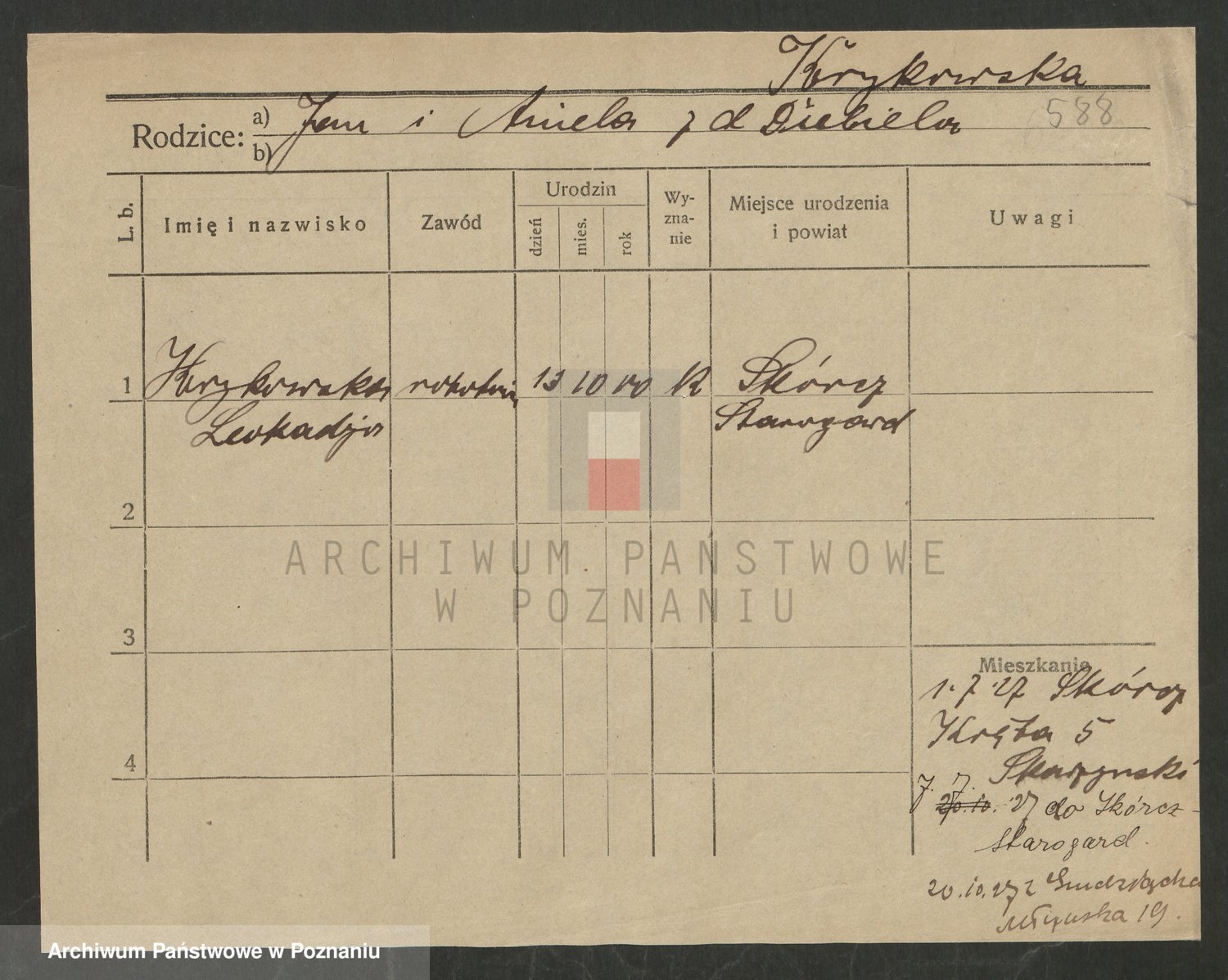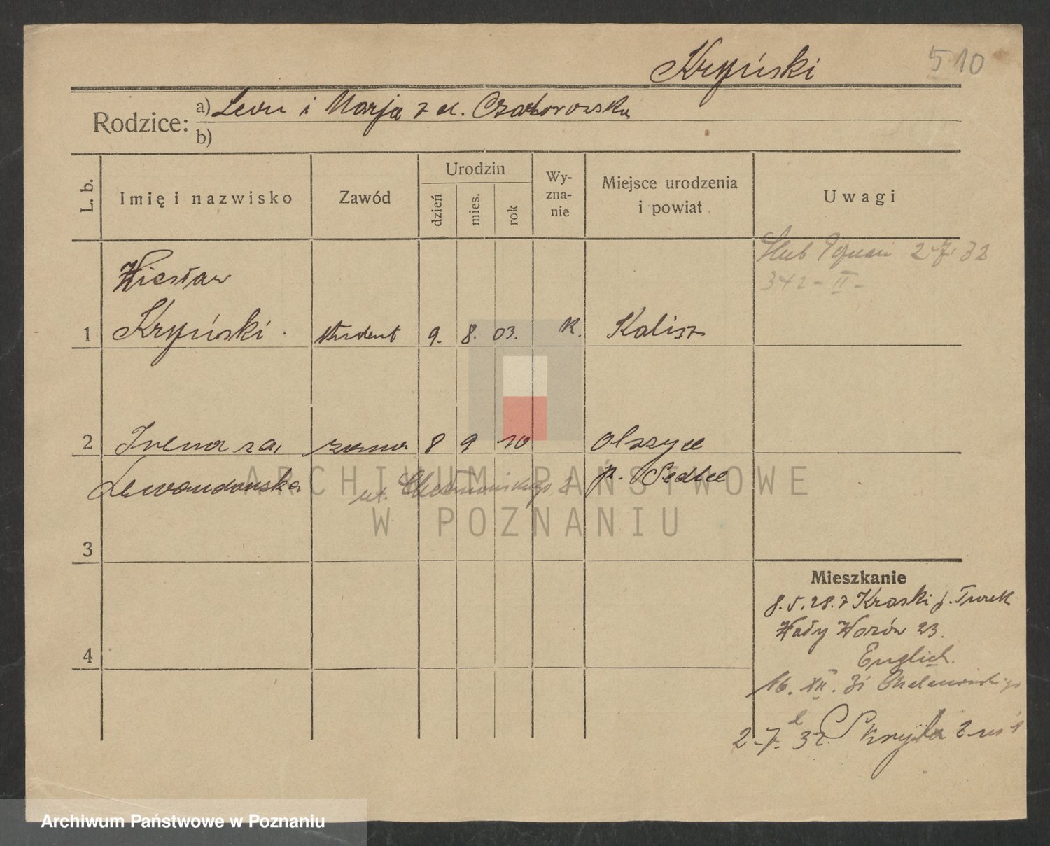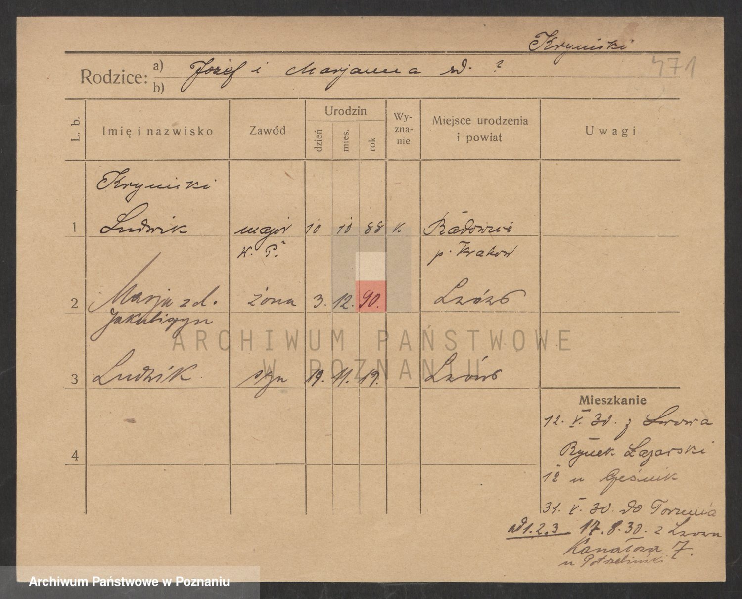 Podgląd karty osobowej dostępny jest po kliknięciu na nazwisko lub ikonkę karty. Można dokonywać powiększenia (ikony na górze) lub przechodzić między kolejnymi skanami (strzałki po bokach).