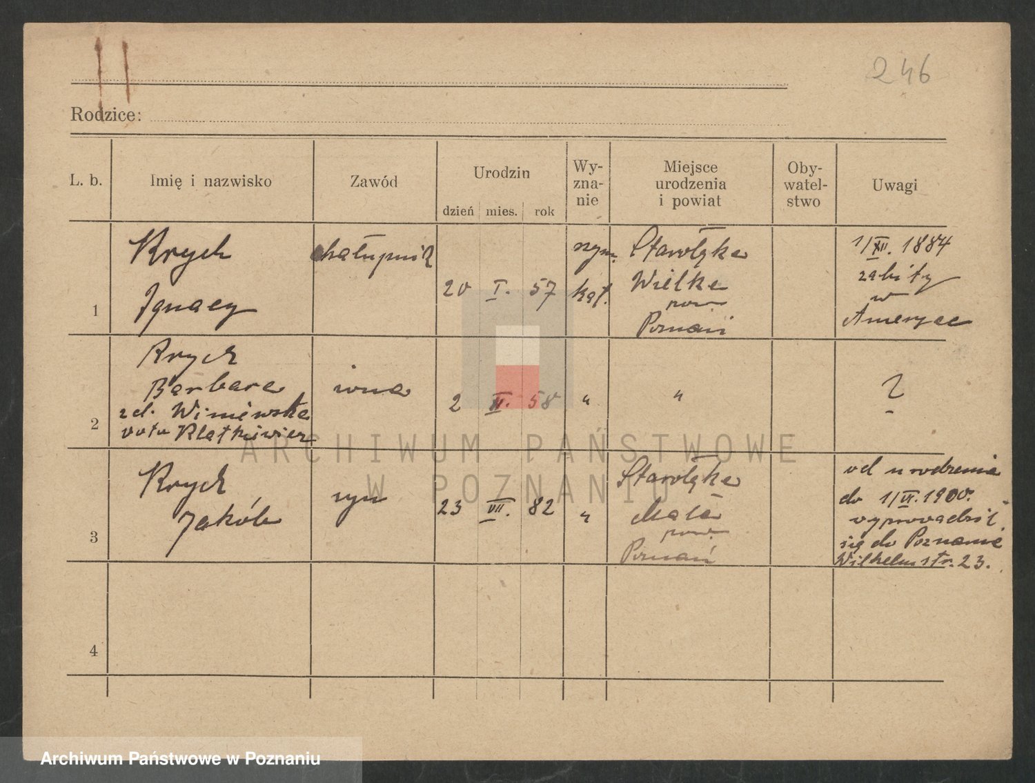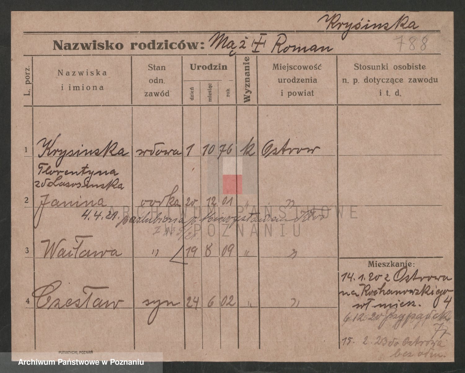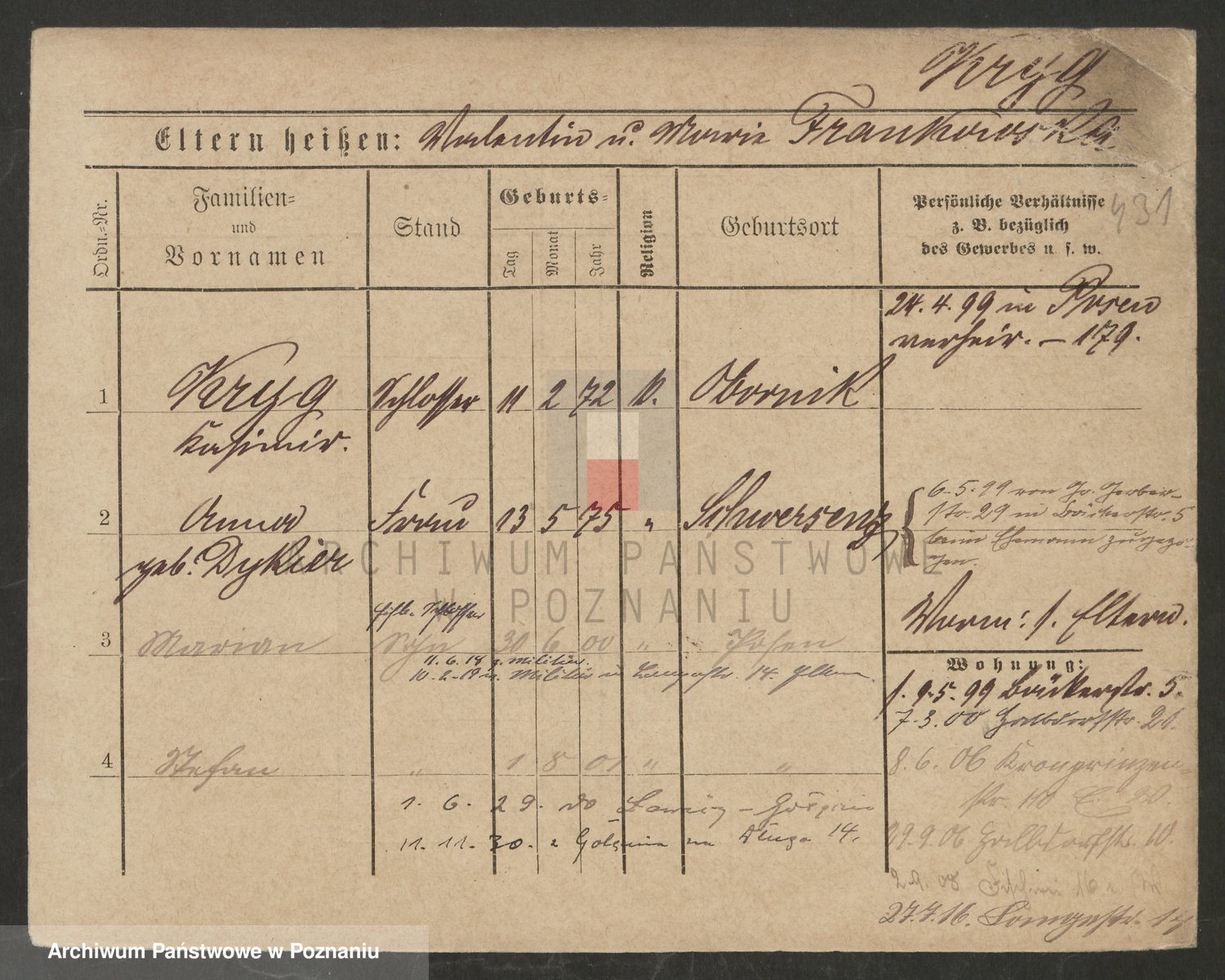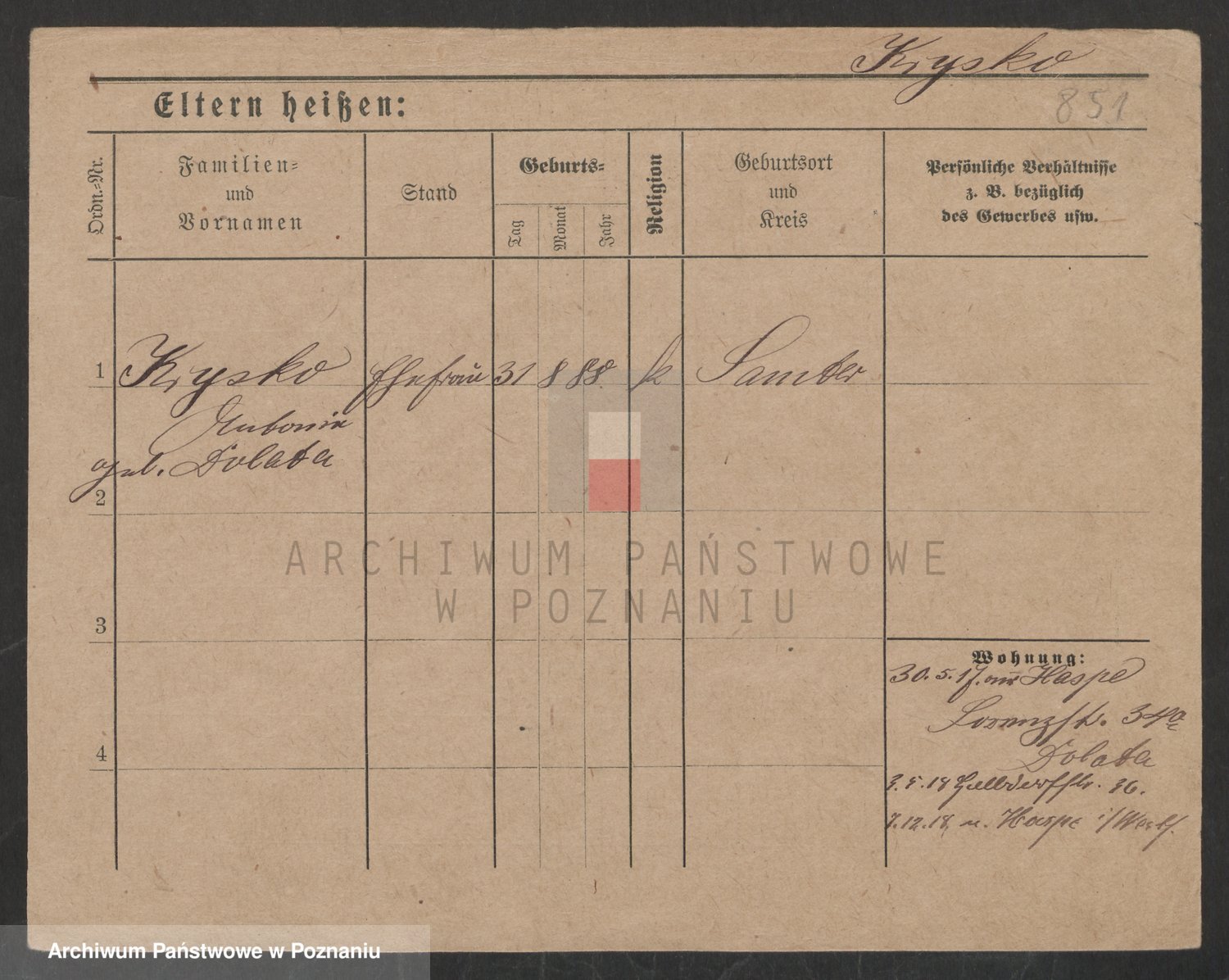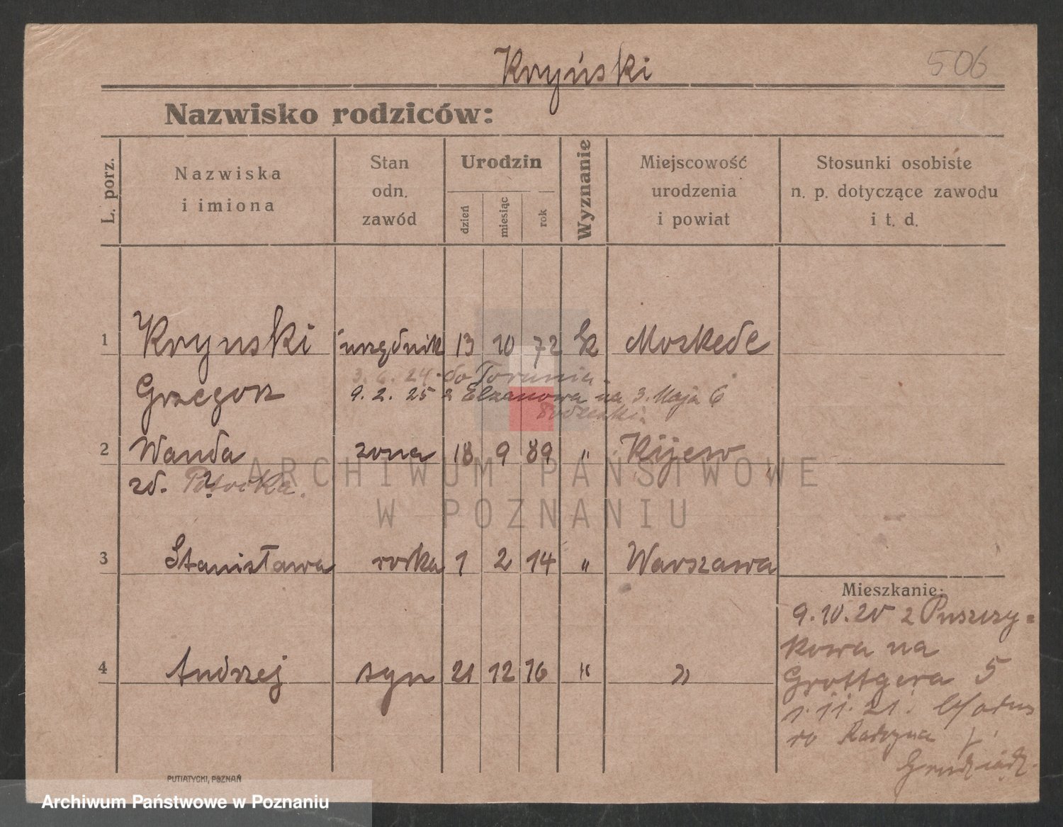 Podgląd karty osobowej dostępny jest po kliknięciu na nazwisko lub ikonkę karty. Można dokonywać powiększenia (ikony na górze) lub przechodzić między kolejnymi skanami (strzałki po bokach).