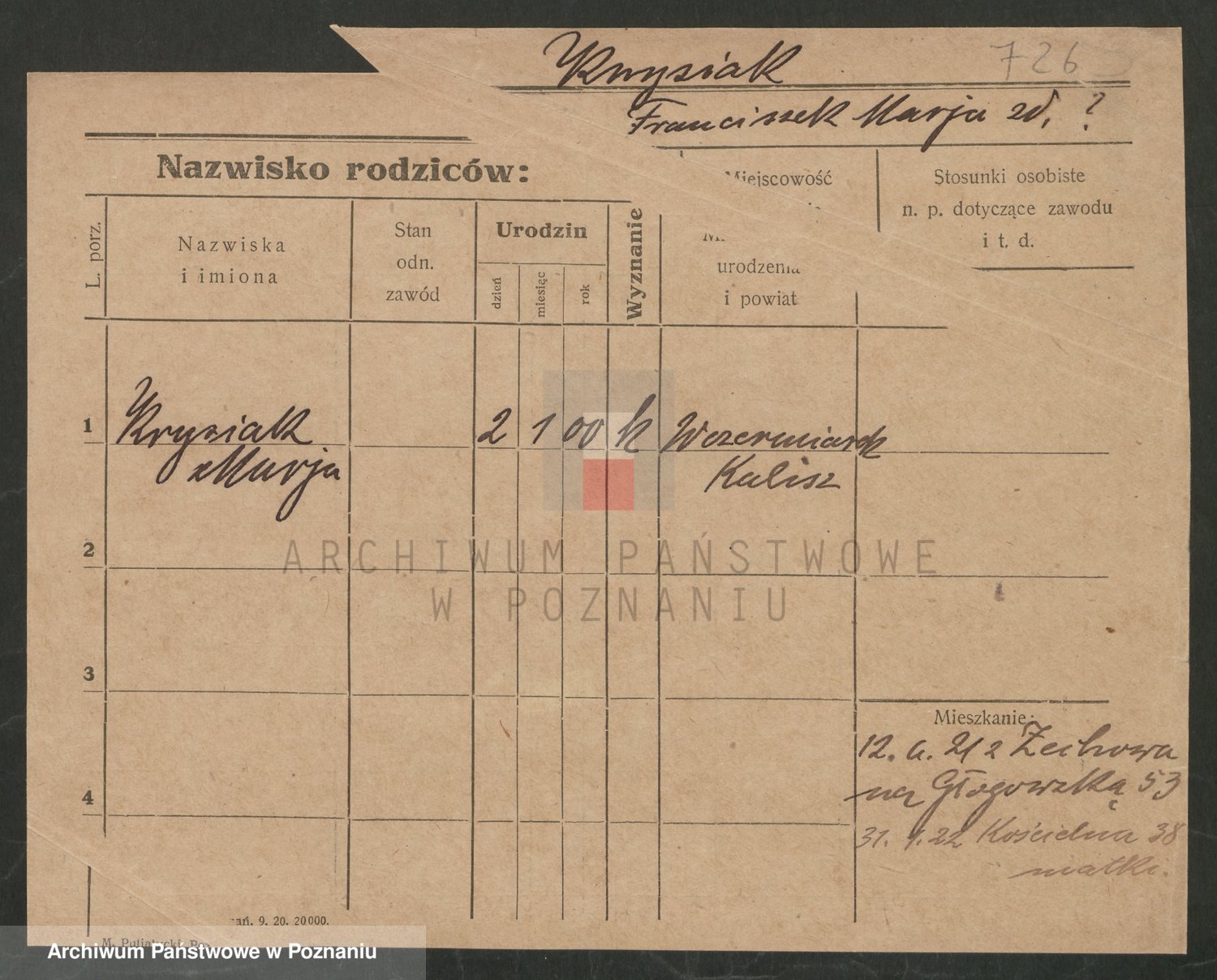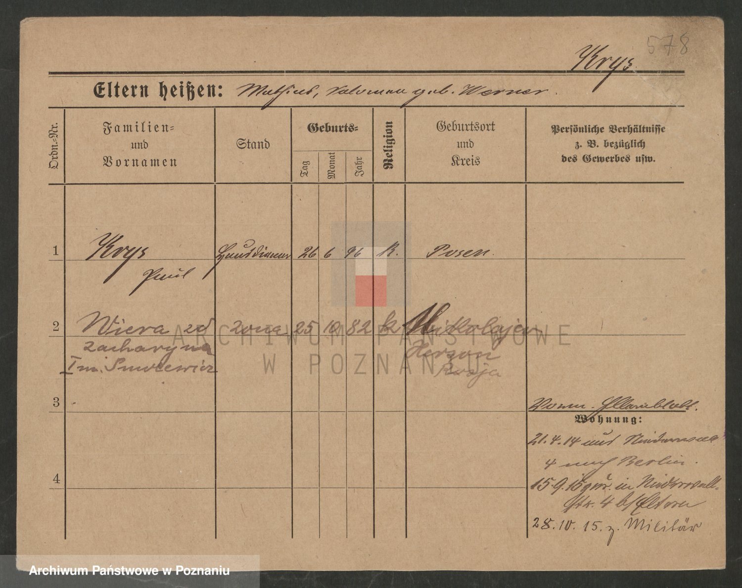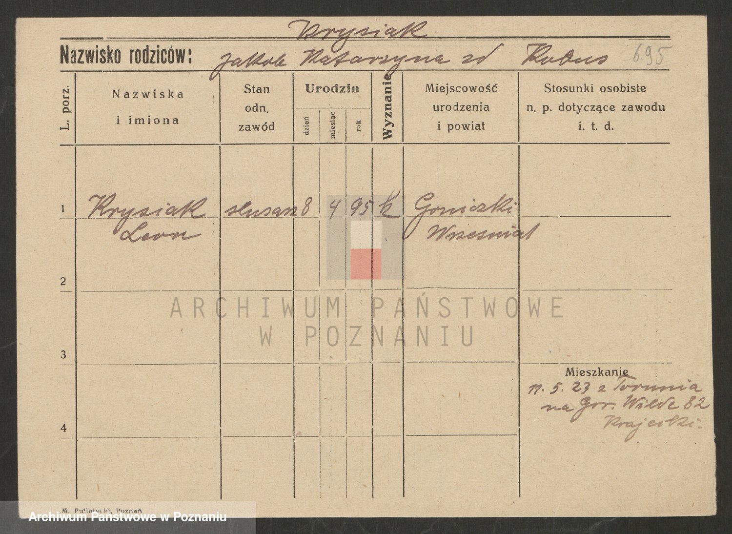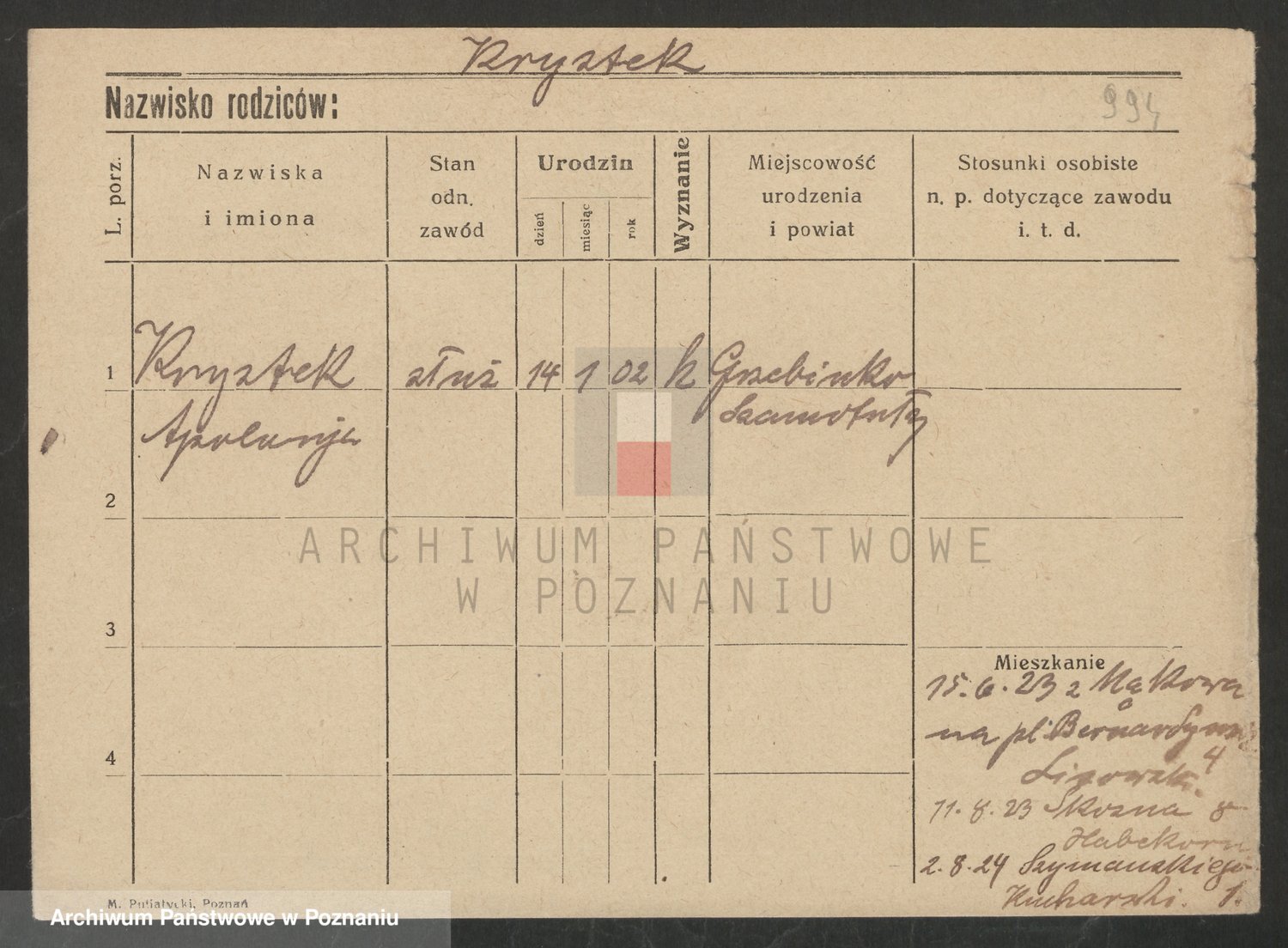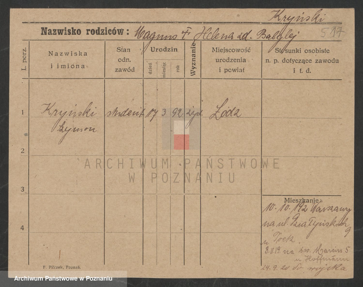 Podgląd karty osobowej dostępny jest po kliknięciu na nazwisko lub ikonkę karty. Można dokonywać powiększenia (ikony na górze) lub przechodzić między kolejnymi skanami (strzałki po bokach).
