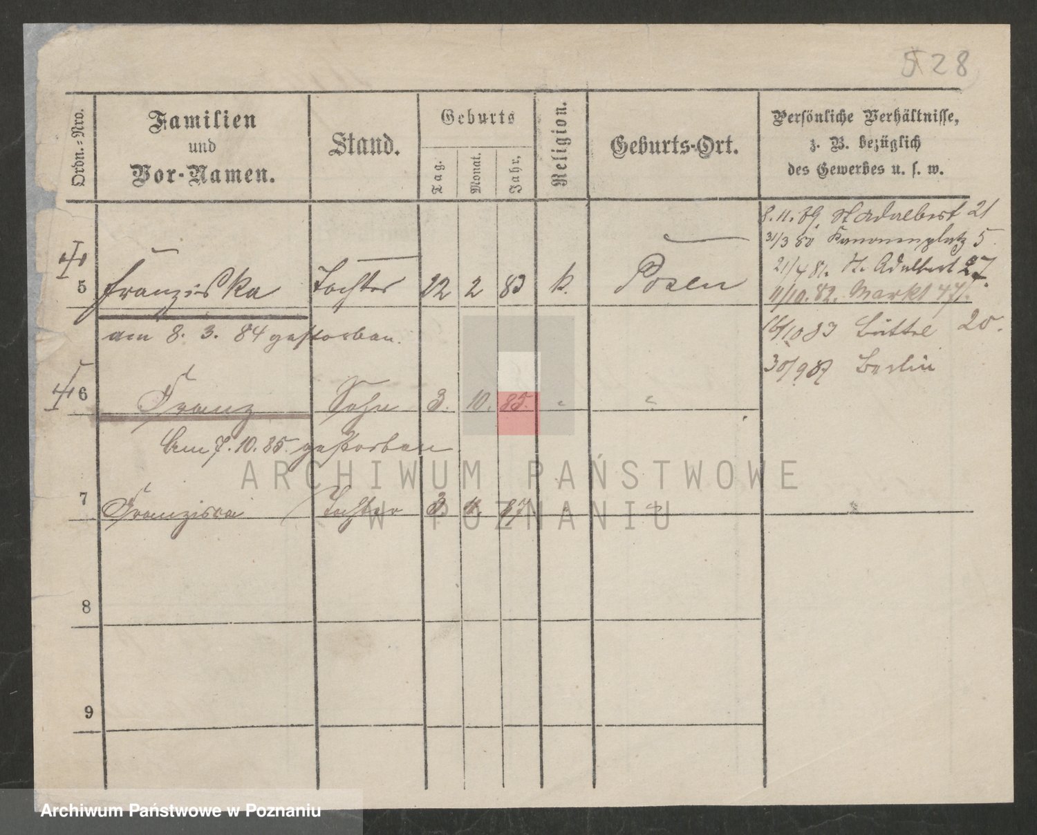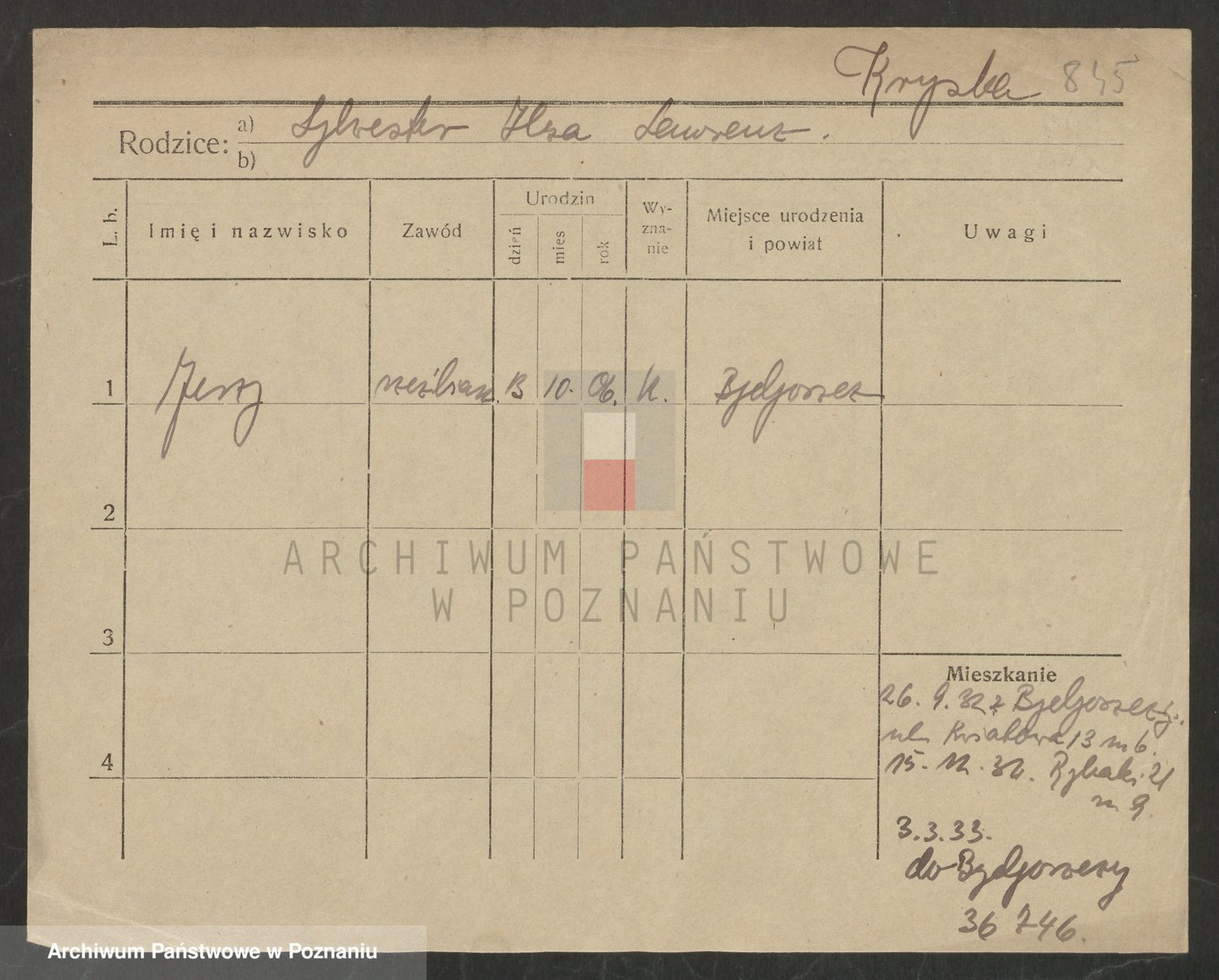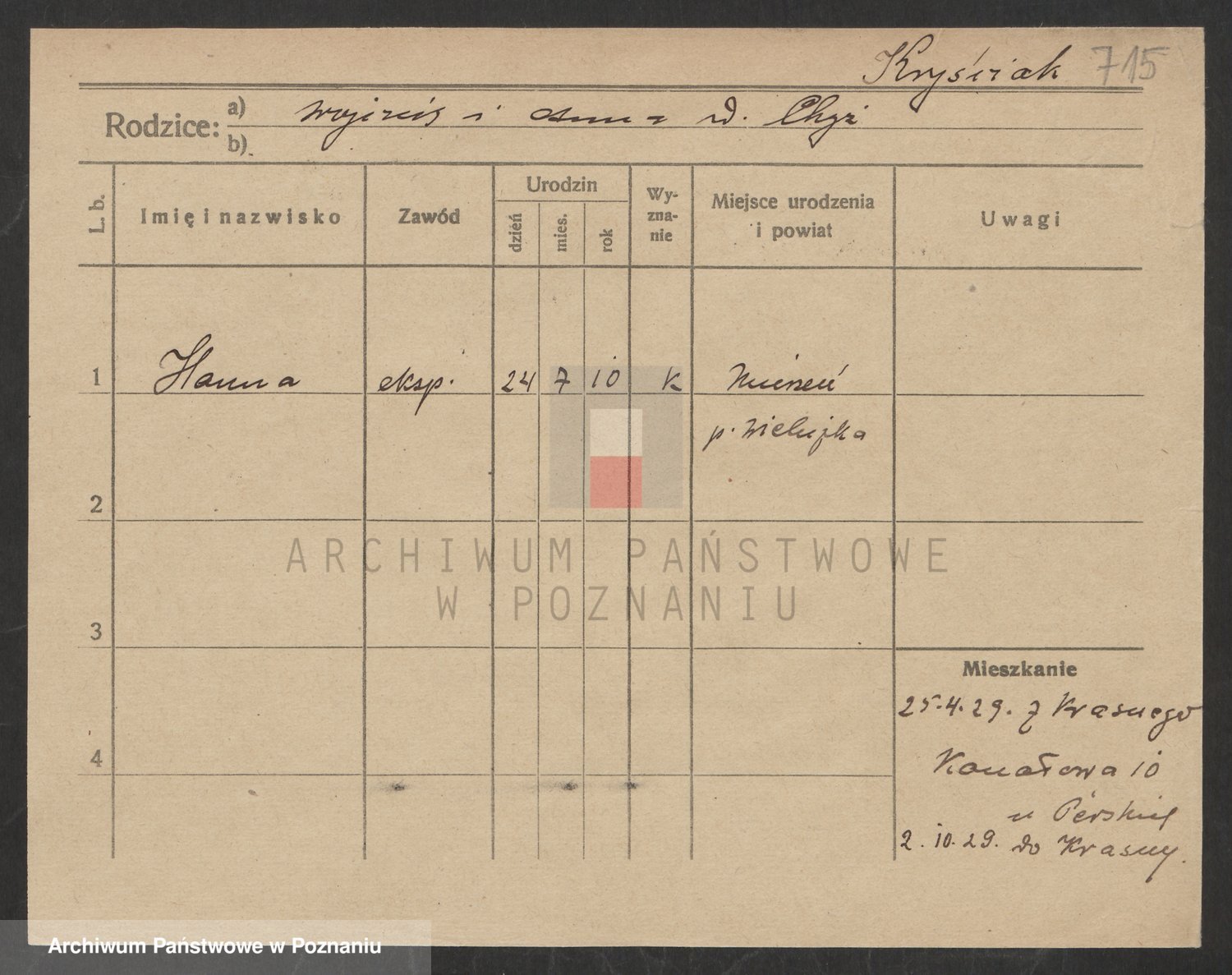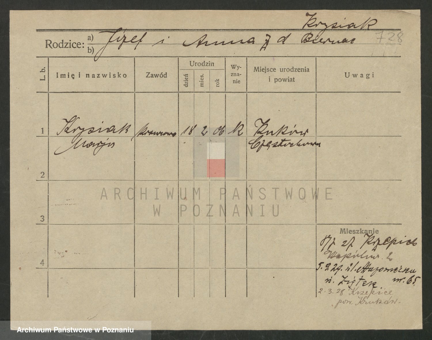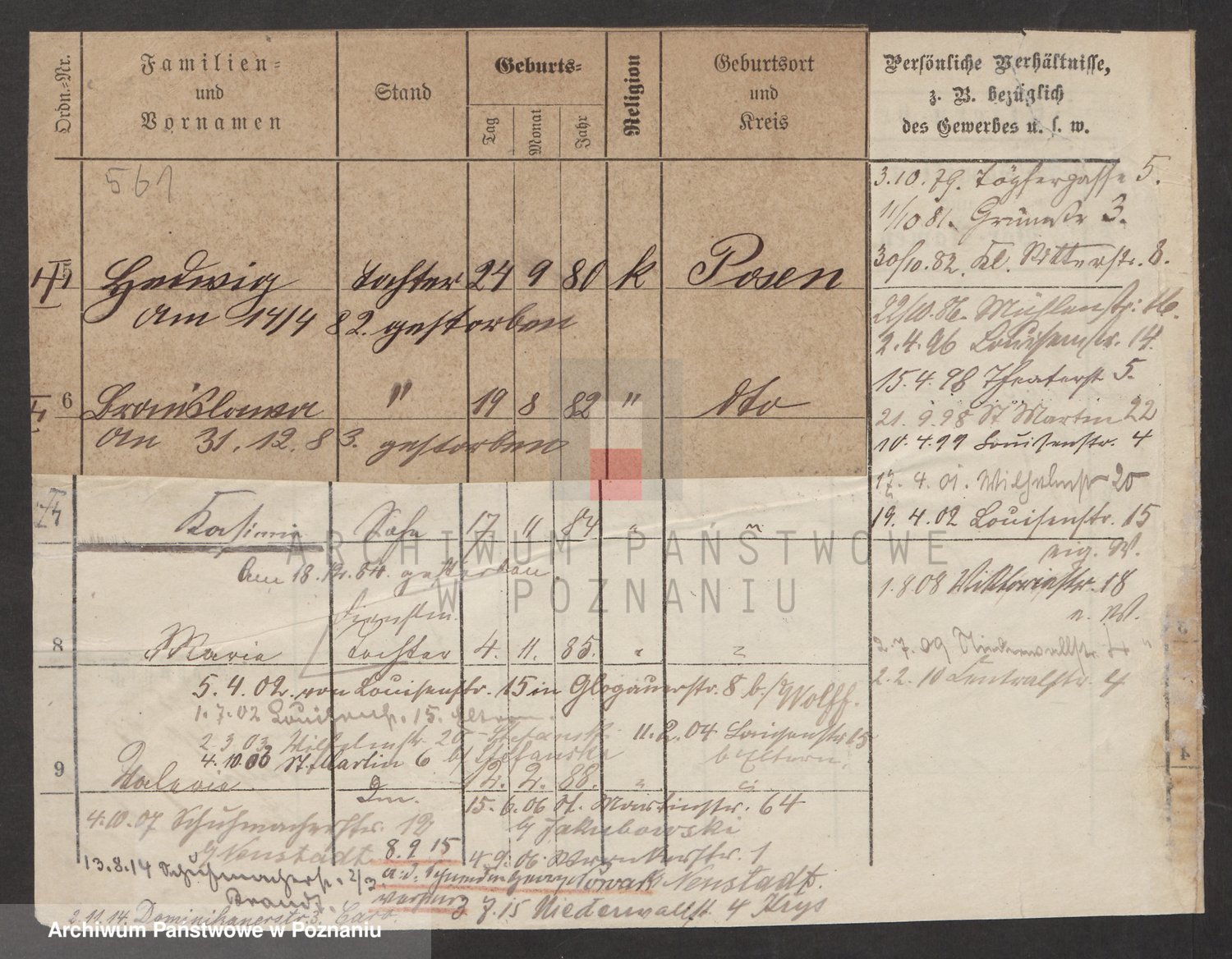 Podgląd karty osobowej dostępny jest po kliknięciu na nazwisko lub ikonkę karty. Można dokonywać powiększenia (ikony na górze) lub przechodzić między kolejnymi skanami (strzałki po bokach).