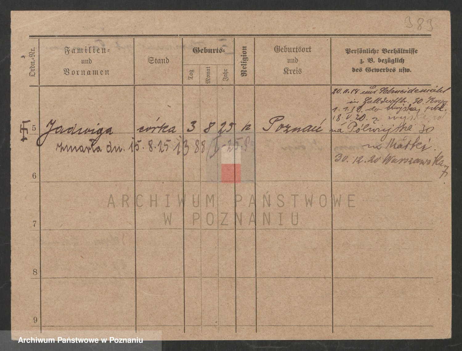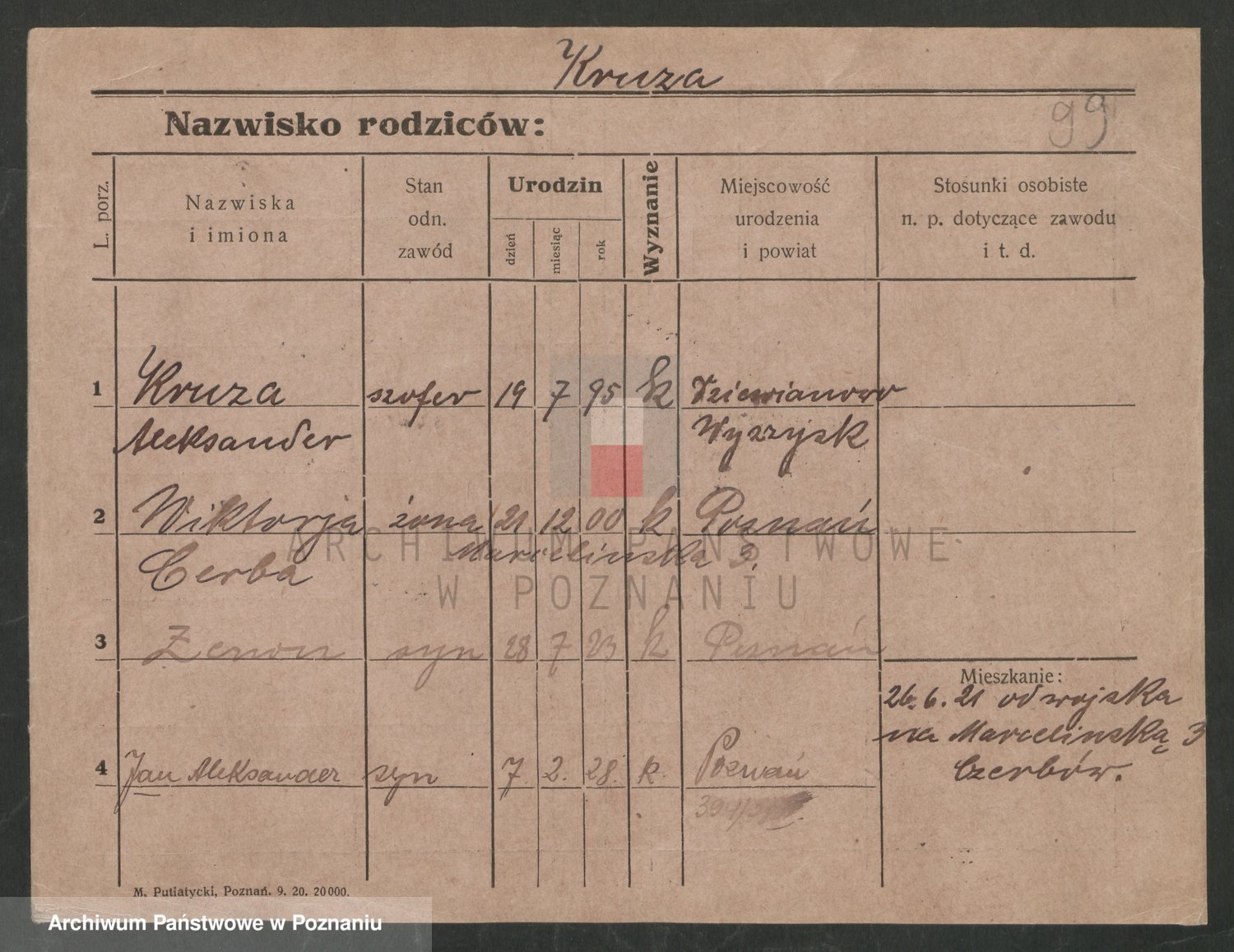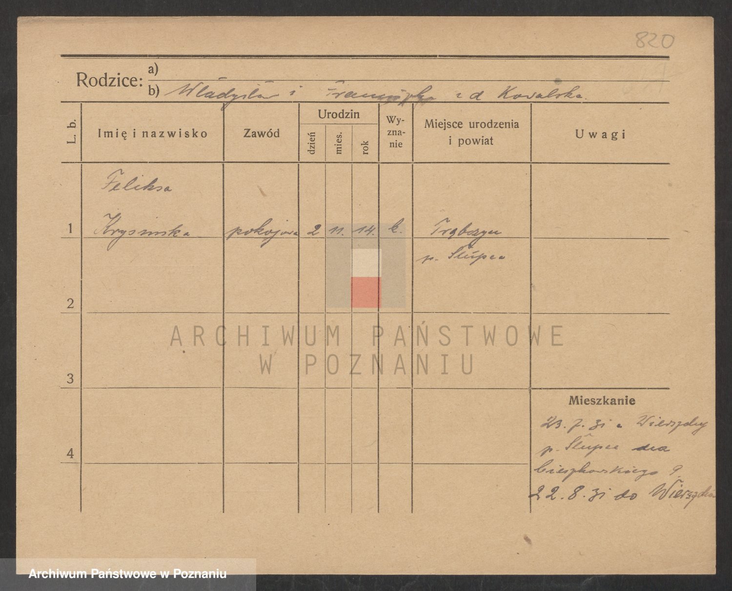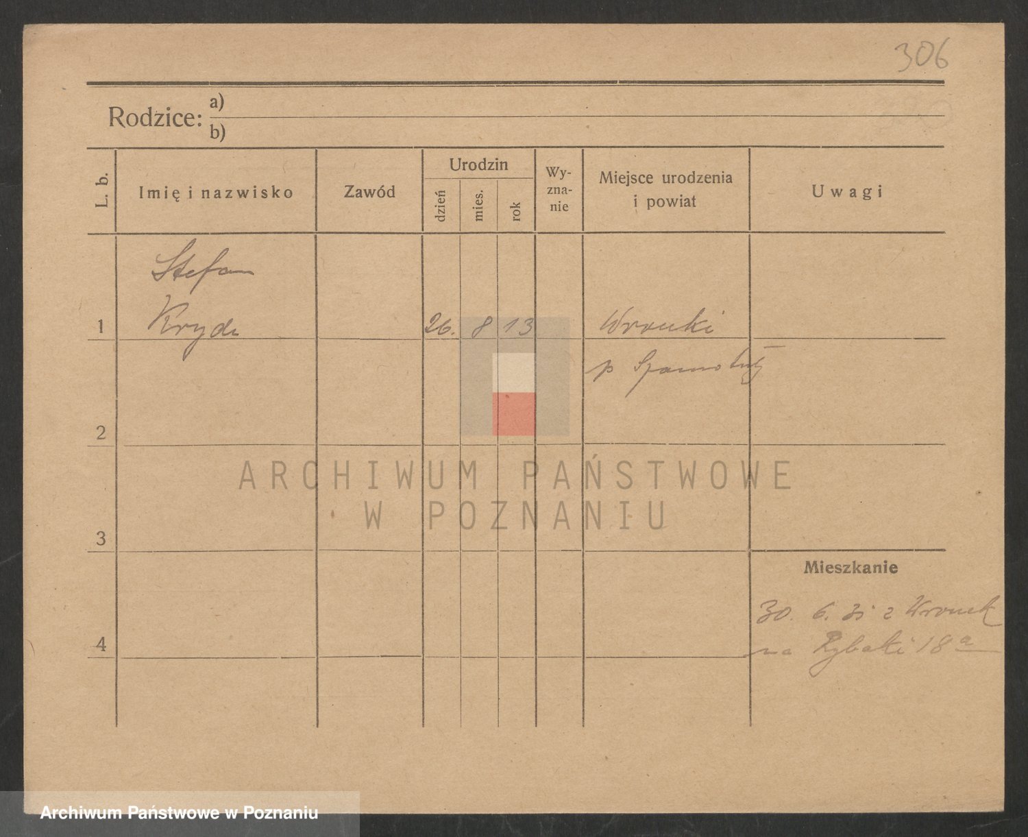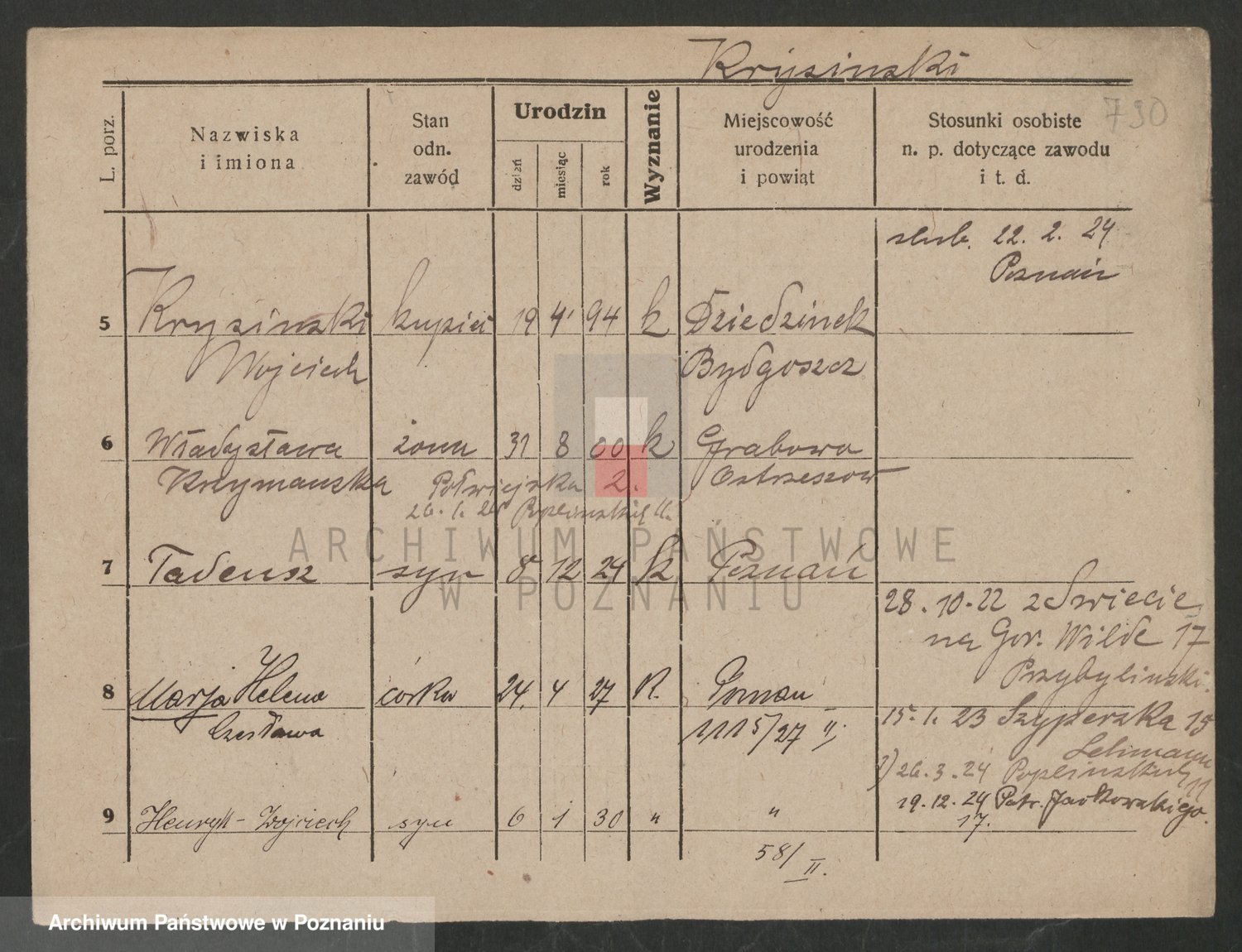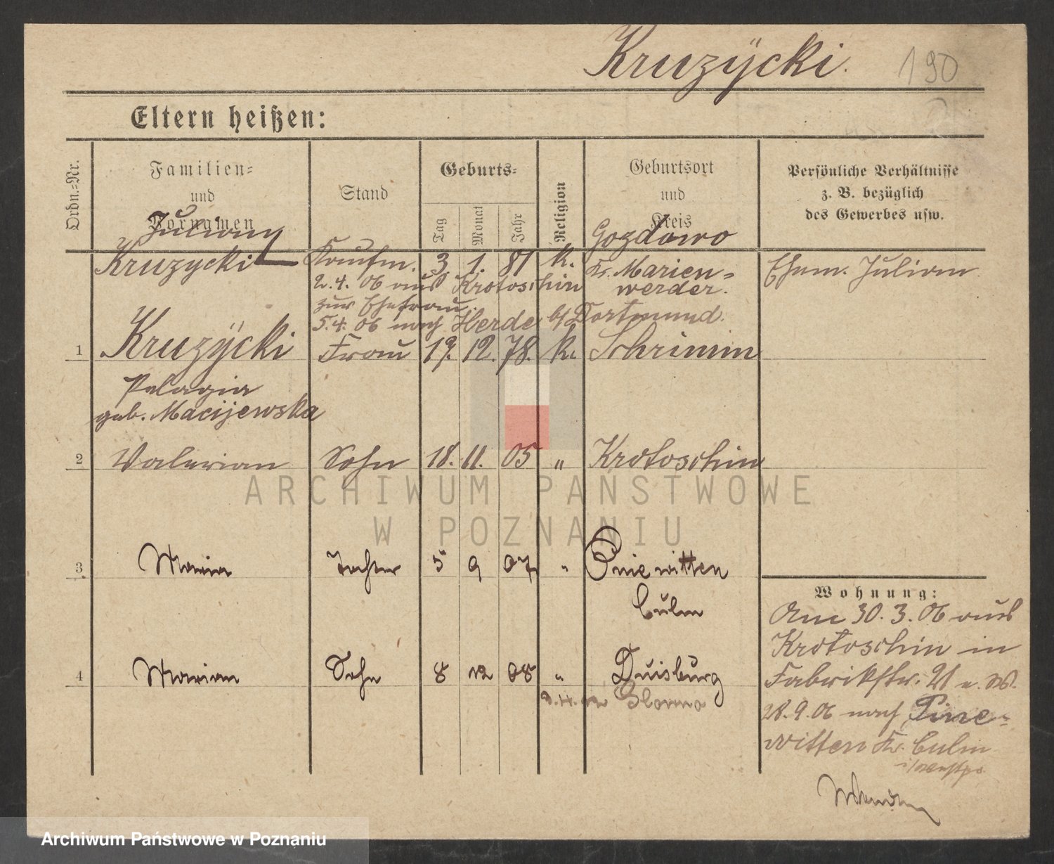 Podgląd karty osobowej dostępny jest po kliknięciu na nazwisko lub ikonkę karty. Można dokonywać powiększenia (ikony na górze) lub przechodzić między kolejnymi skanami (strzałki po bokach).