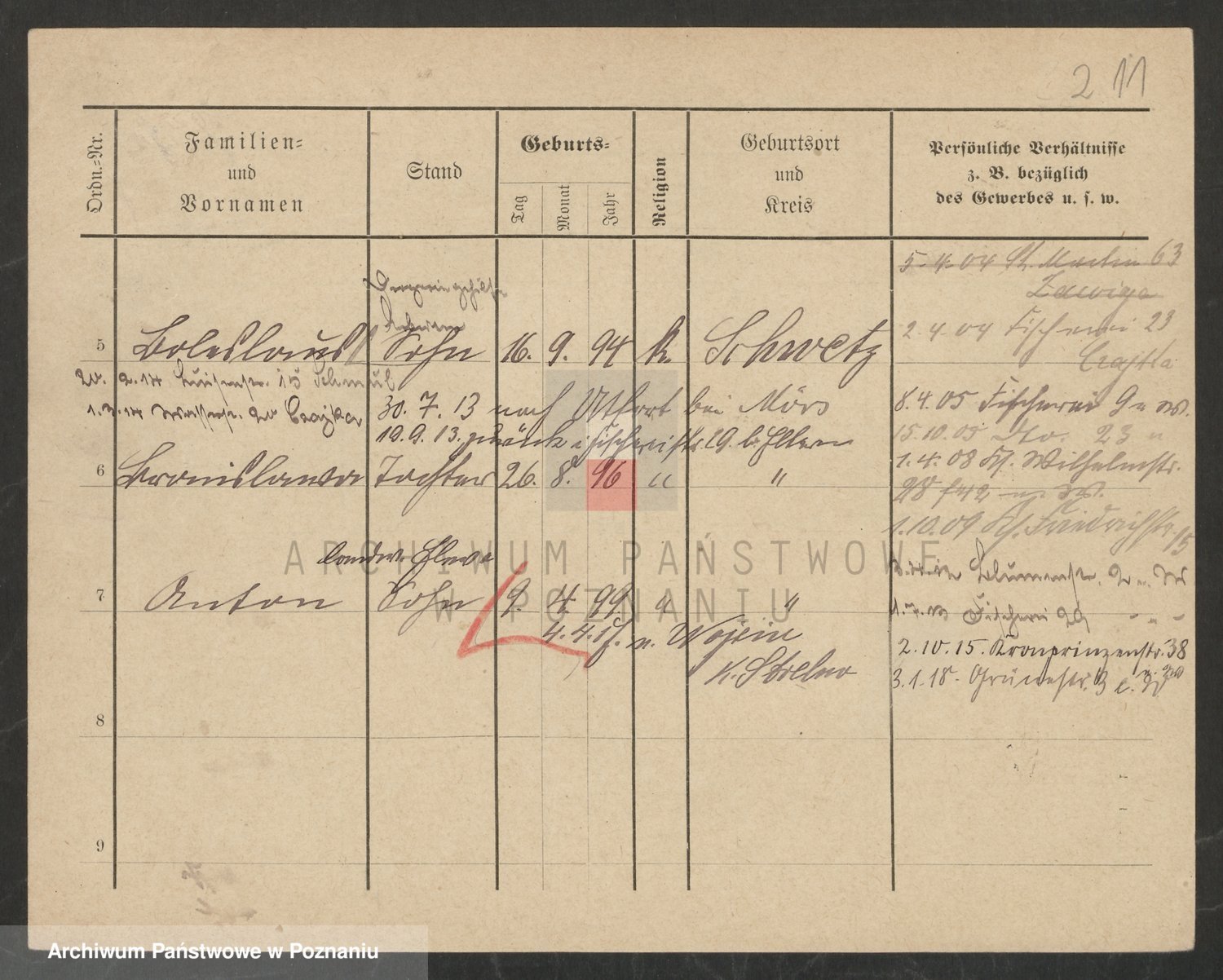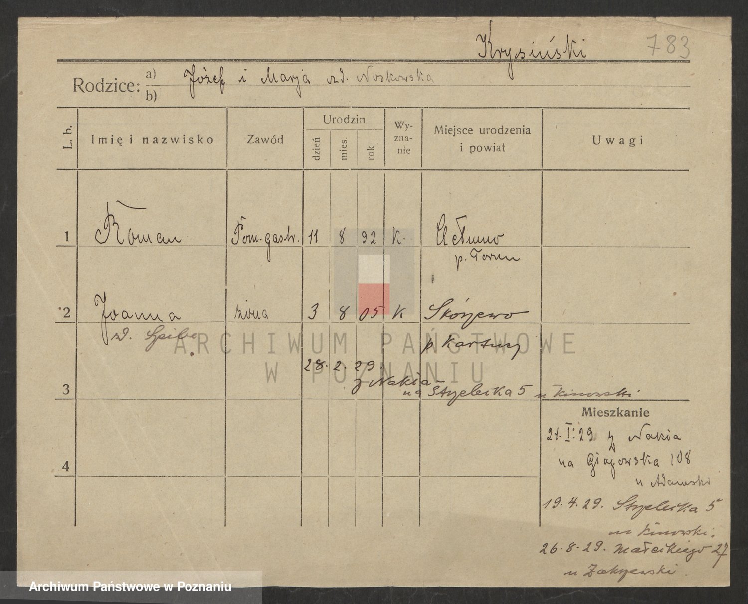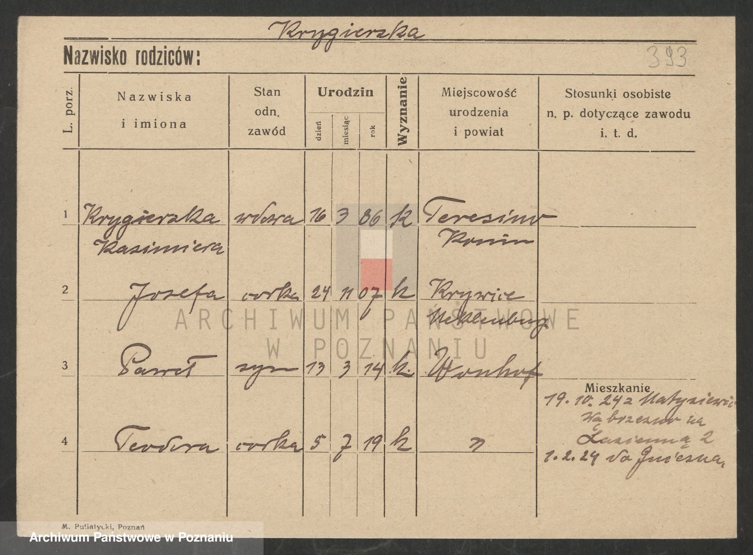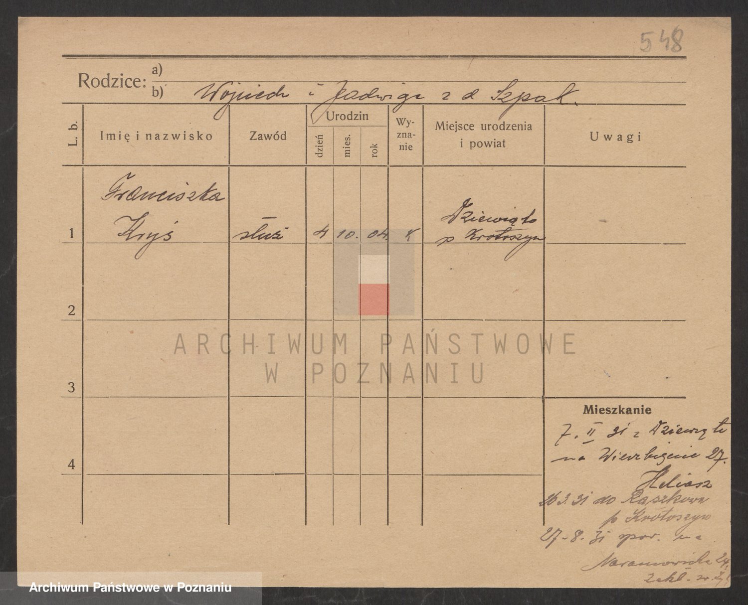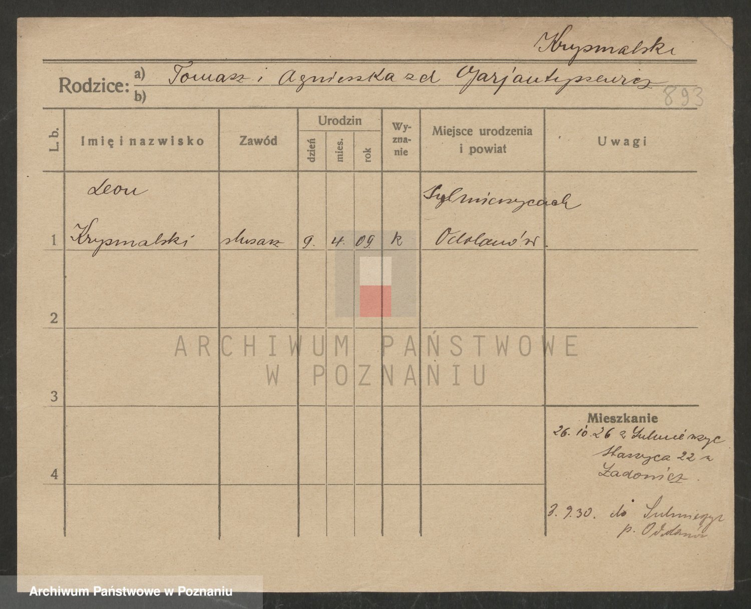 Podgląd karty osobowej dostępny jest po kliknięciu na nazwisko lub ikonkę karty. Można dokonywać powiększenia (ikony na górze) lub przechodzić między kolejnymi skanami (strzałki po bokach).