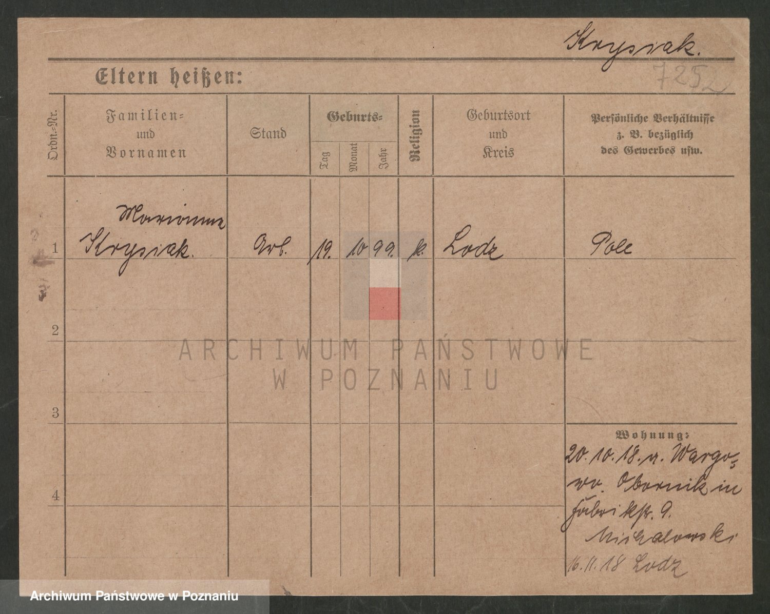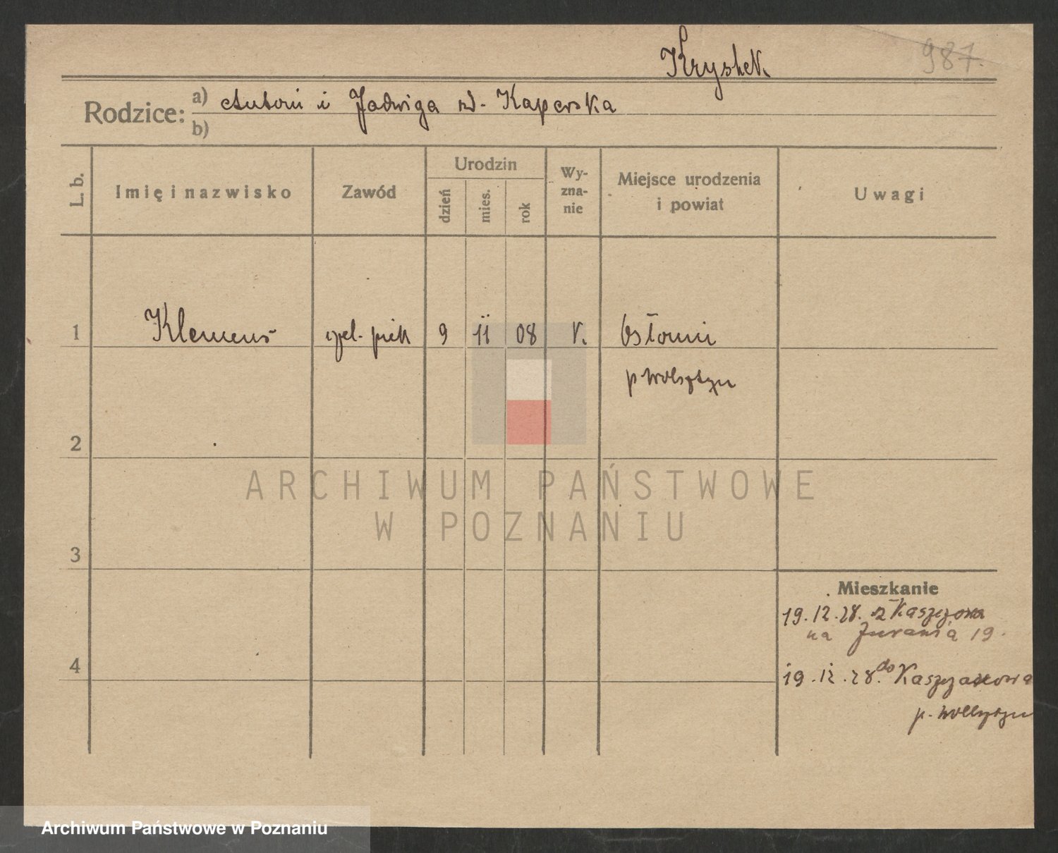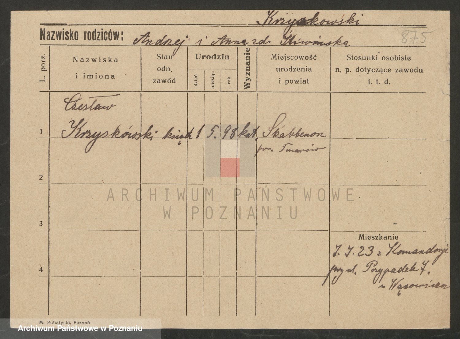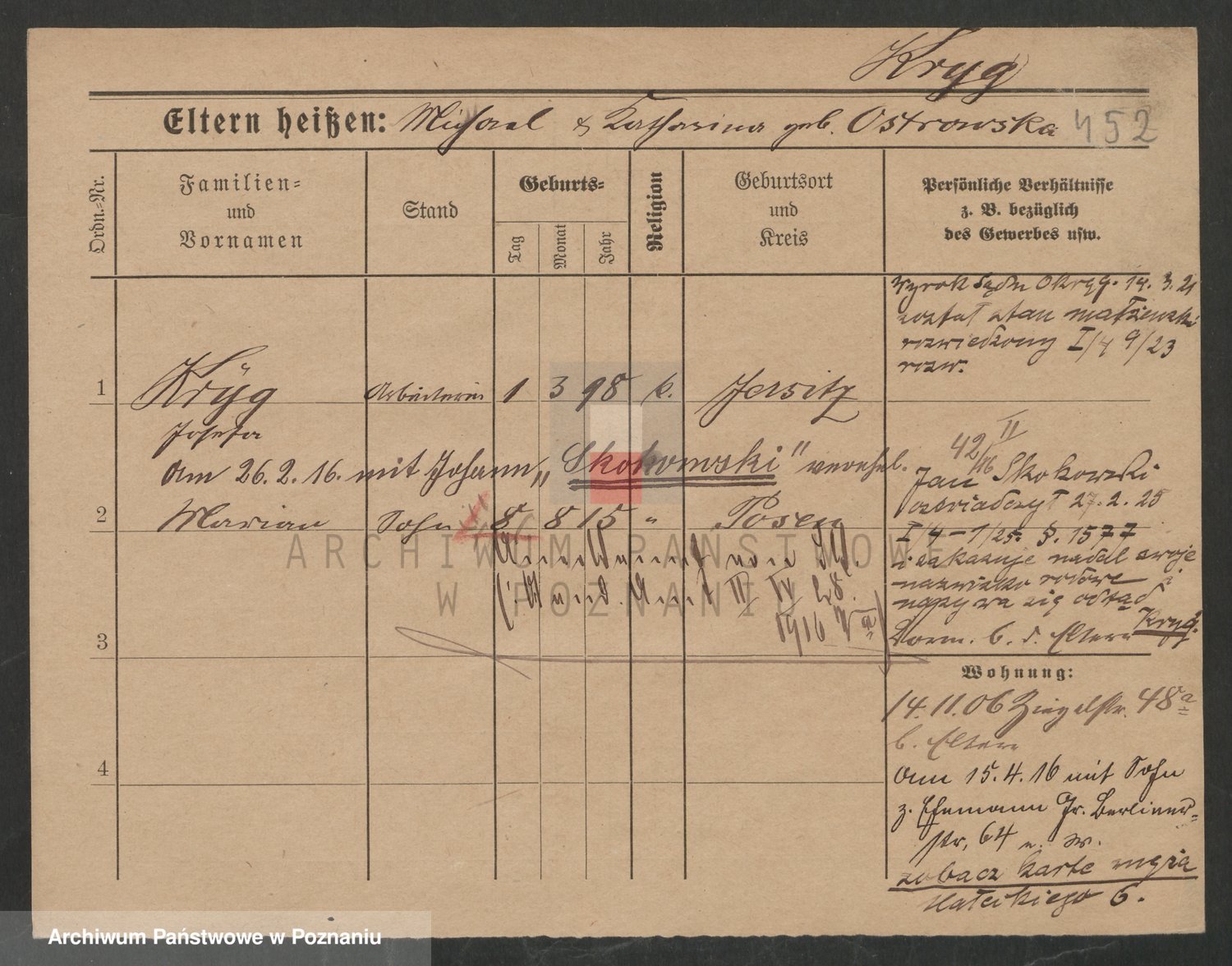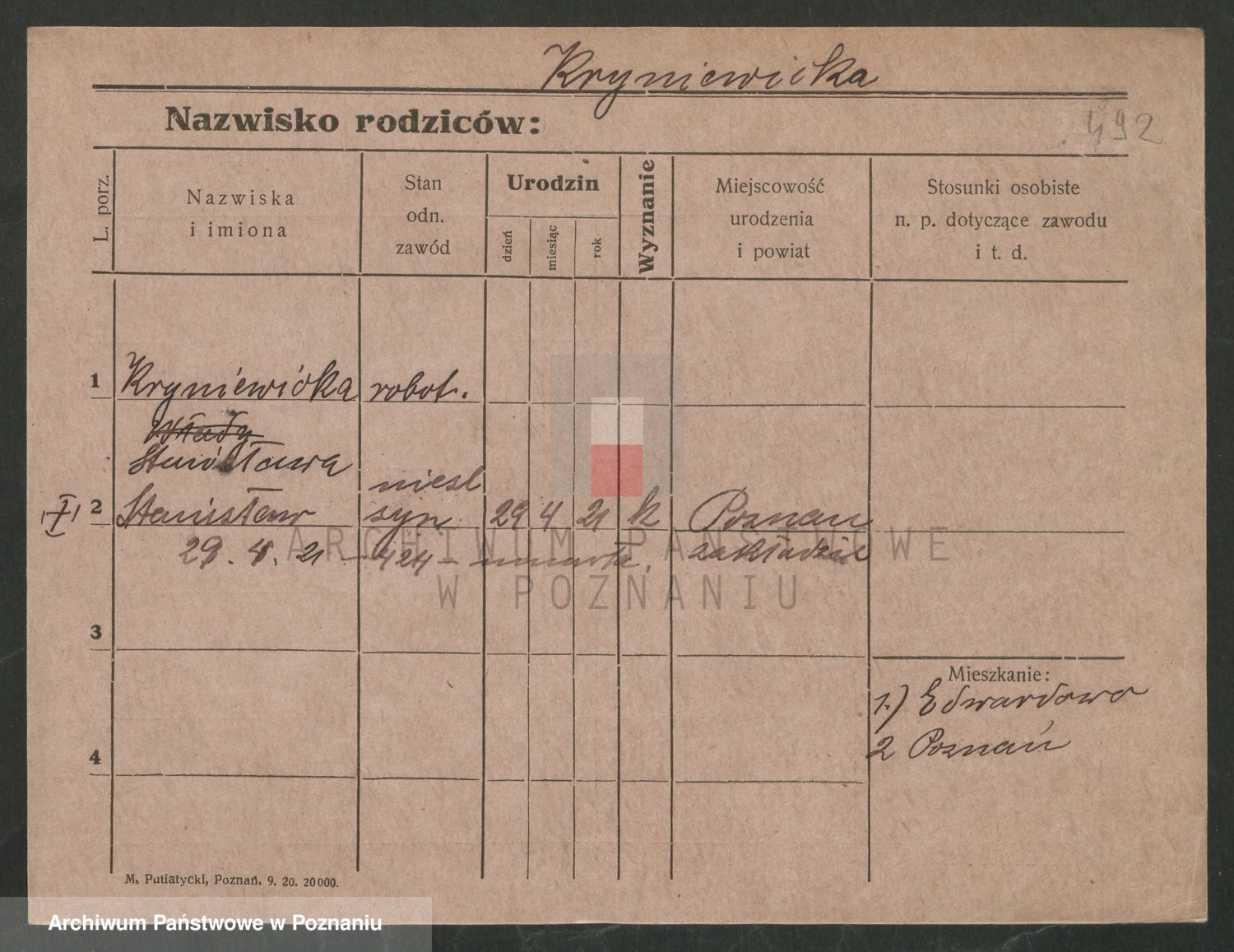 Podgląd karty osobowej dostępny jest po kliknięciu na nazwisko lub ikonkę karty. Można dokonywać powiększenia (ikony na górze) lub przechodzić między kolejnymi skanami (strzałki po bokach).
