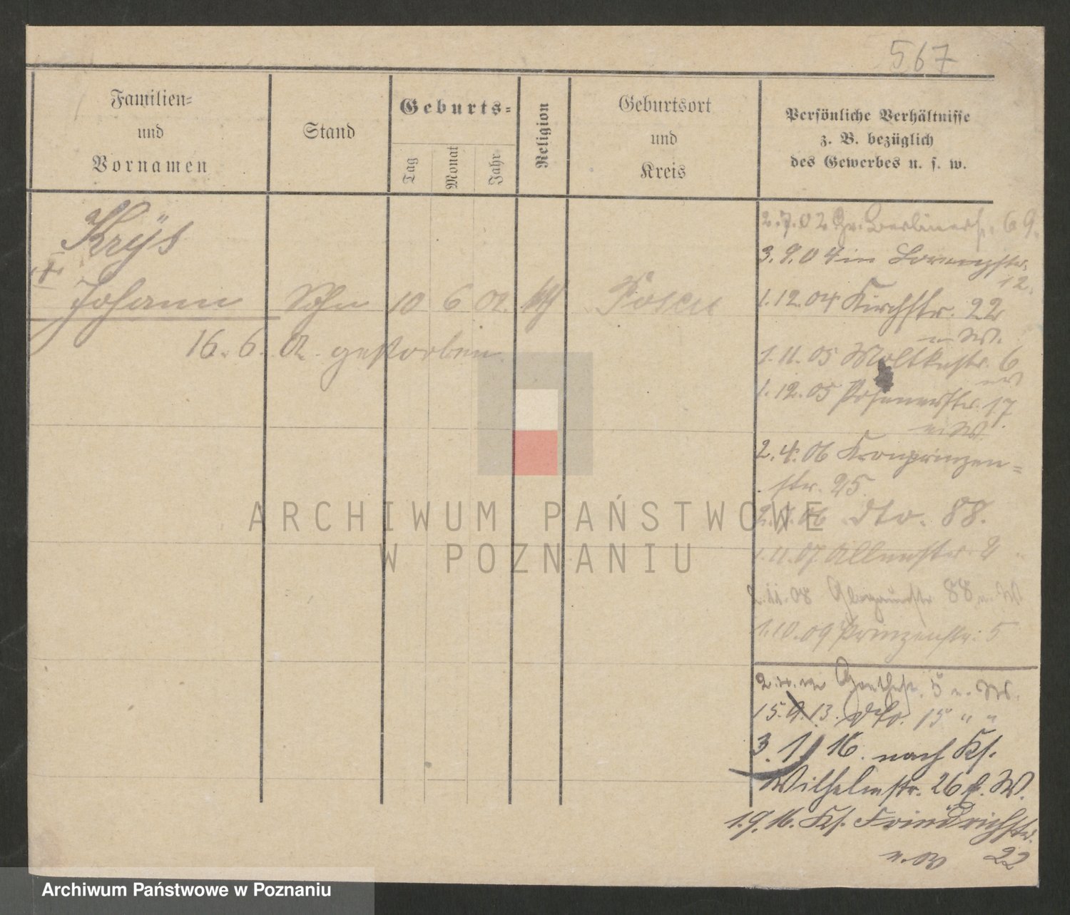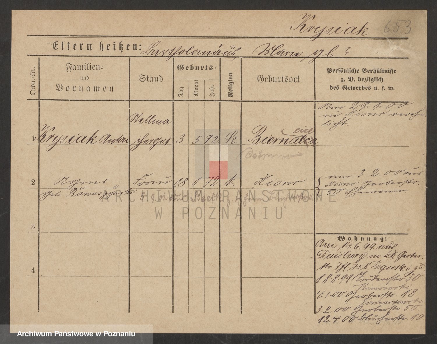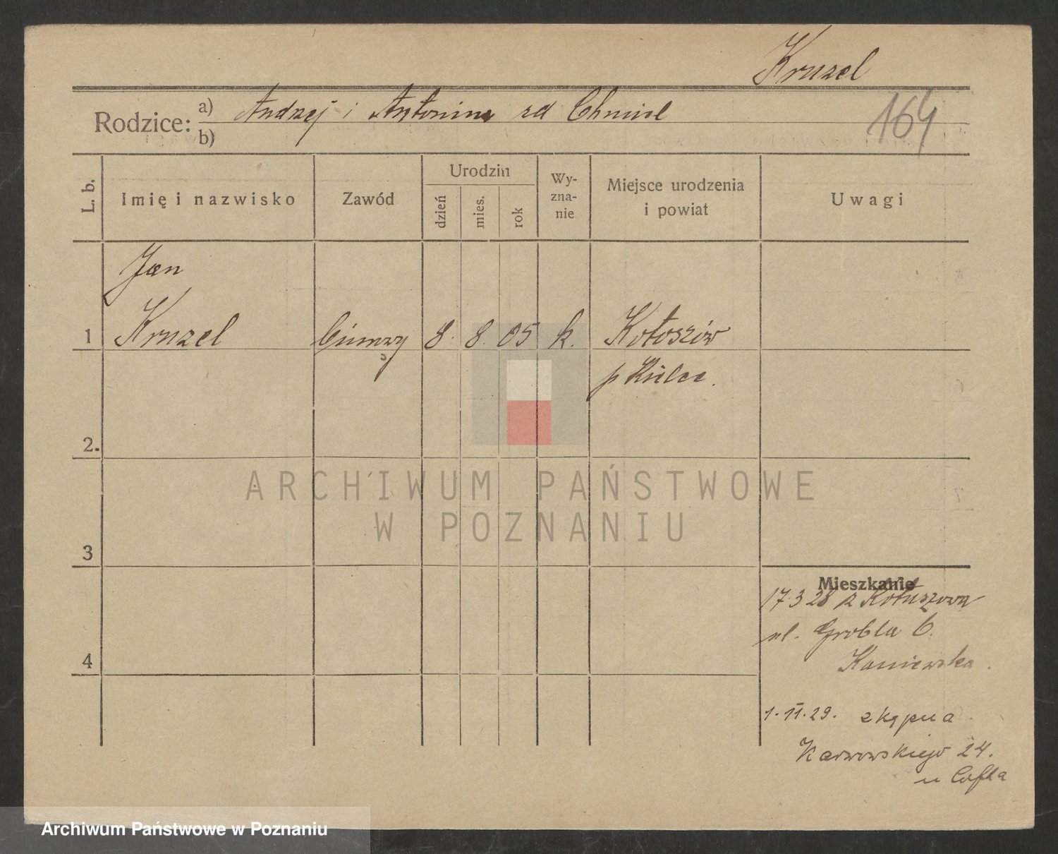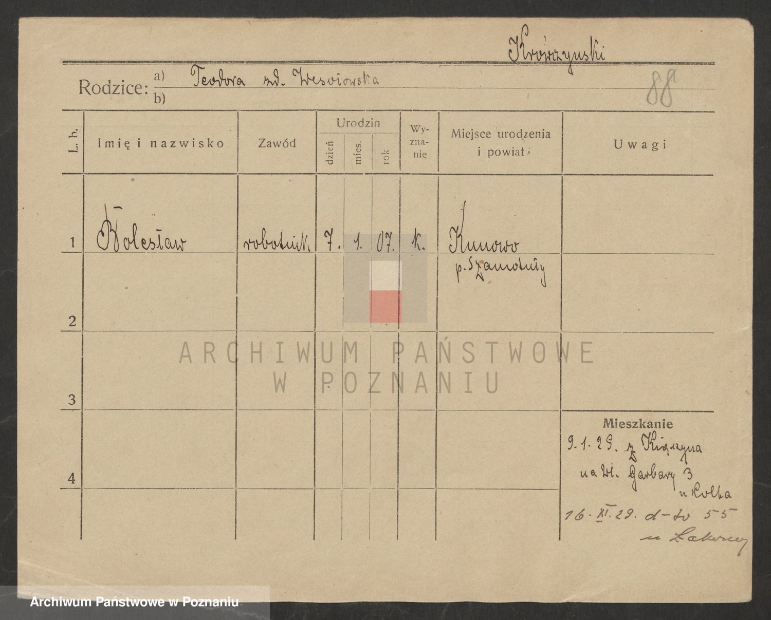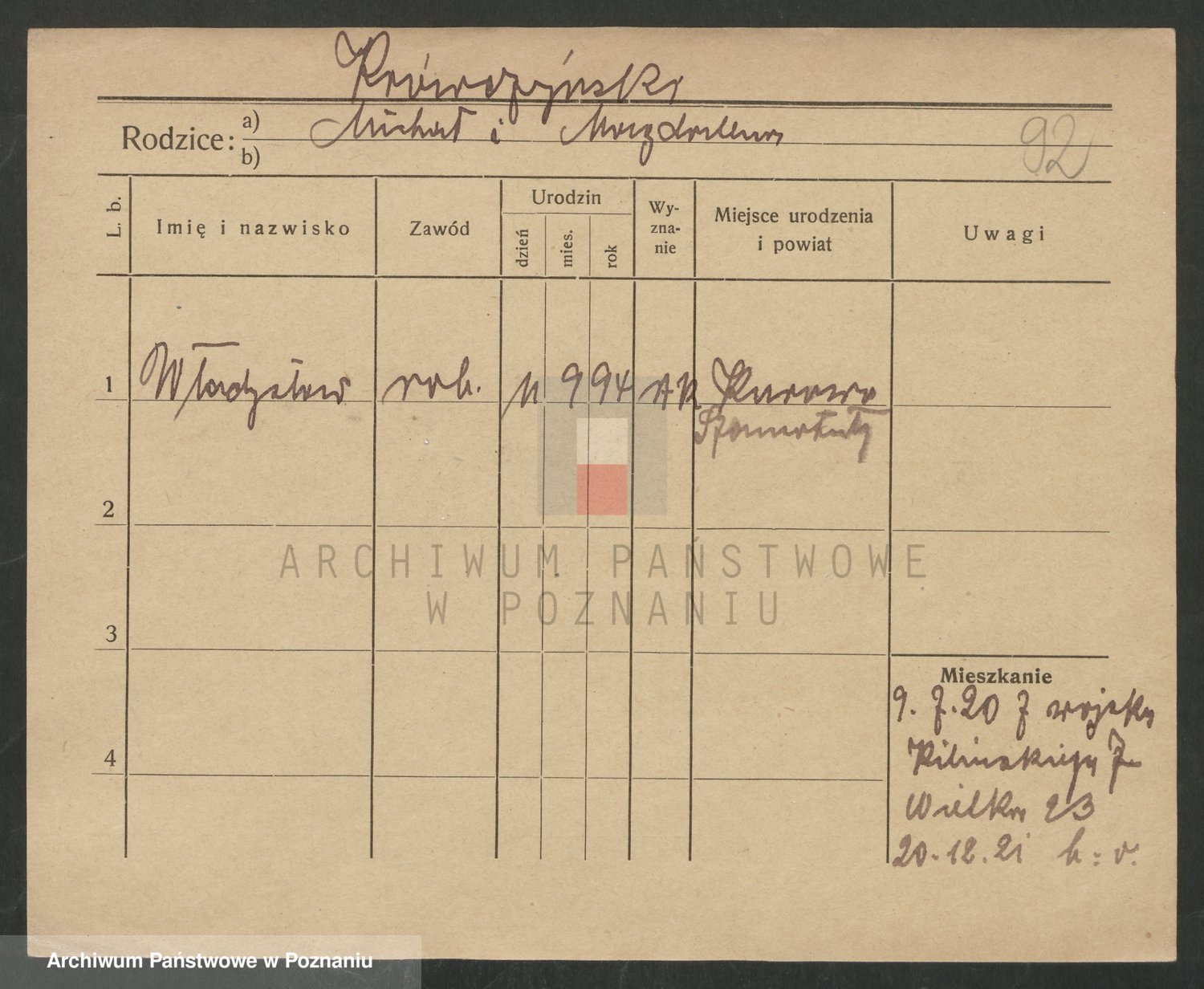 Podgląd karty osobowej dostępny jest po kliknięciu na nazwisko lub ikonkę karty. Można dokonywać powiększenia (ikony na górze) lub przechodzić między kolejnymi skanami (strzałki po bokach).