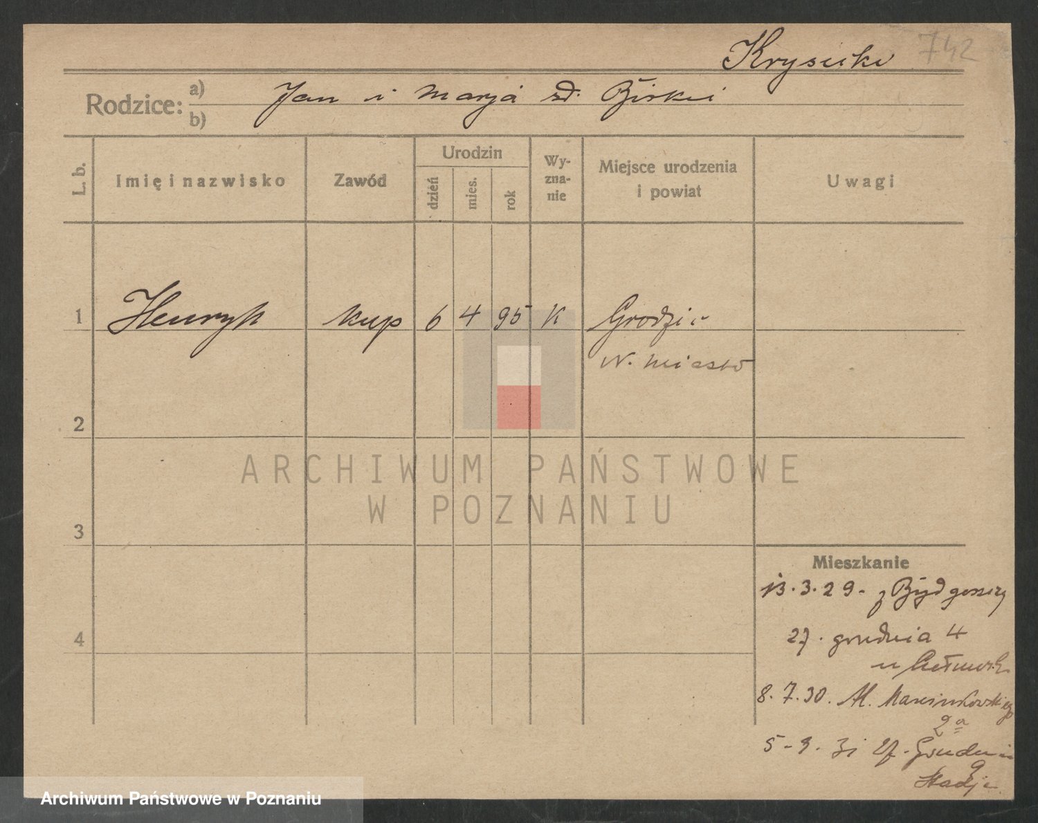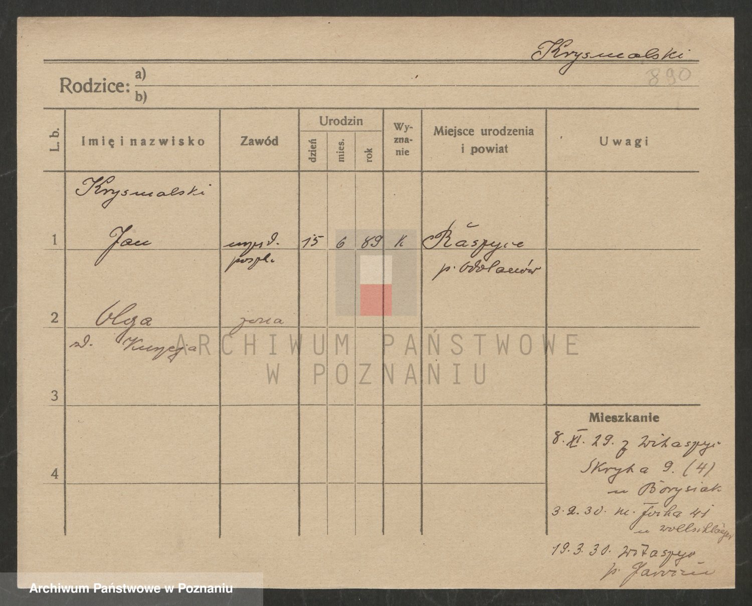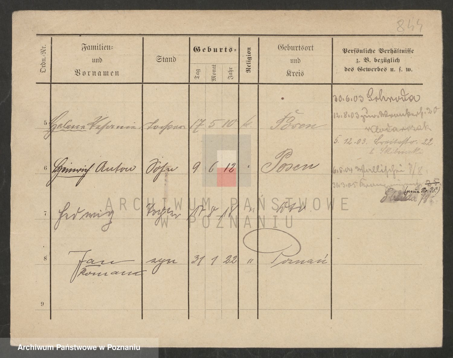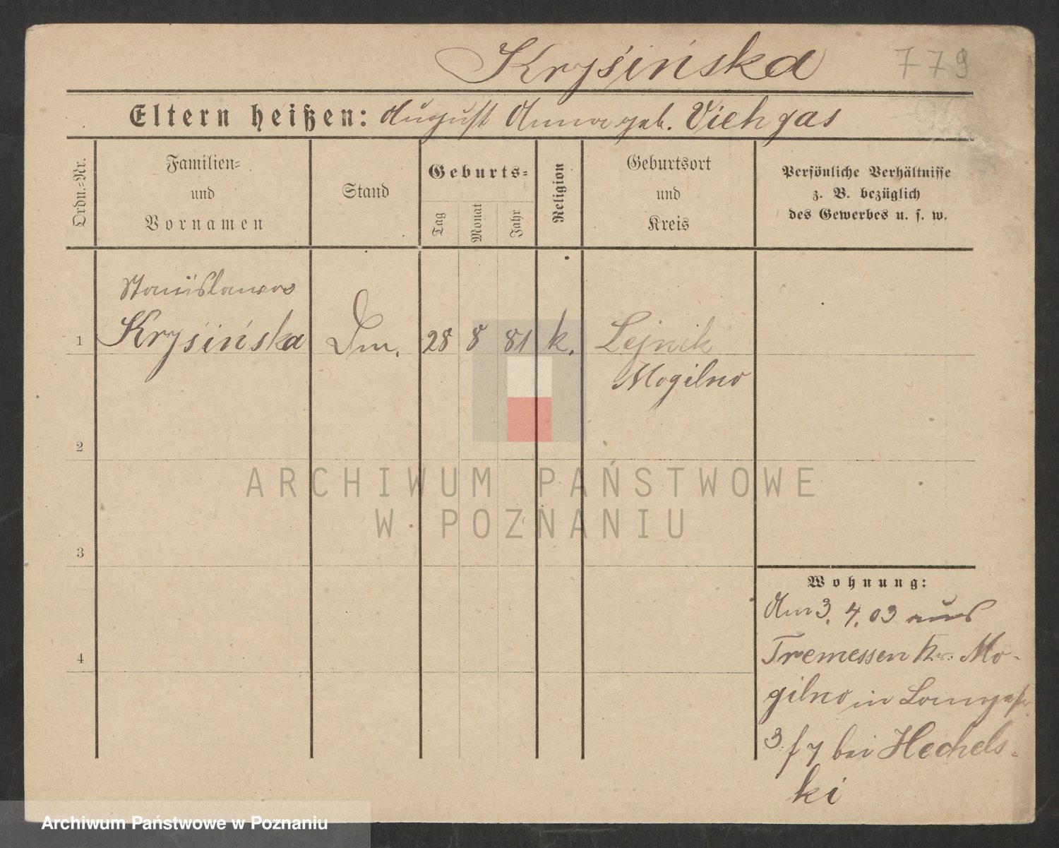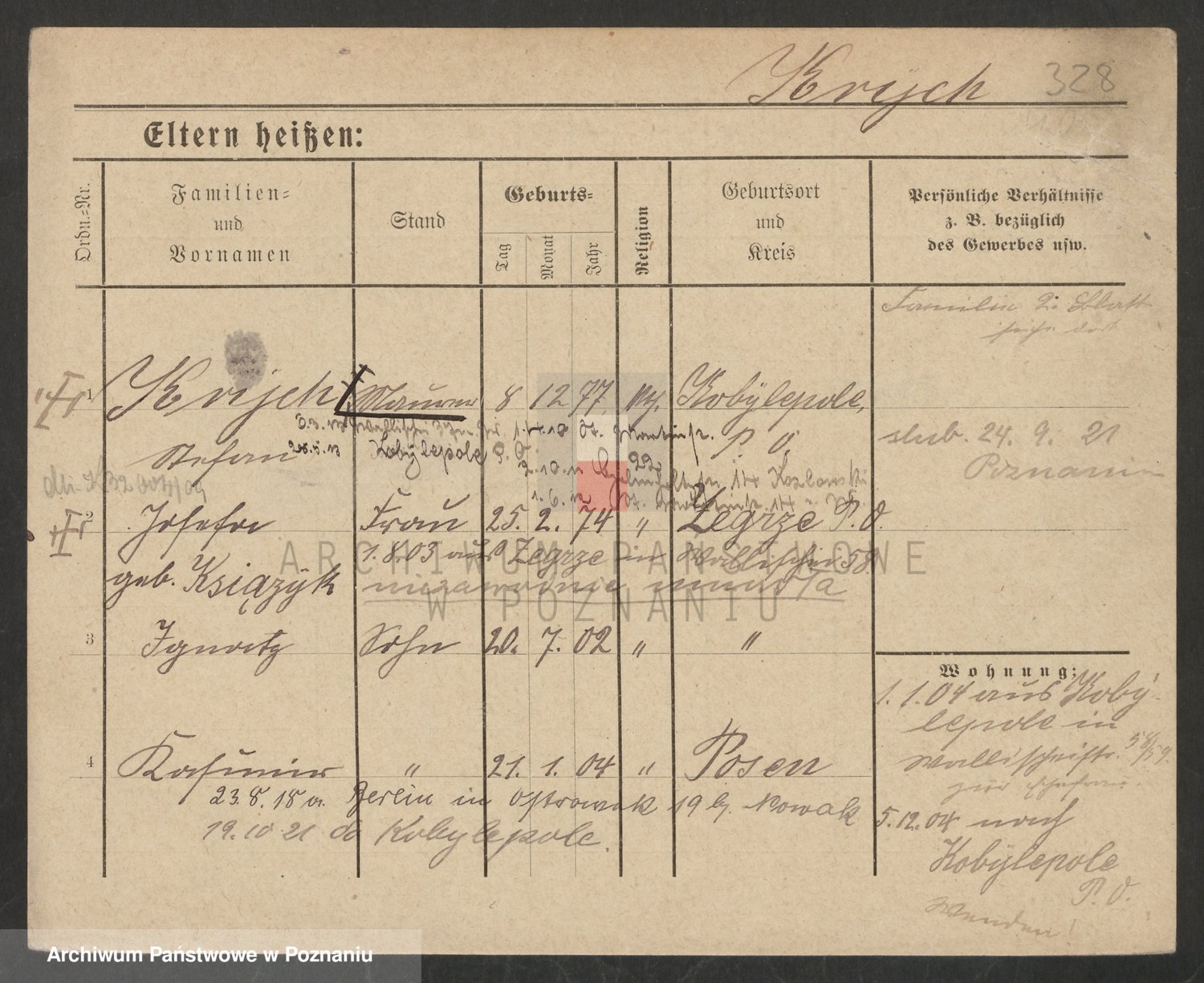 Podgląd karty osobowej dostępny jest po kliknięciu na nazwisko lub ikonkę karty. Można dokonywać powiększenia (ikony na górze) lub przechodzić między kolejnymi skanami (strzałki po bokach).