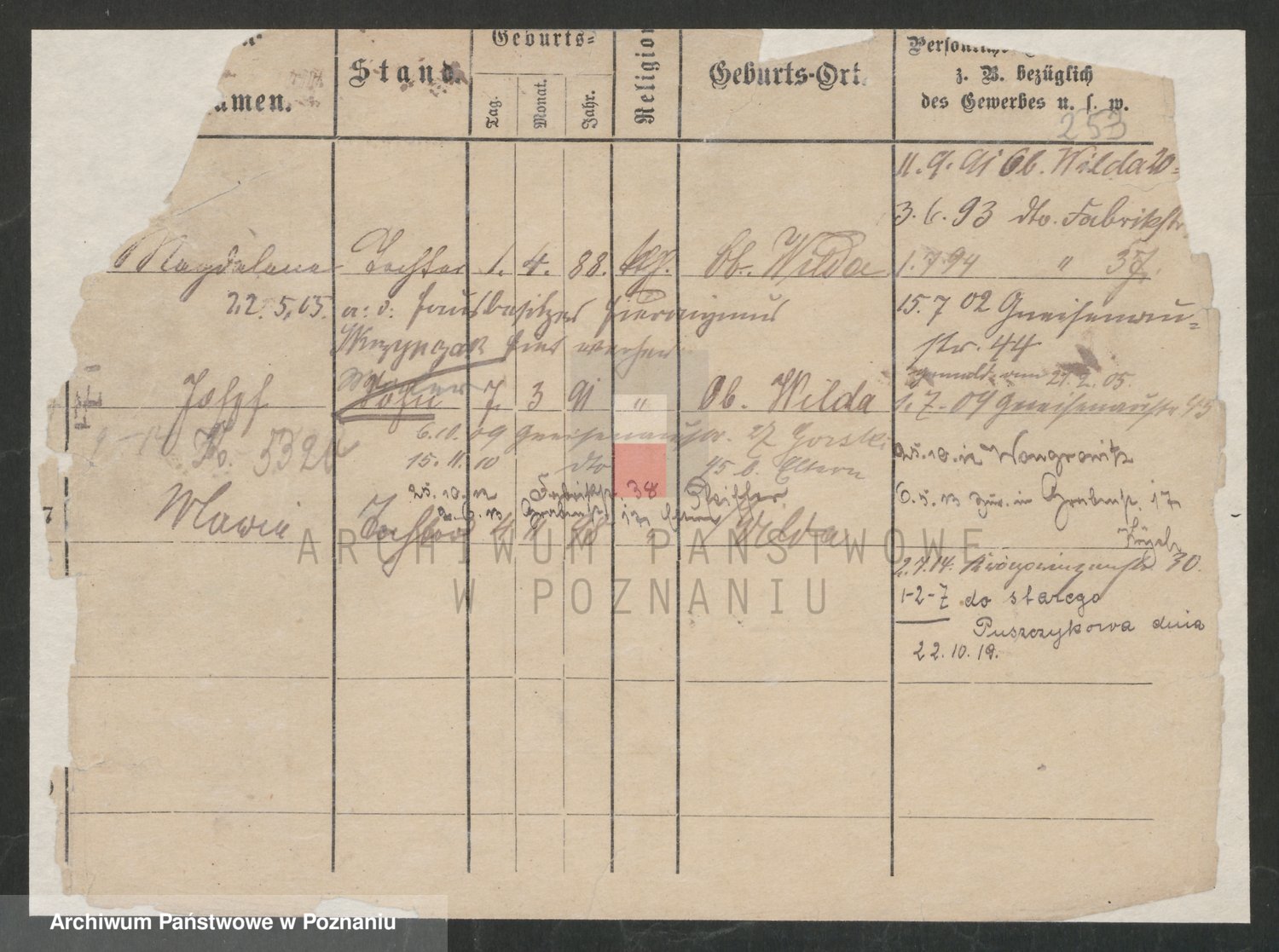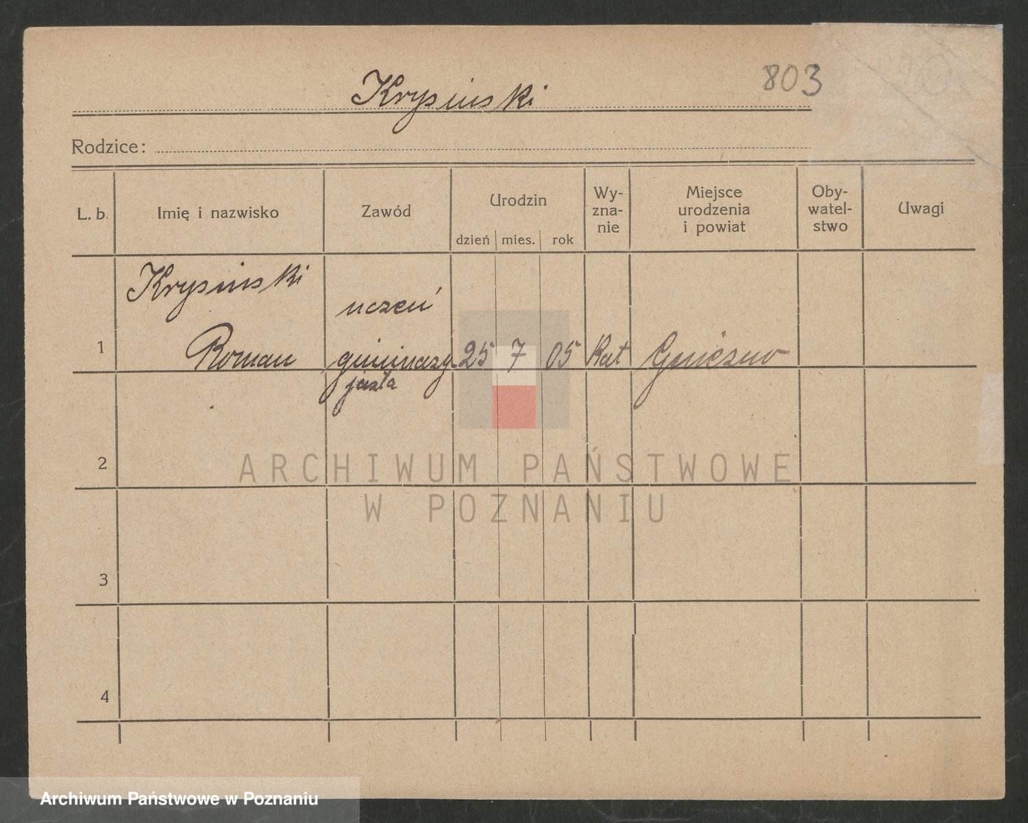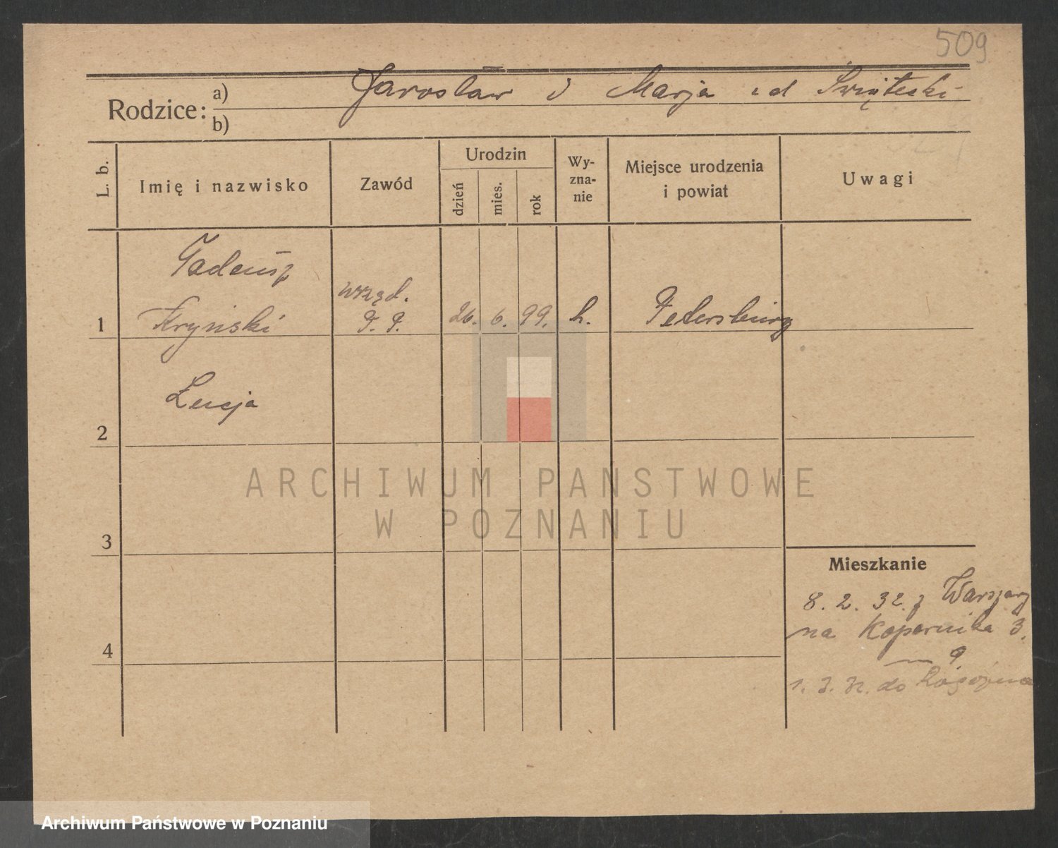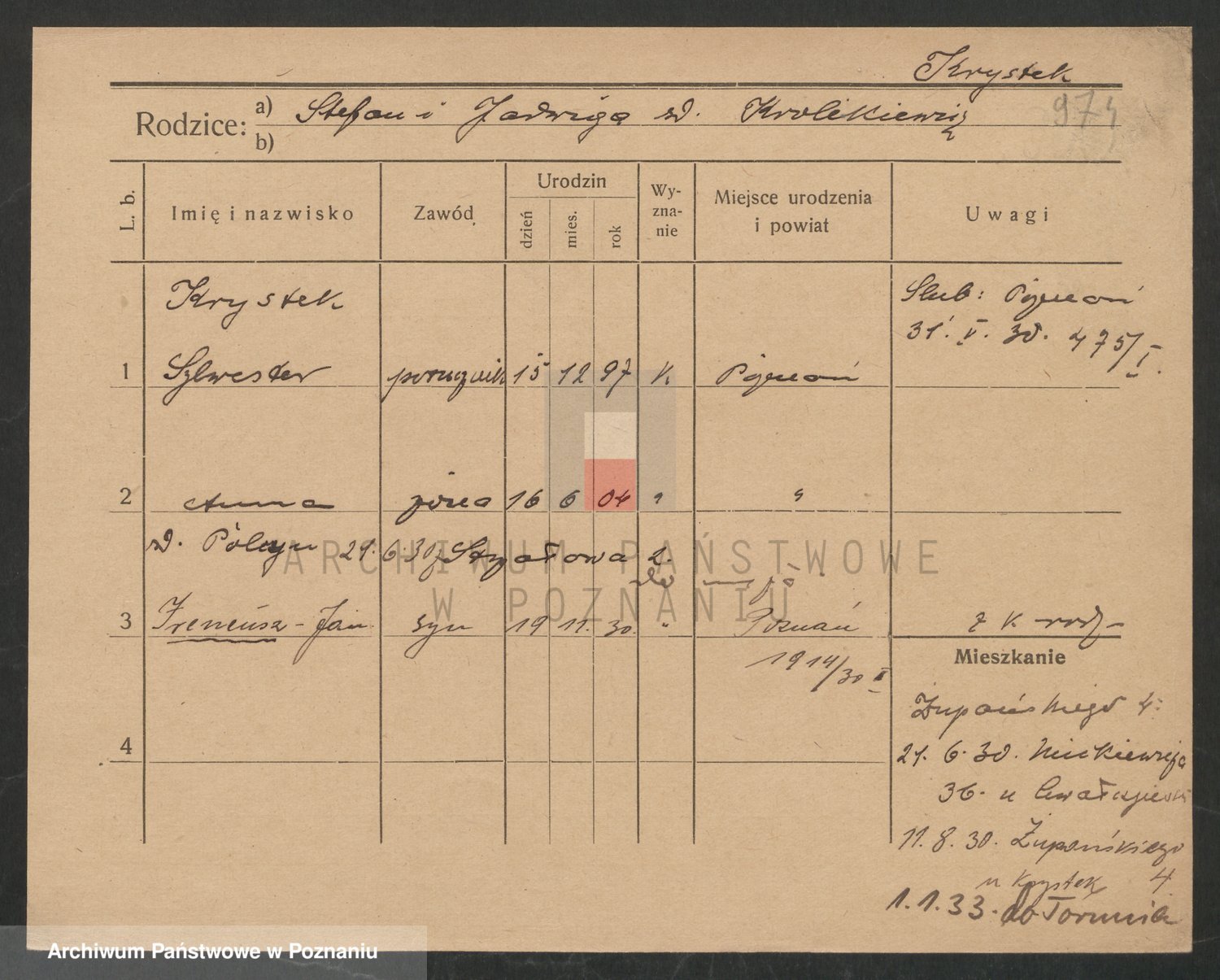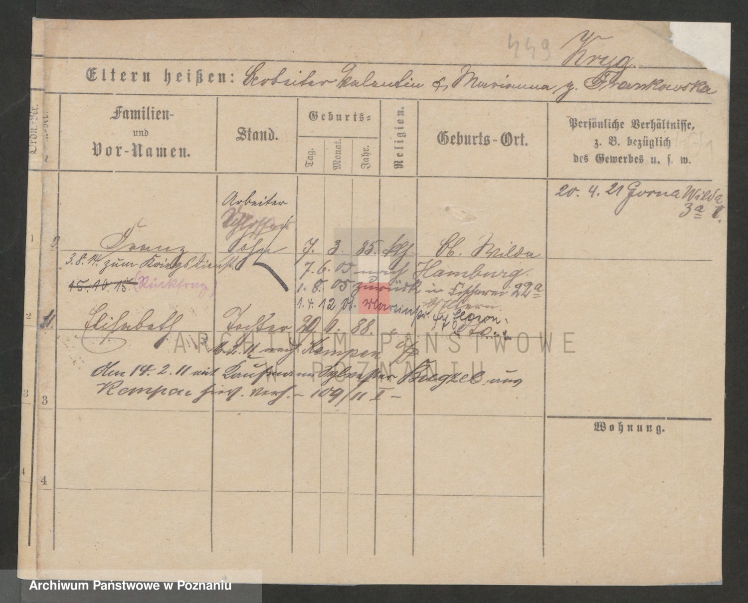 Podgląd karty osobowej dostępny jest po kliknięciu na nazwisko lub ikonkę karty. Można dokonywać powiększenia (ikony na górze) lub przechodzić między kolejnymi skanami (strzałki po bokach).