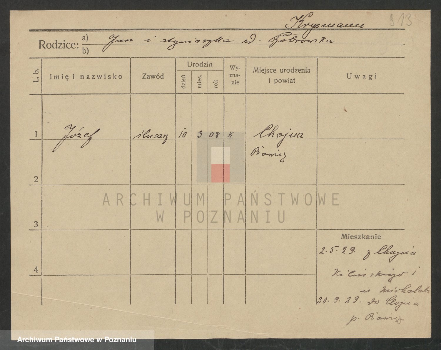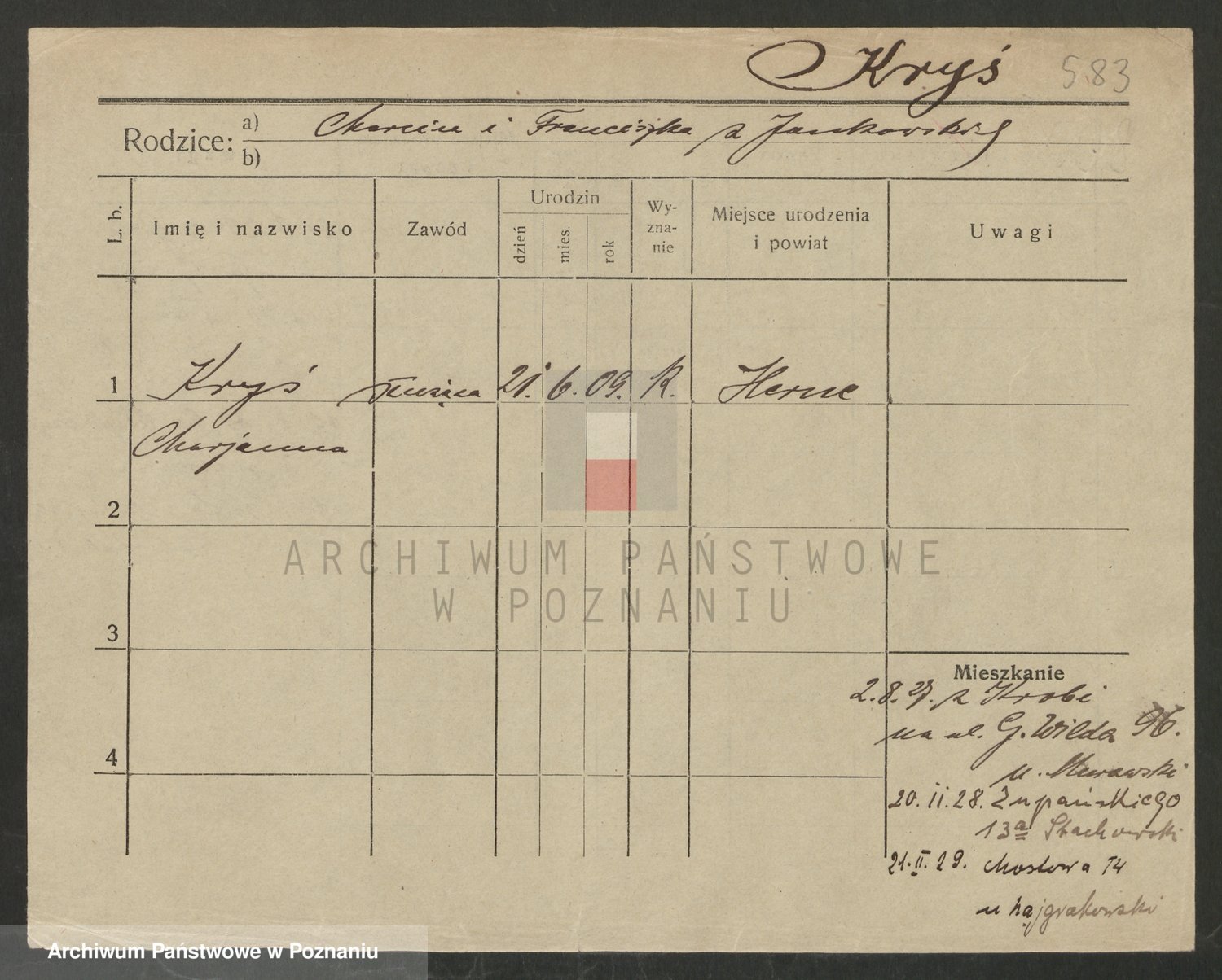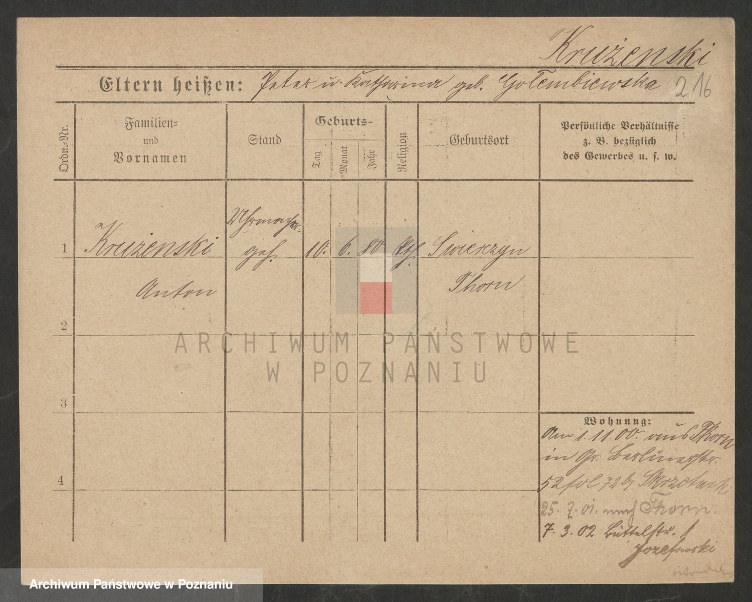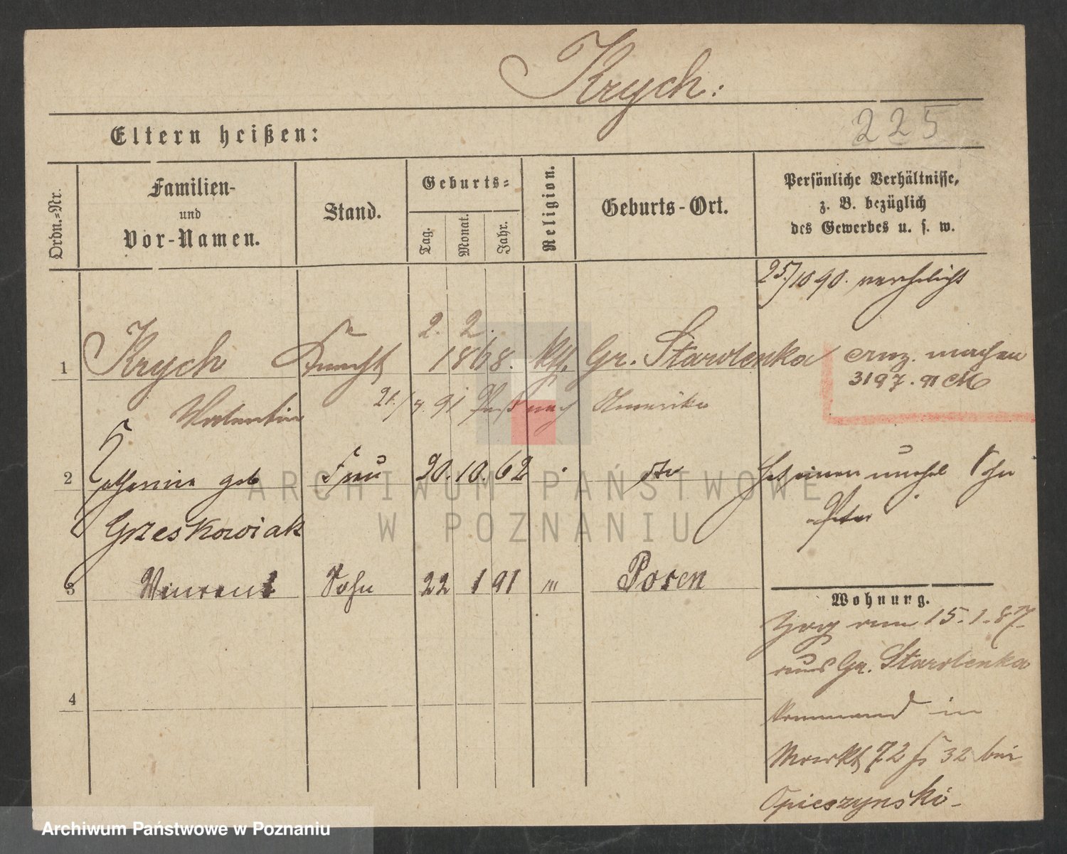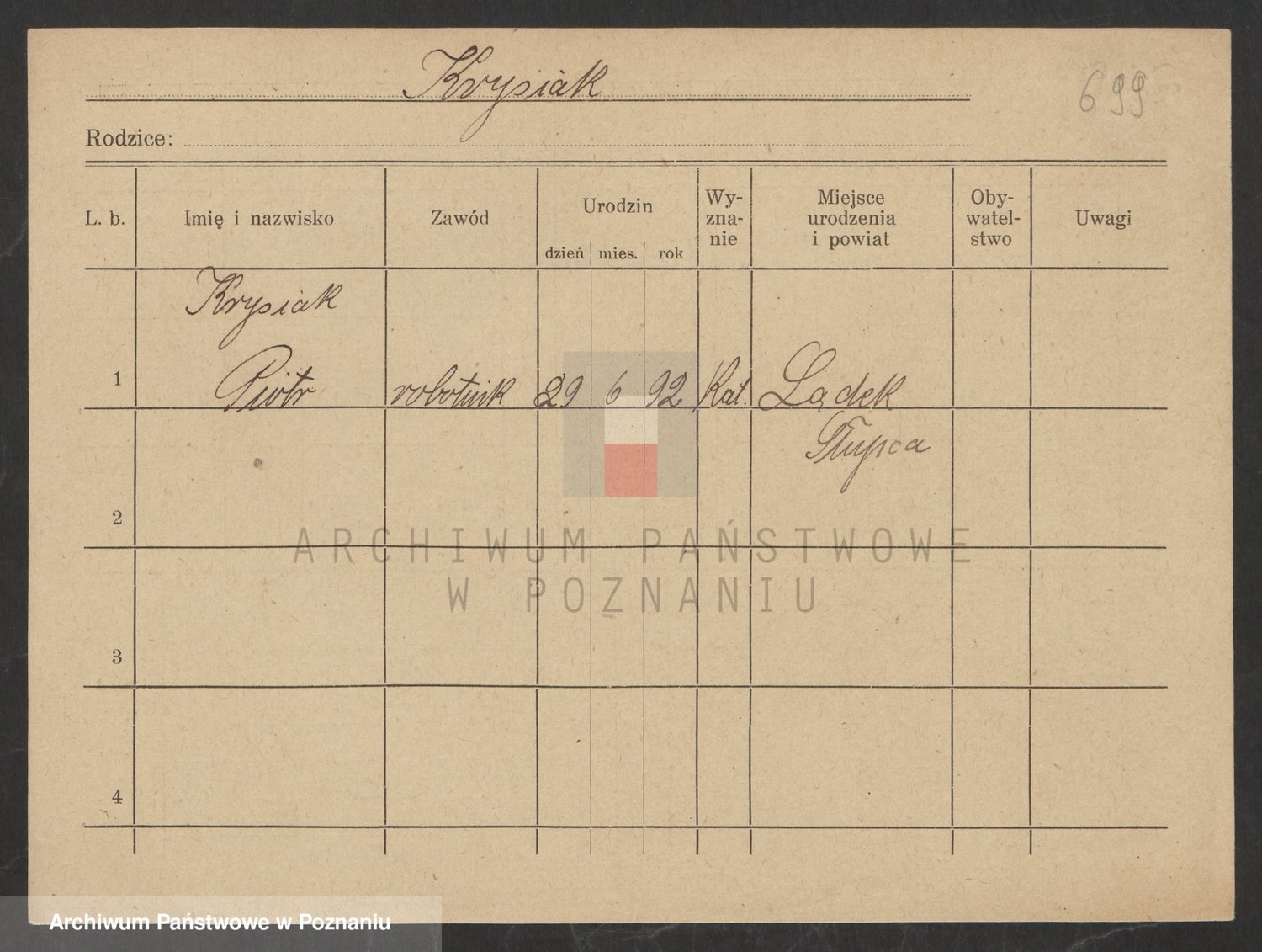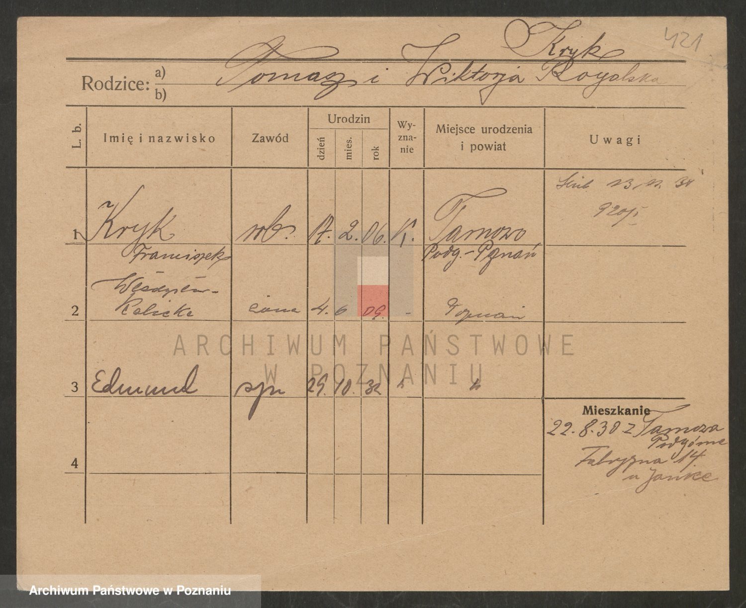 Podgląd karty osobowej dostępny jest po kliknięciu na nazwisko lub ikonkę karty. Można dokonywać powiększenia (ikony na górze) lub przechodzić między kolejnymi skanami (strzałki po bokach).