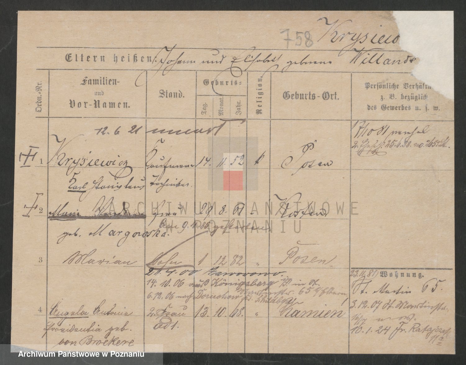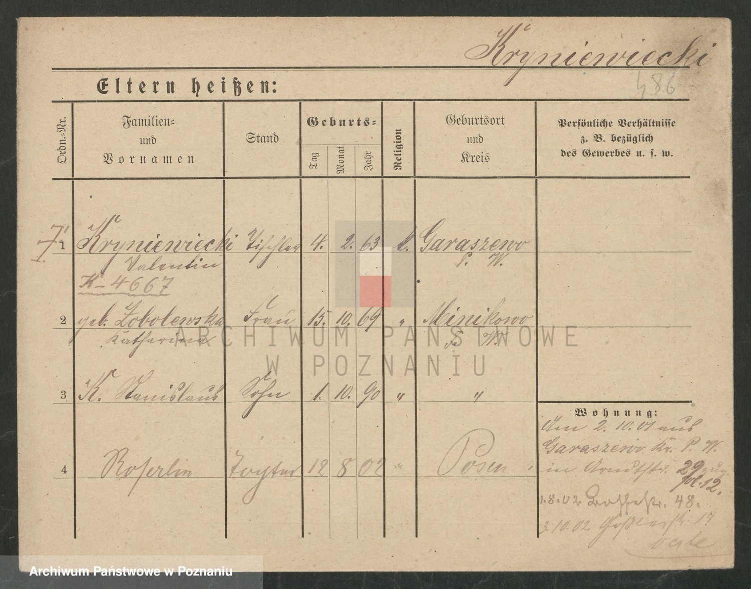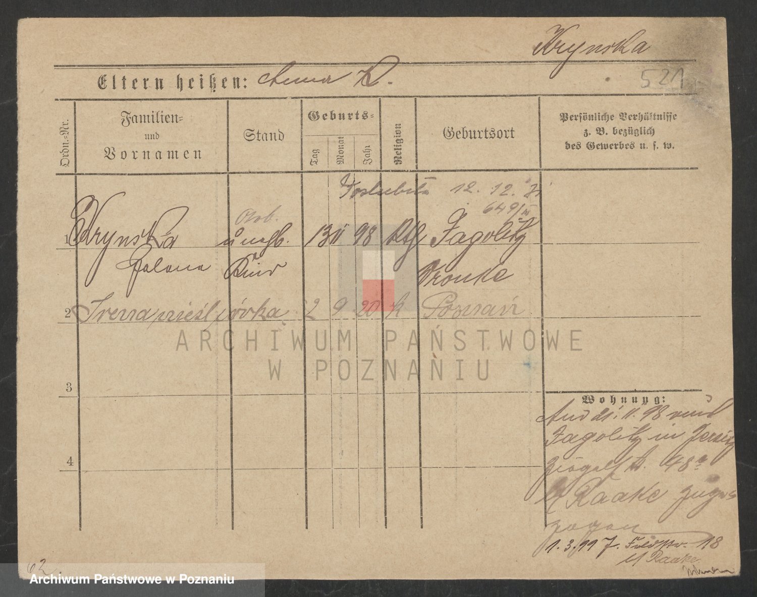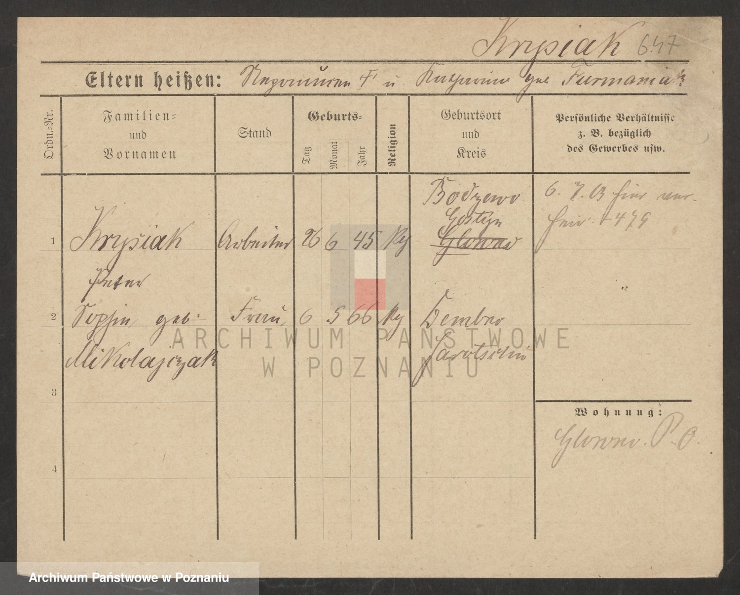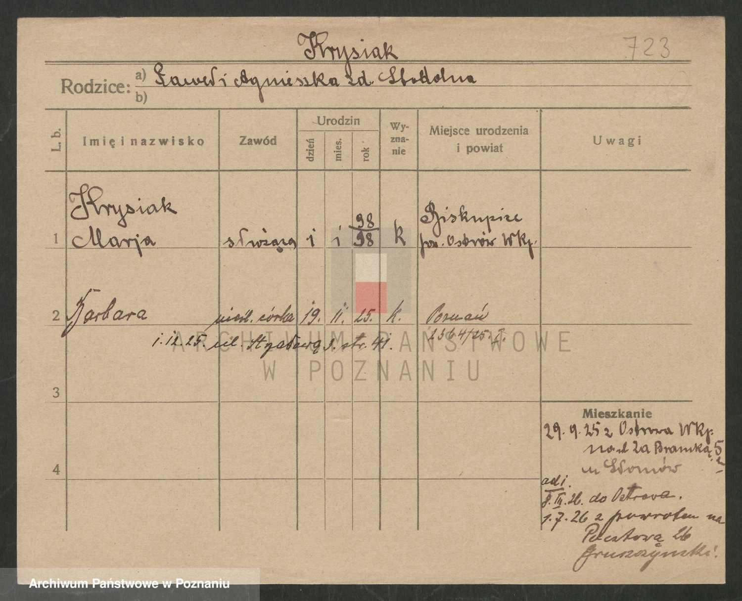 Podgląd karty osobowej dostępny jest po kliknięciu na nazwisko lub ikonkę karty. Można dokonywać powiększenia (ikony na górze) lub przechodzić między kolejnymi skanami (strzałki po bokach).