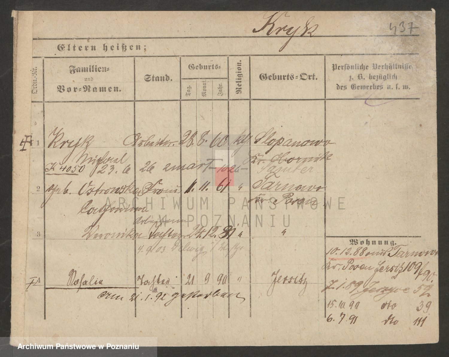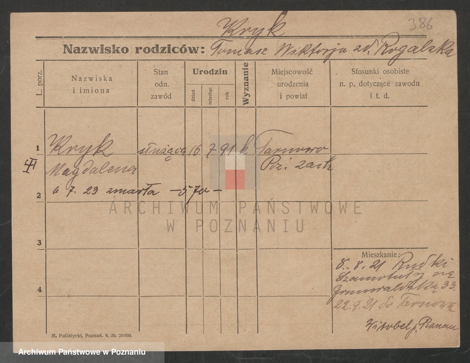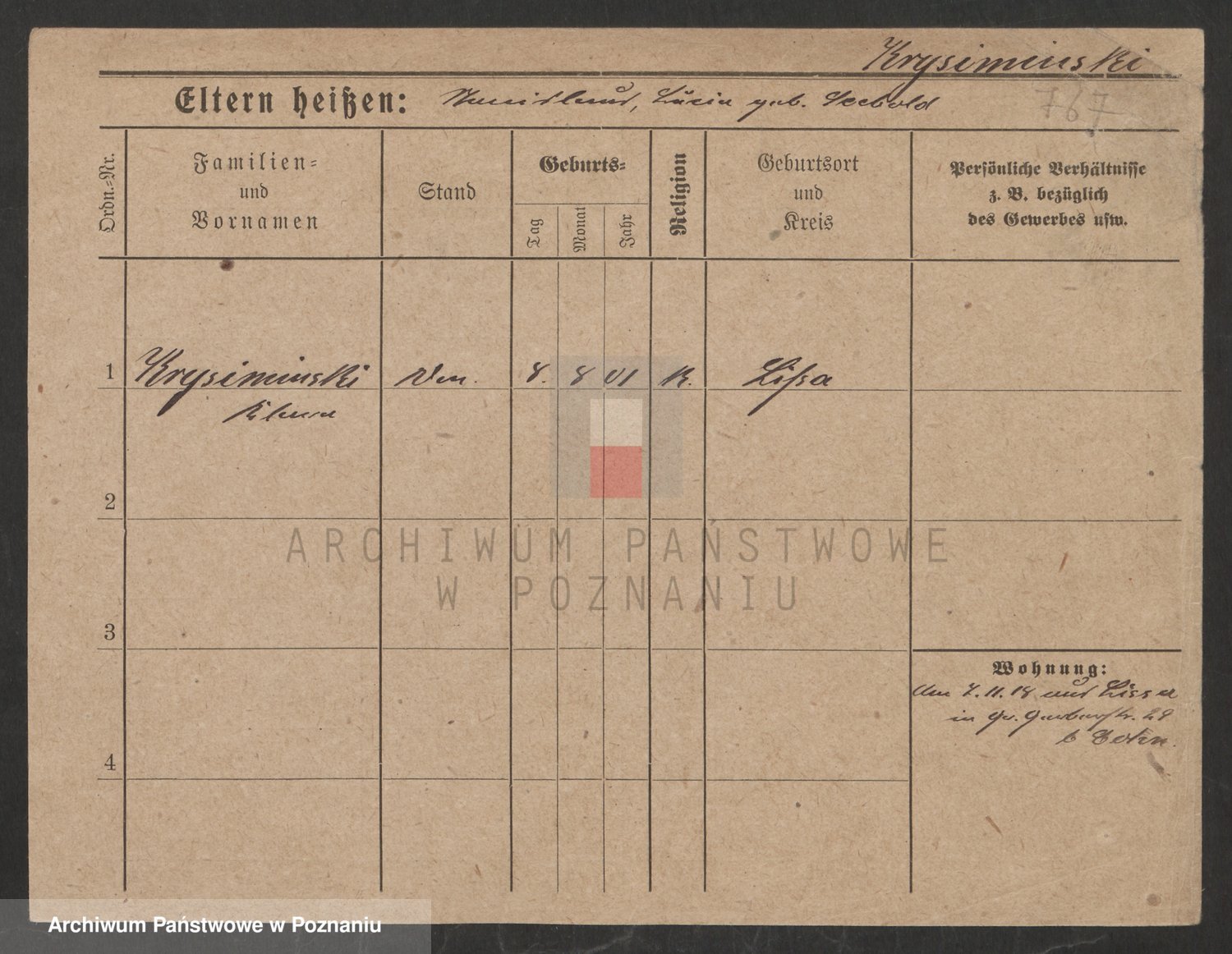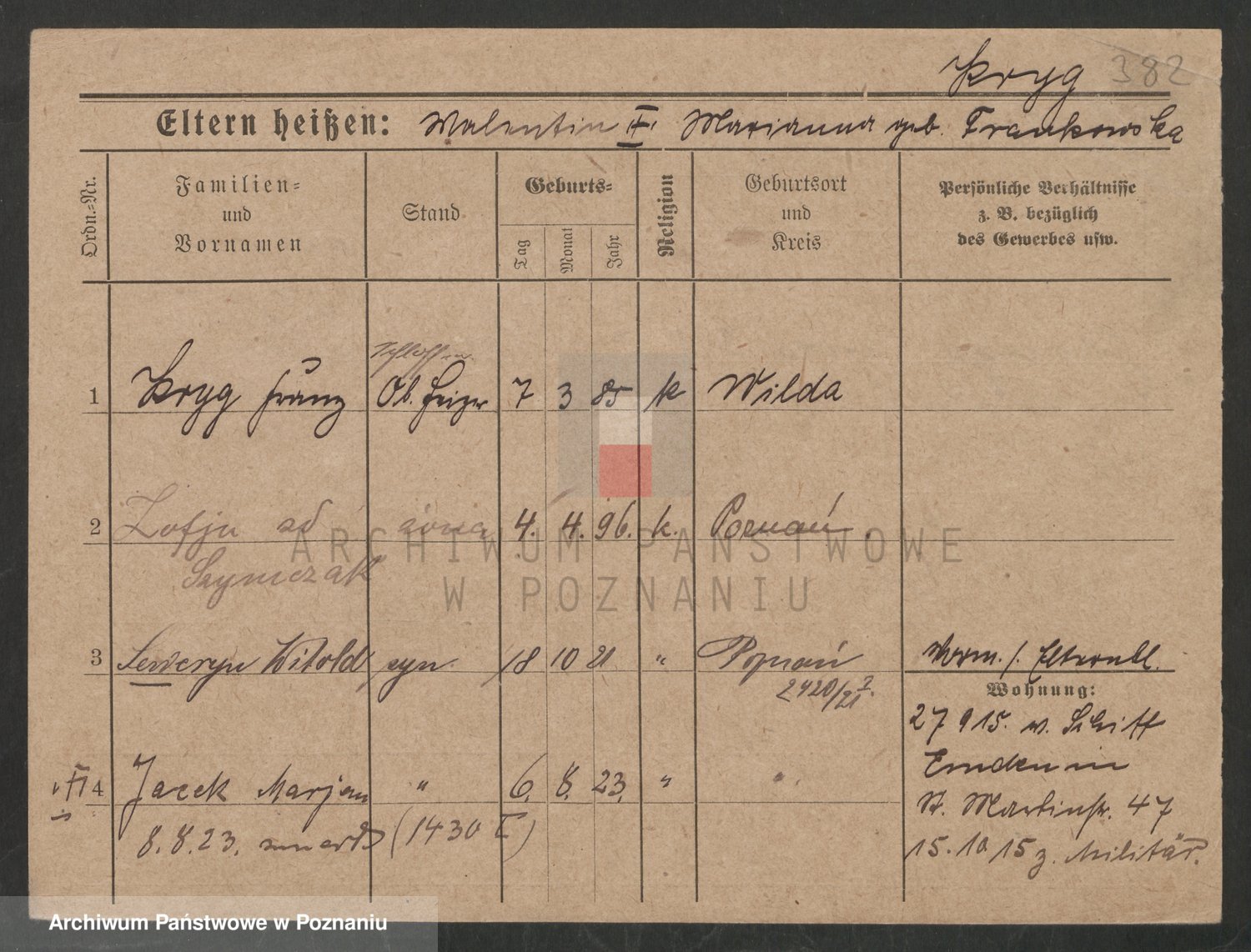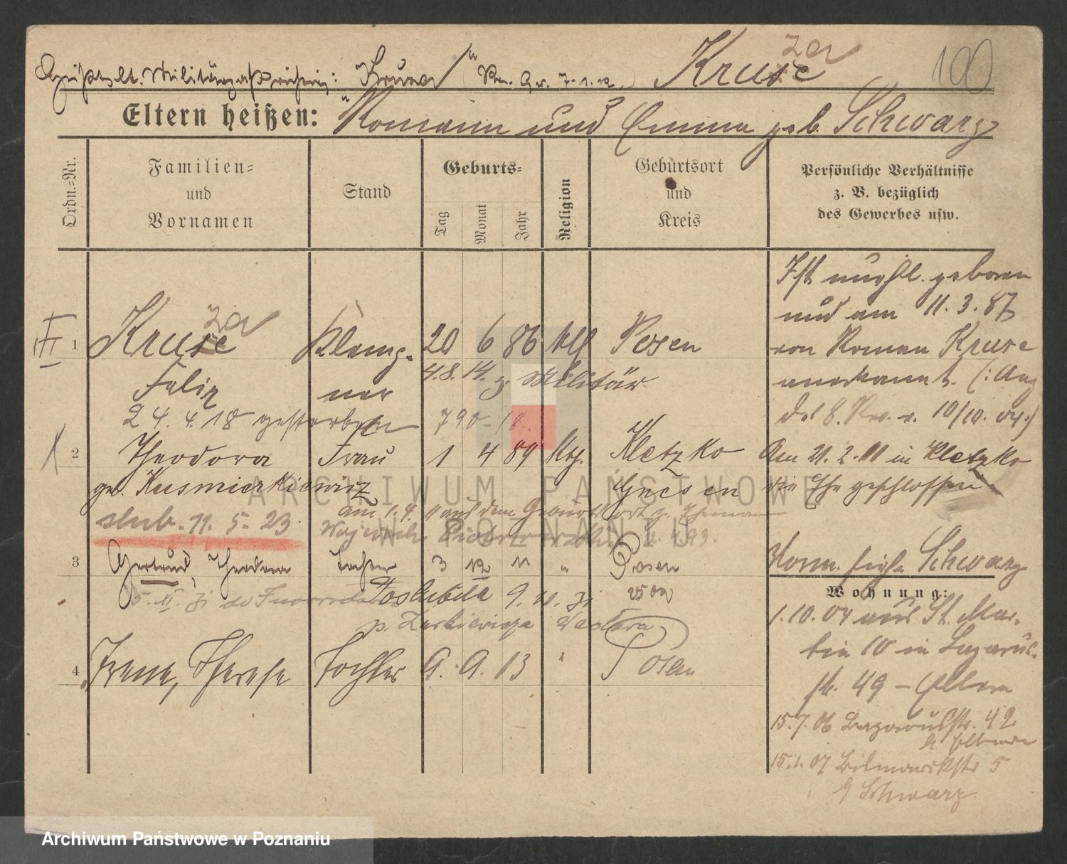 Podgląd karty osobowej dostępny jest po kliknięciu na nazwisko lub ikonkę karty. Można dokonywać powiększenia (ikony na górze) lub przechodzić między kolejnymi skanami (strzałki po bokach).
