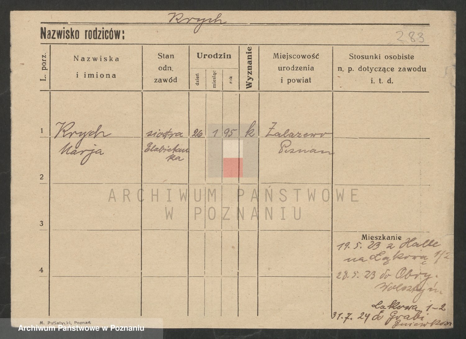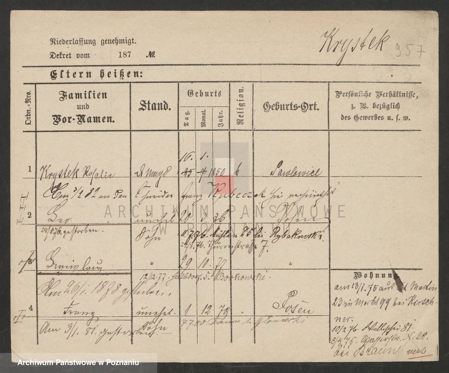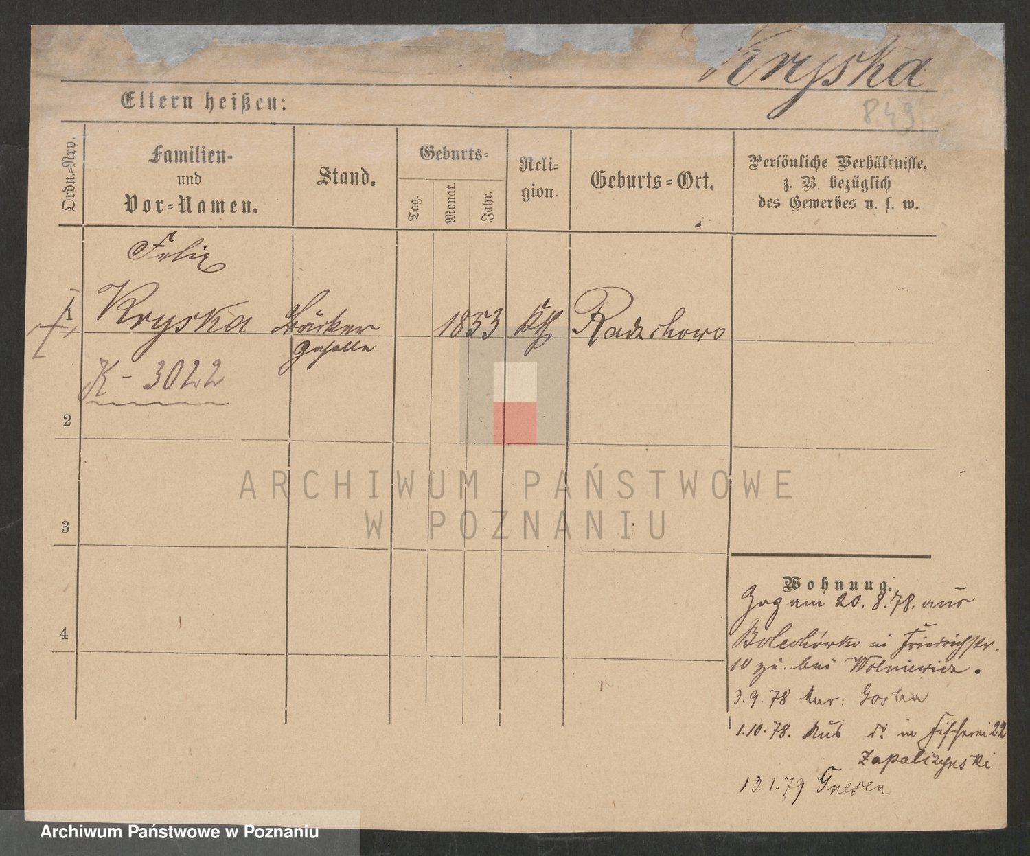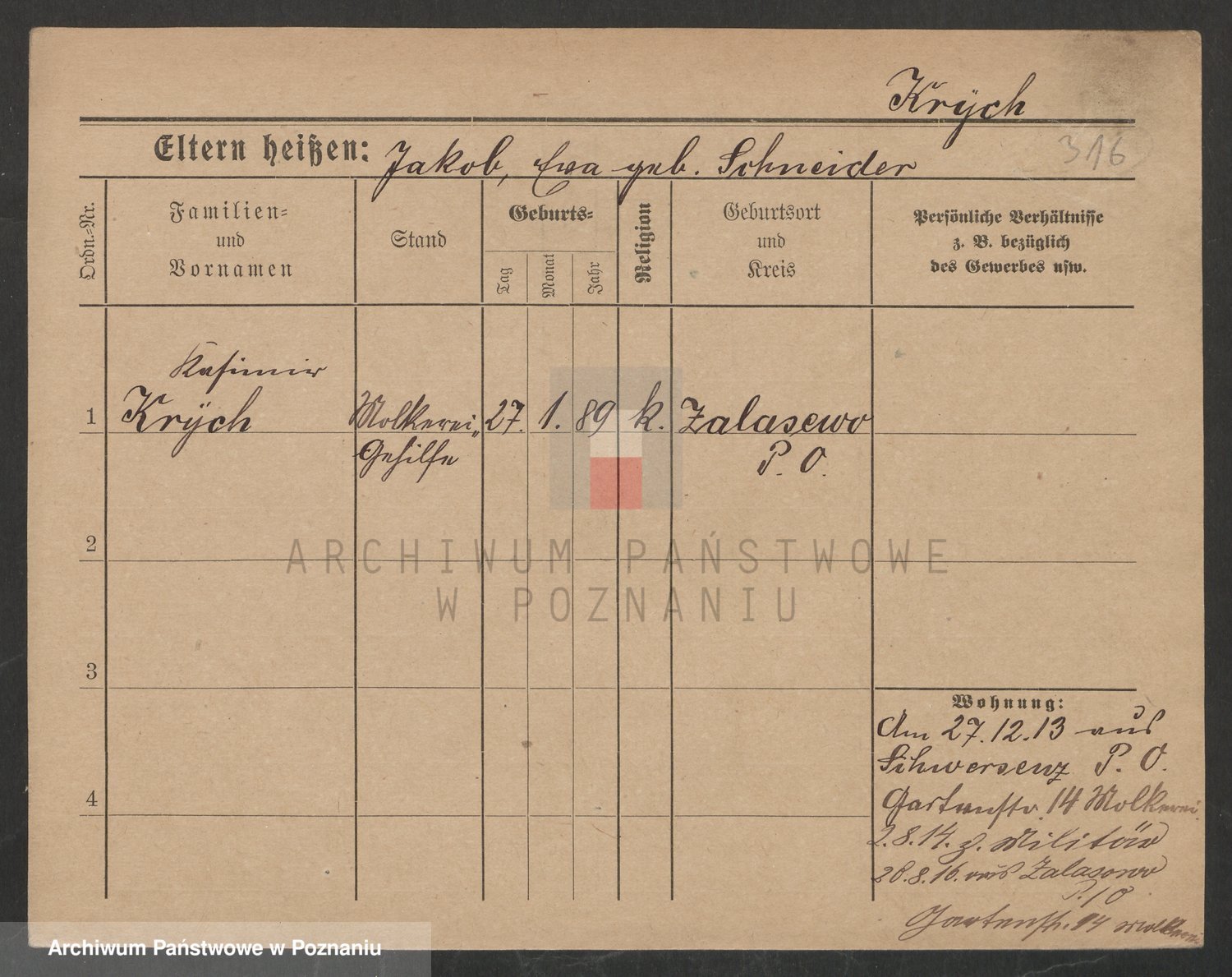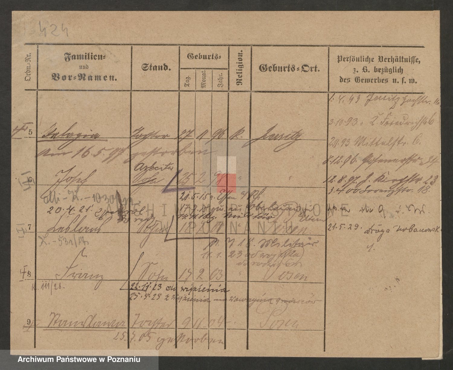 Podgląd karty osobowej dostępny jest po kliknięciu na nazwisko lub ikonkę karty. Można dokonywać powiększenia (ikony na górze) lub przechodzić między kolejnymi skanami (strzałki po bokach).