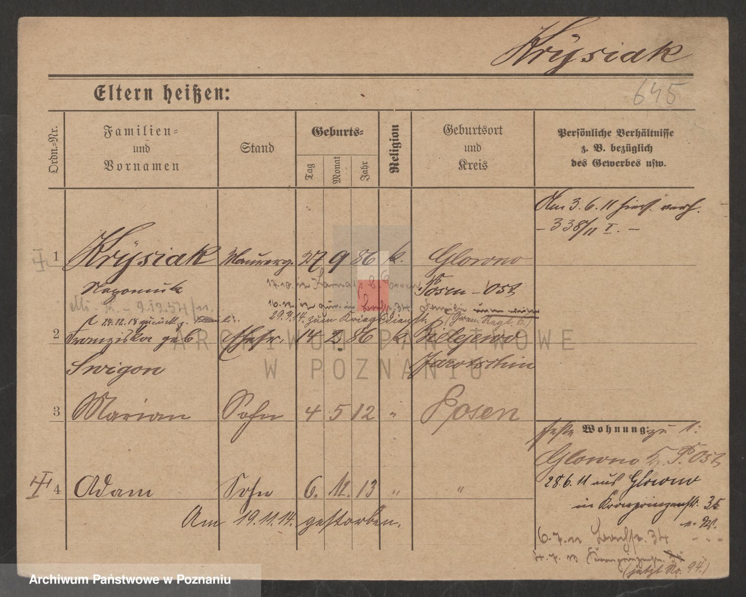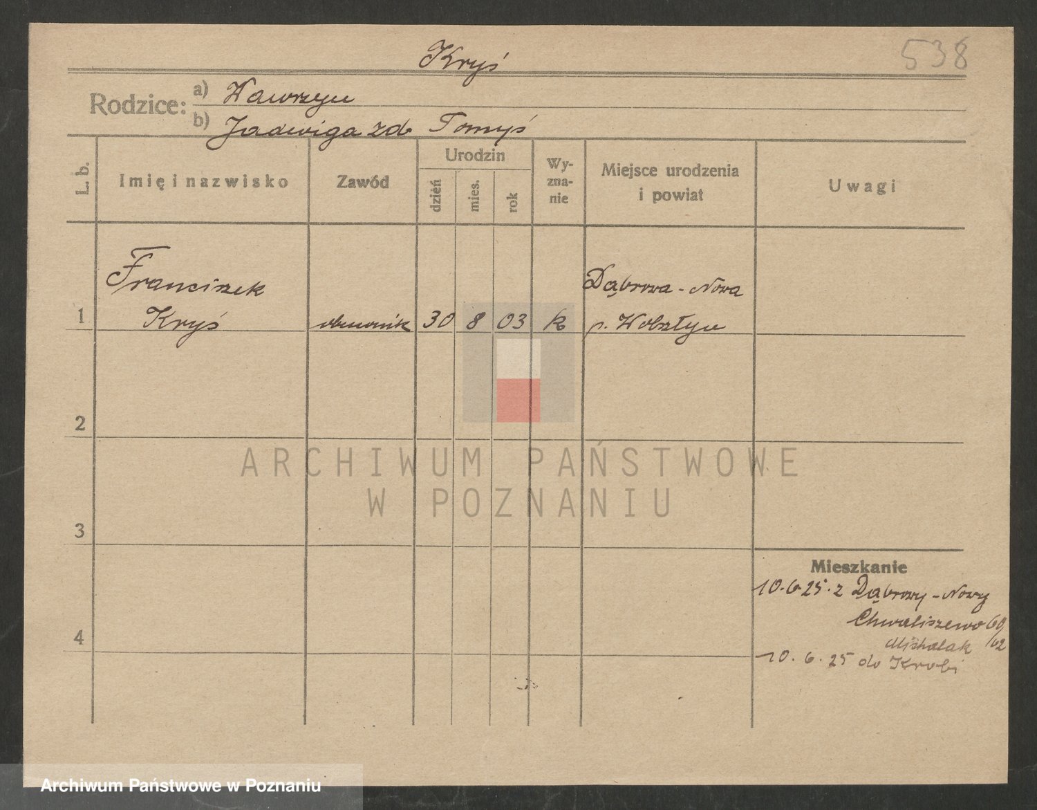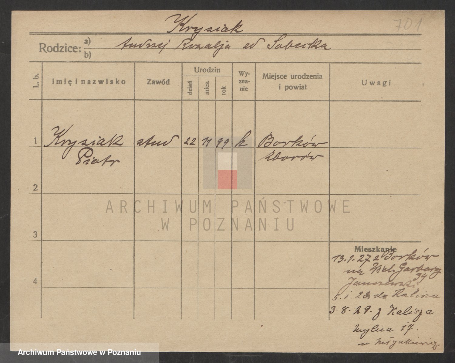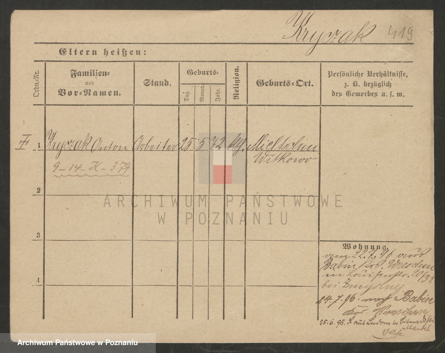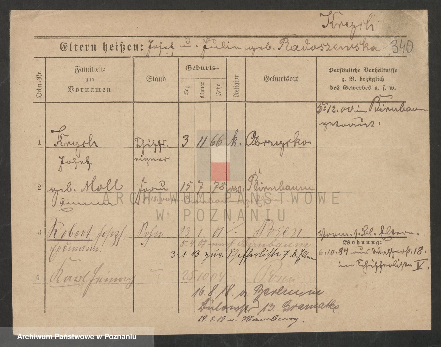 Podgląd karty osobowej dostępny jest po kliknięciu na nazwisko lub ikonkę karty. Można dokonywać powiększenia (ikony na górze) lub przechodzić między kolejnymi skanami (strzałki po bokach).