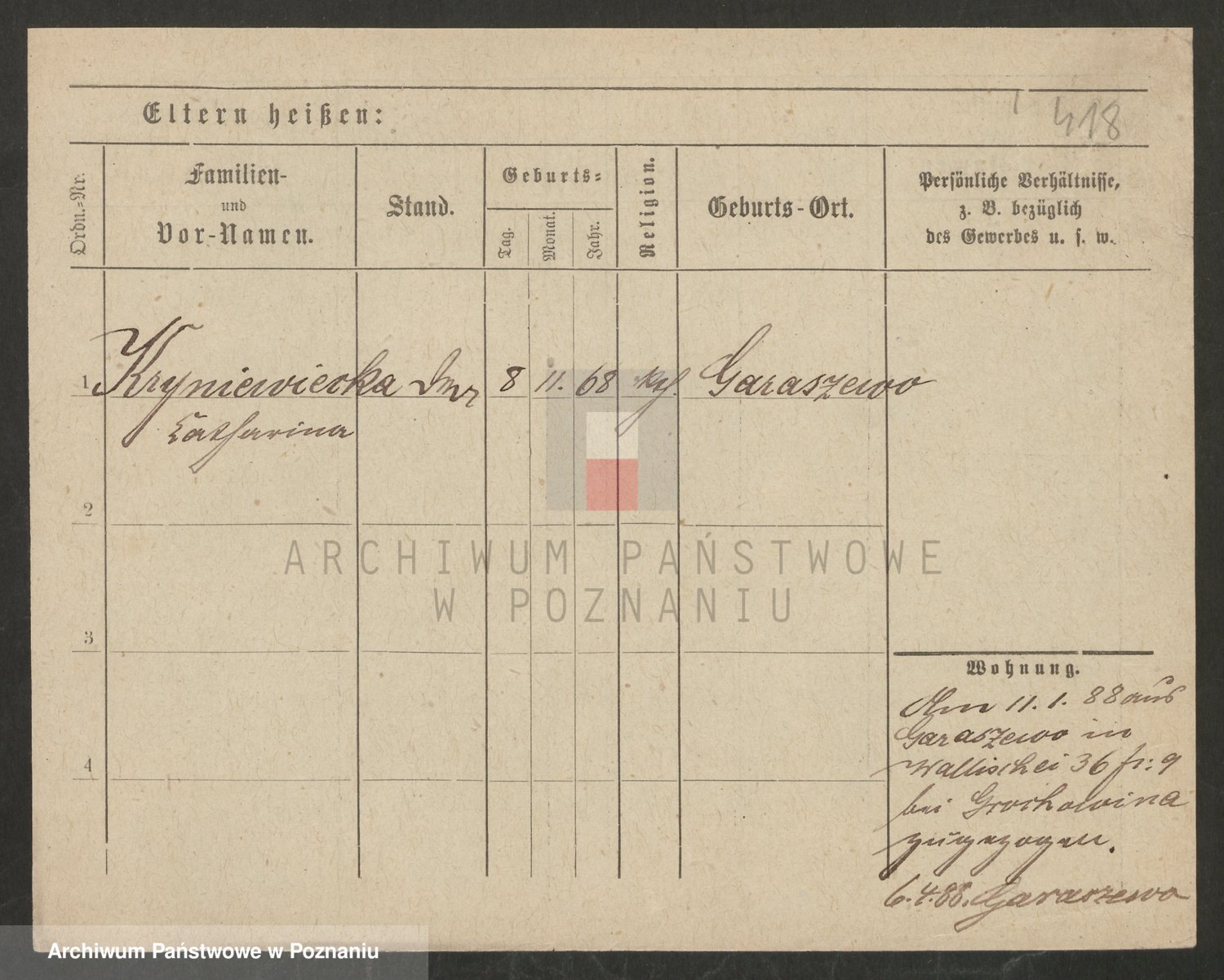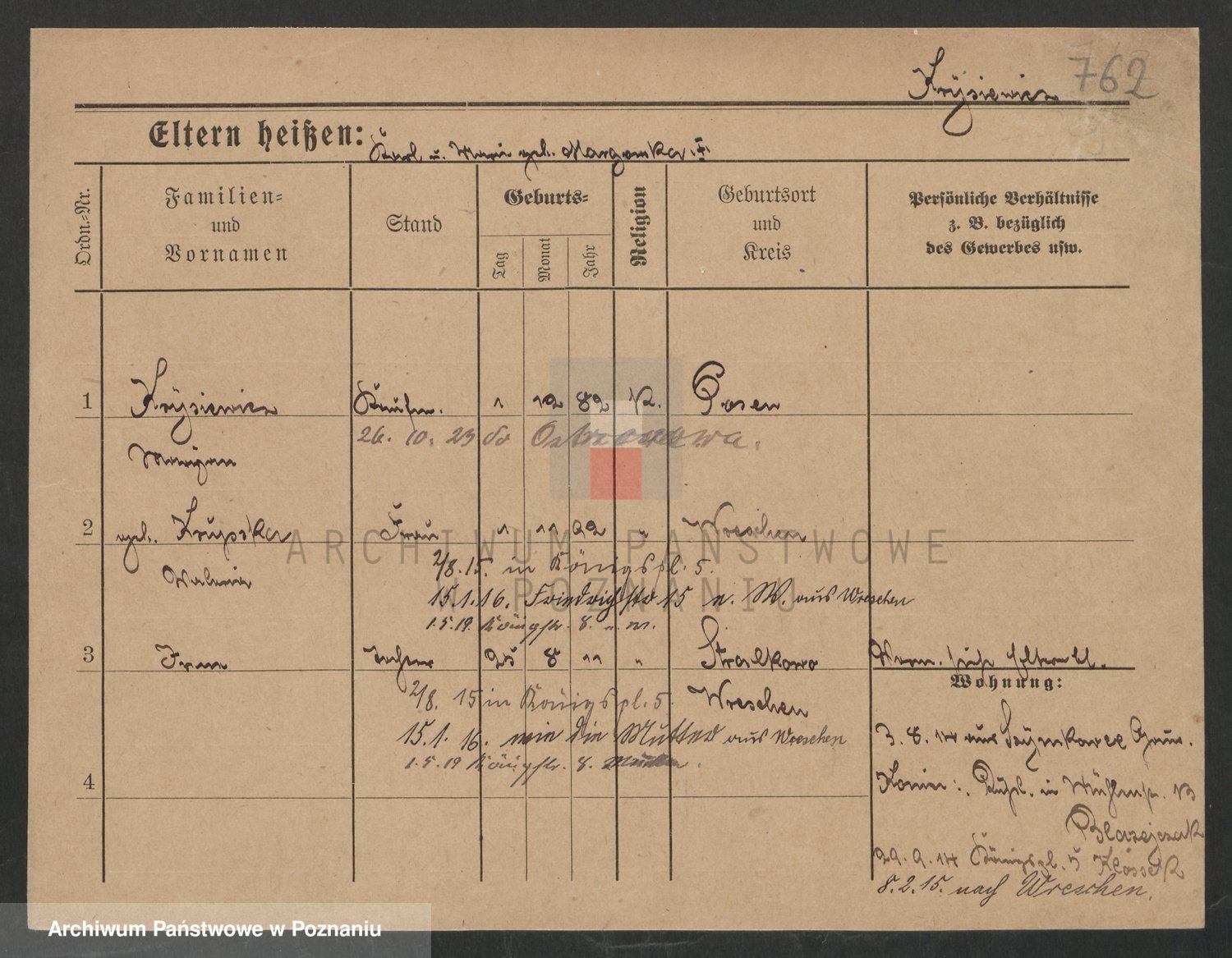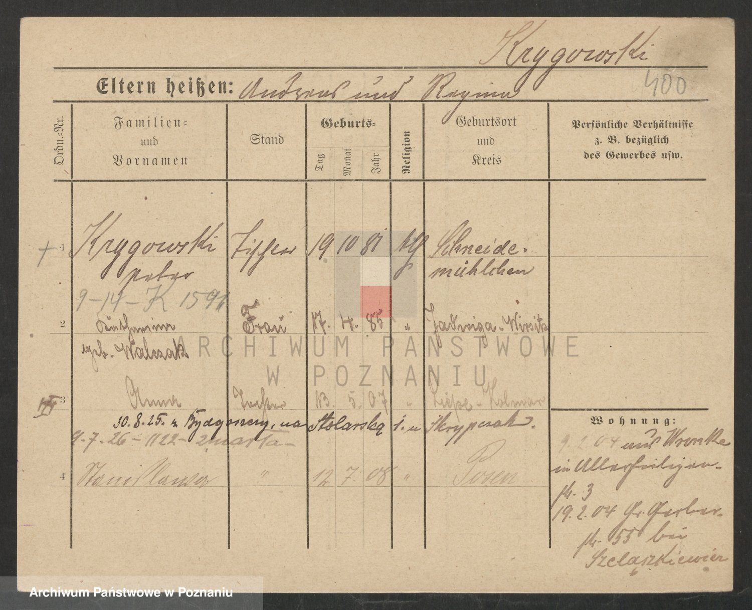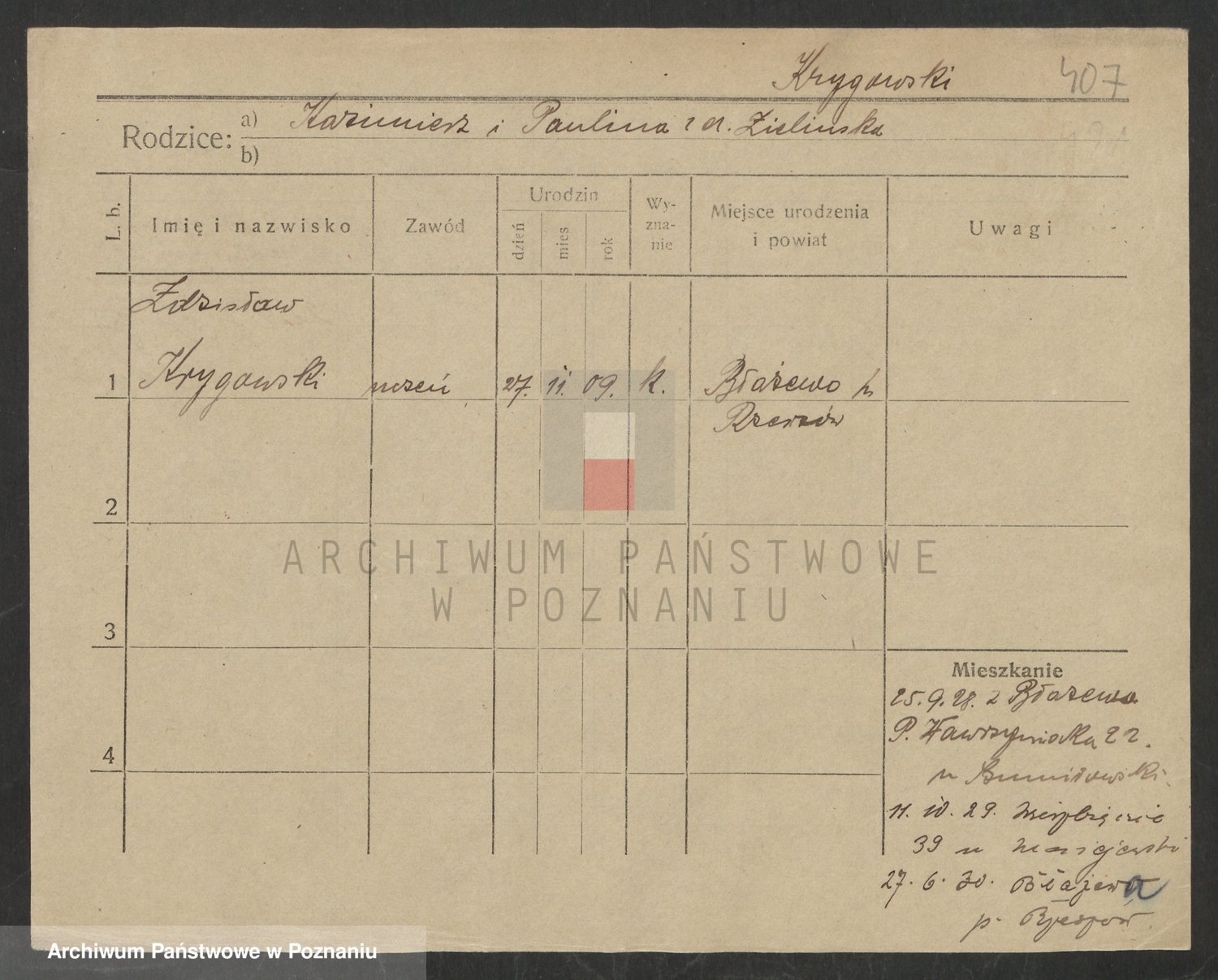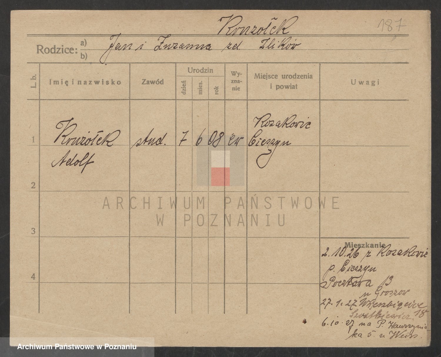 Podgląd karty osobowej dostępny jest po kliknięciu na nazwisko lub ikonkę karty. Można dokonywać powiększenia (ikony na górze) lub przechodzić między kolejnymi skanami (strzałki po bokach).