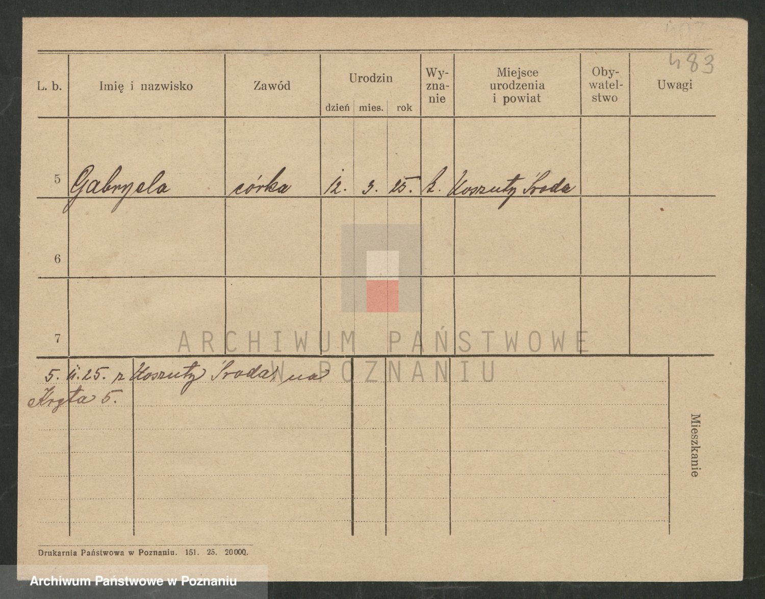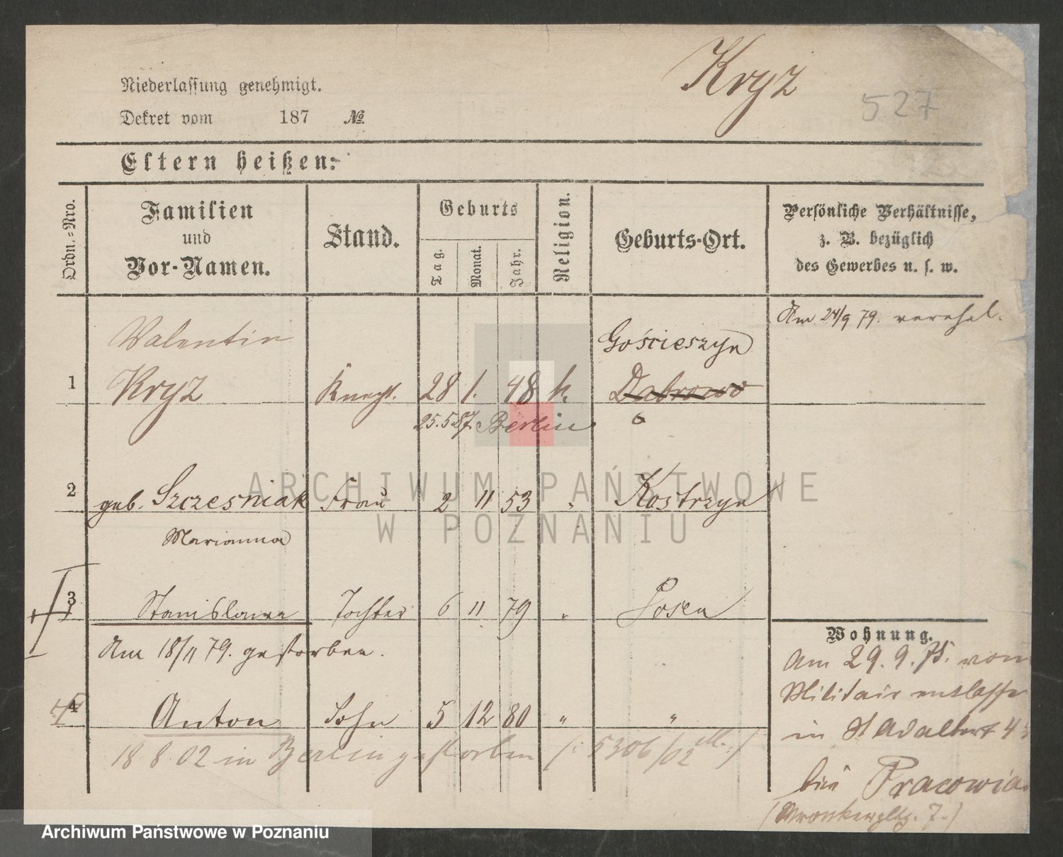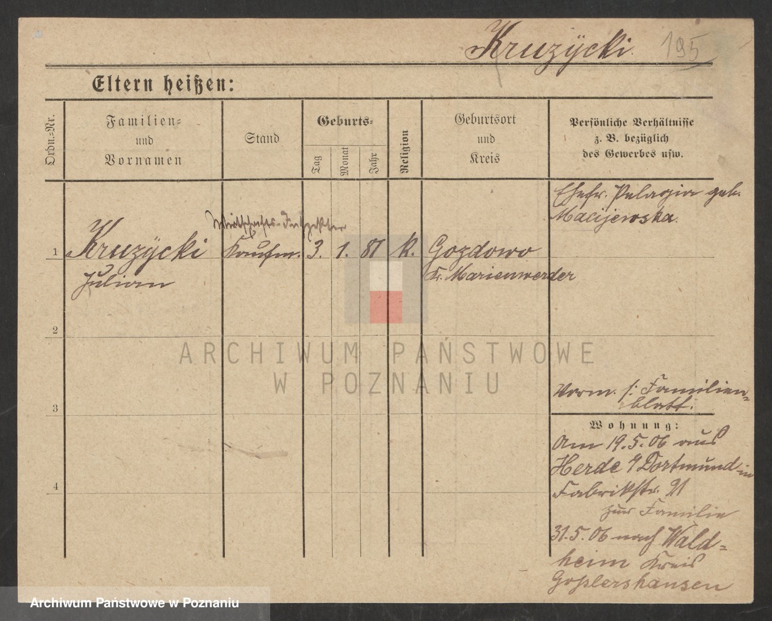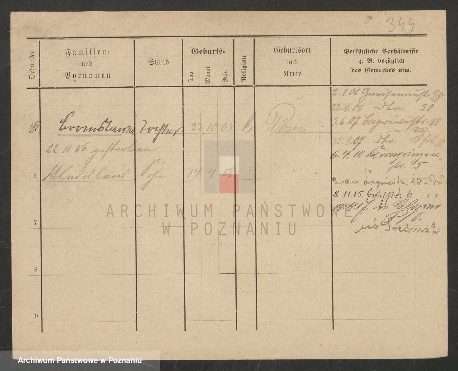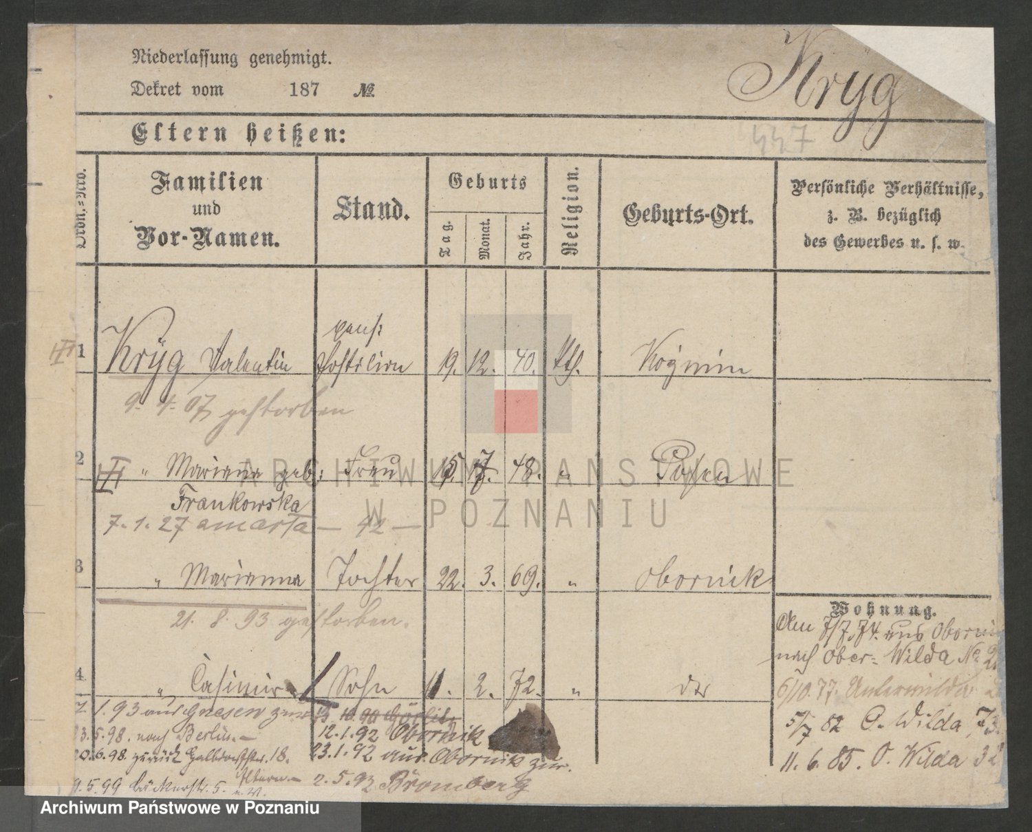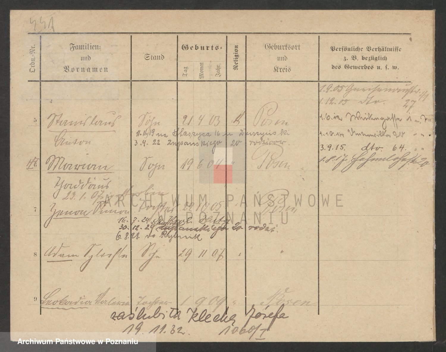 Podgląd karty osobowej dostępny jest po kliknięciu na nazwisko lub ikonkę karty. Można dokonywać powiększenia (ikony na górze) lub przechodzić między kolejnymi skanami (strzałki po bokach).
