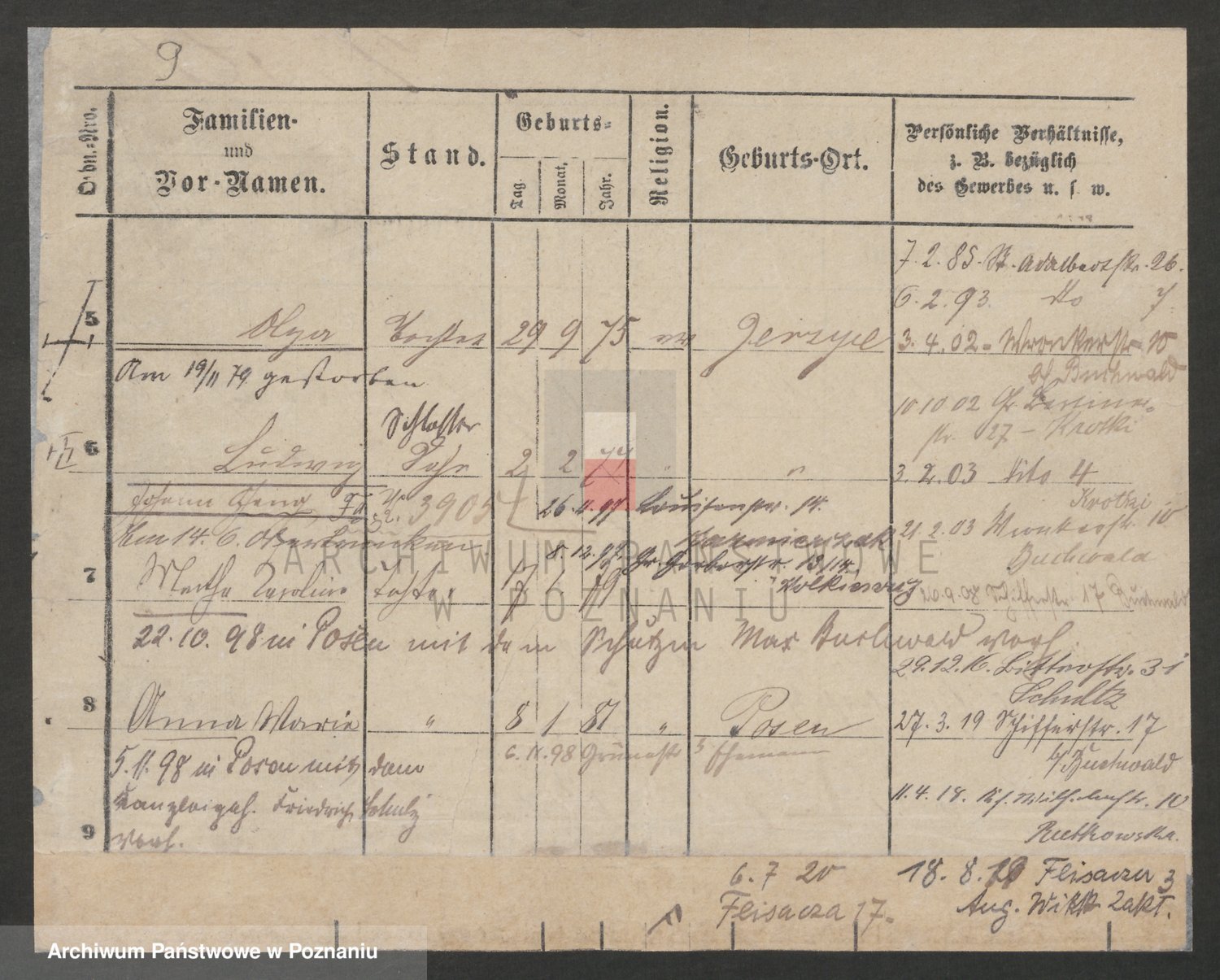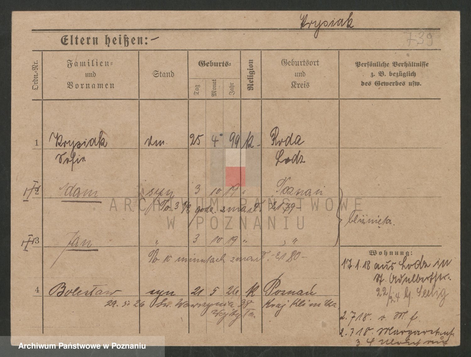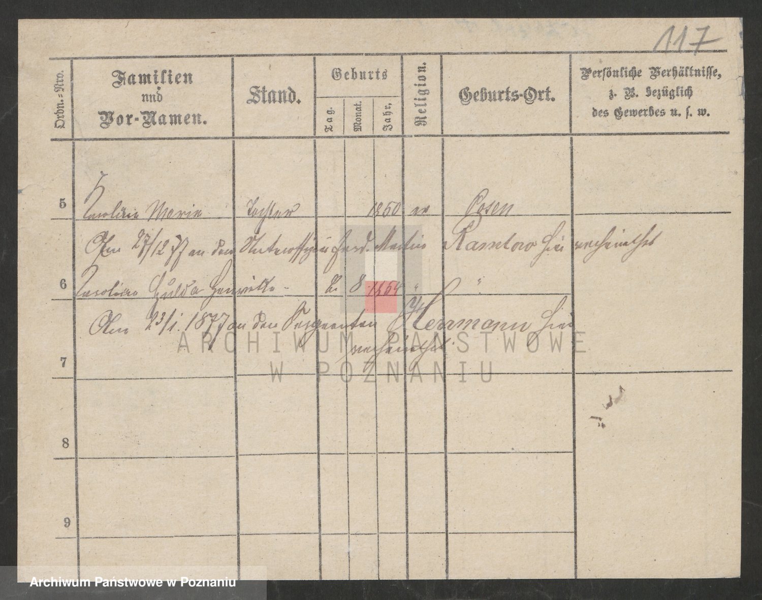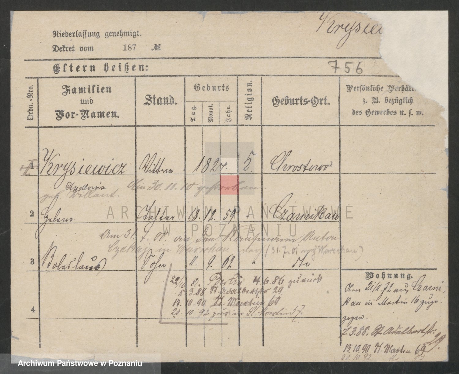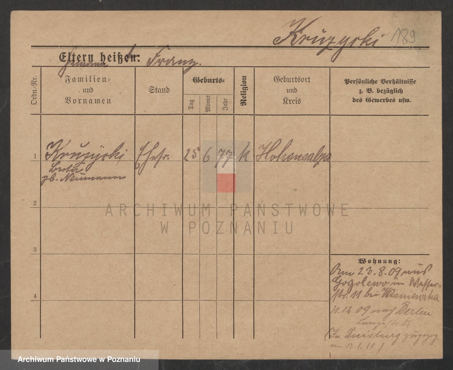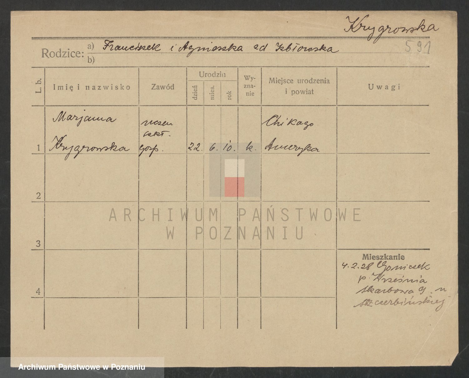 Podgląd karty osobowej dostępny jest po kliknięciu na nazwisko lub ikonkę karty. Można dokonywać powiększenia (ikony na górze) lub przechodzić między kolejnymi skanami (strzałki po bokach).