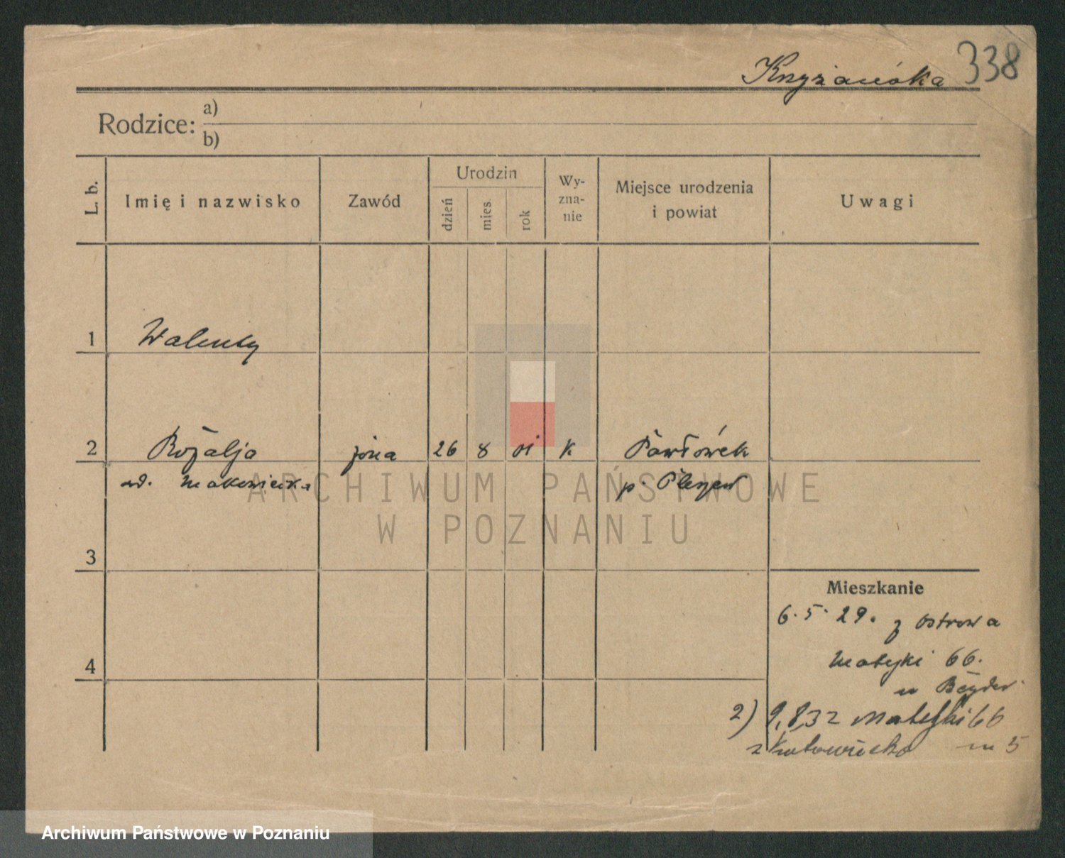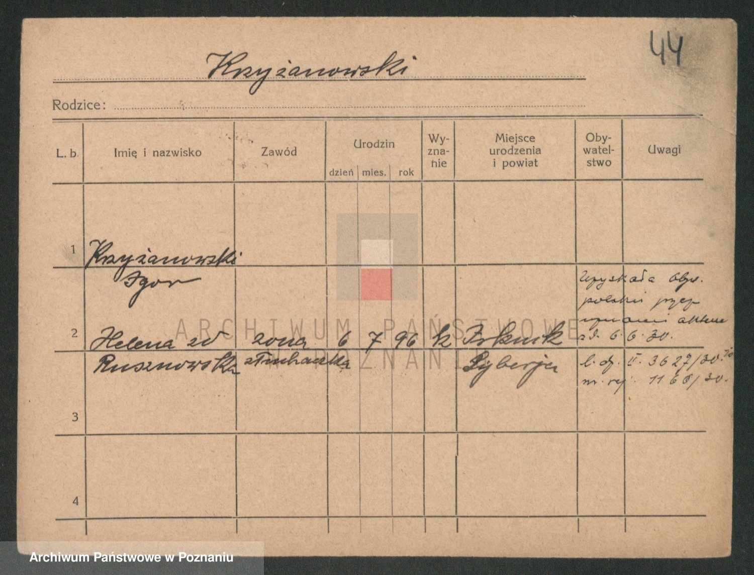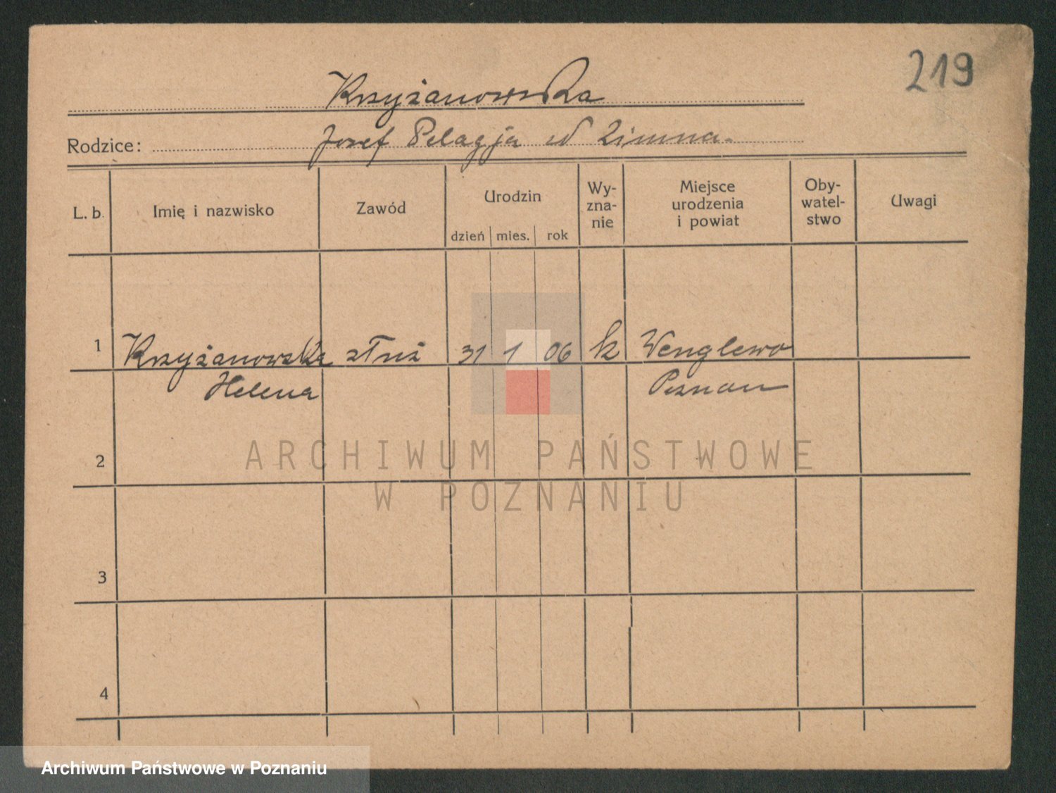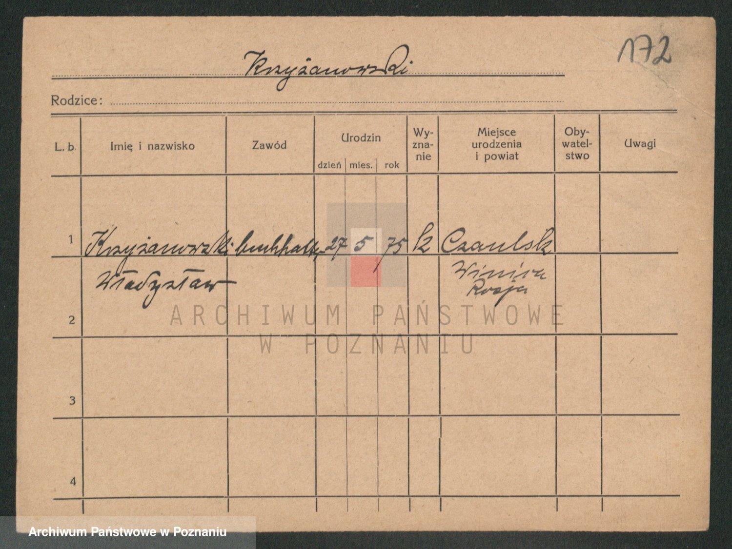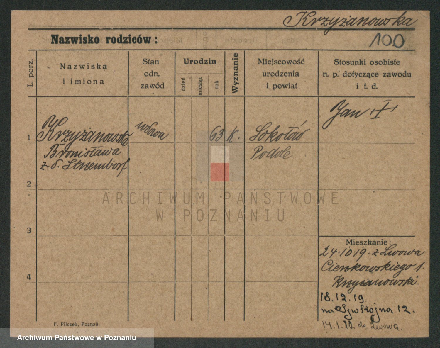 Podgląd karty osobowej dostępny jest po kliknięciu na nazwisko lub ikonkę karty. Można dokonywać powiększenia (ikony na górze) lub przechodzić między kolejnymi skanami (strzałki po bokach).