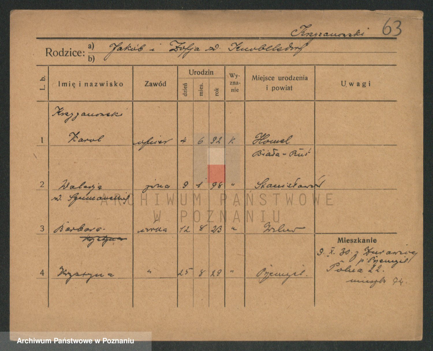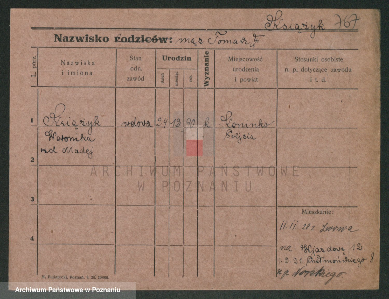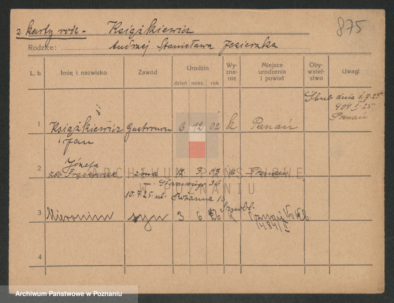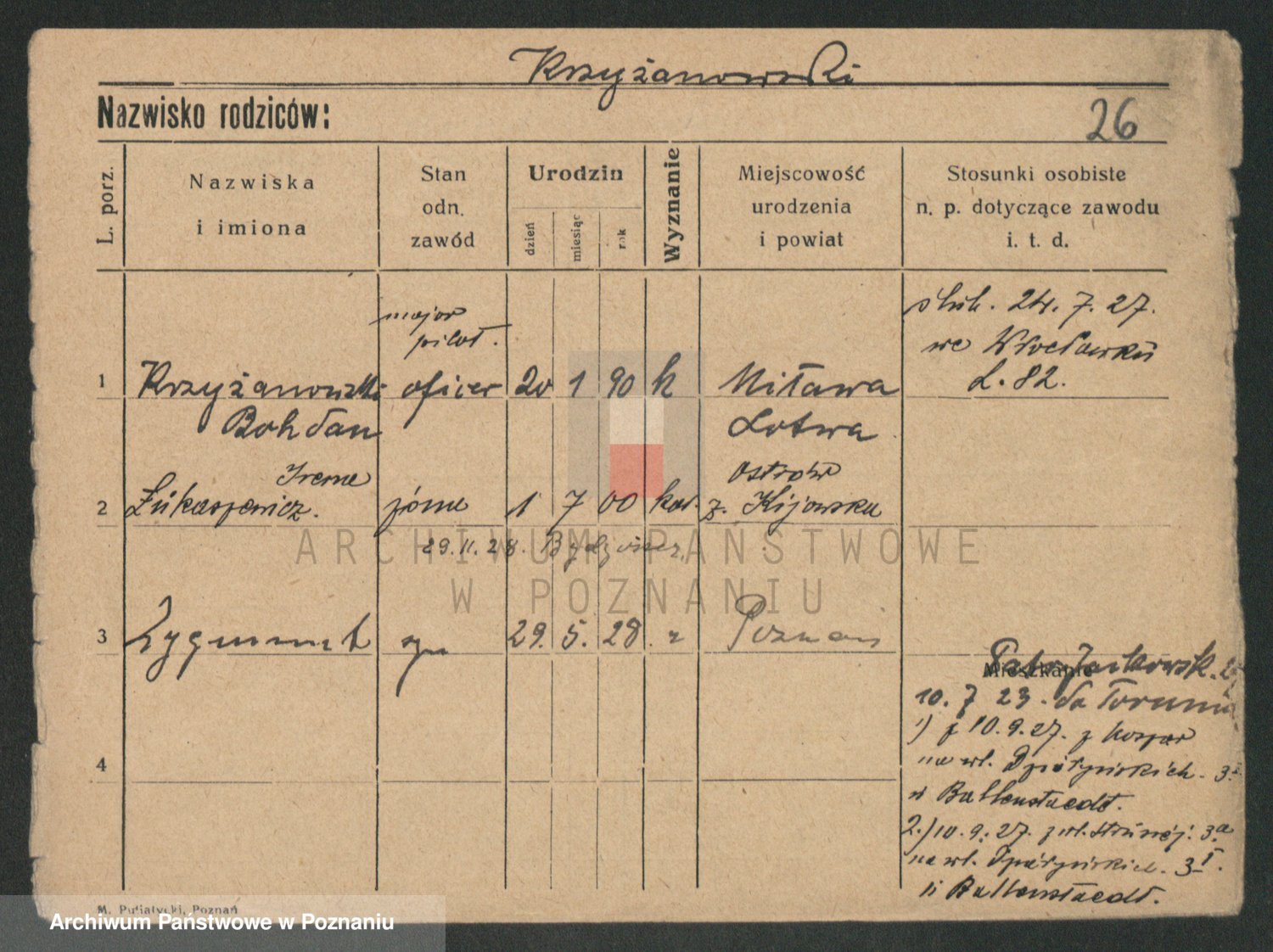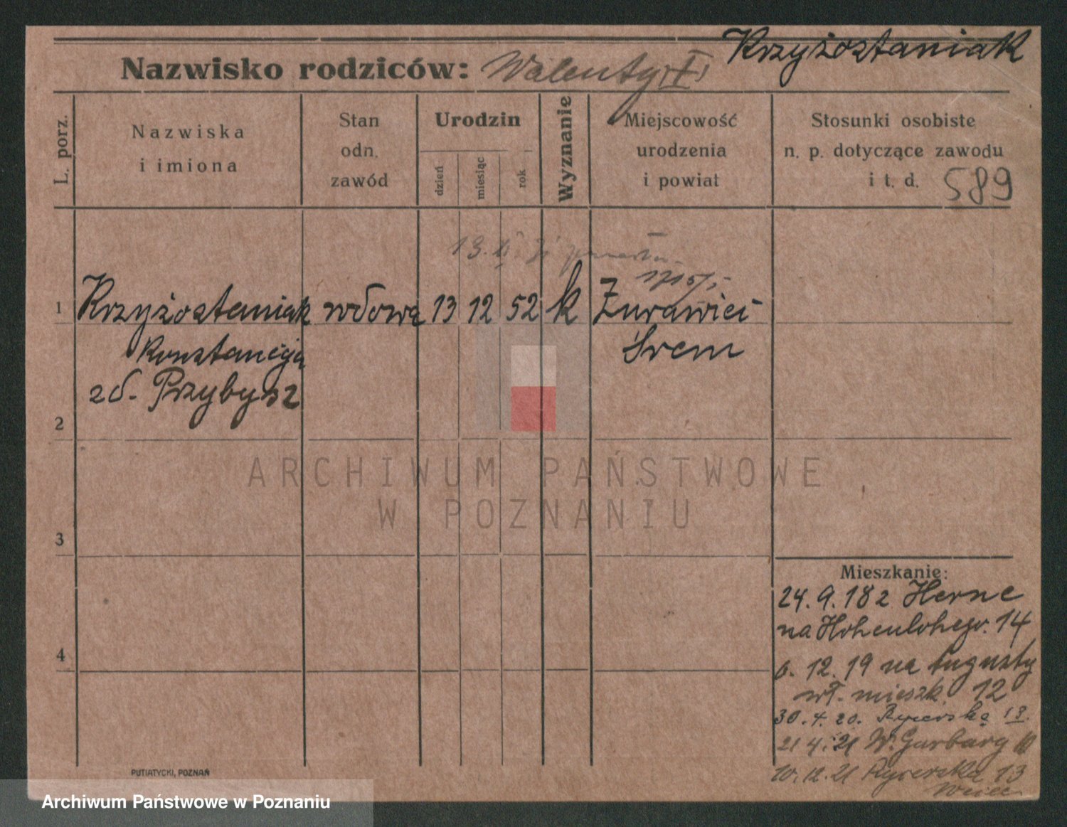 Podgląd karty osobowej dostępny jest po kliknięciu na nazwisko lub ikonkę karty. Można dokonywać powiększenia (ikony na górze) lub przechodzić między kolejnymi skanami (strzałki po bokach).