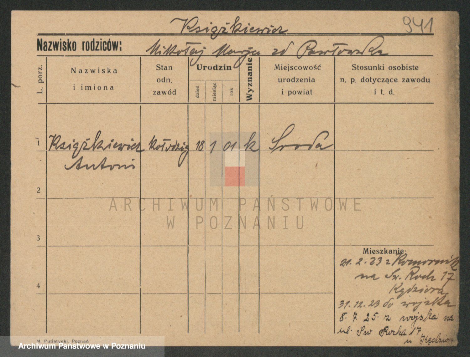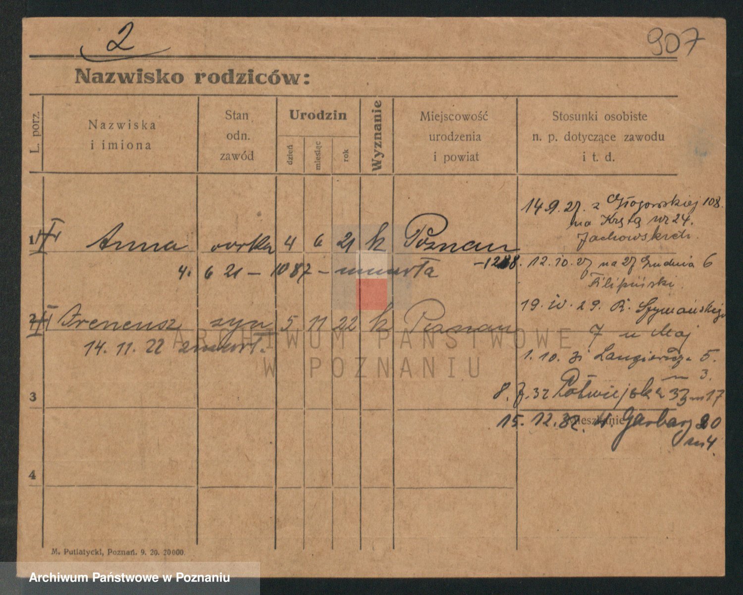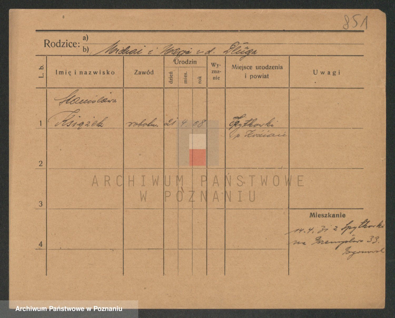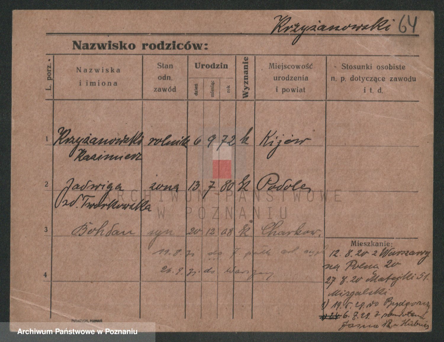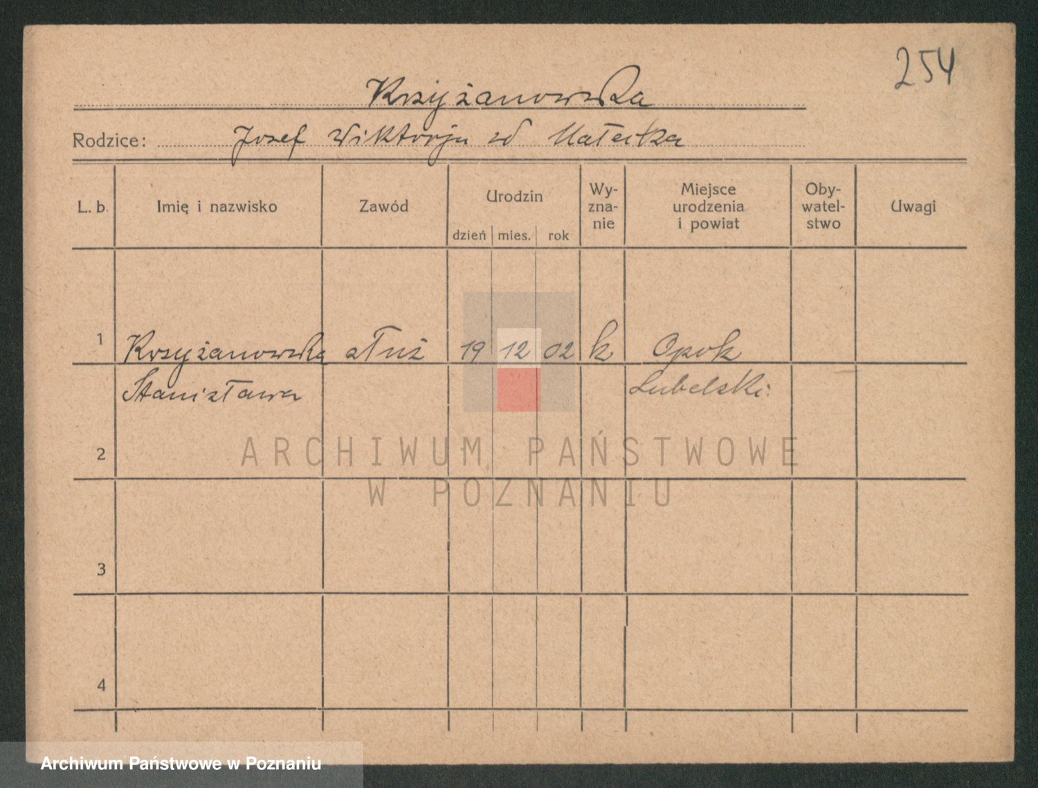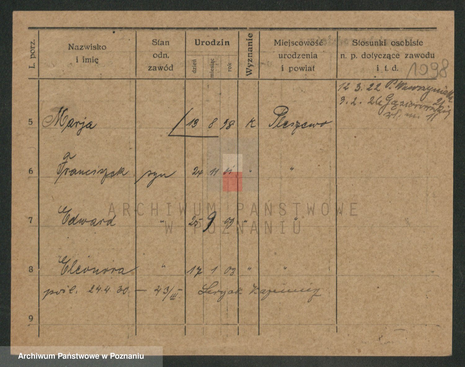 Podgląd karty osobowej dostępny jest po kliknięciu na nazwisko lub ikonkę karty. Można dokonywać powiększenia (ikony na górze) lub przechodzić między kolejnymi skanami (strzałki po bokach).