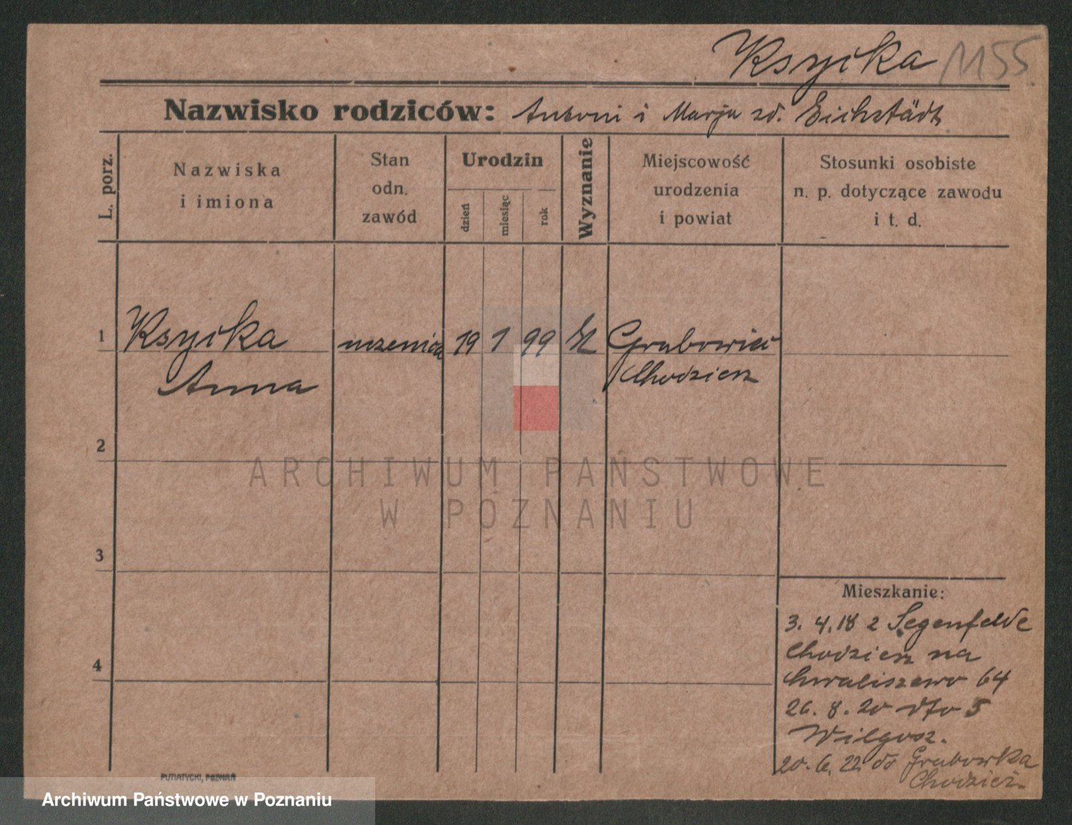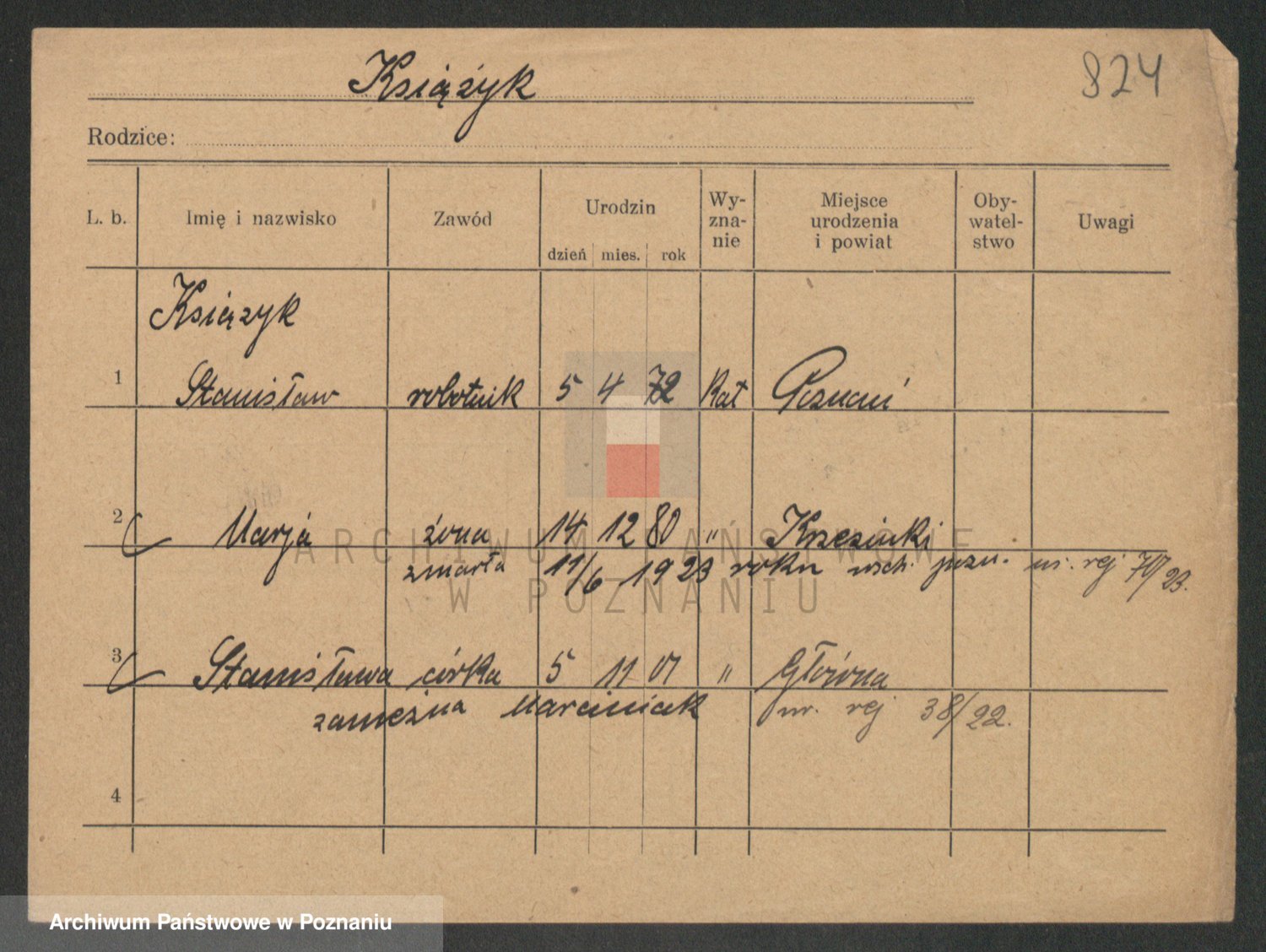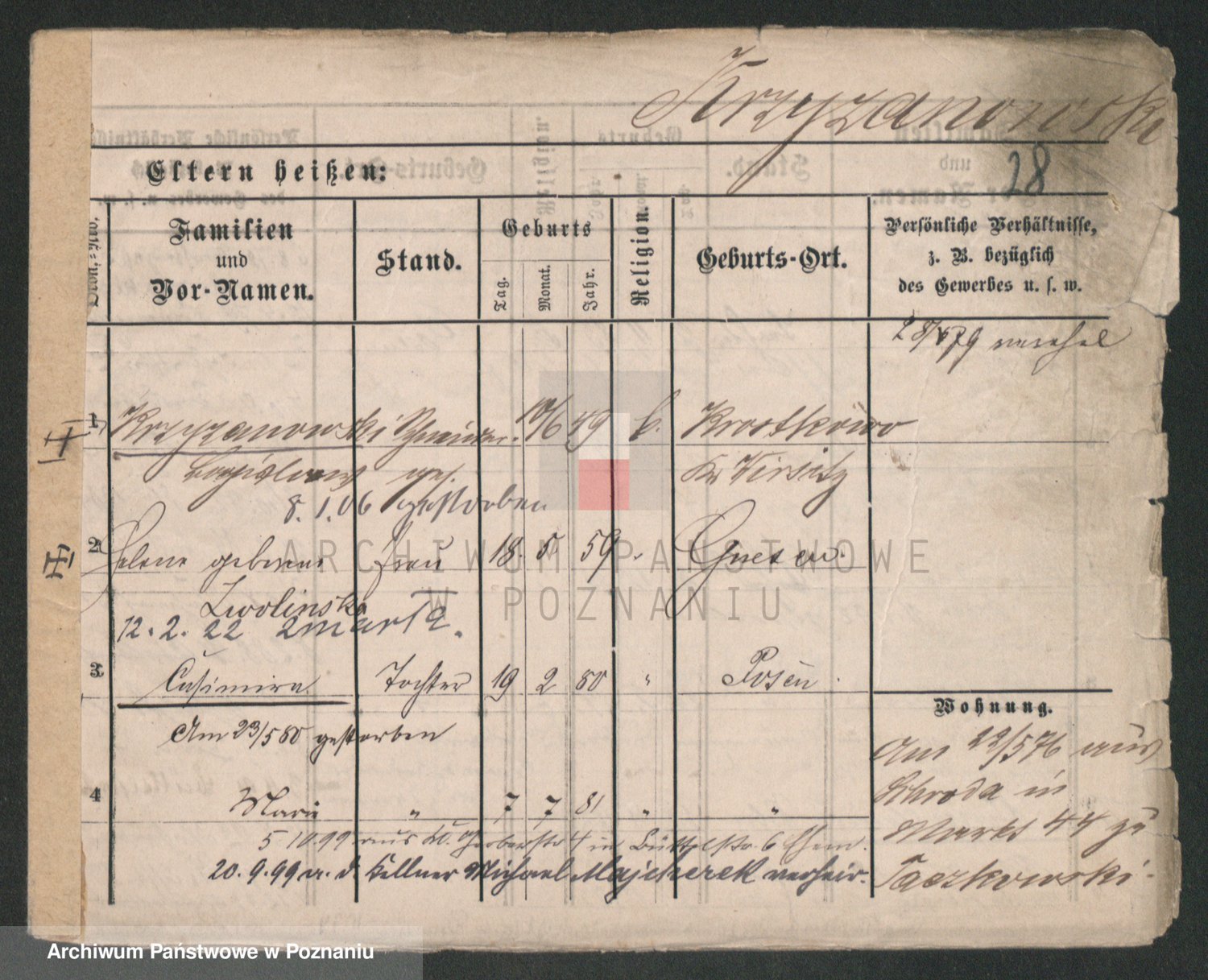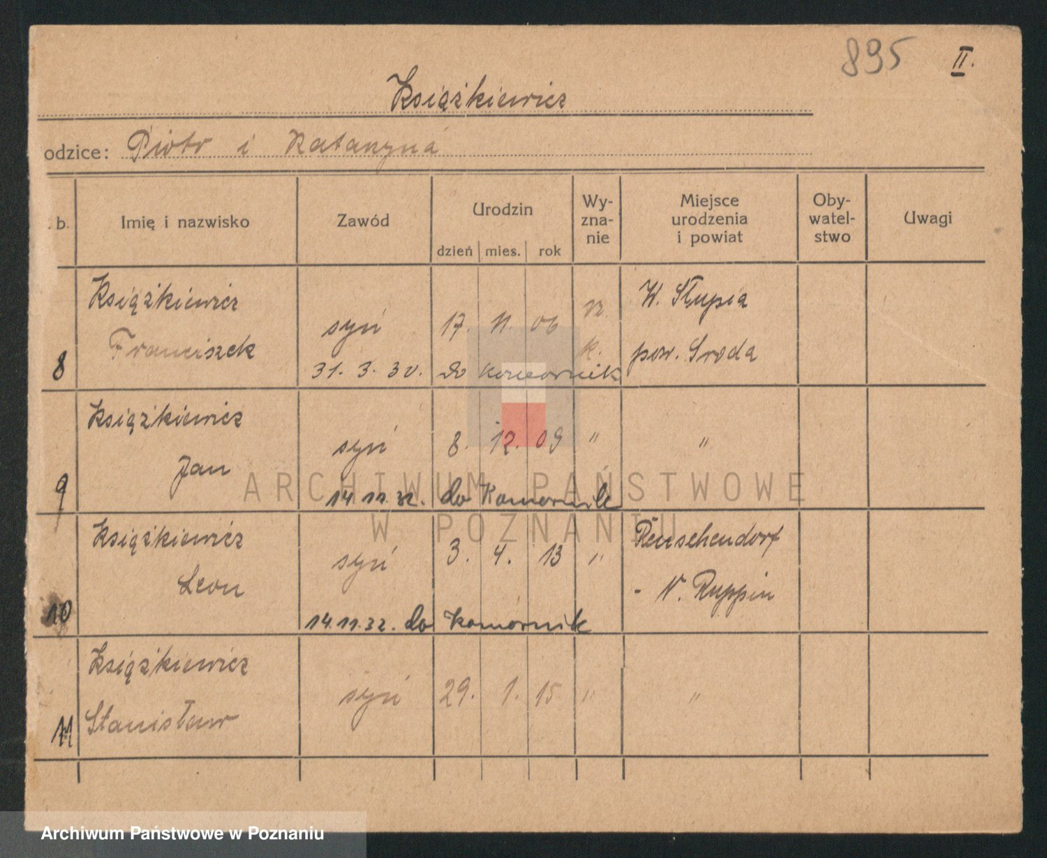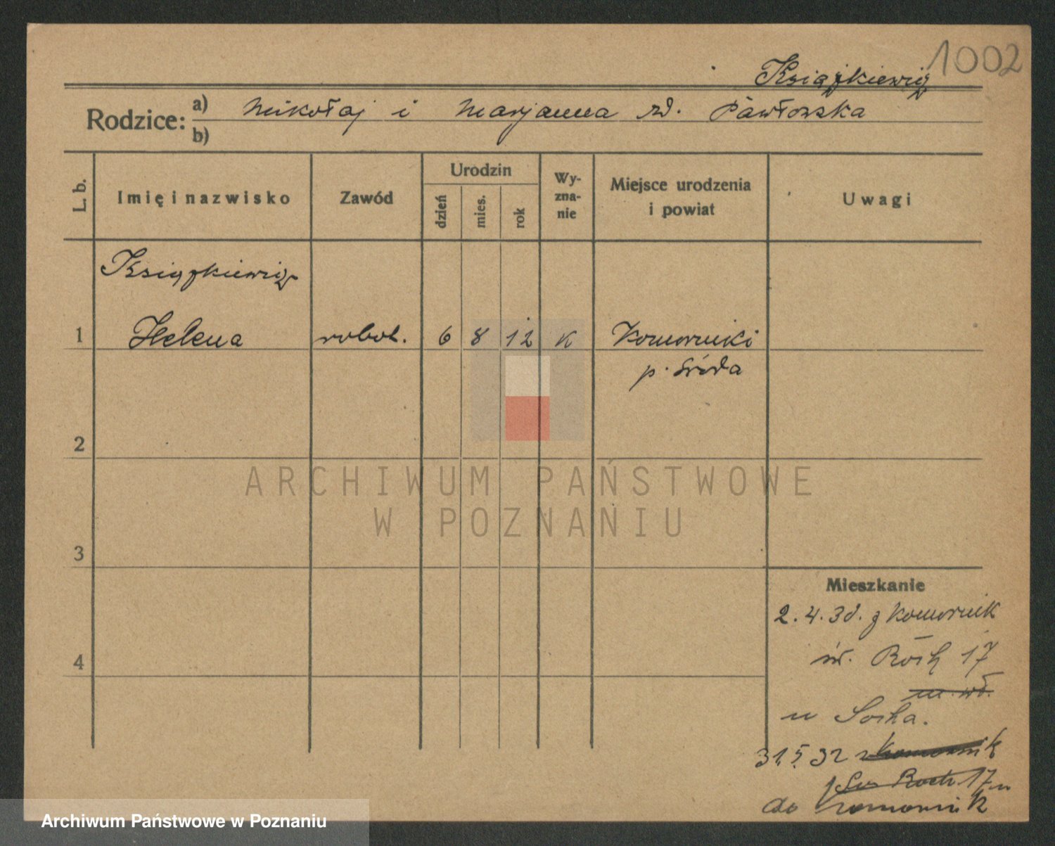 Podgląd karty osobowej dostępny jest po kliknięciu na nazwisko lub ikonkę karty. Można dokonywać powiększenia (ikony na górze) lub przechodzić między kolejnymi skanami (strzałki po bokach).