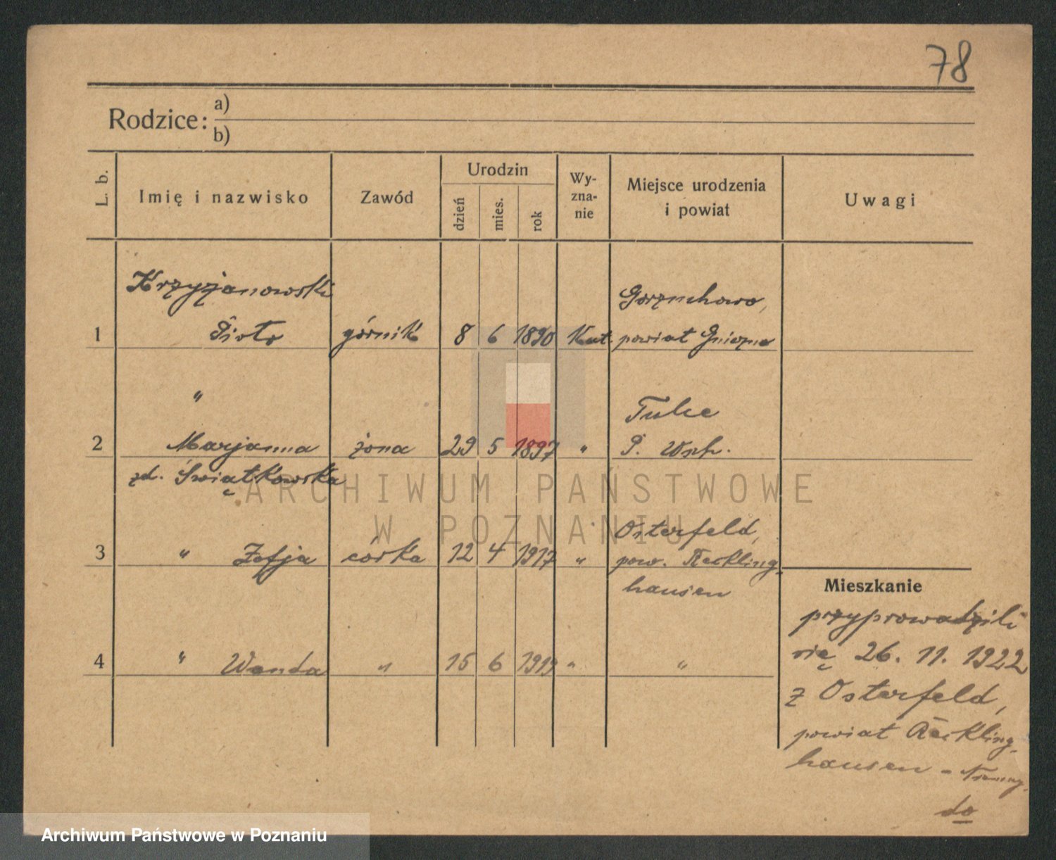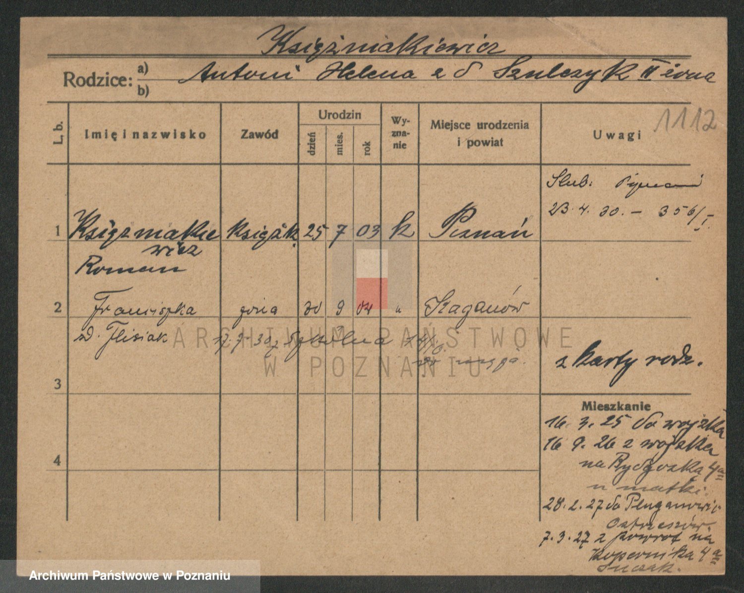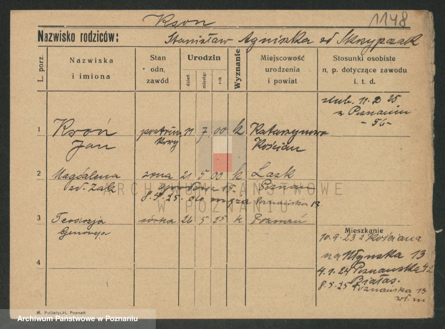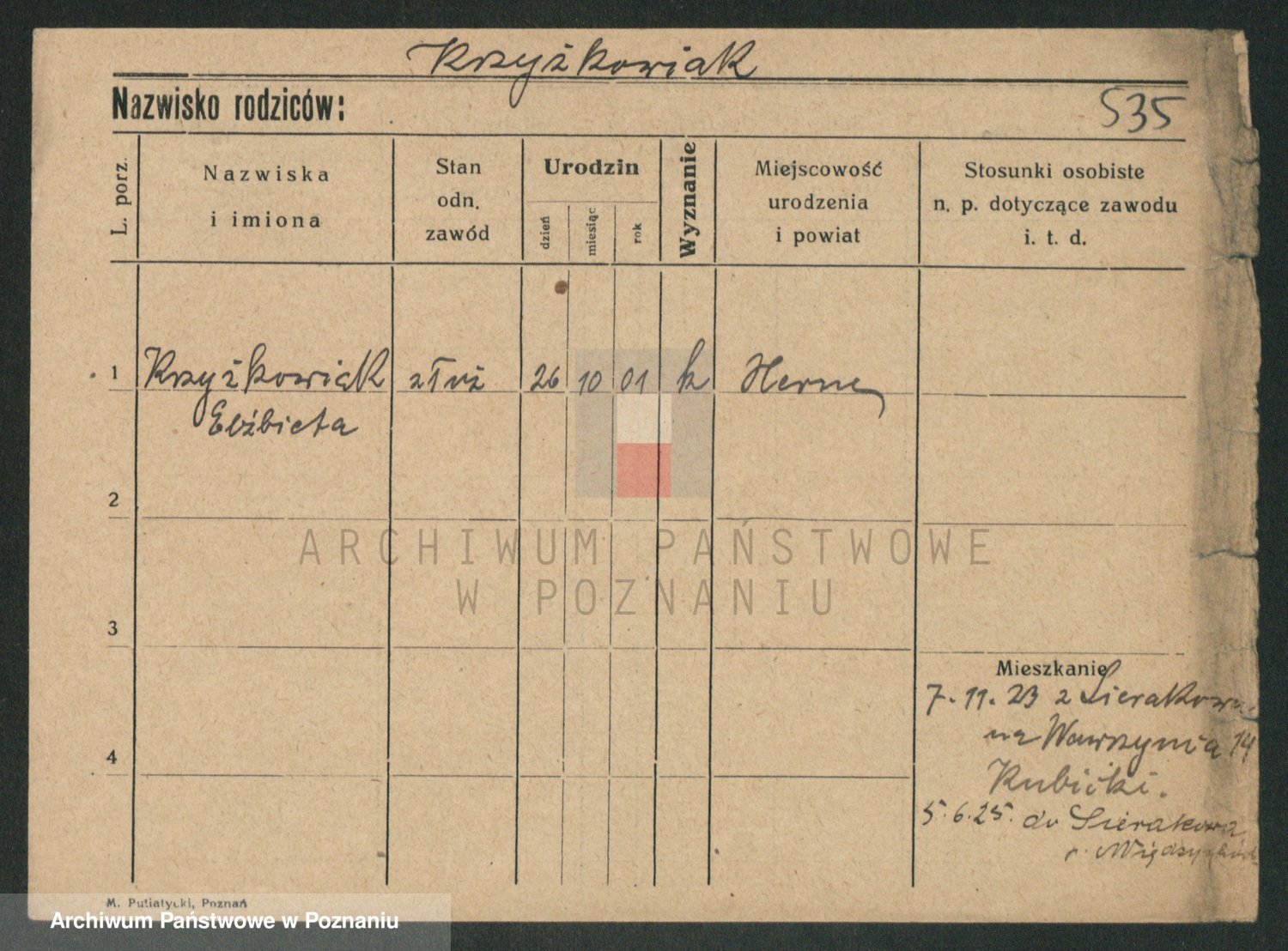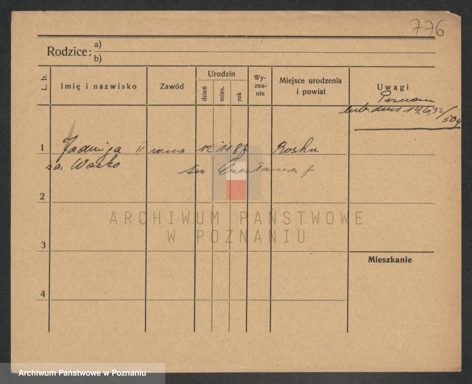 Podgląd karty osobowej dostępny jest po kliknięciu na nazwisko lub ikonkę karty. Można dokonywać powiększenia (ikony na górze) lub przechodzić między kolejnymi skanami (strzałki po bokach).