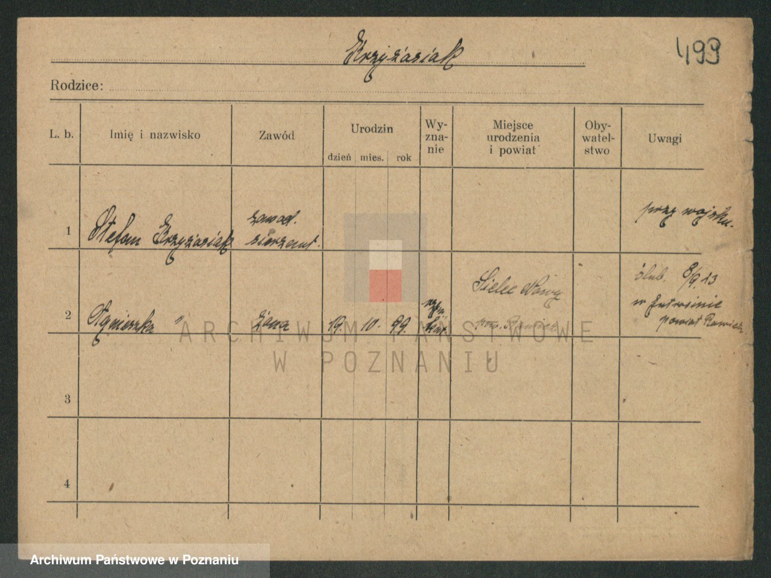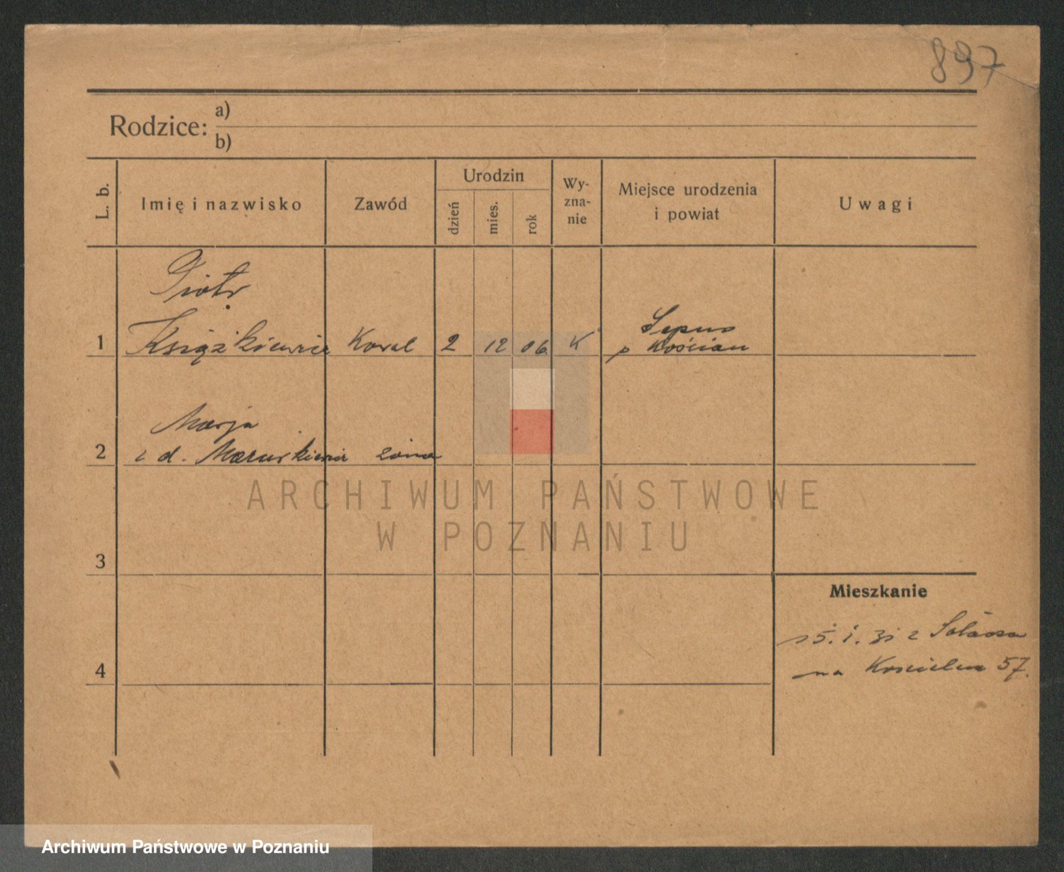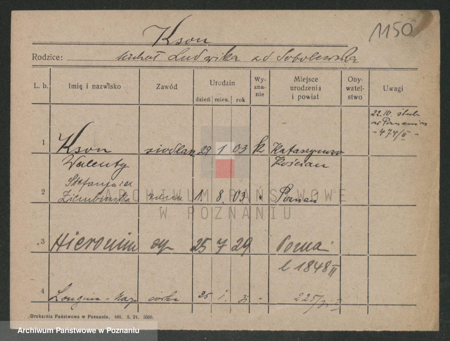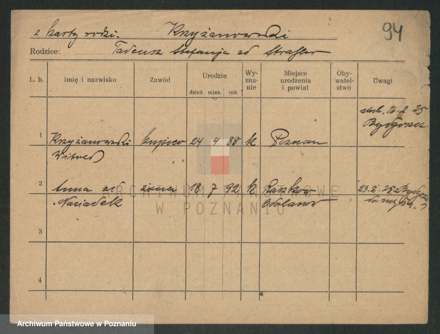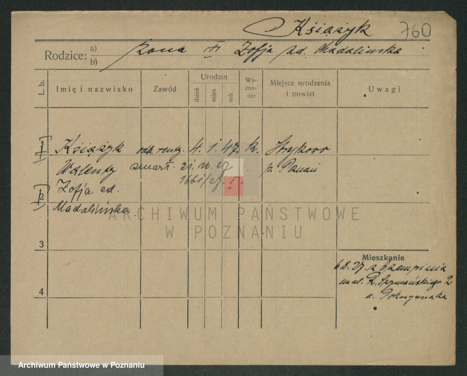 Podgląd karty osobowej dostępny jest po kliknięciu na nazwisko lub ikonkę karty. Można dokonywać powiększenia (ikony na górze) lub przechodzić między kolejnymi skanami (strzałki po bokach).