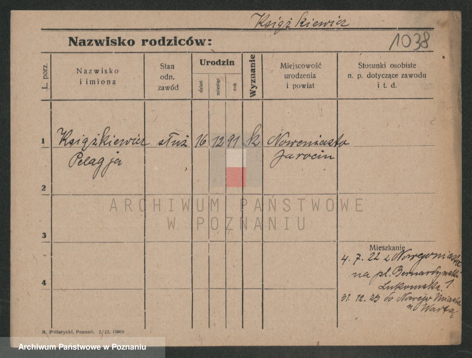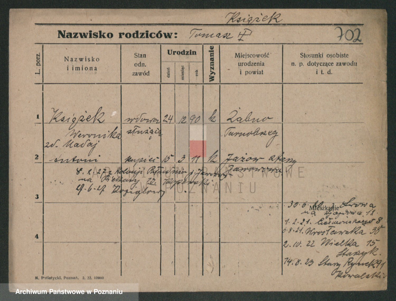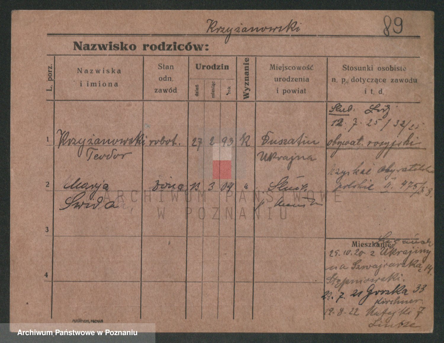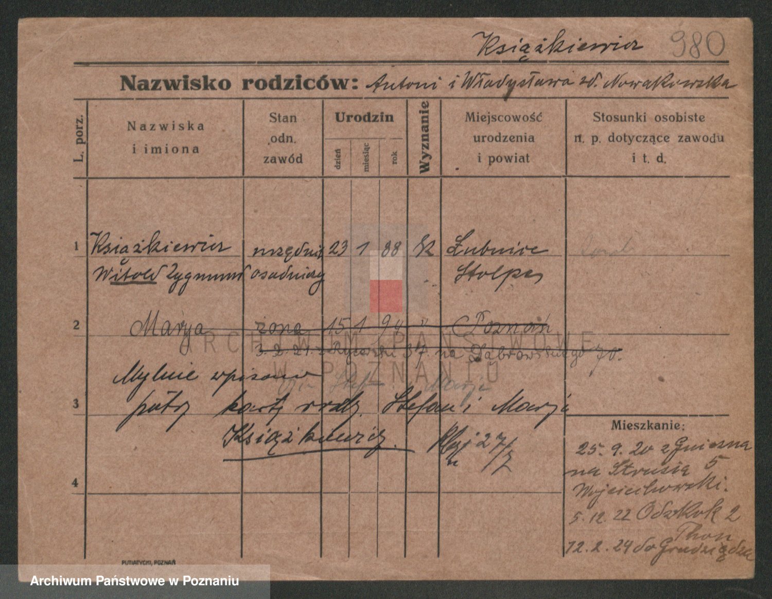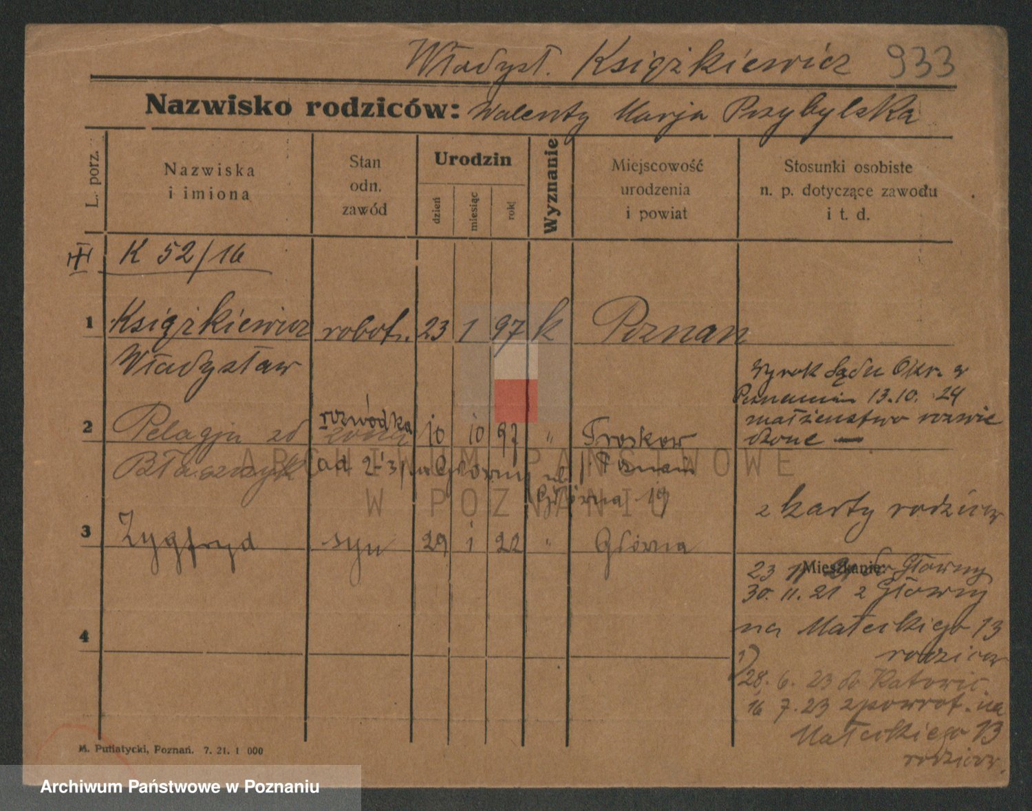 Podgląd karty osobowej dostępny jest po kliknięciu na nazwisko lub ikonkę karty. Można dokonywać powiększenia (ikony na górze) lub przechodzić między kolejnymi skanami (strzałki po bokach).