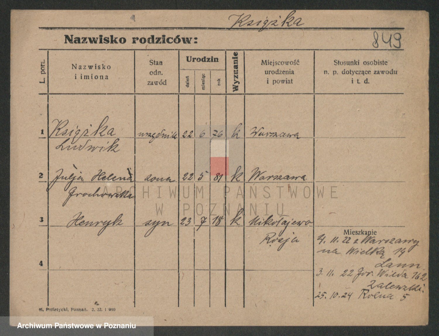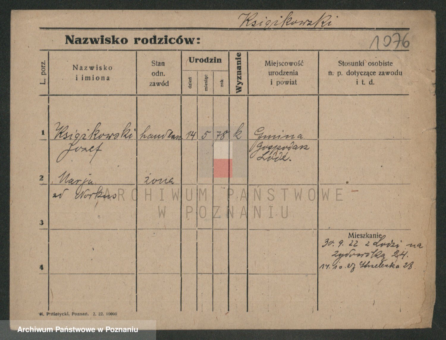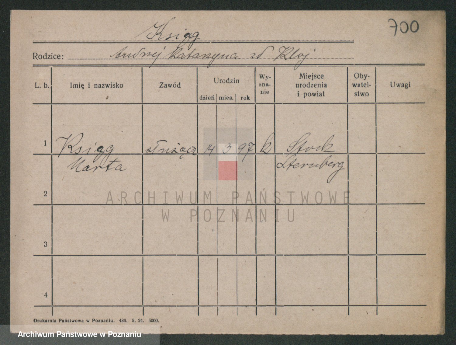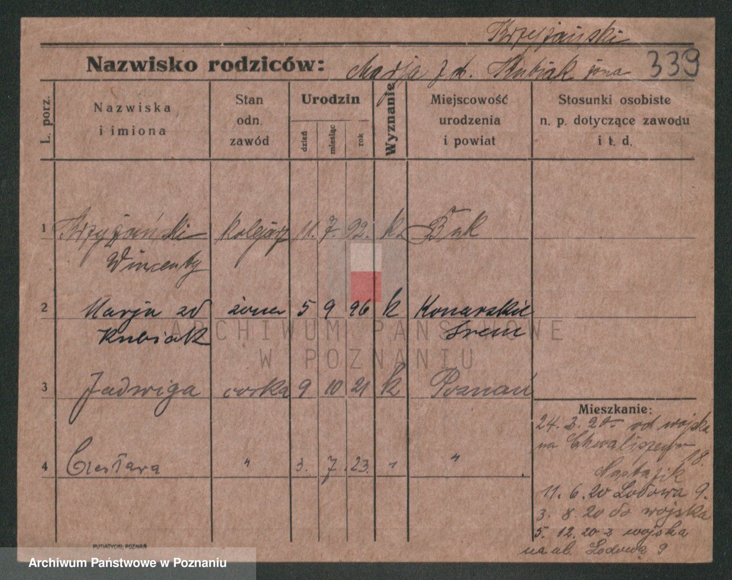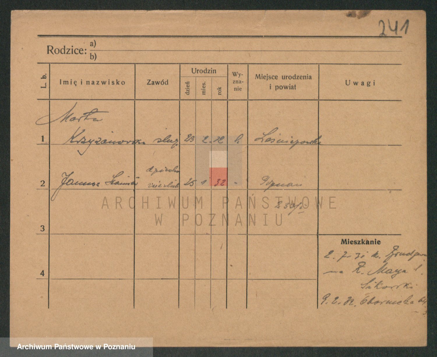 Podgląd karty osobowej dostępny jest po kliknięciu na nazwisko lub ikonkę karty. Można dokonywać powiększenia (ikony na górze) lub przechodzić między kolejnymi skanami (strzałki po bokach).