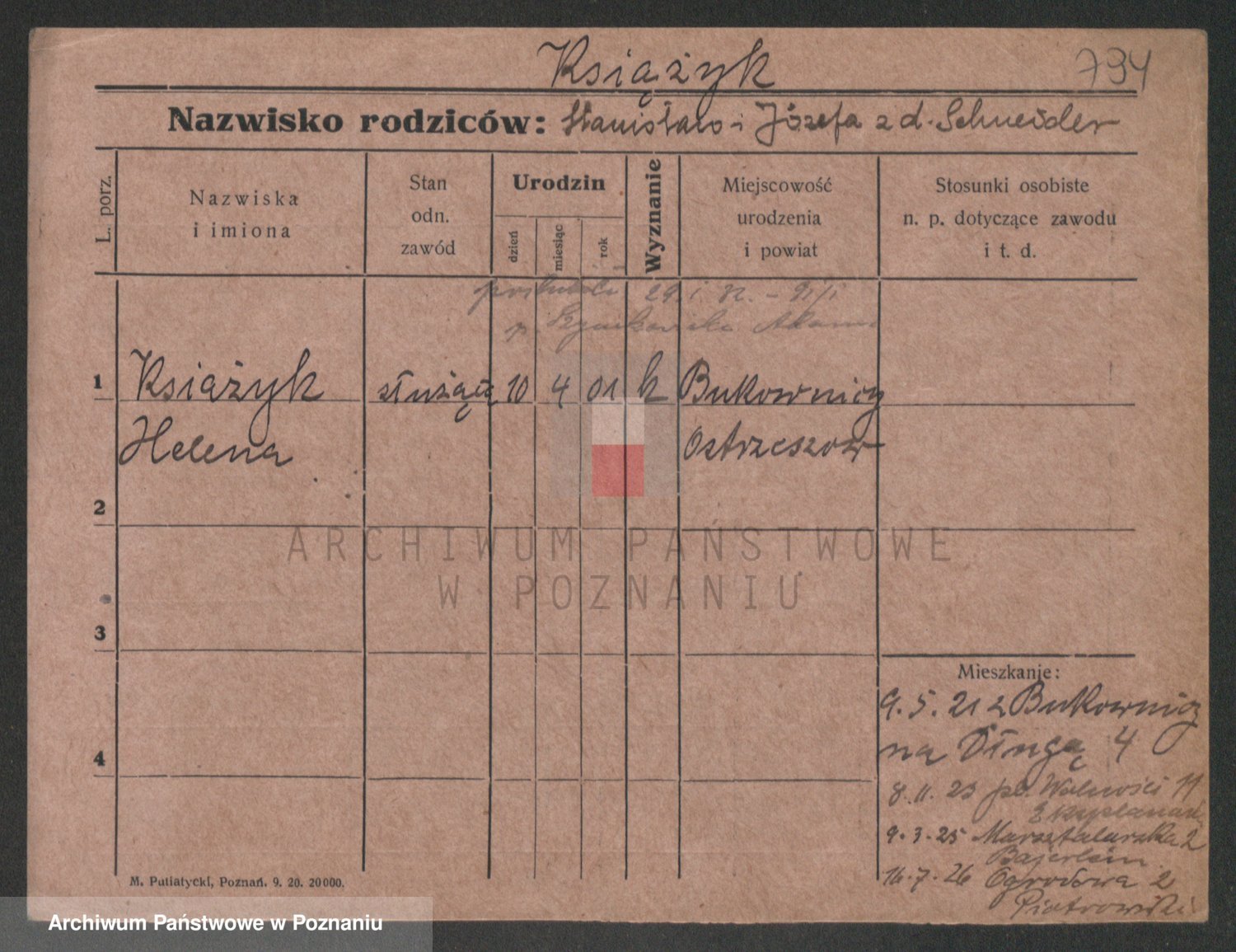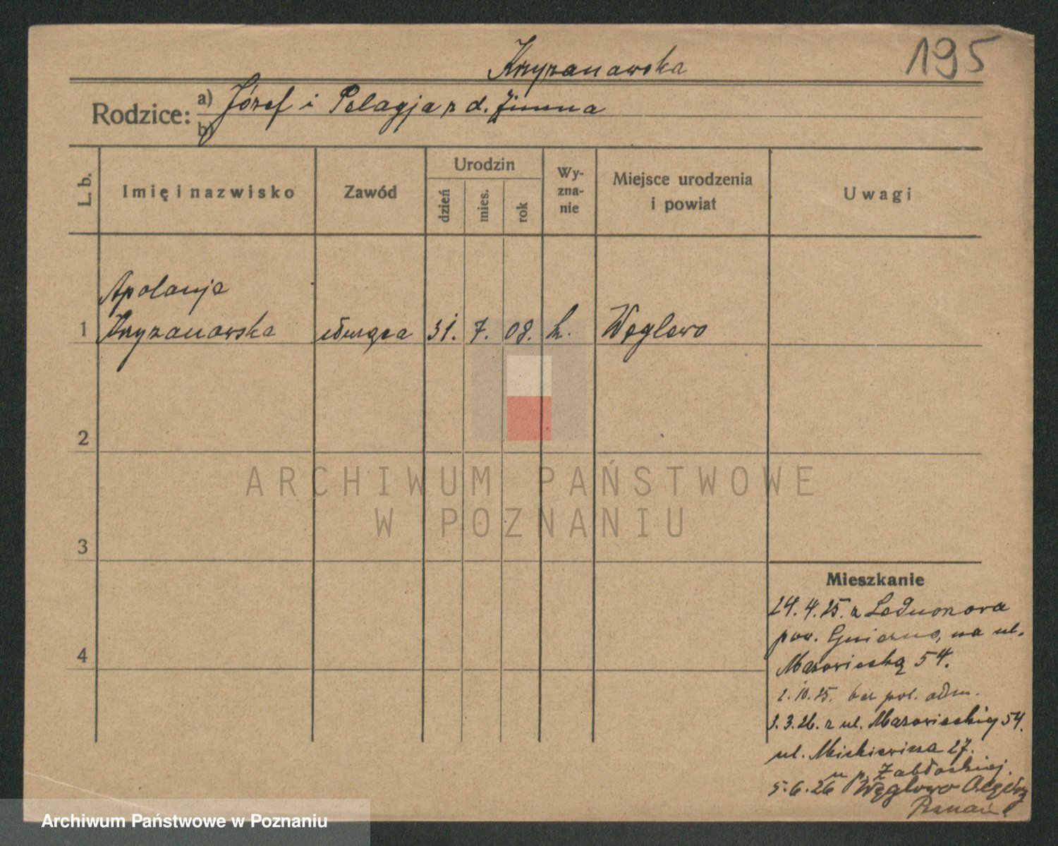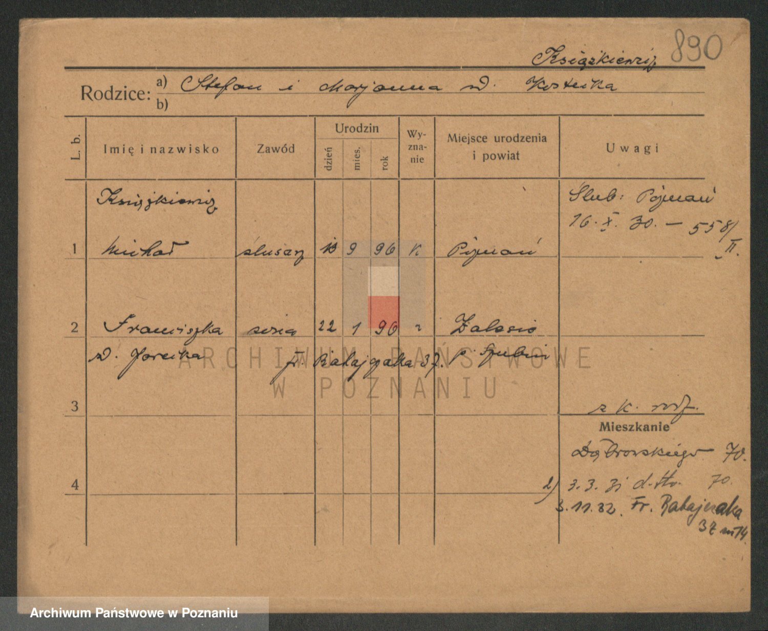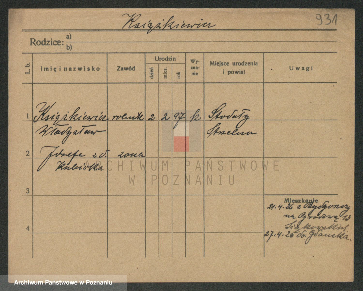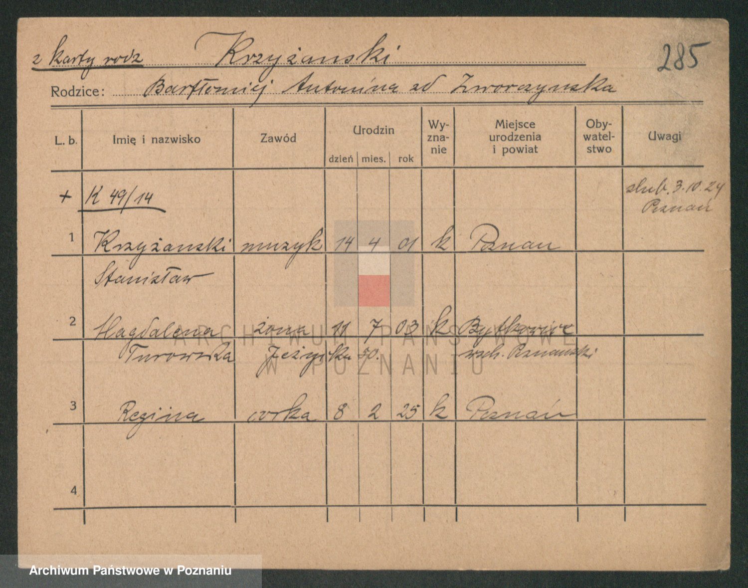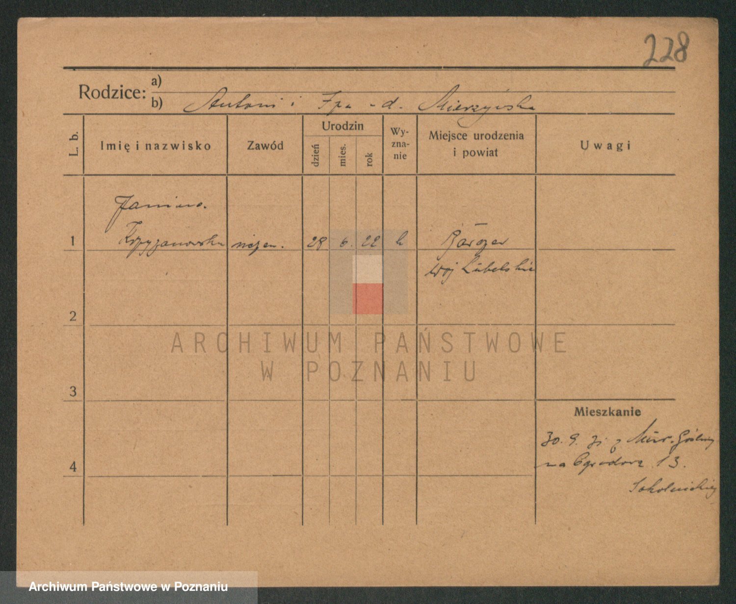 Podgląd karty osobowej dostępny jest po kliknięciu na nazwisko lub ikonkę karty. Można dokonywać powiększenia (ikony na górze) lub przechodzić między kolejnymi skanami (strzałki po bokach).