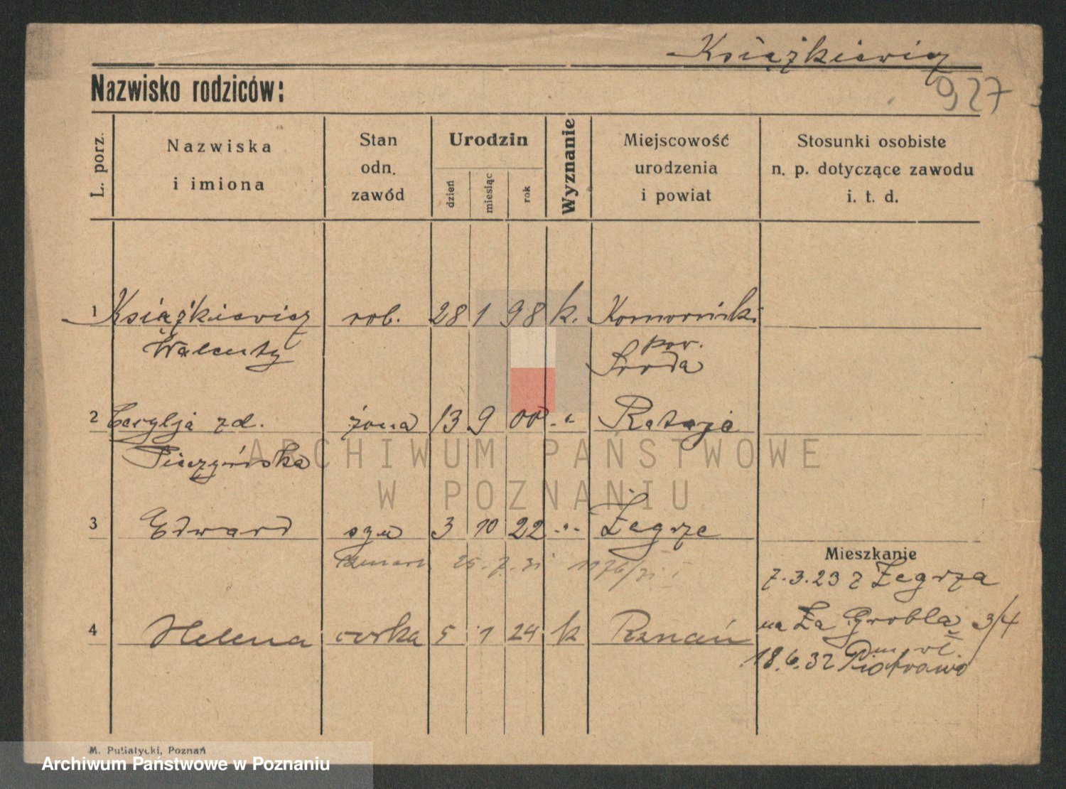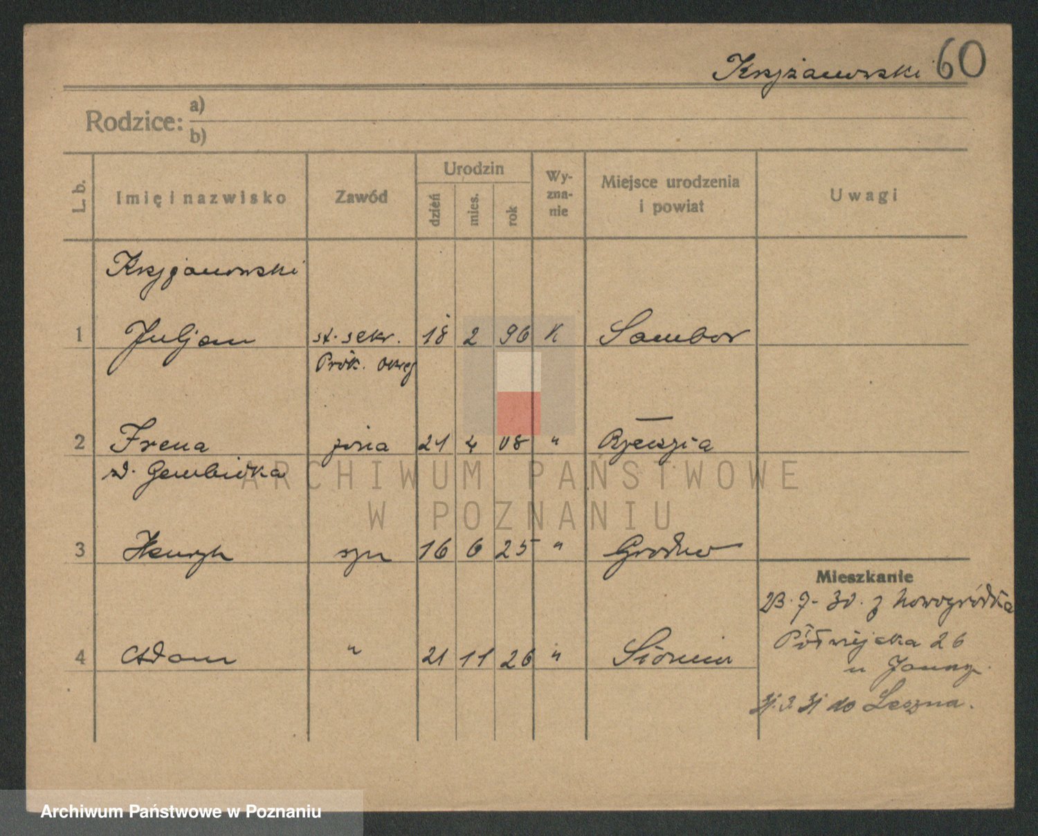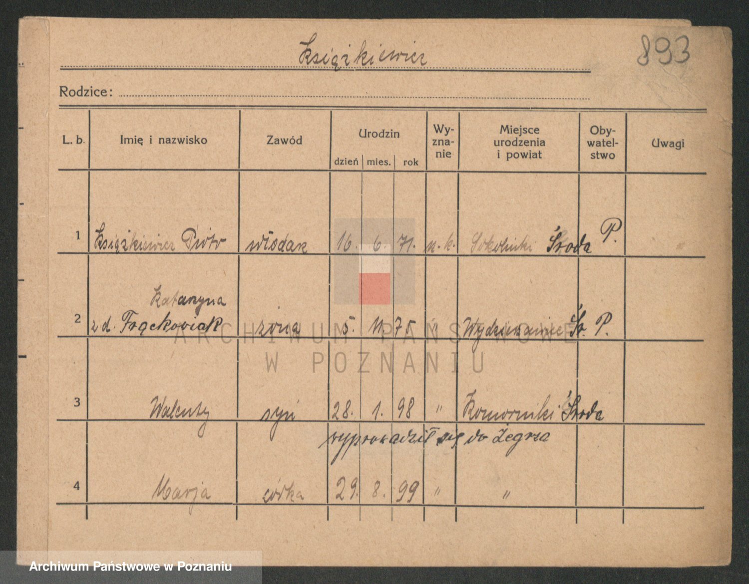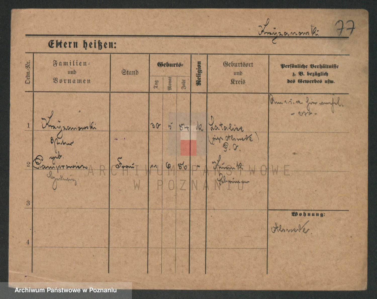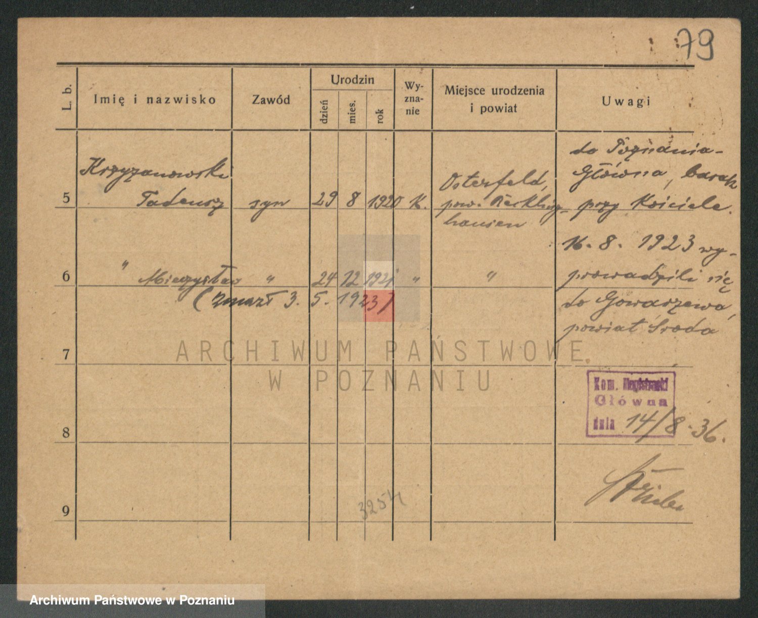 Podgląd karty osobowej dostępny jest po kliknięciu na nazwisko lub ikonkę karty. Można dokonywać powiększenia (ikony na górze) lub przechodzić między kolejnymi skanami (strzałki po bokach).