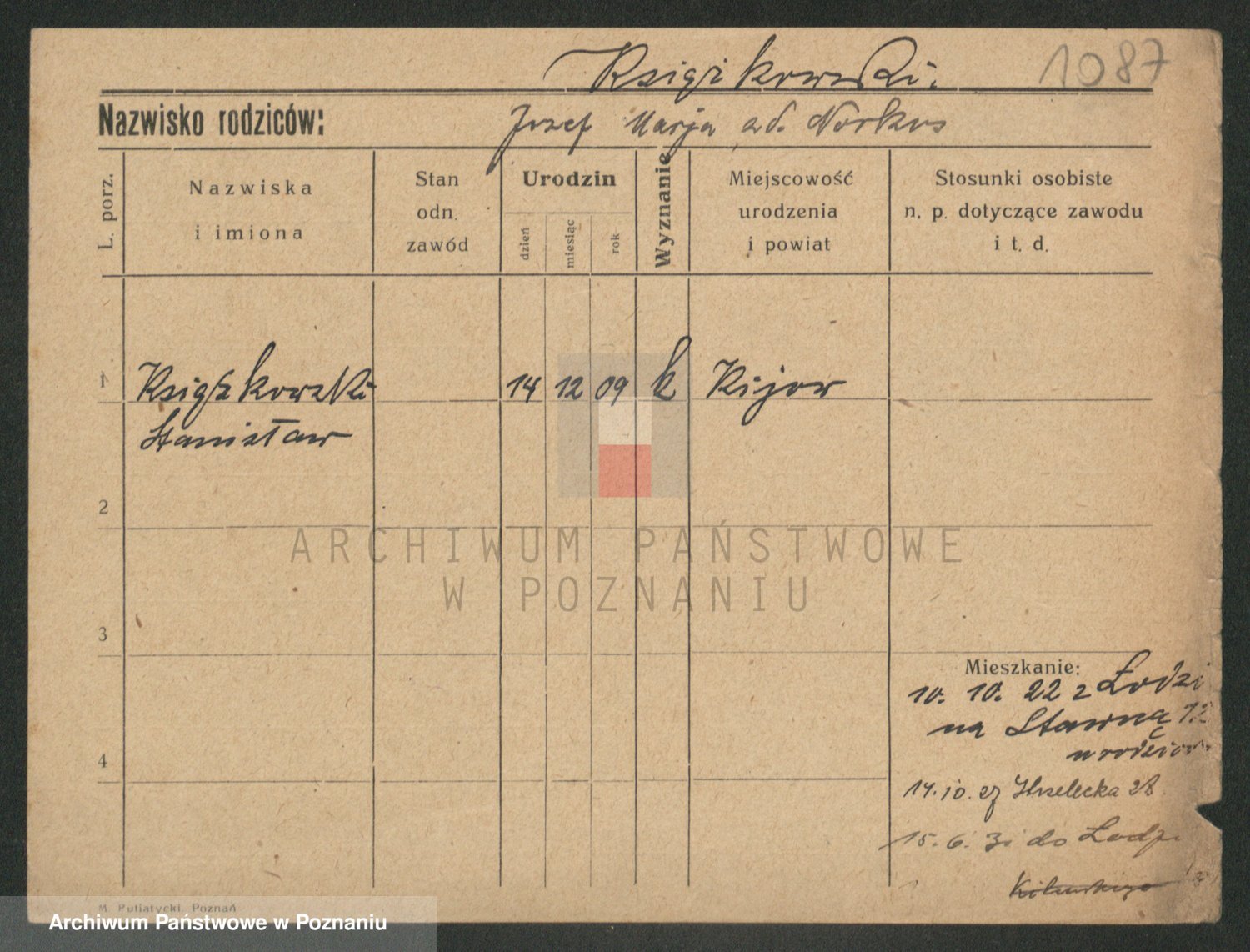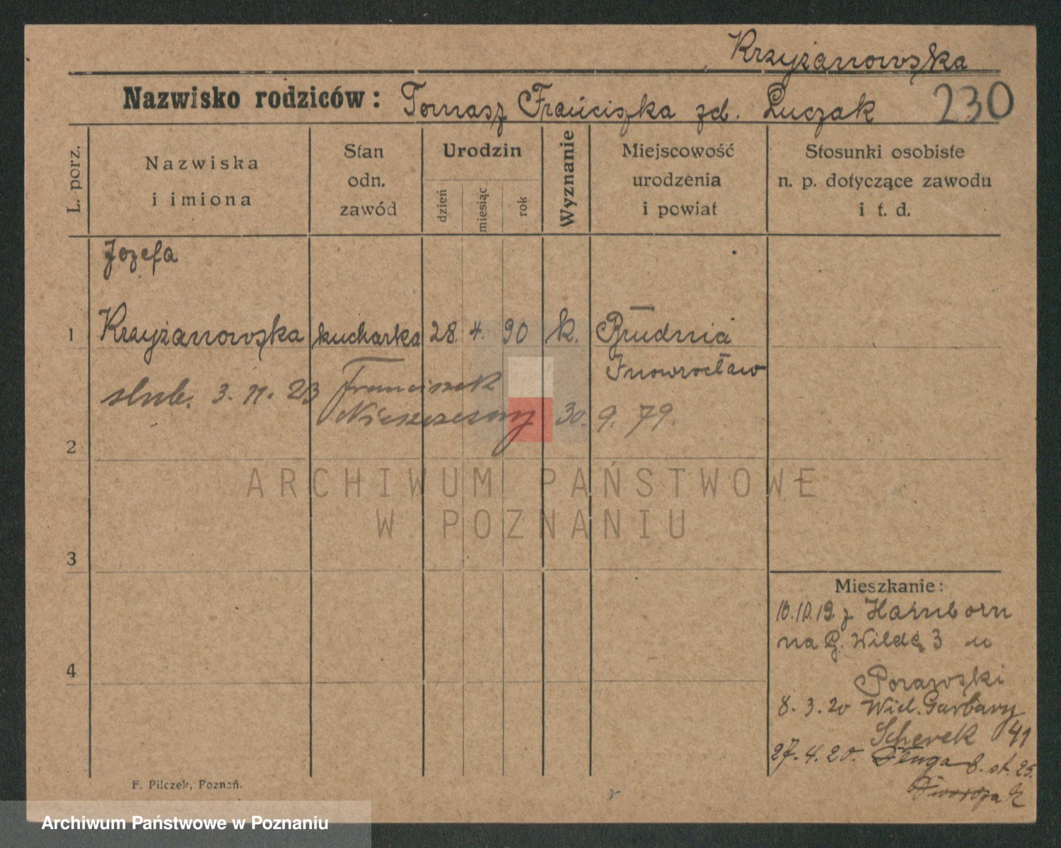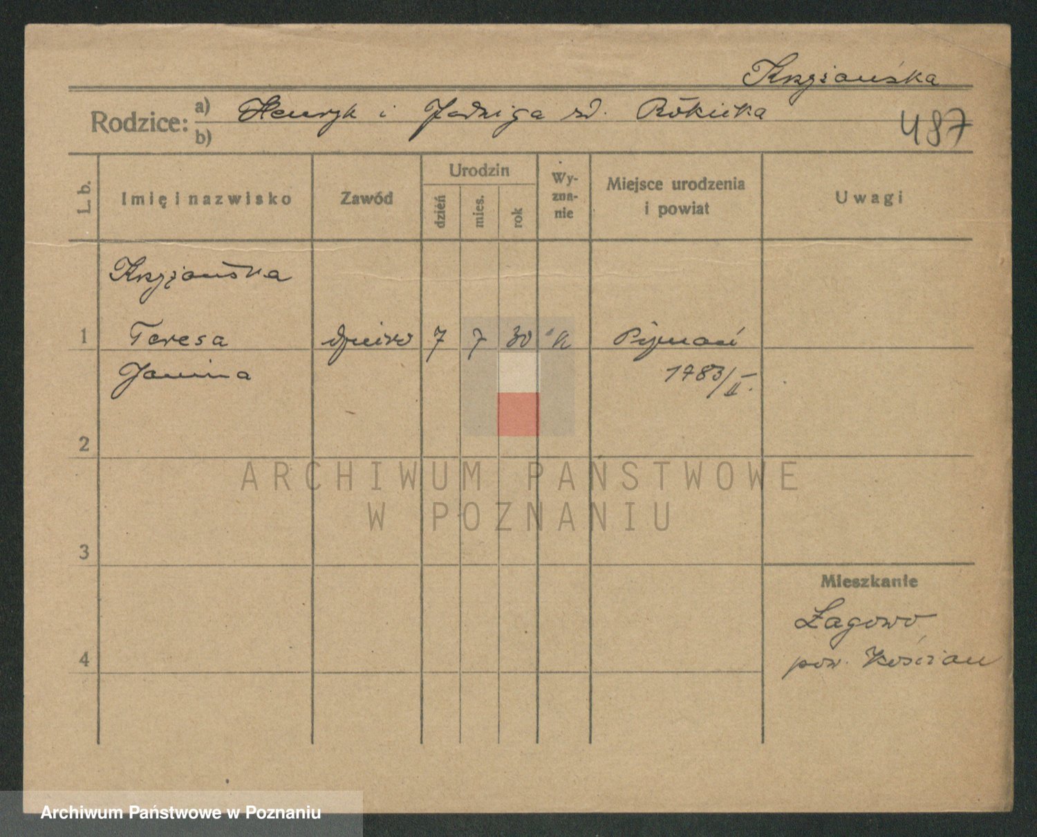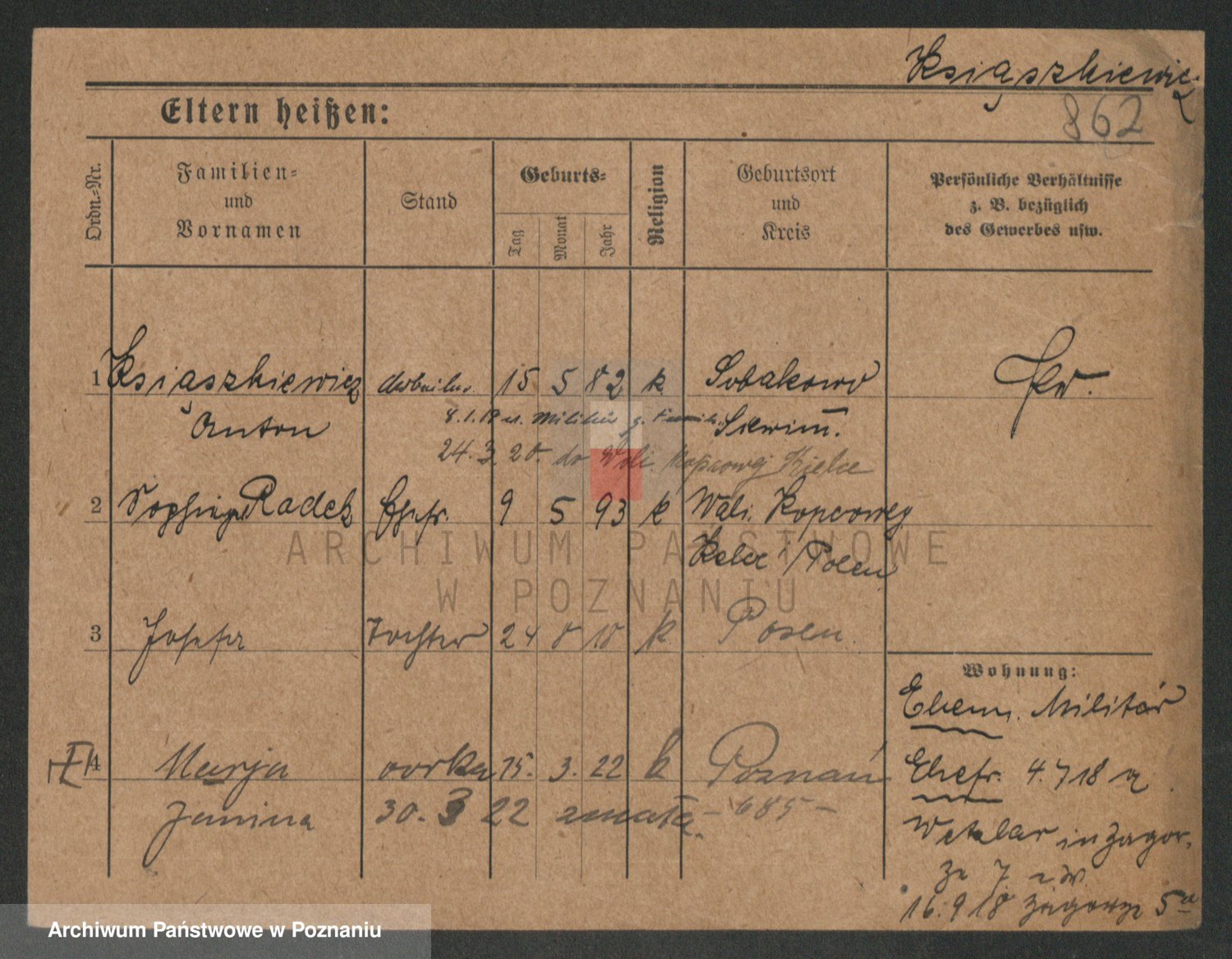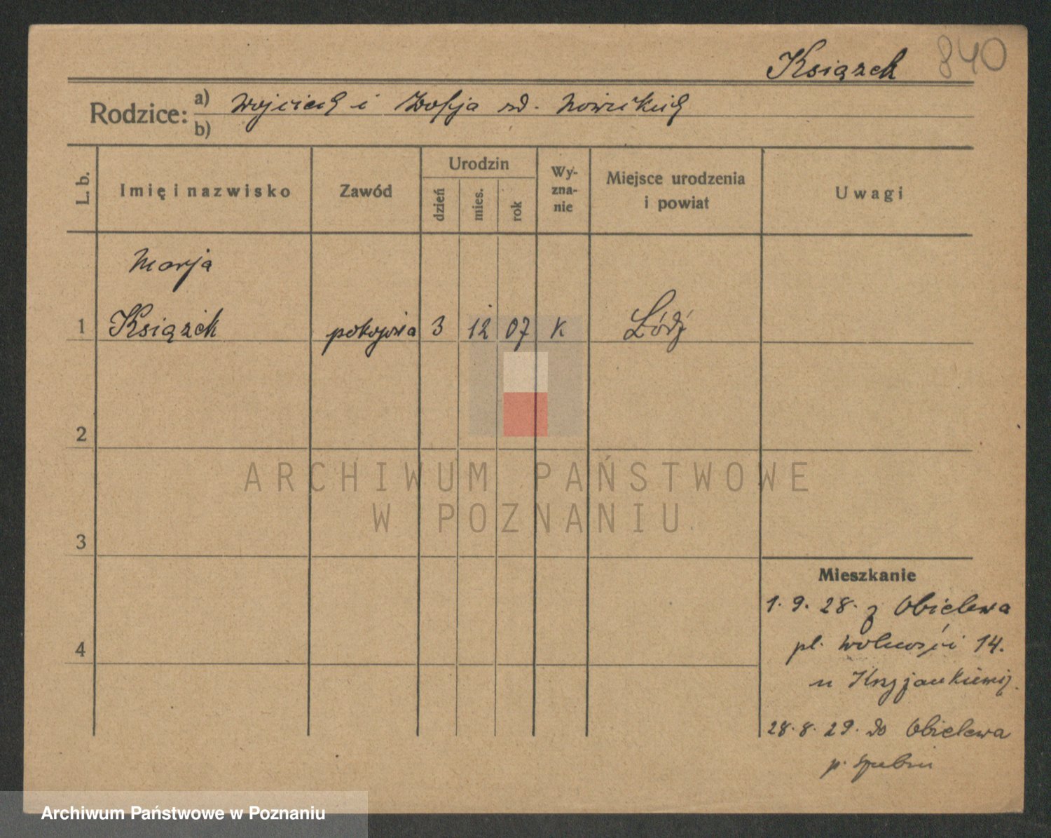 Podgląd karty osobowej dostępny jest po kliknięciu na nazwisko lub ikonkę karty. Można dokonywać powiększenia (ikony na górze) lub przechodzić między kolejnymi skanami (strzałki po bokach).
