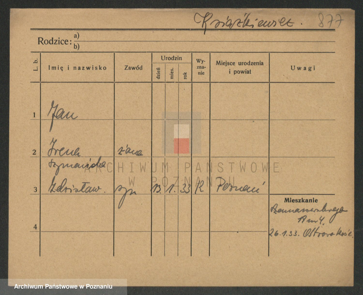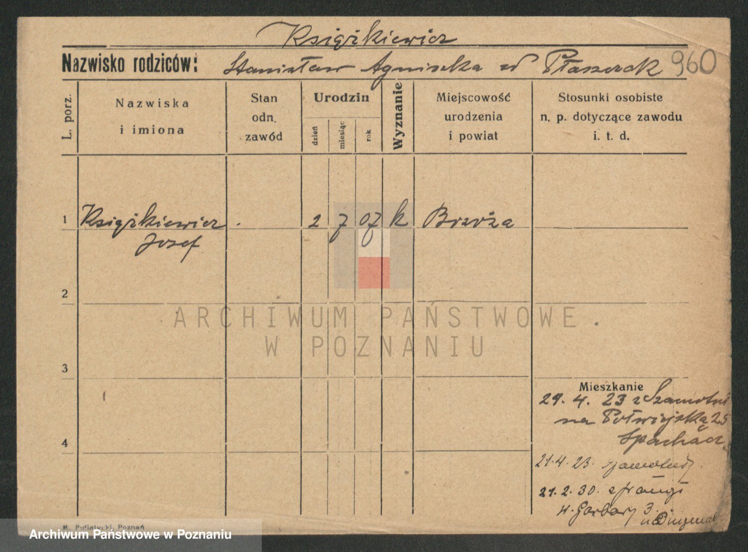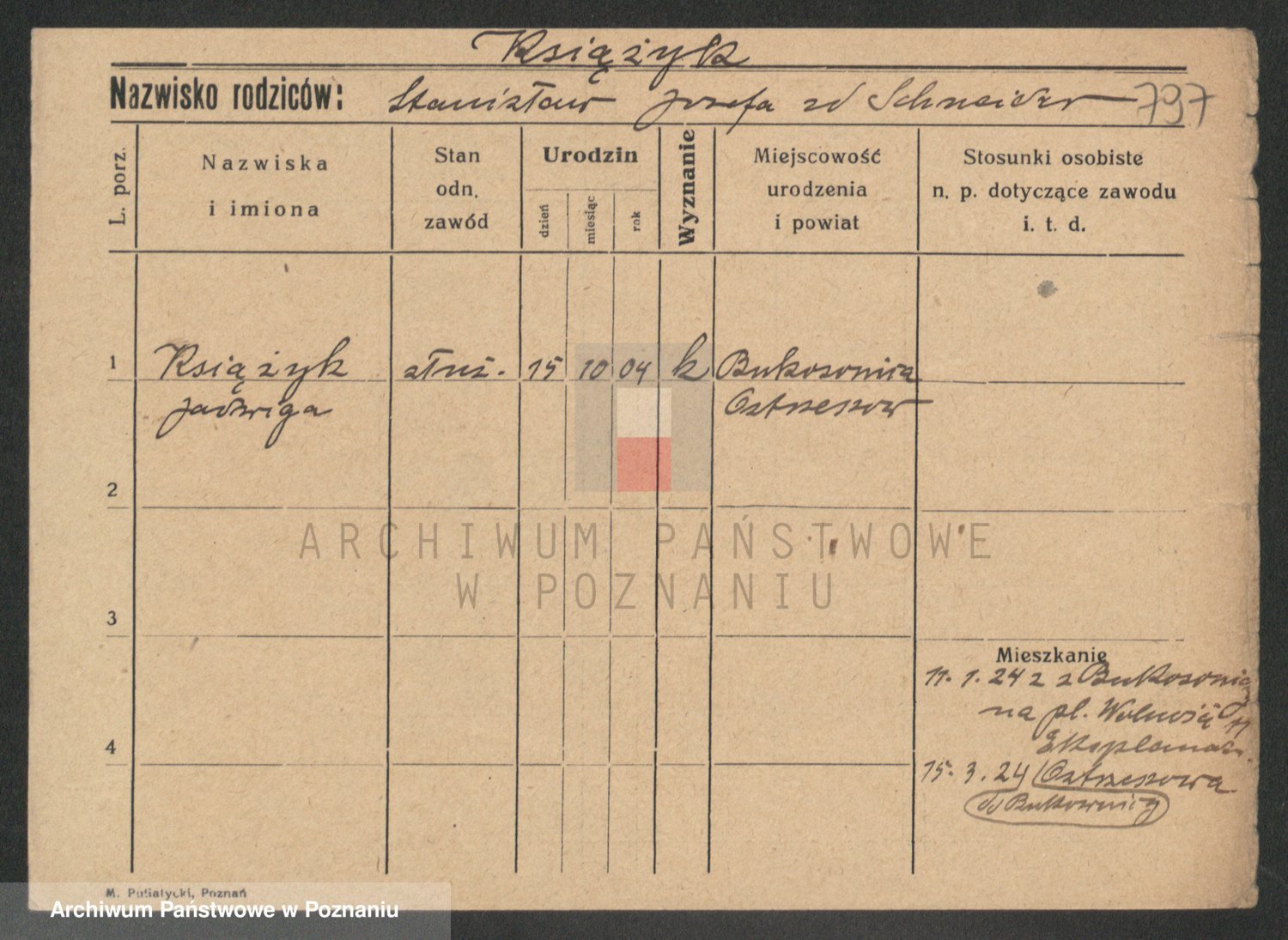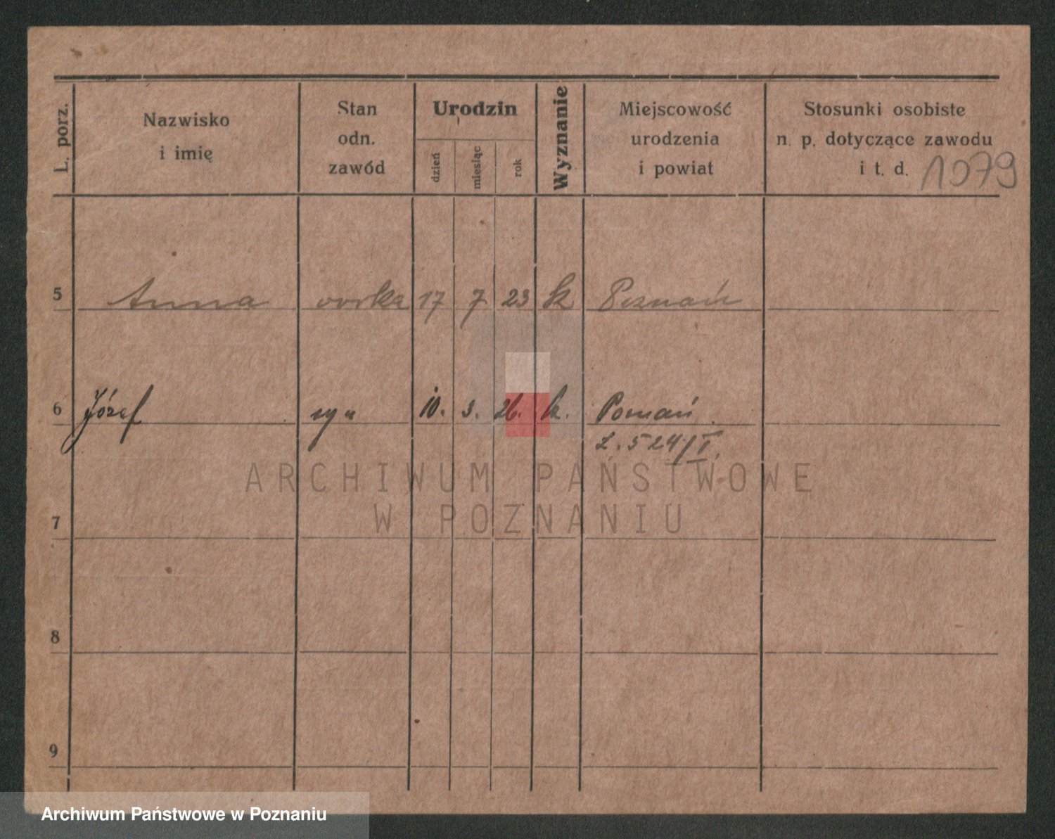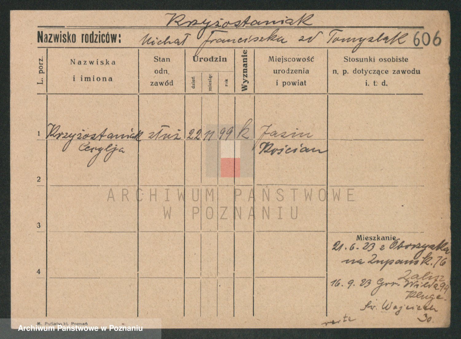 Podgląd karty osobowej dostępny jest po kliknięciu na nazwisko lub ikonkę karty. Można dokonywać powiększenia (ikony na górze) lub przechodzić między kolejnymi skanami (strzałki po bokach).