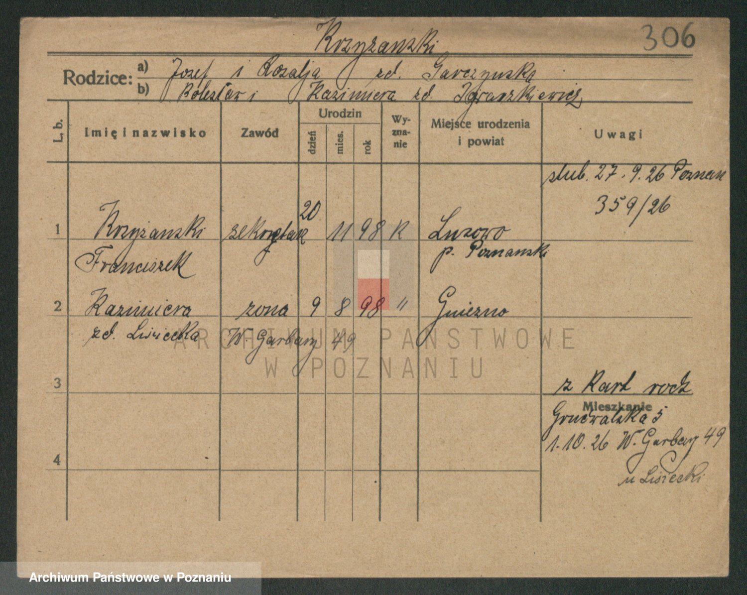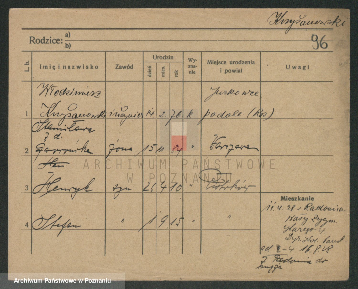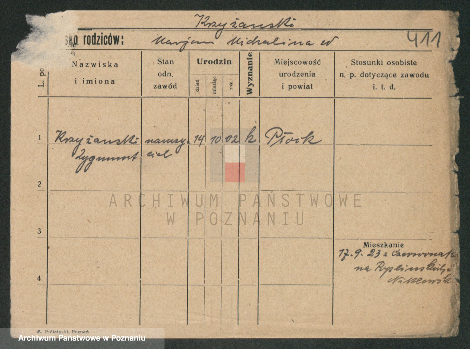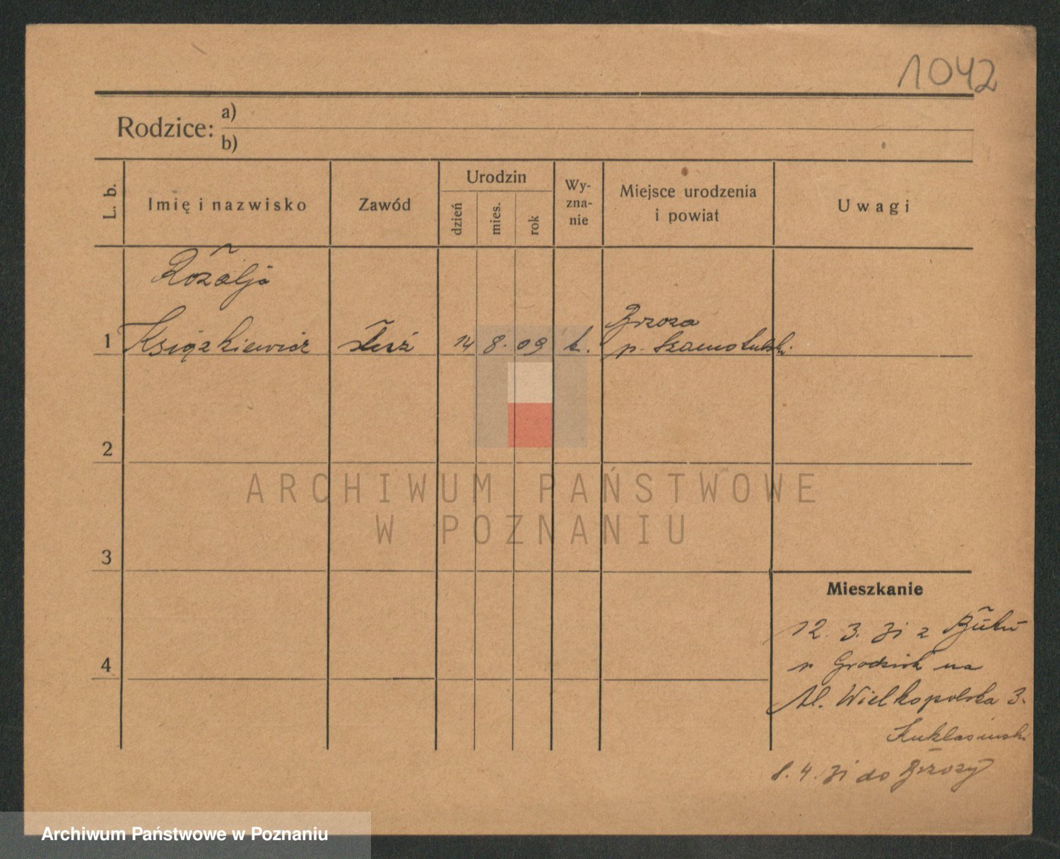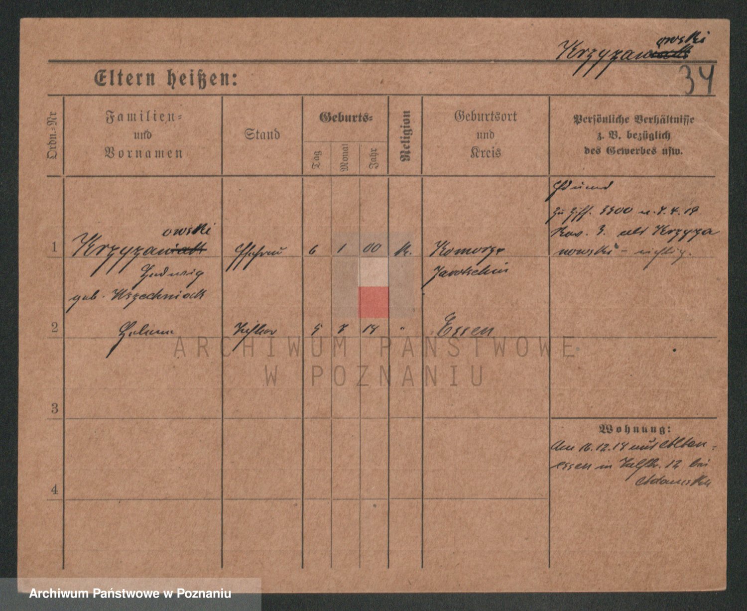 Podgląd karty osobowej dostępny jest po kliknięciu na nazwisko lub ikonkę karty. Można dokonywać powiększenia (ikony na górze) lub przechodzić między kolejnymi skanami (strzałki po bokach).