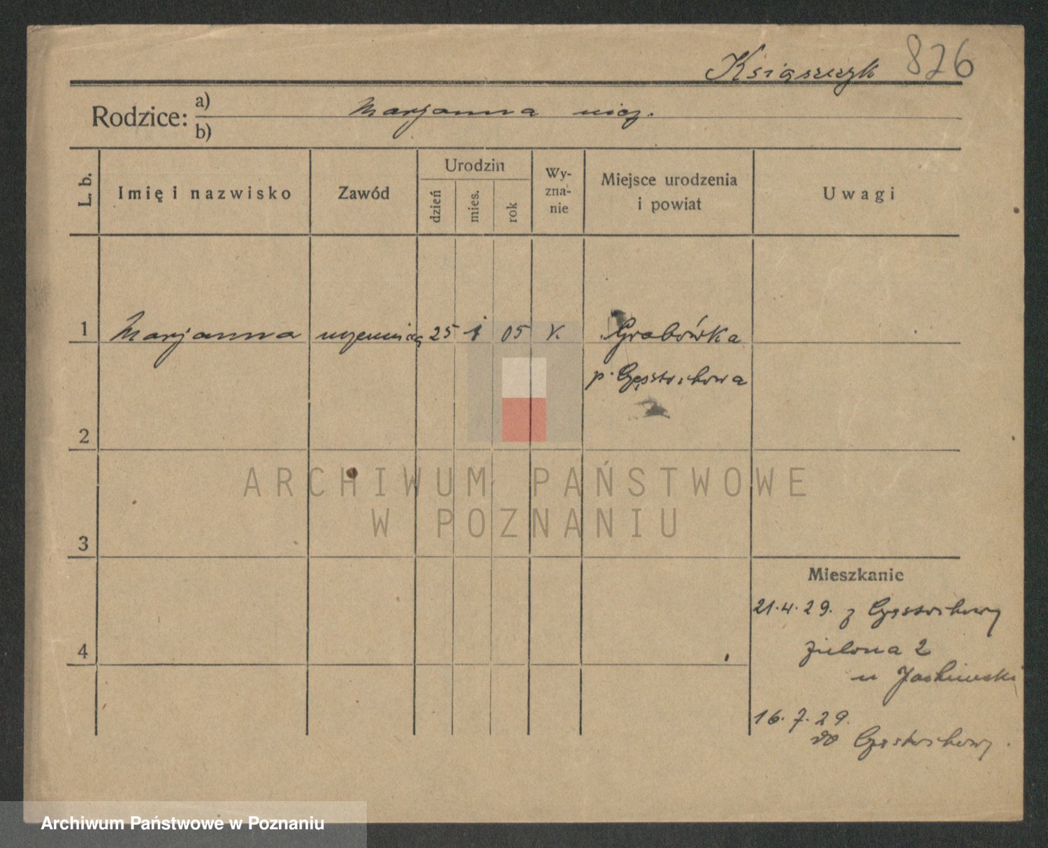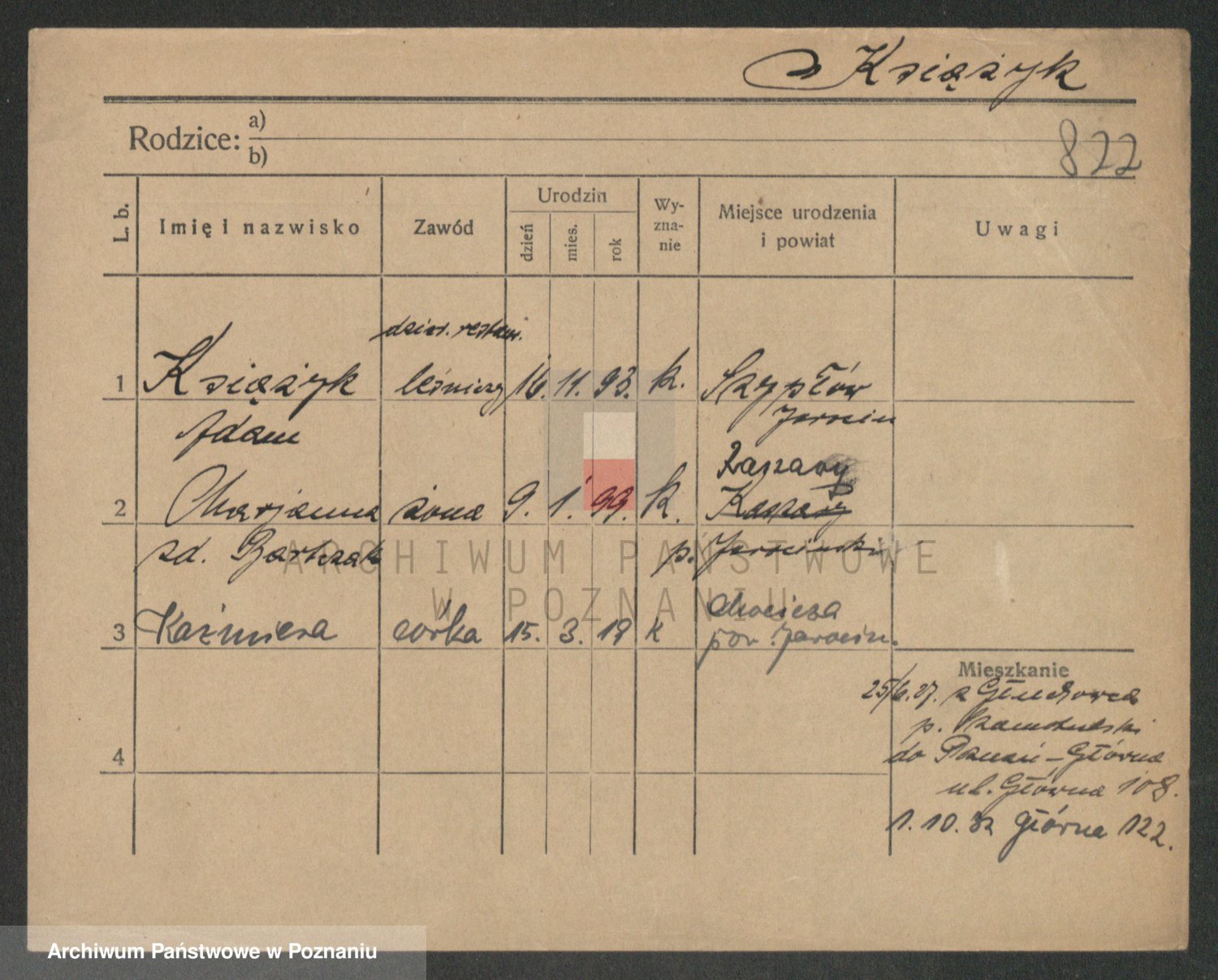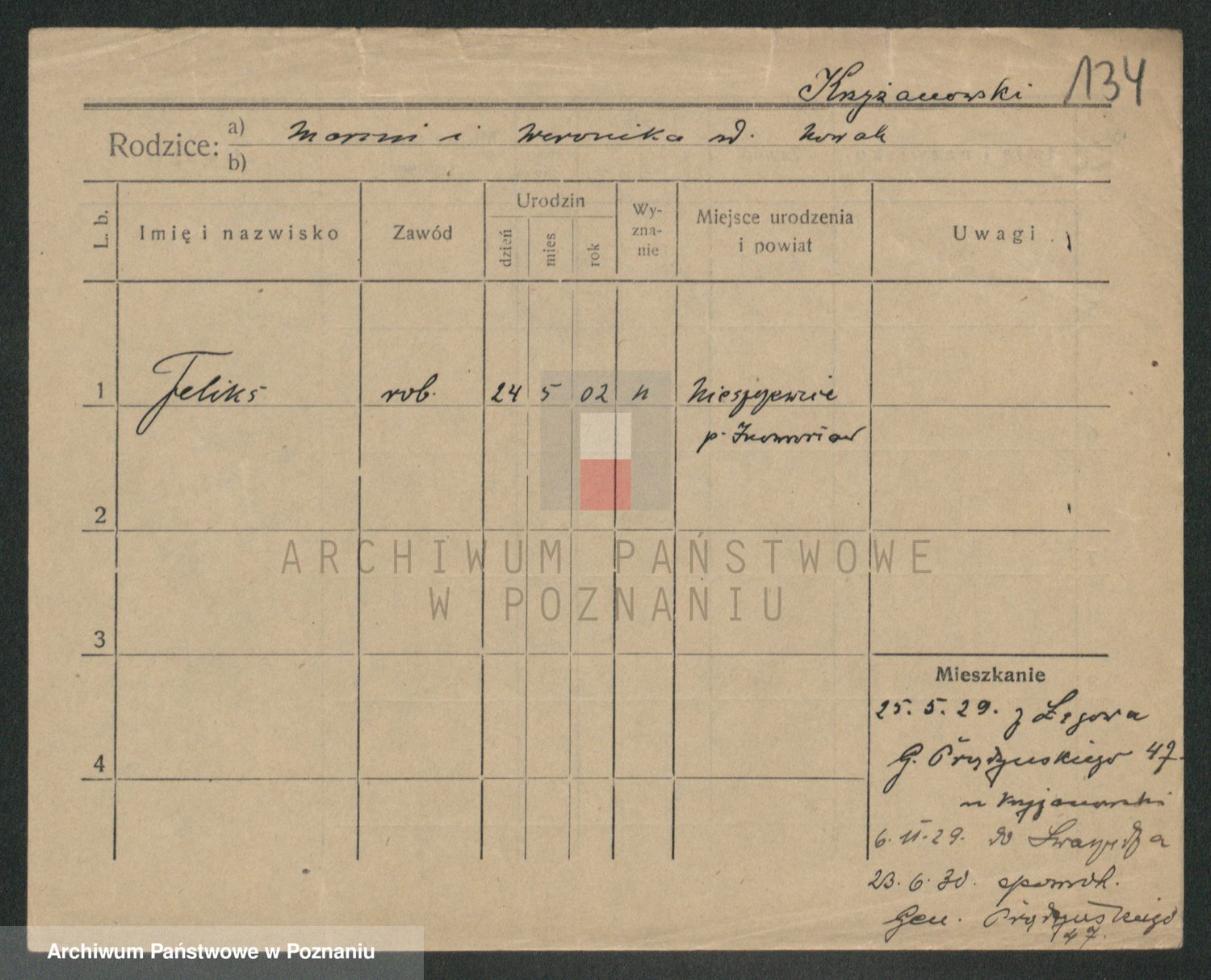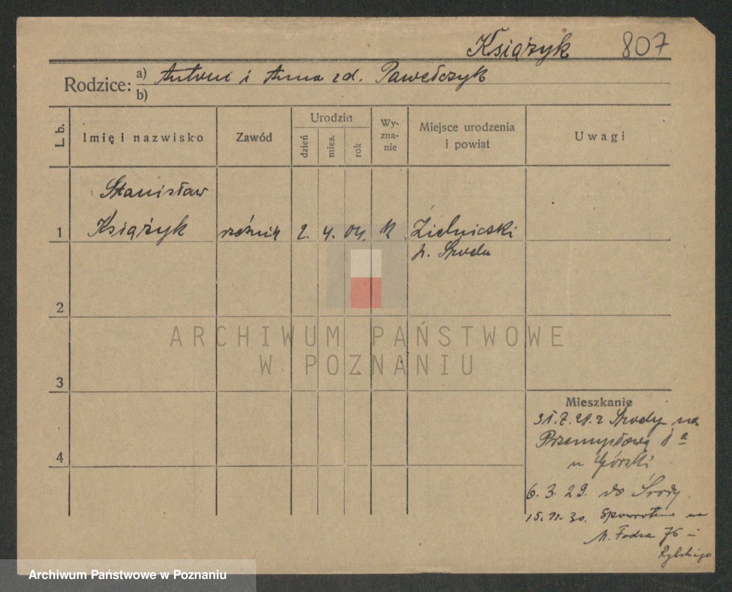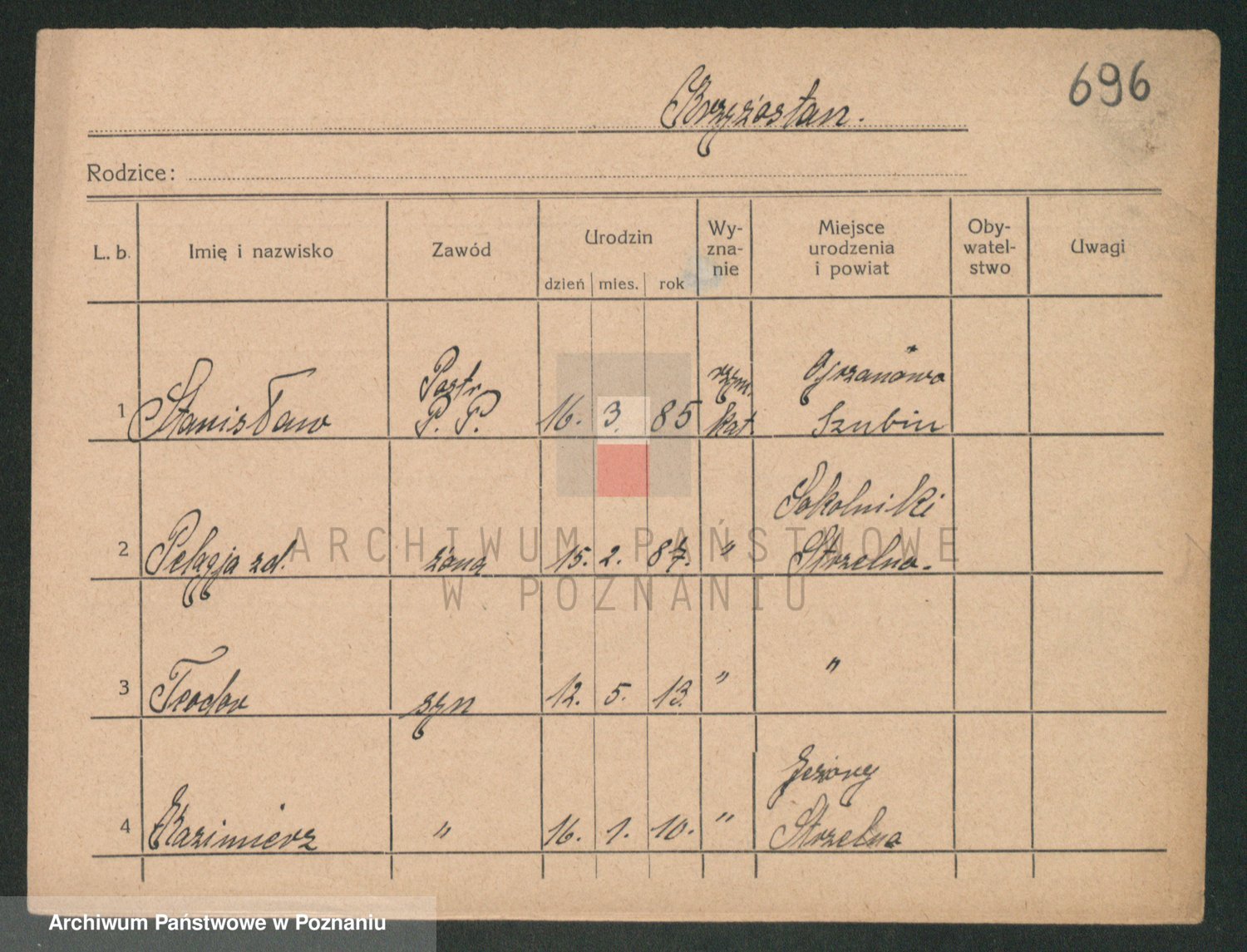 Podgląd karty osobowej dostępny jest po kliknięciu na nazwisko lub ikonkę karty. Można dokonywać powiększenia (ikony na górze) lub przechodzić między kolejnymi skanami (strzałki po bokach).