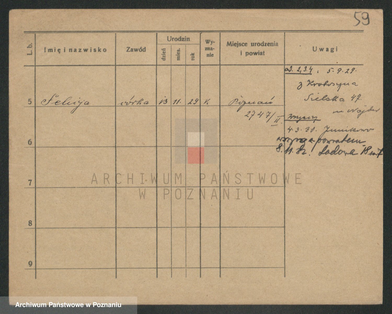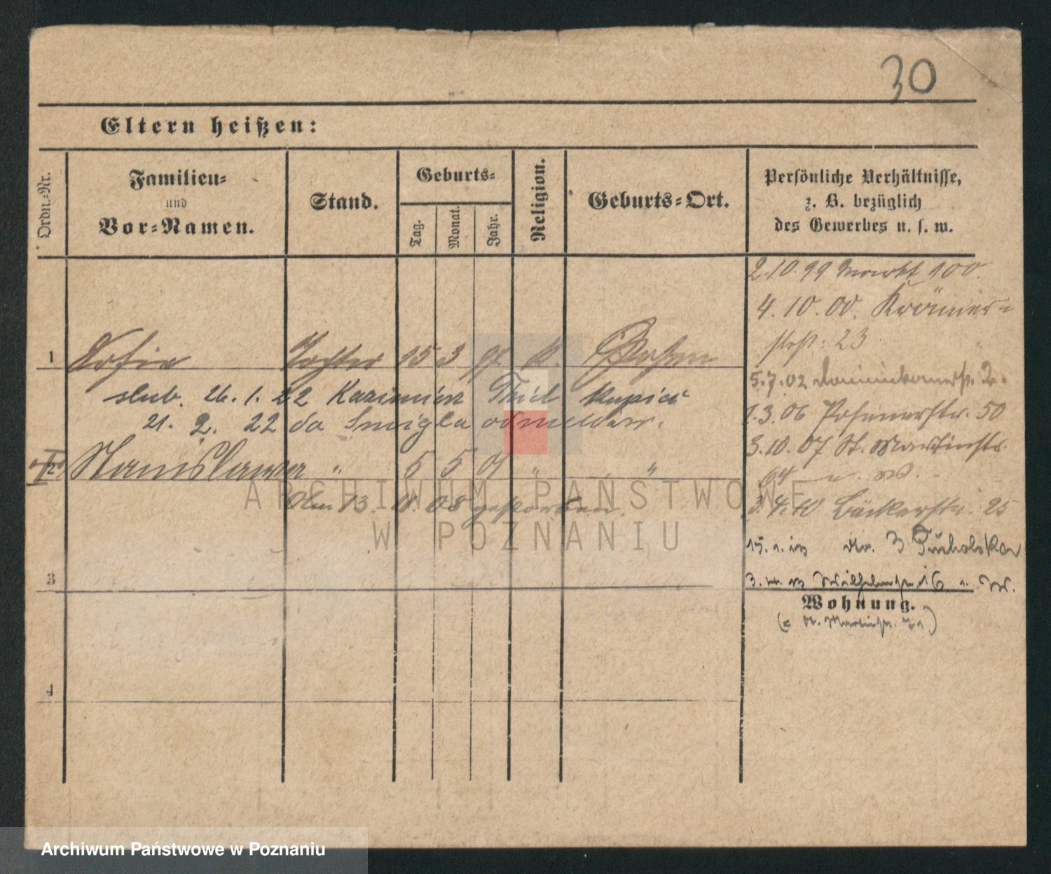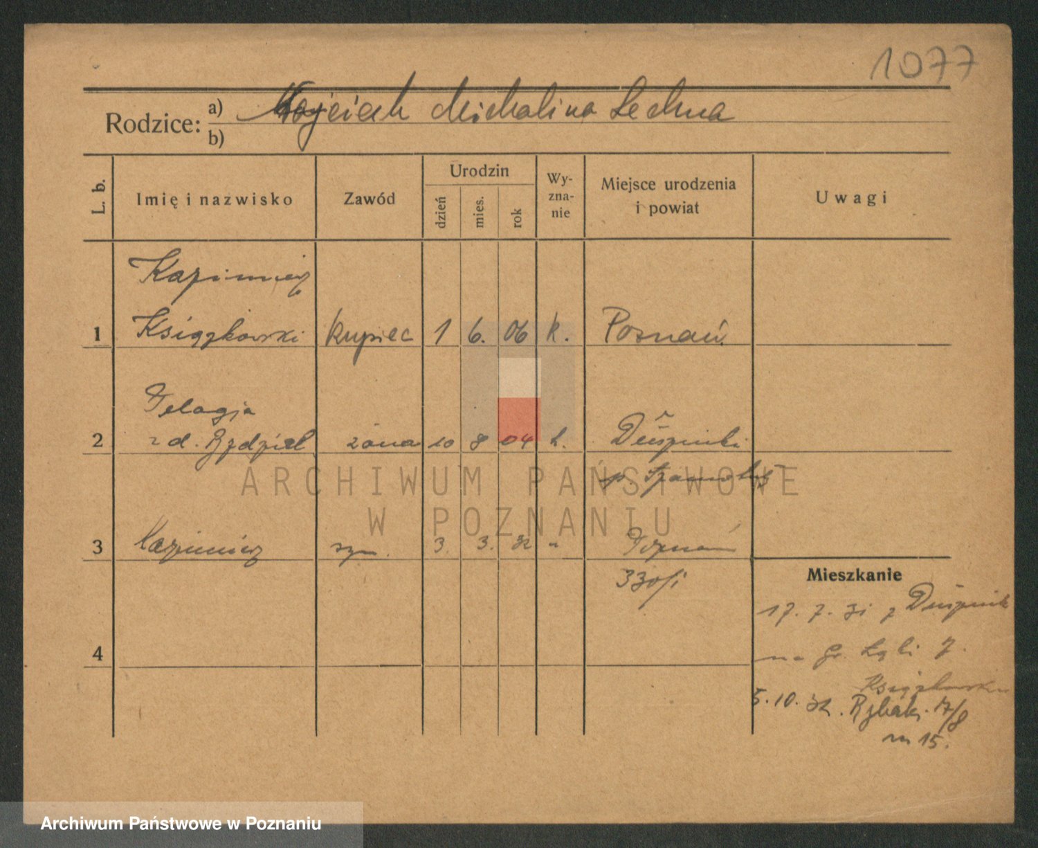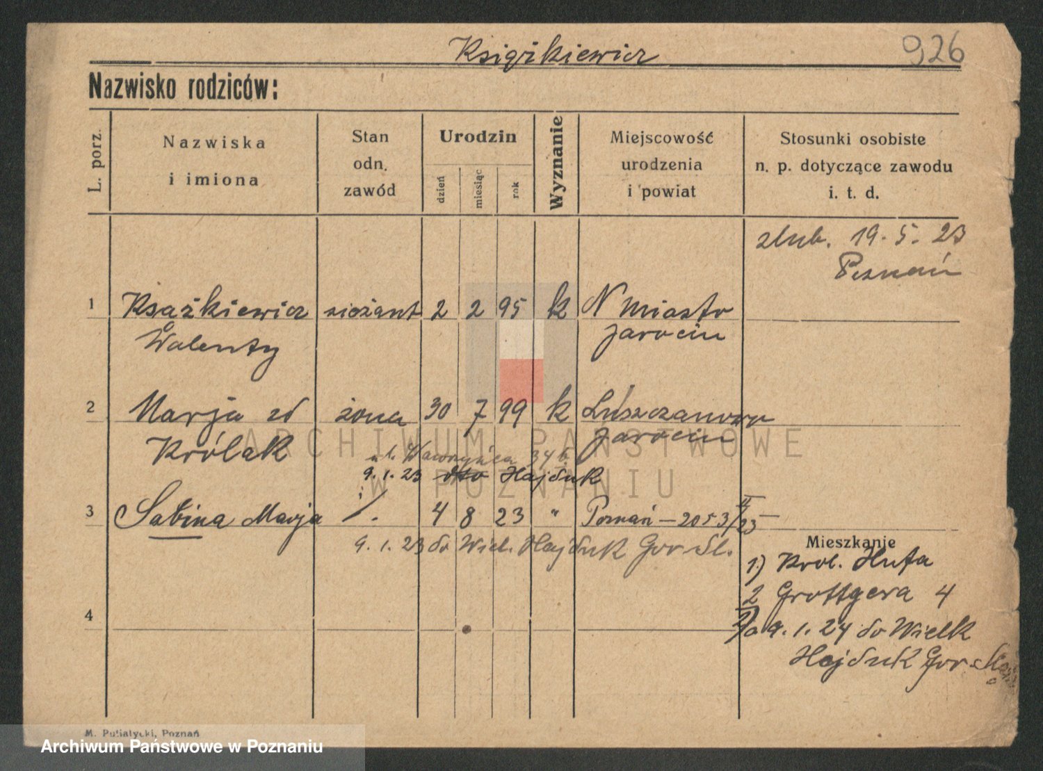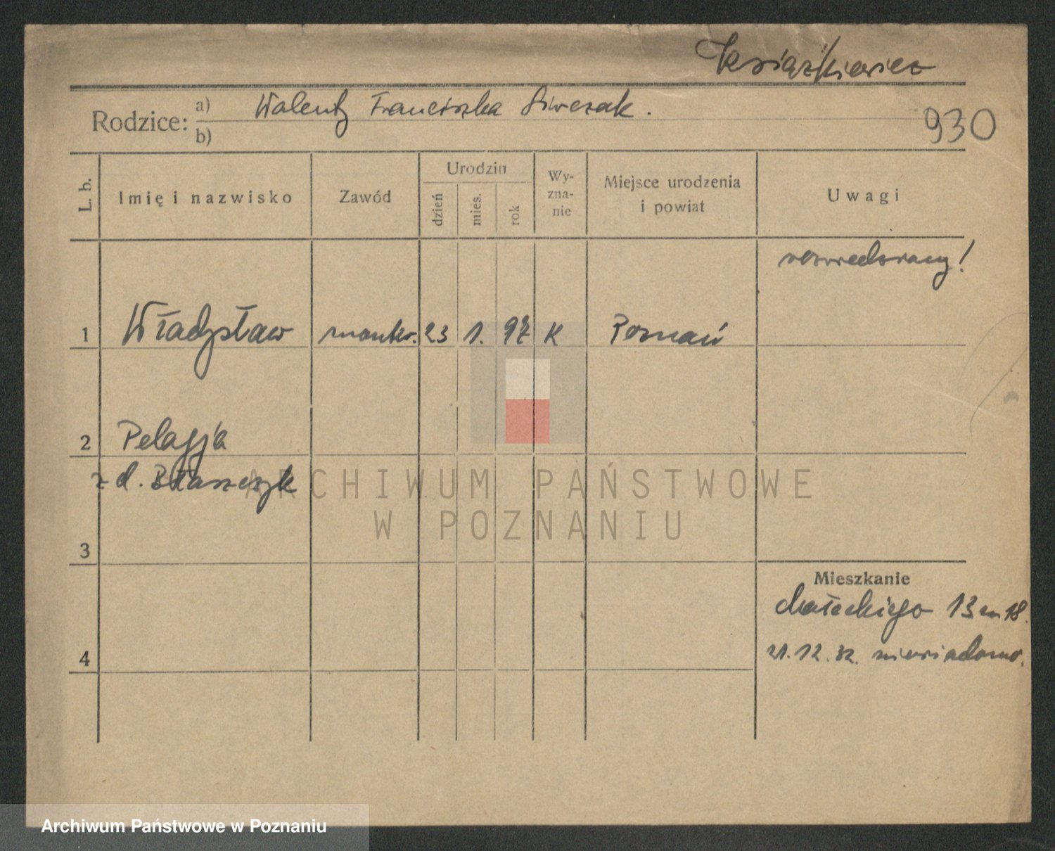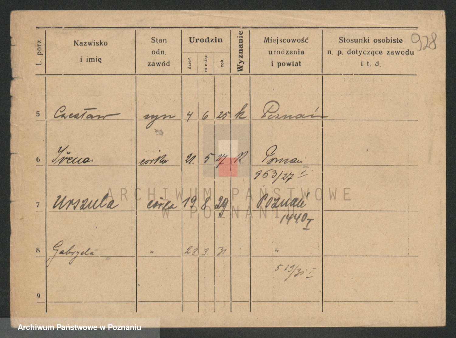 Podgląd karty osobowej dostępny jest po kliknięciu na nazwisko lub ikonkę karty. Można dokonywać powiększenia (ikony na górze) lub przechodzić między kolejnymi skanami (strzałki po bokach).
