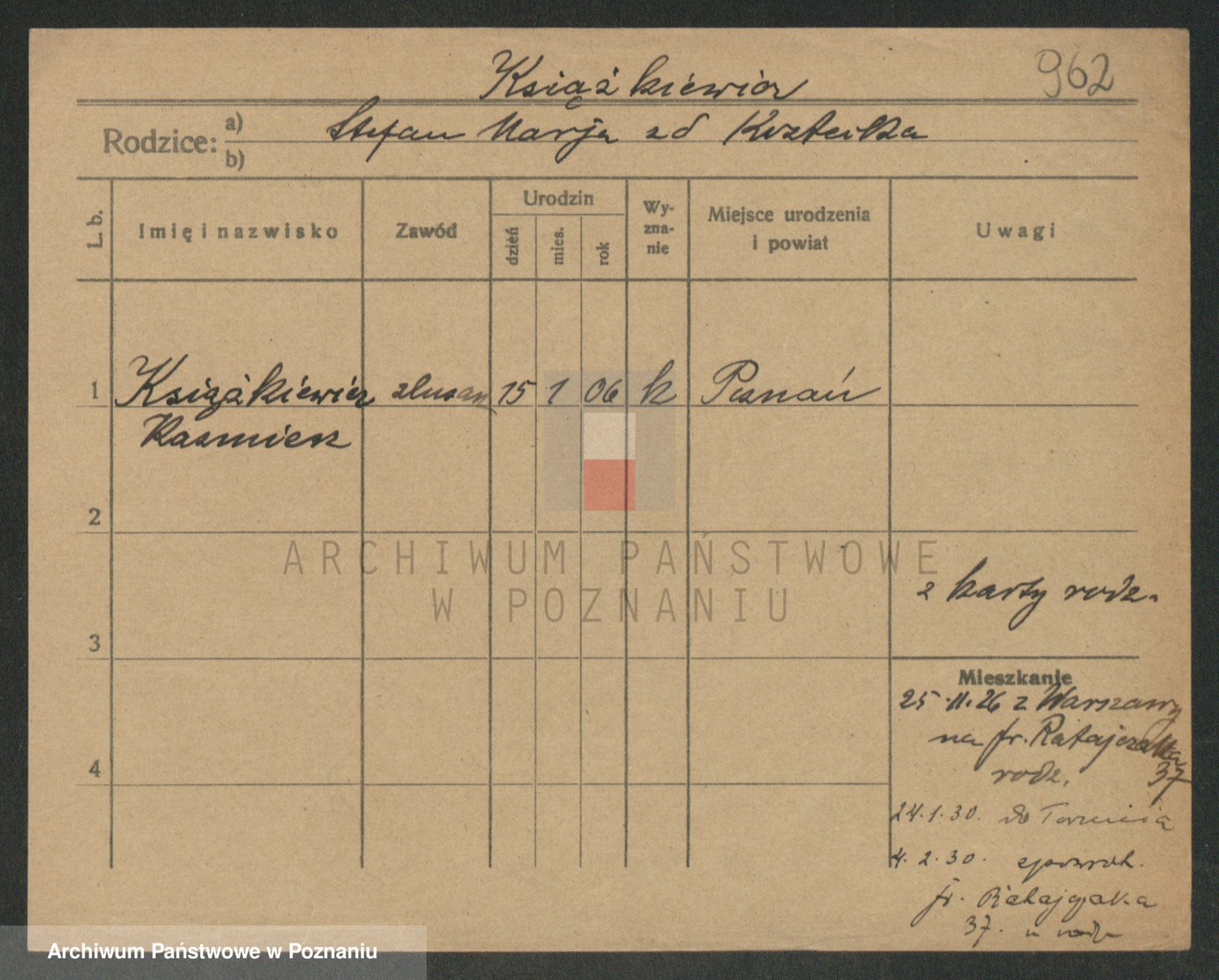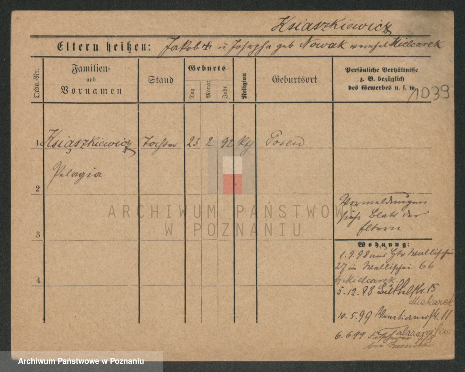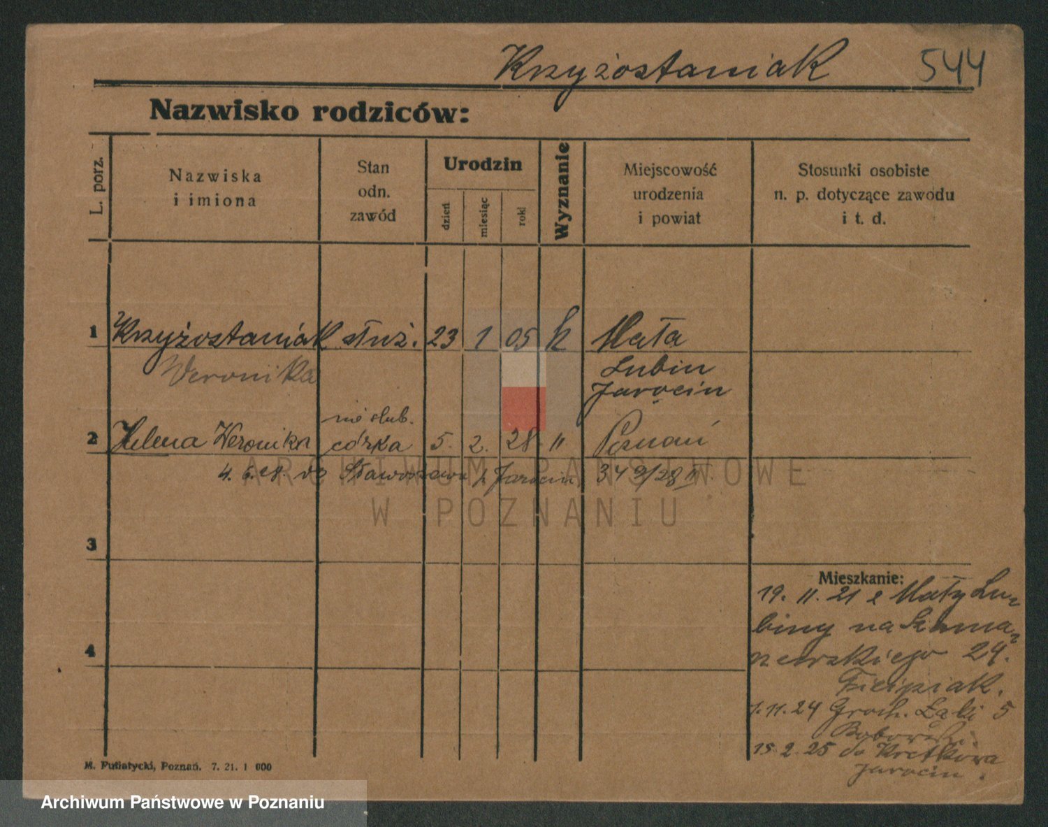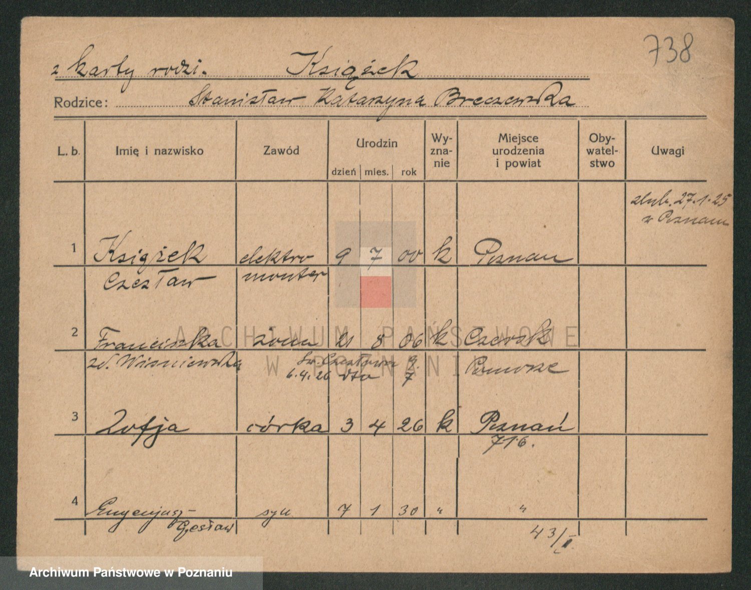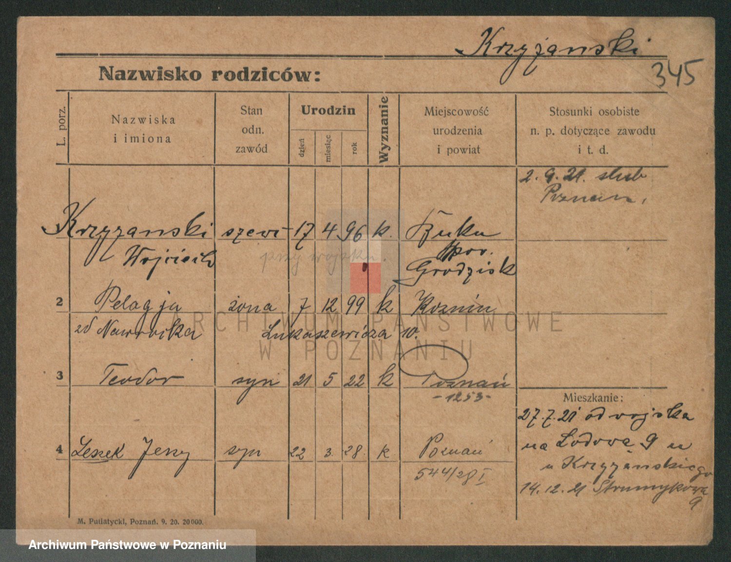 Podgląd karty osobowej dostępny jest po kliknięciu na nazwisko lub ikonkę karty. Można dokonywać powiększenia (ikony na górze) lub przechodzić między kolejnymi skanami (strzałki po bokach).
