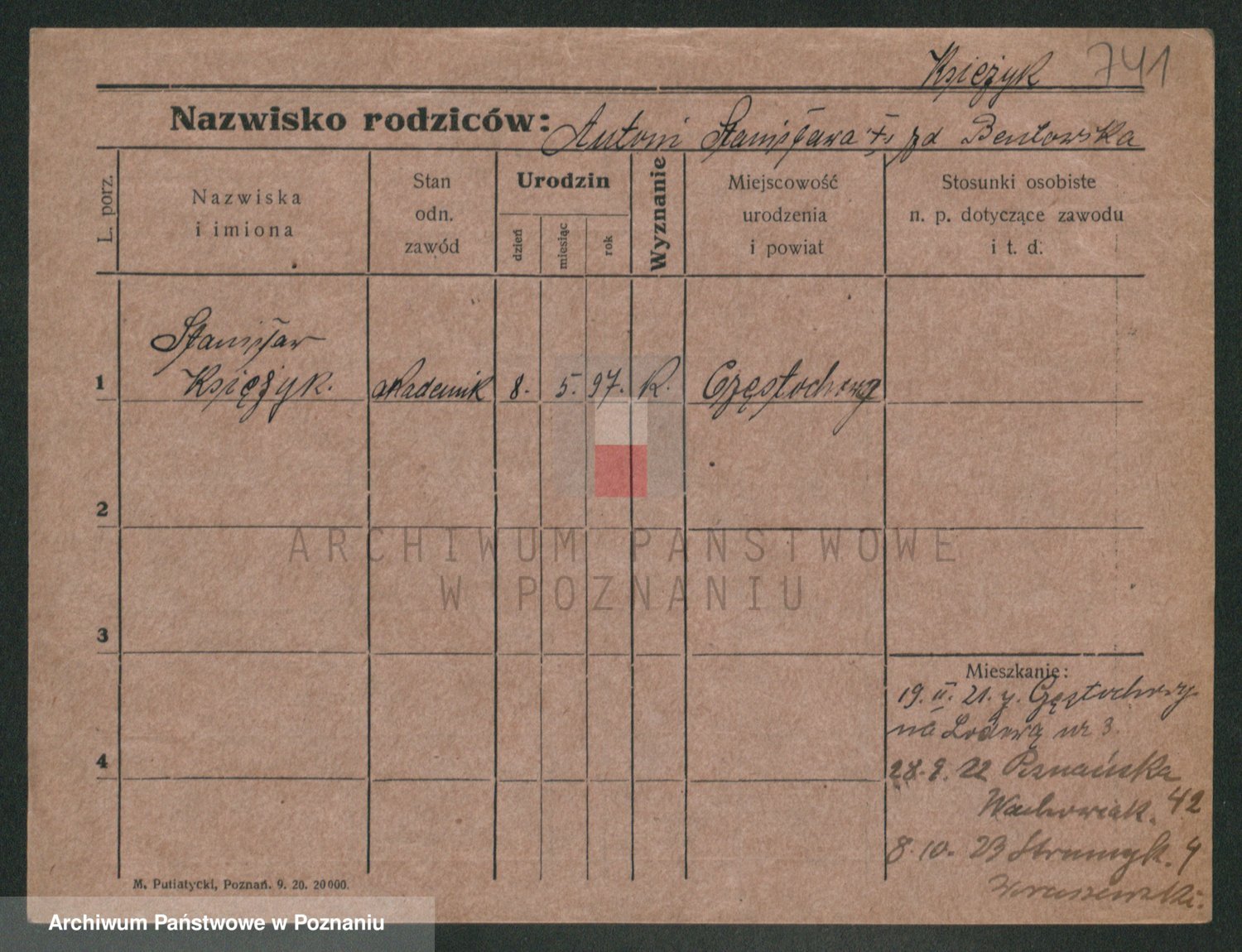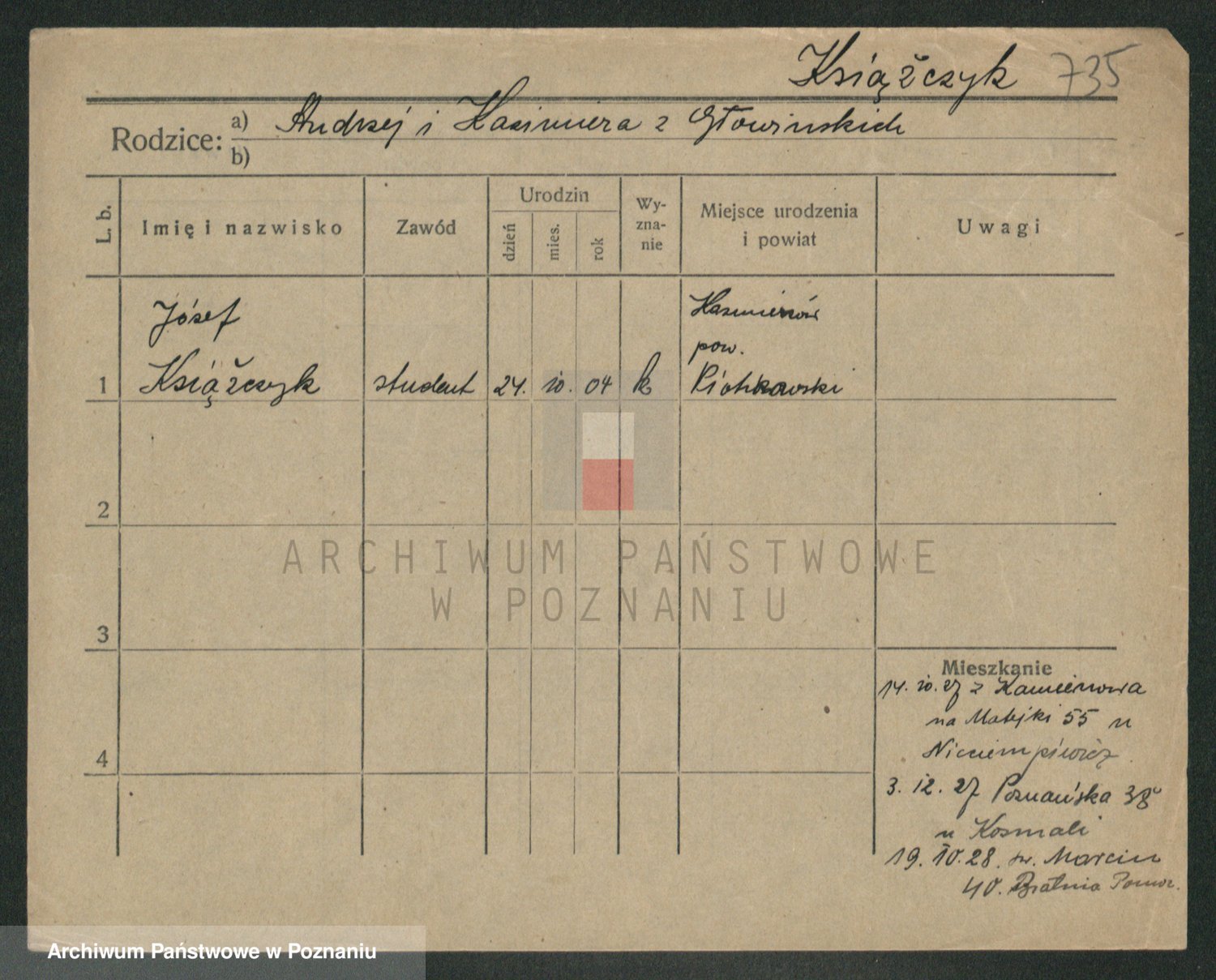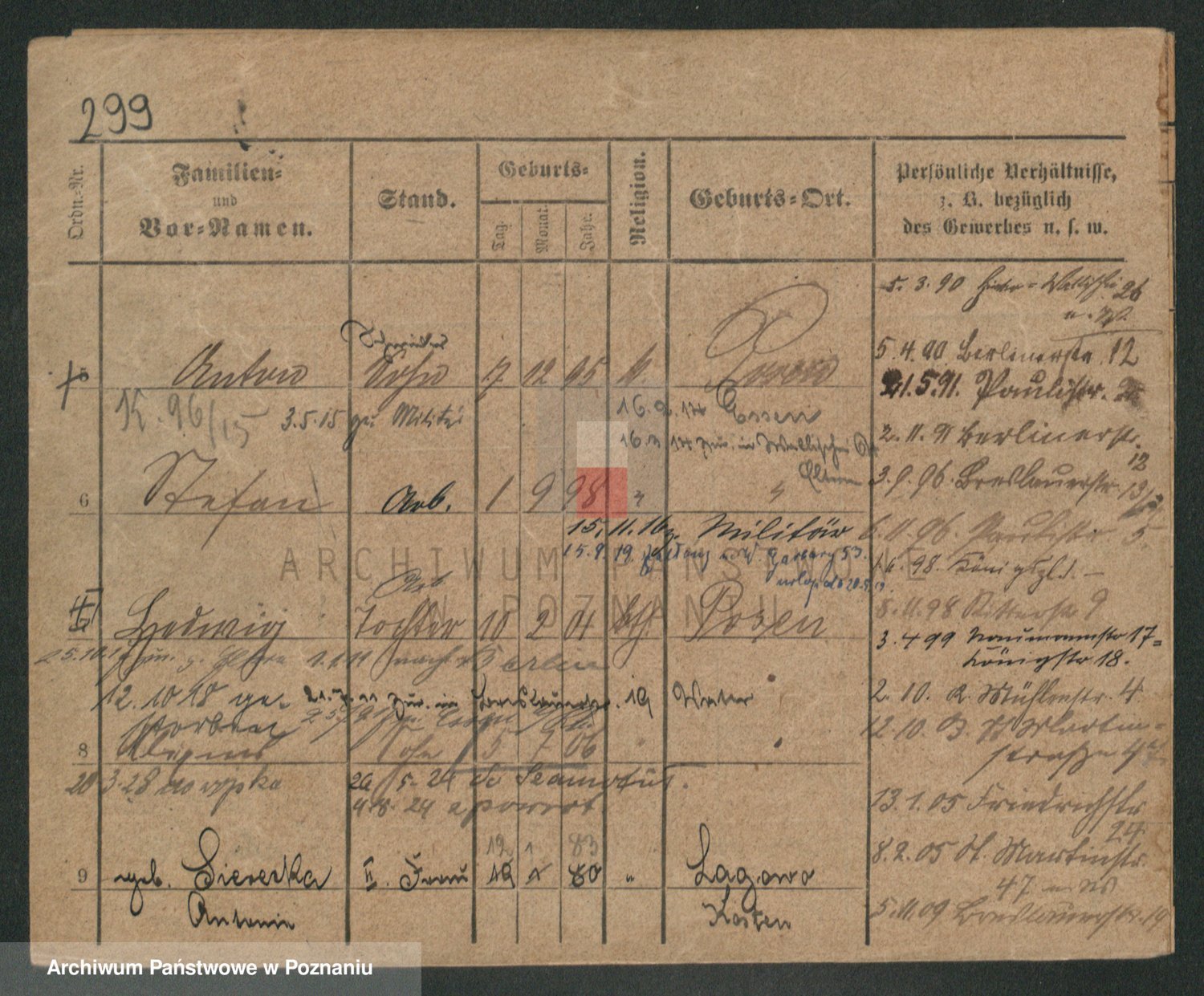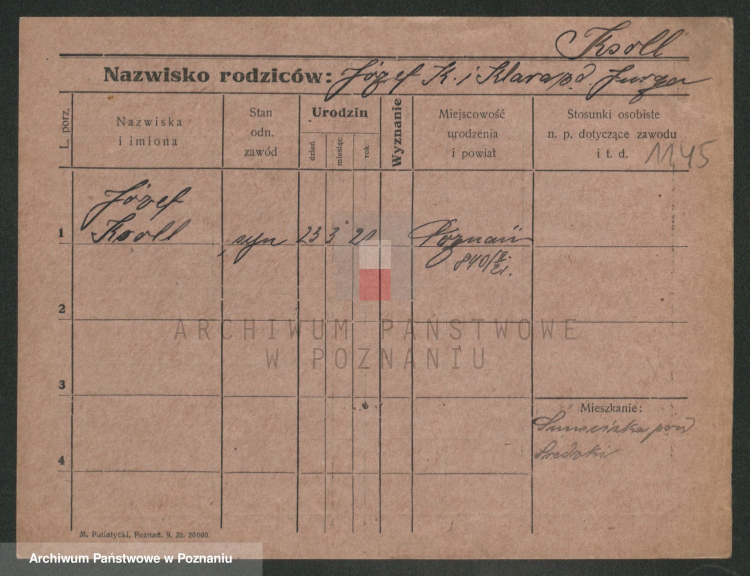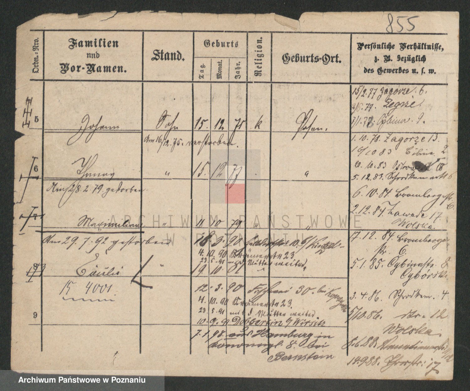 Podgląd karty osobowej dostępny jest po kliknięciu na nazwisko lub ikonkę karty. Można dokonywać powiększenia (ikony na górze) lub przechodzić między kolejnymi skanami (strzałki po bokach).
