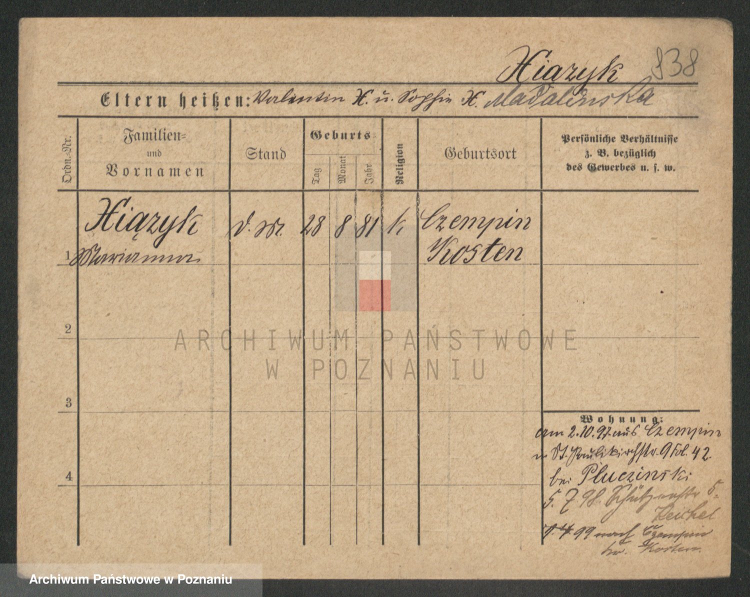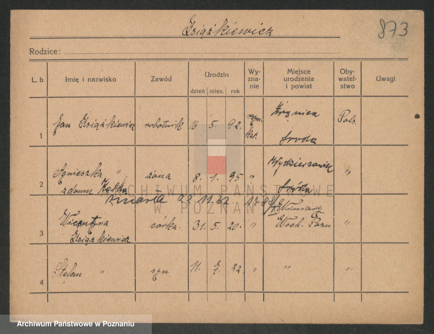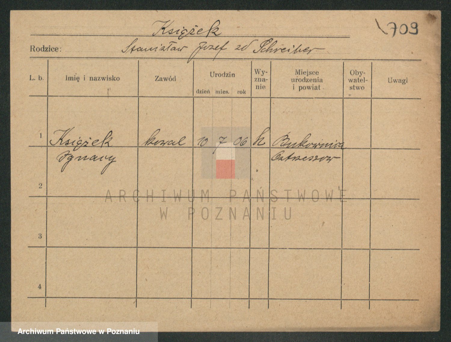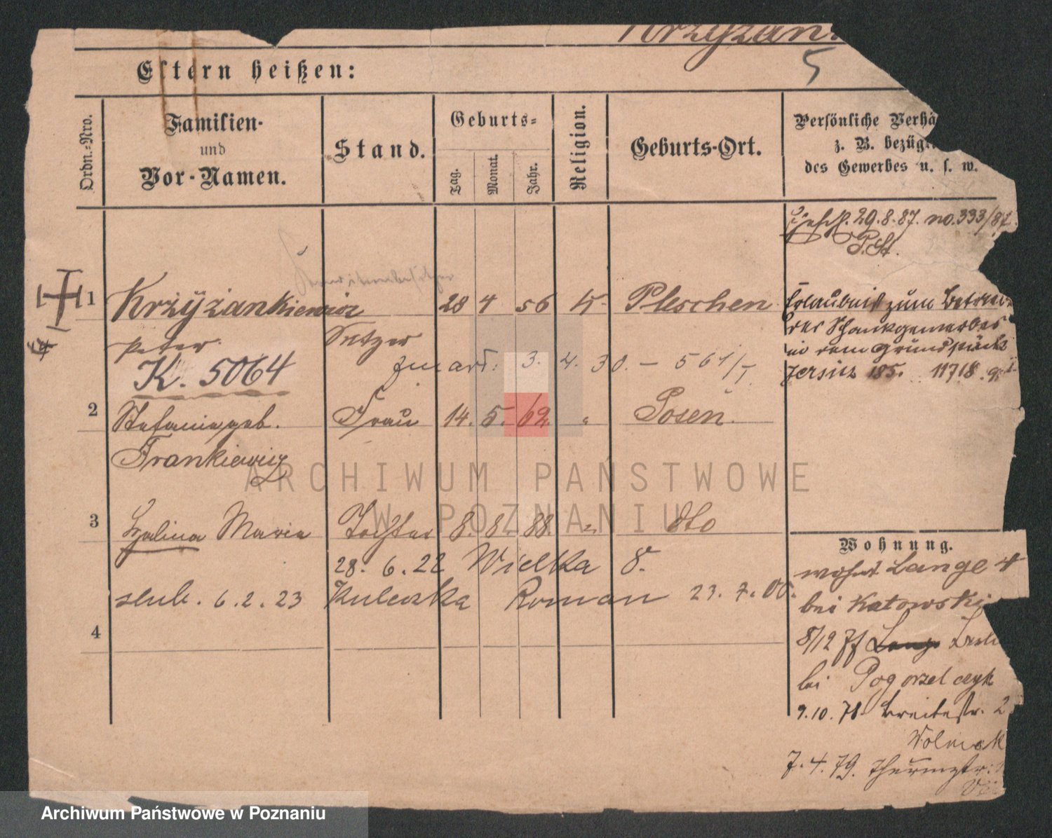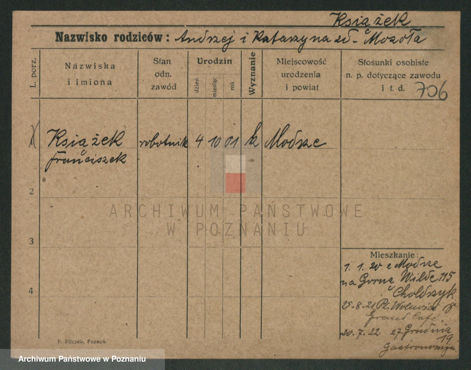 Podgląd karty osobowej dostępny jest po kliknięciu na nazwisko lub ikonkę karty. Można dokonywać powiększenia (ikony na górze) lub przechodzić między kolejnymi skanami (strzałki po bokach).