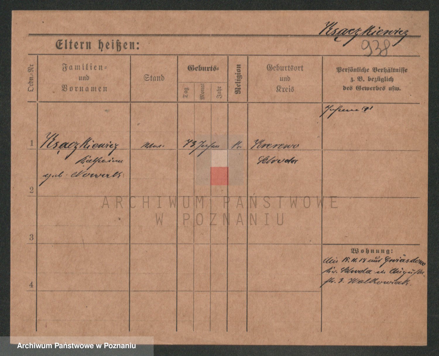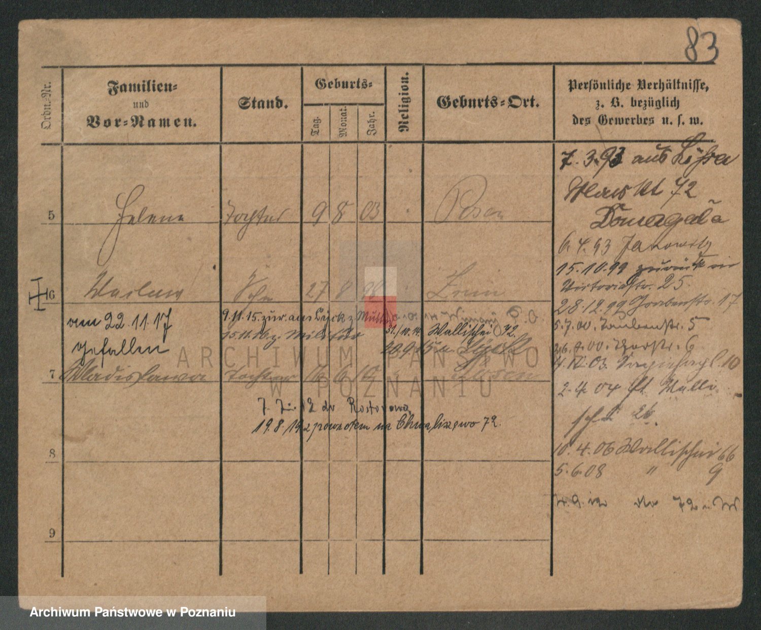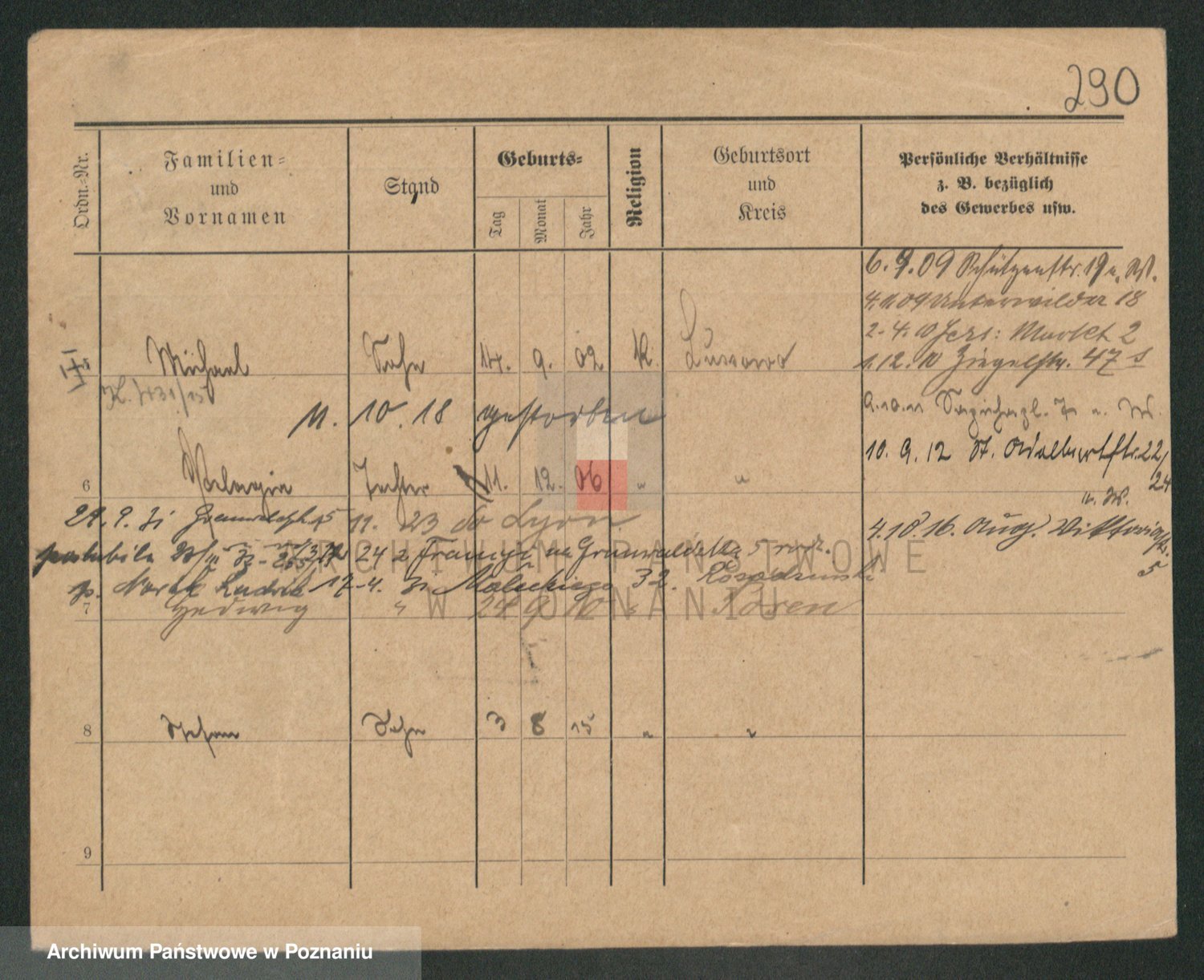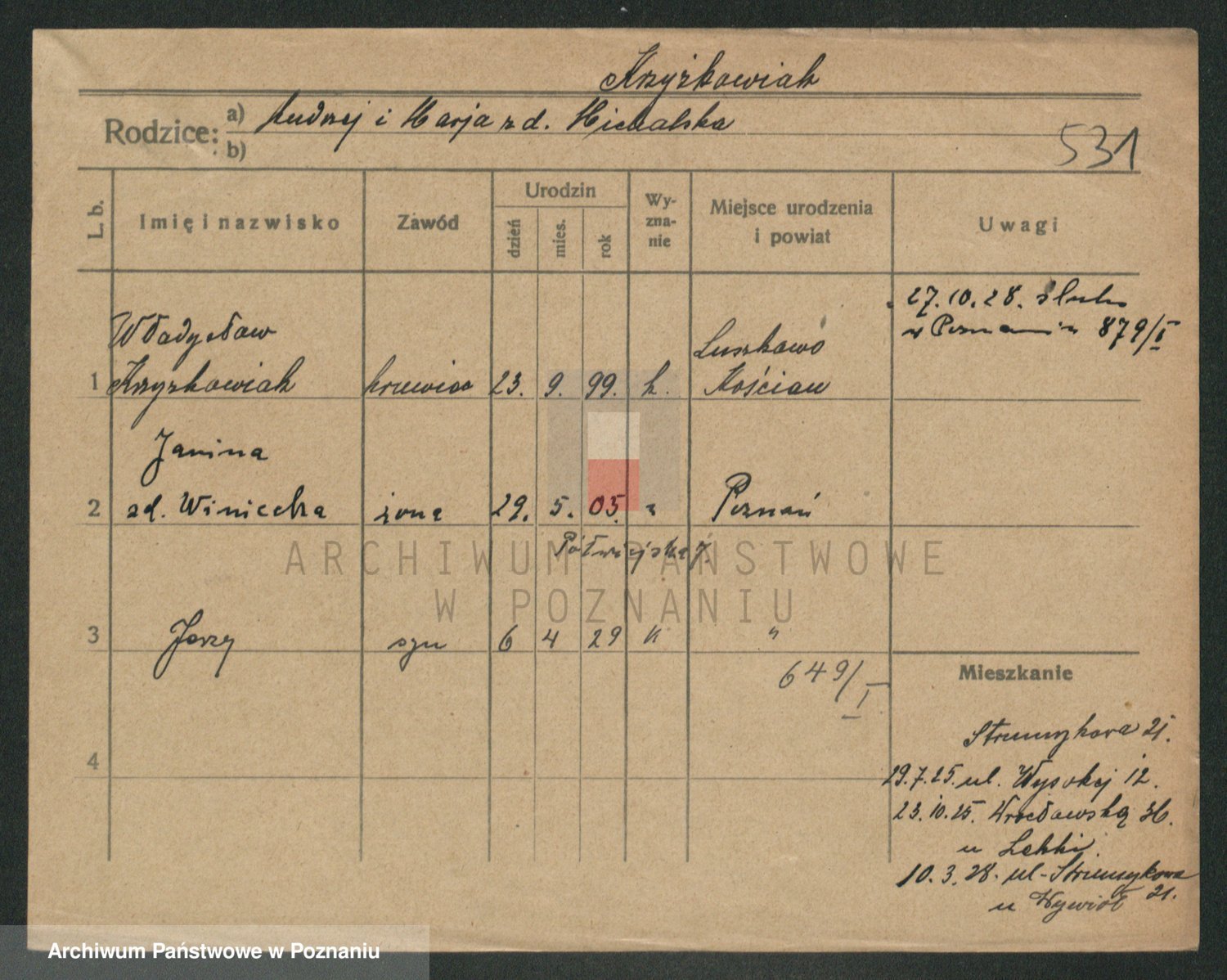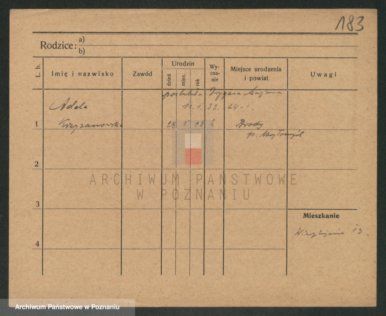 Podgląd karty osobowej dostępny jest po kliknięciu na nazwisko lub ikonkę karty. Można dokonywać powiększenia (ikony na górze) lub przechodzić między kolejnymi skanami (strzałki po bokach).