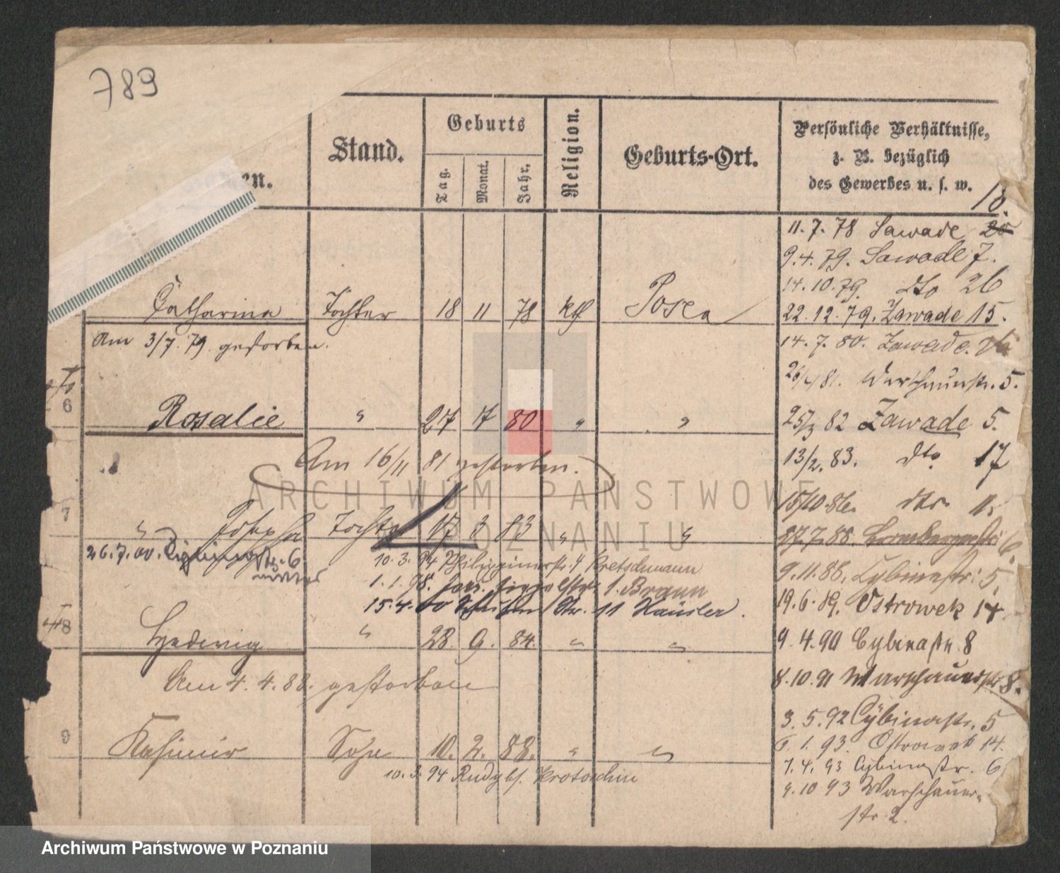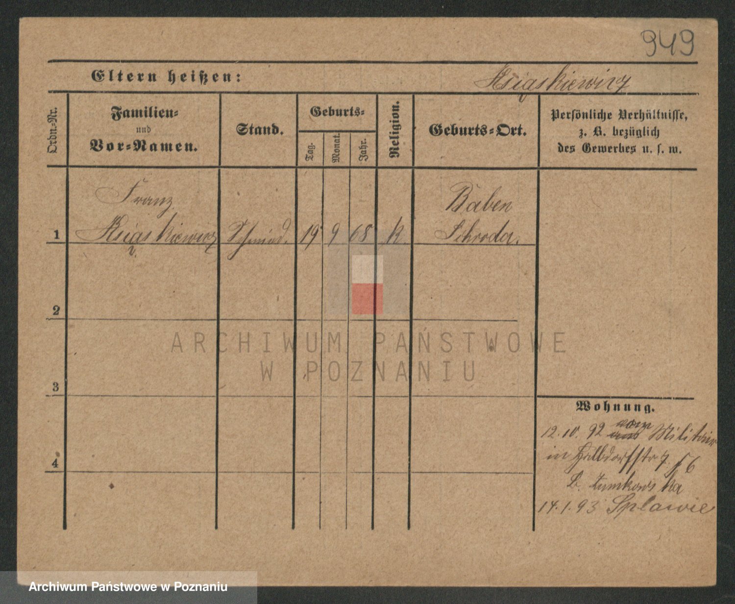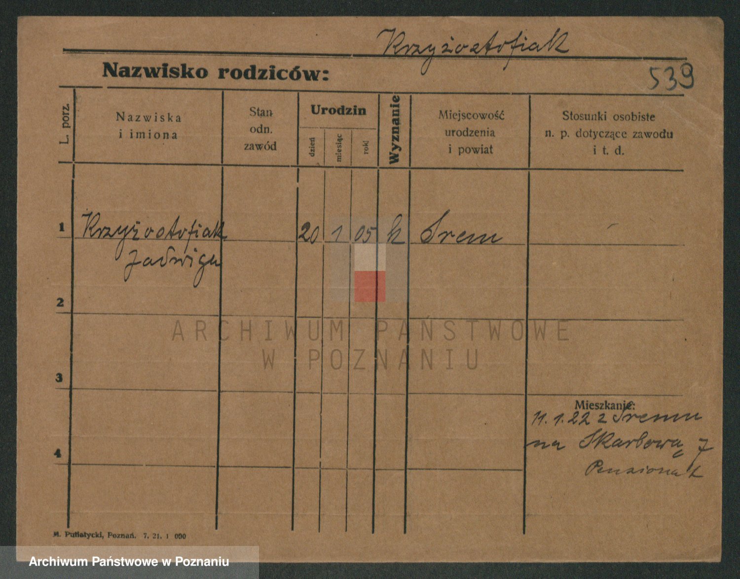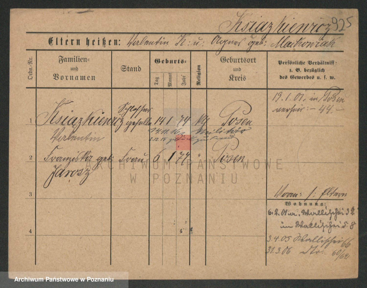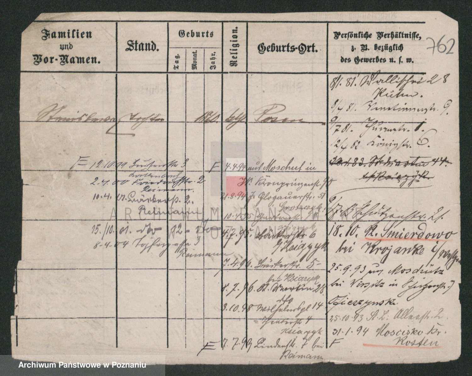 Podgląd karty osobowej dostępny jest po kliknięciu na nazwisko lub ikonkę karty. Można dokonywać powiększenia (ikony na górze) lub przechodzić między kolejnymi skanami (strzałki po bokach).