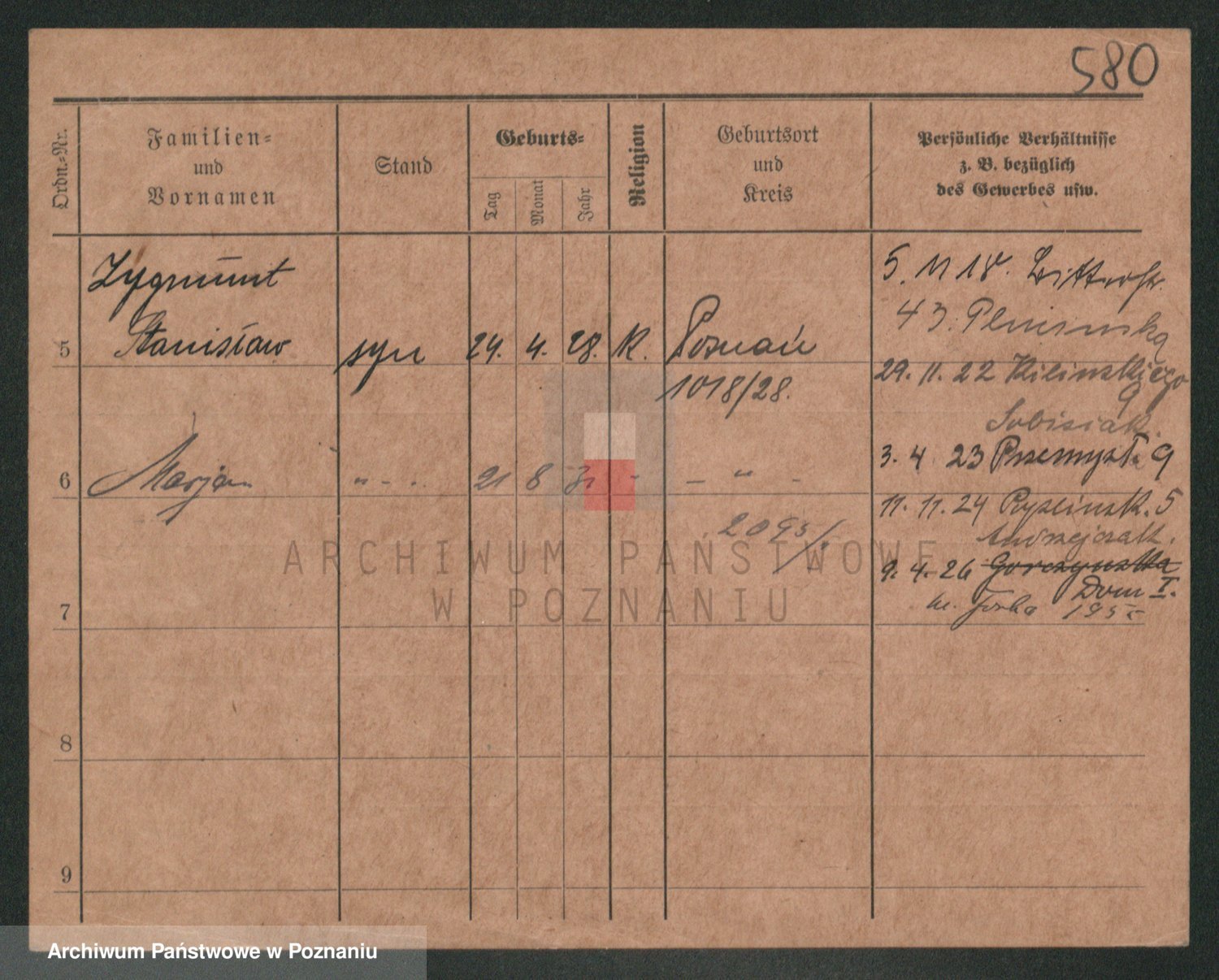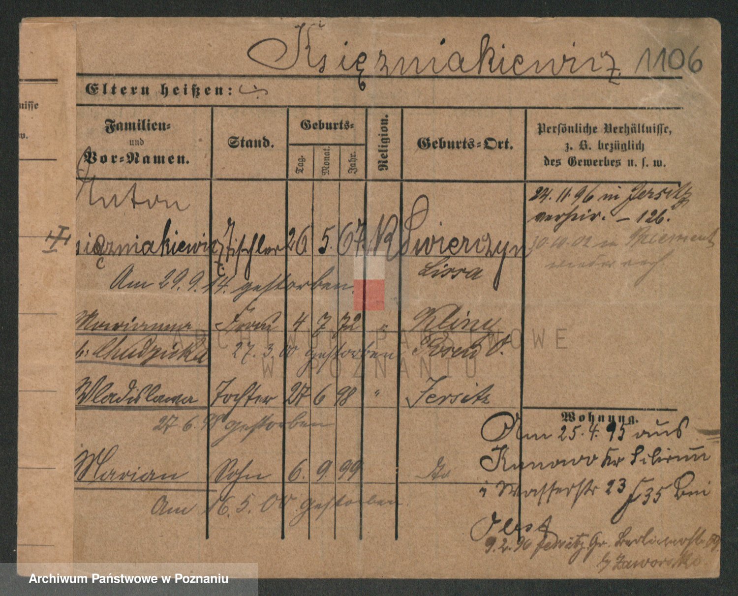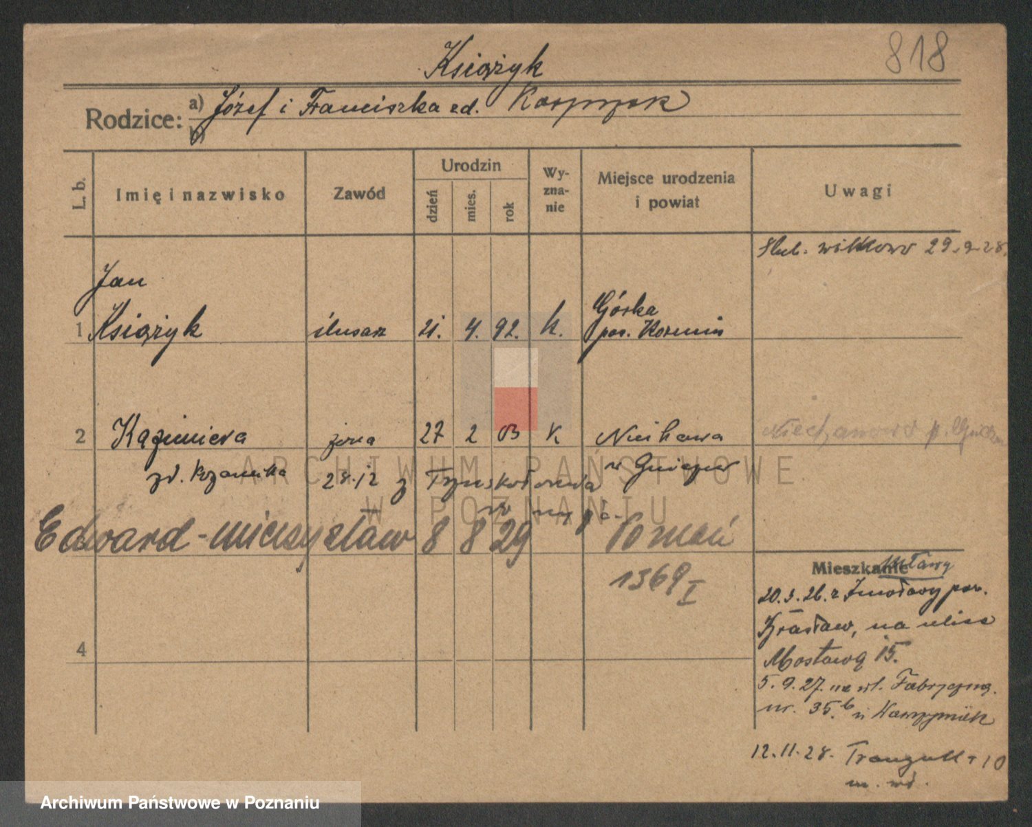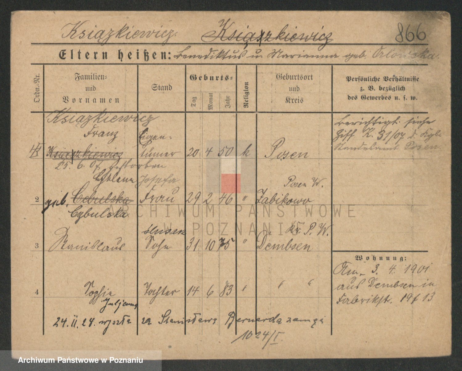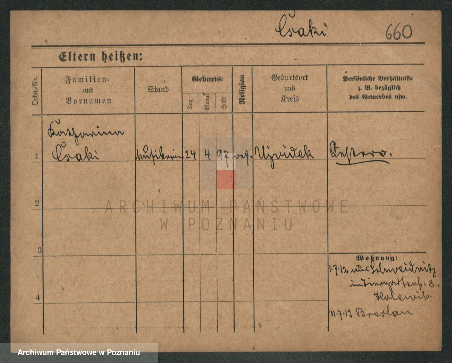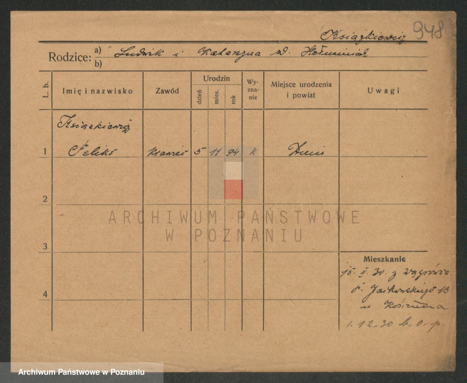 Podgląd karty osobowej dostępny jest po kliknięciu na nazwisko lub ikonkę karty. Można dokonywać powiększenia (ikony na górze) lub przechodzić między kolejnymi skanami (strzałki po bokach).
