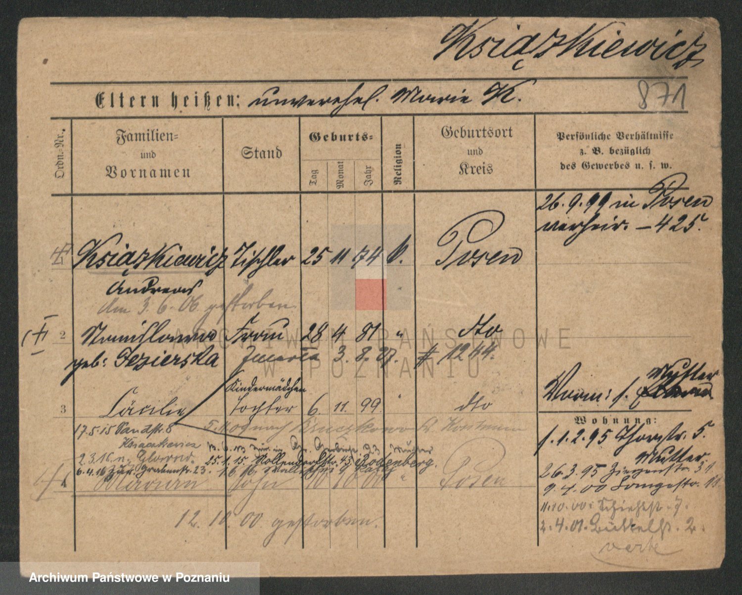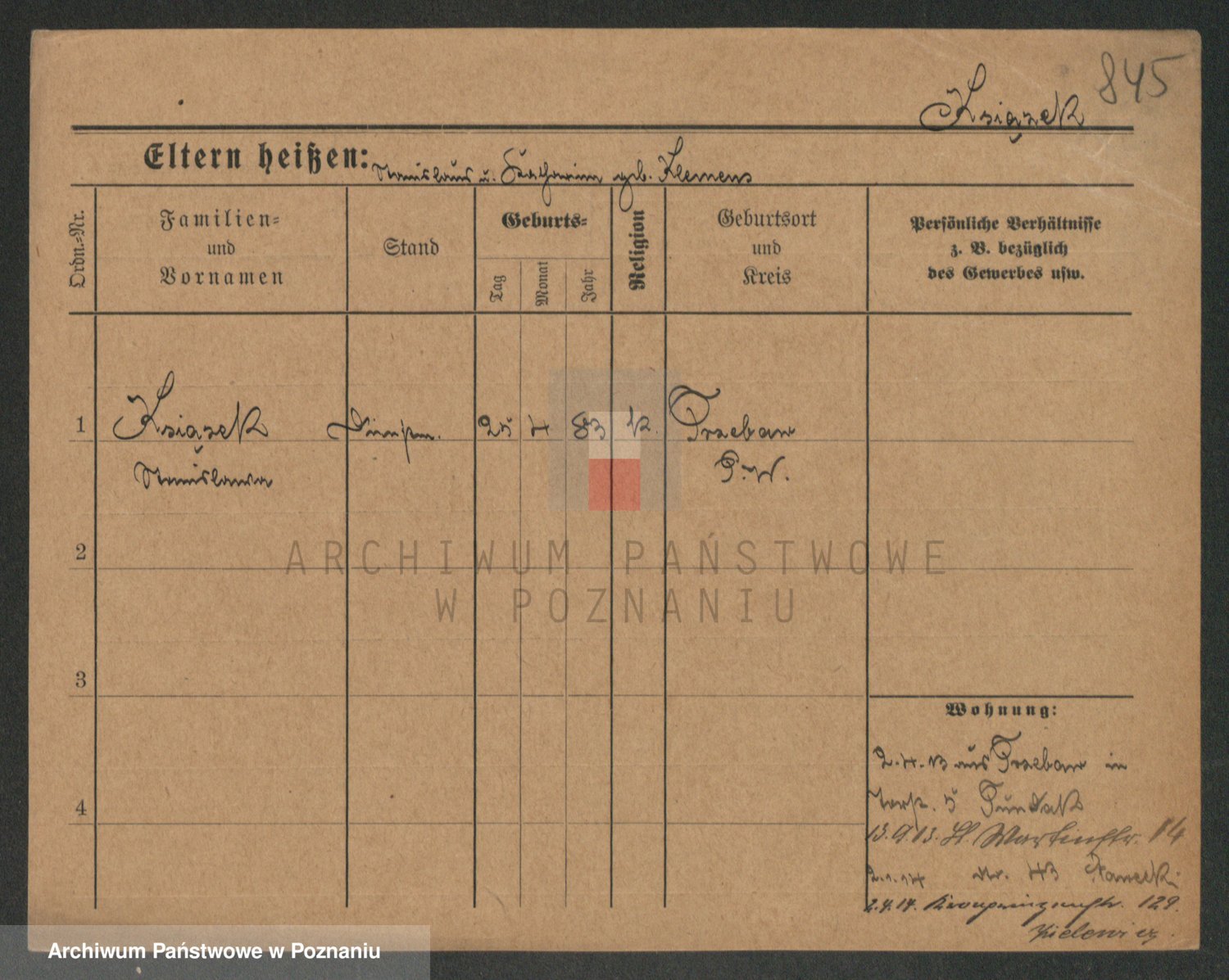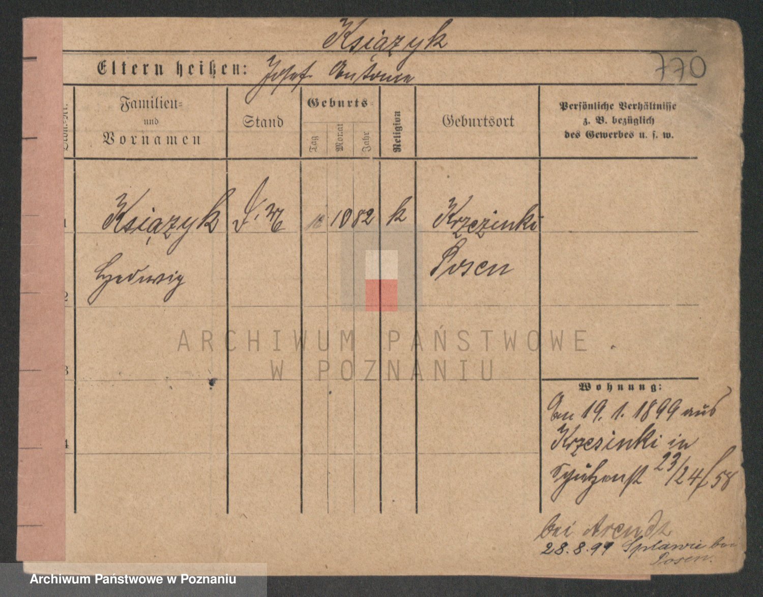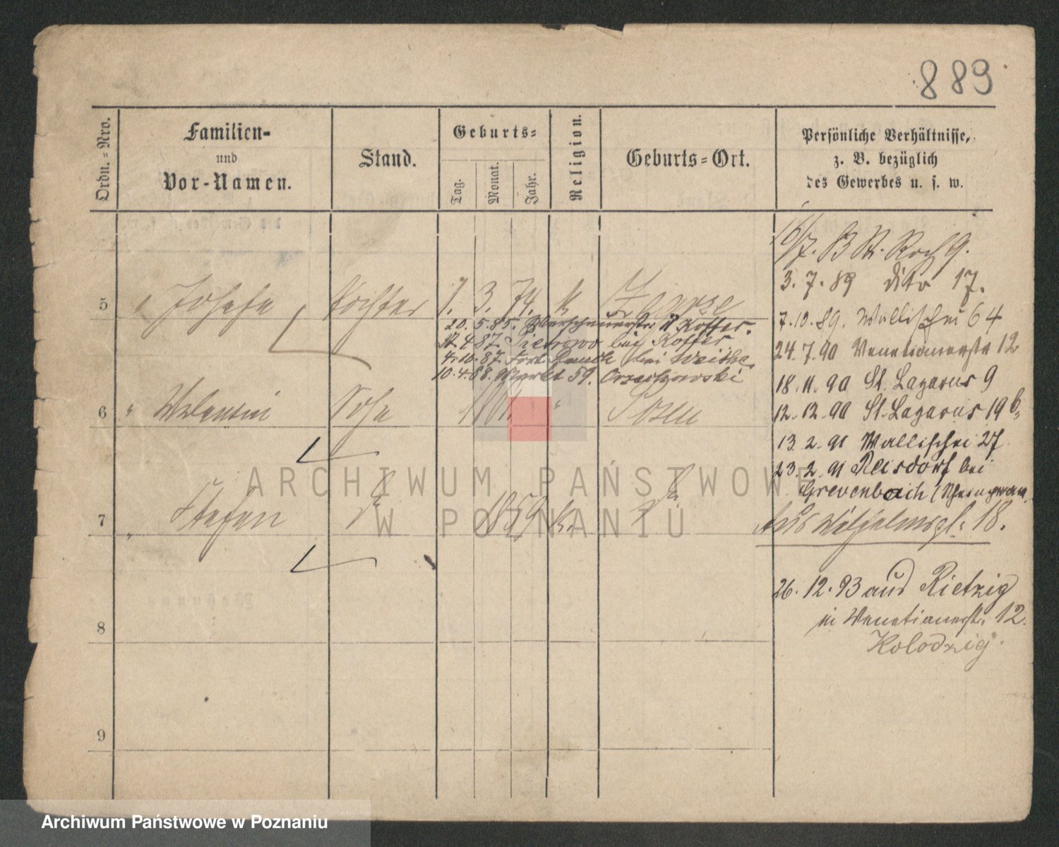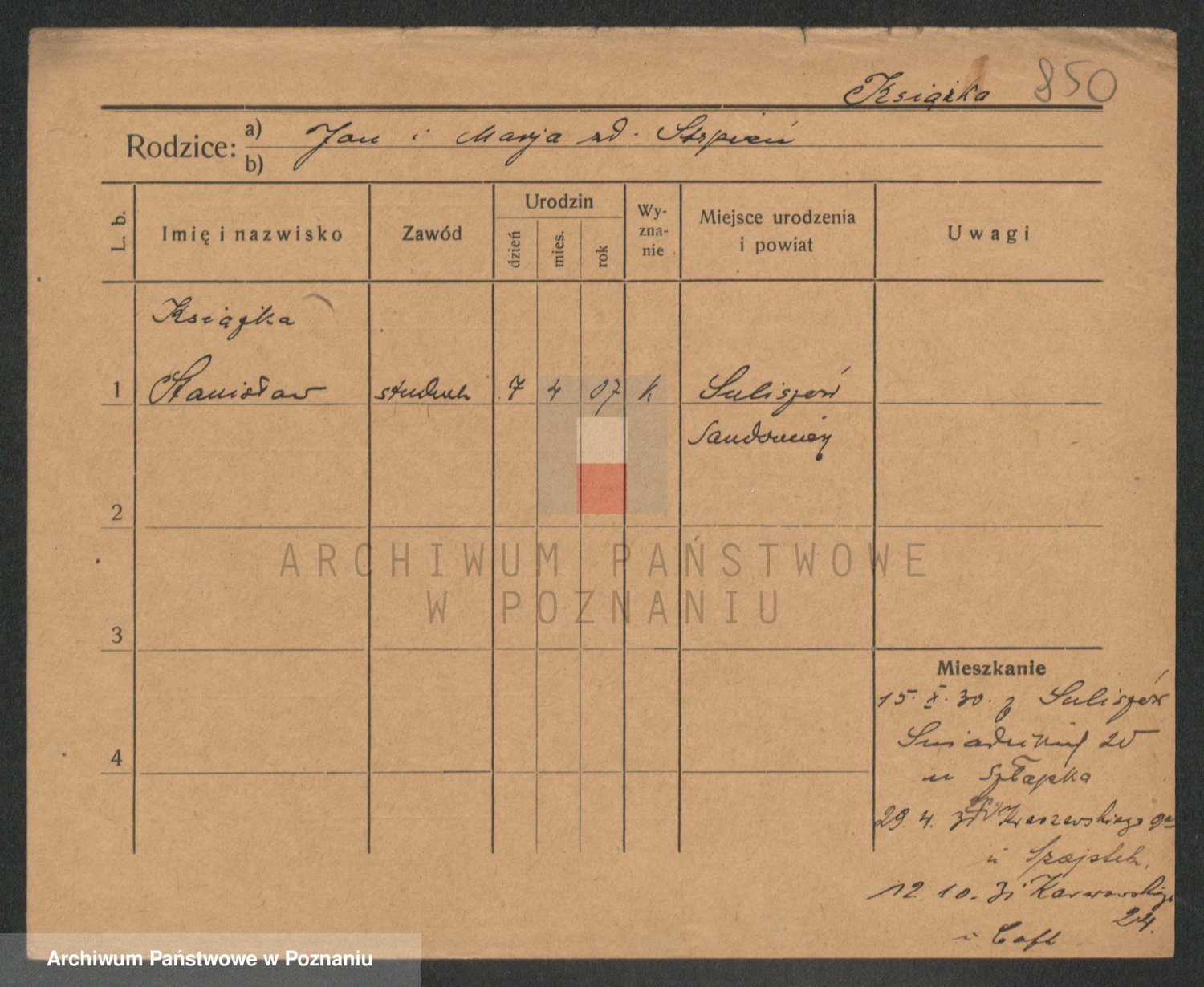 Podgląd karty osobowej dostępny jest po kliknięciu na nazwisko lub ikonkę karty. Można dokonywać powiększenia (ikony na górze) lub przechodzić między kolejnymi skanami (strzałki po bokach).