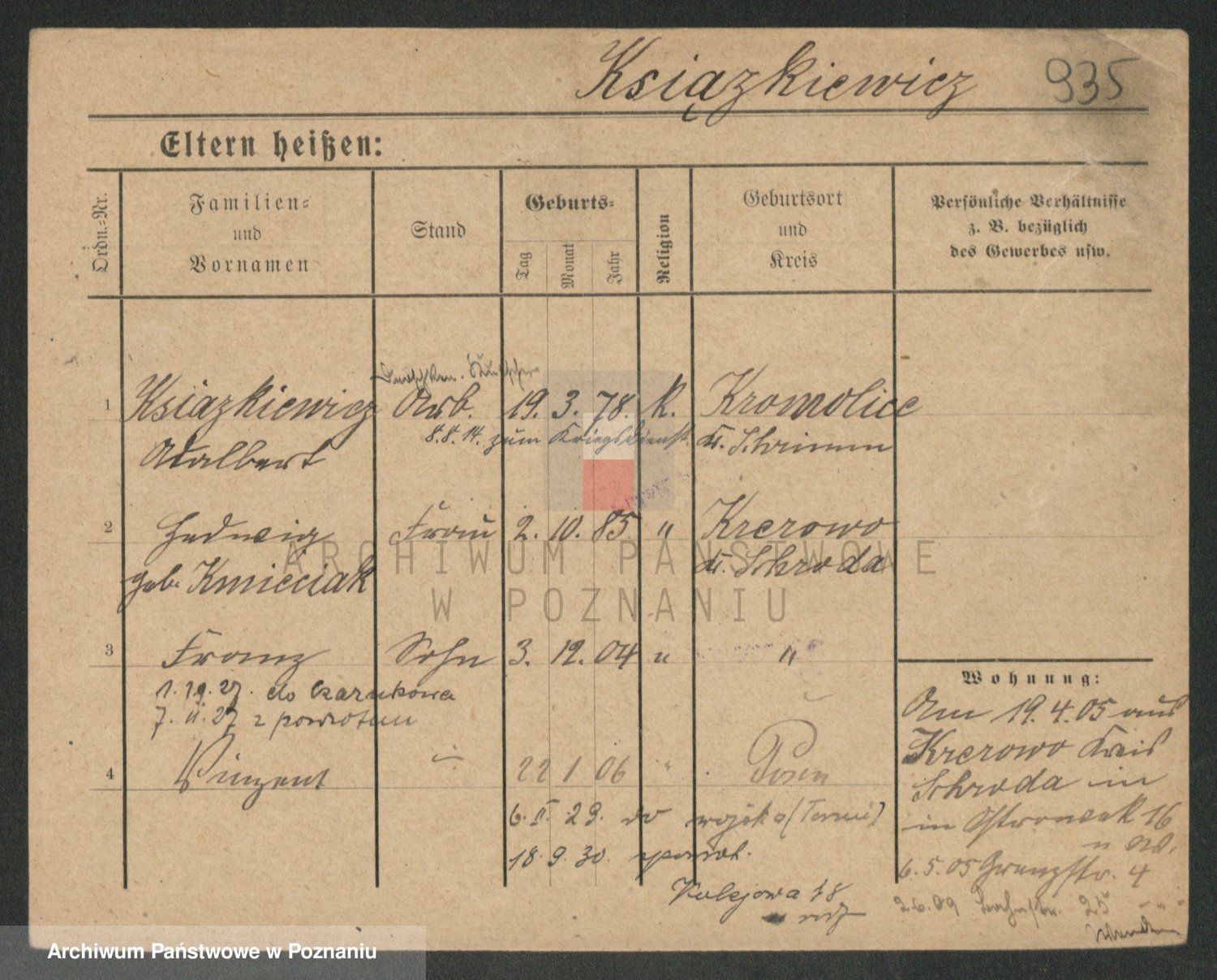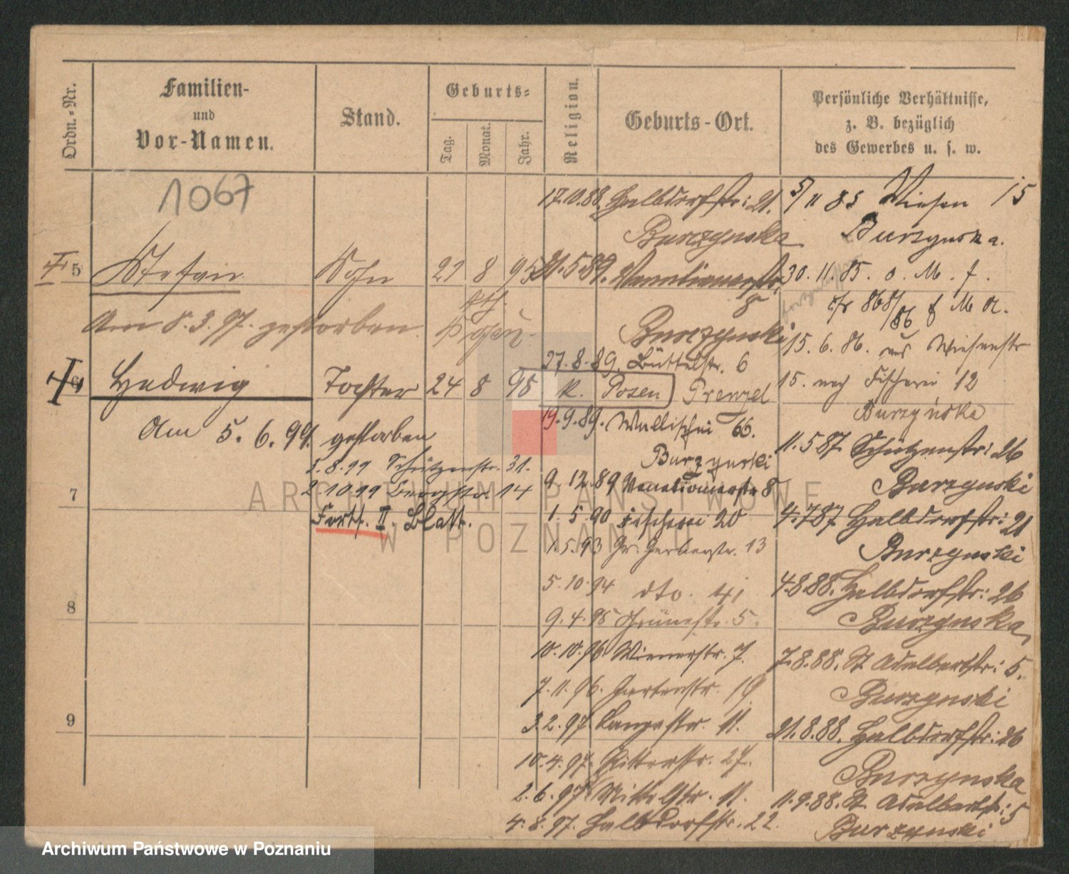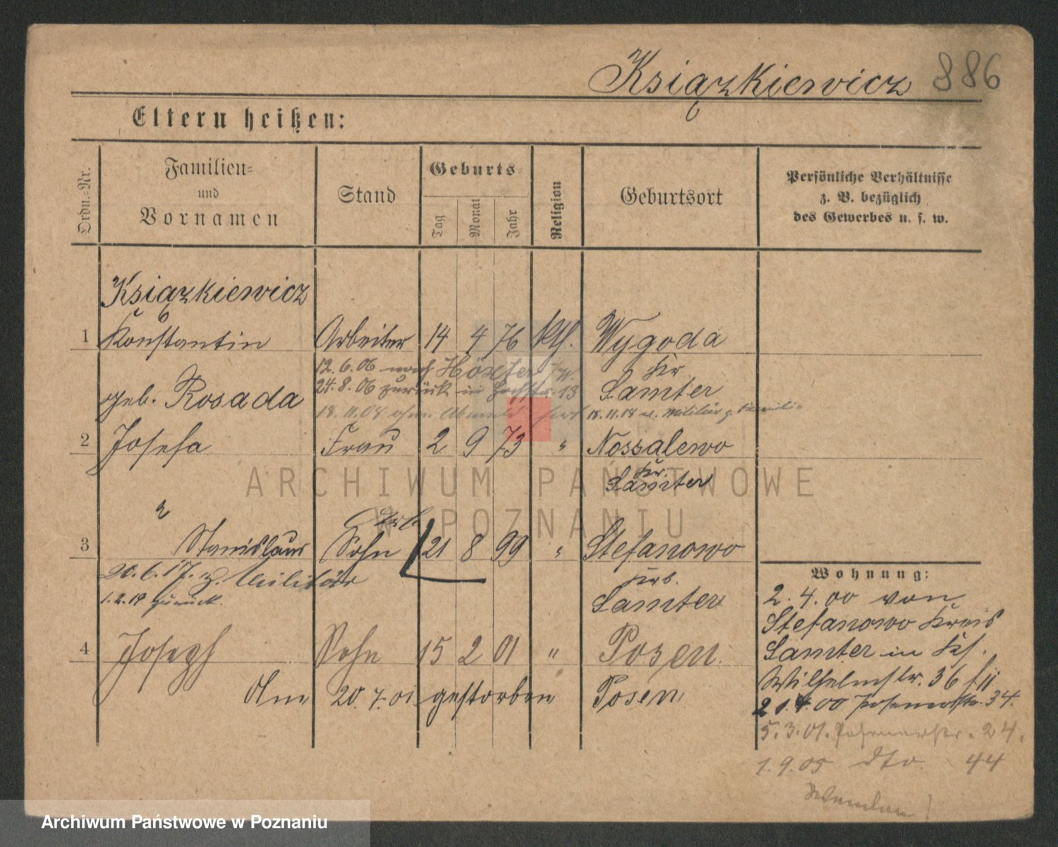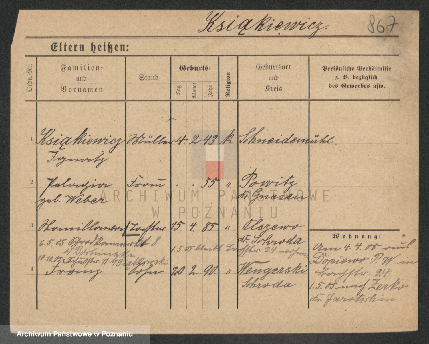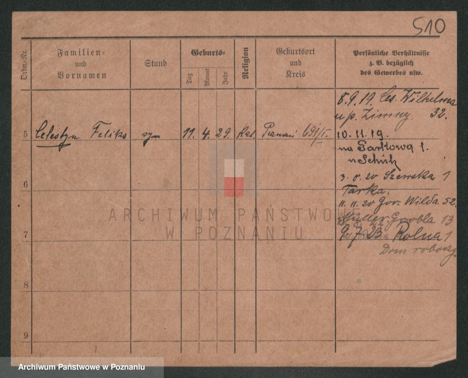 Podgląd karty osobowej dostępny jest po kliknięciu na nazwisko lub ikonkę karty. Można dokonywać powiększenia (ikony na górze) lub przechodzić między kolejnymi skanami (strzałki po bokach).