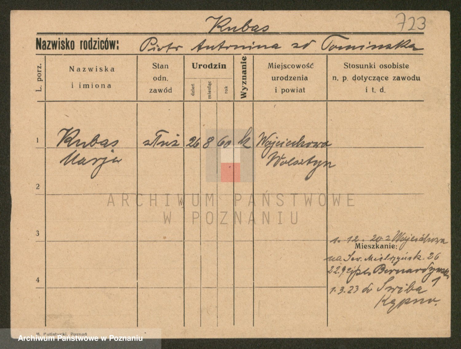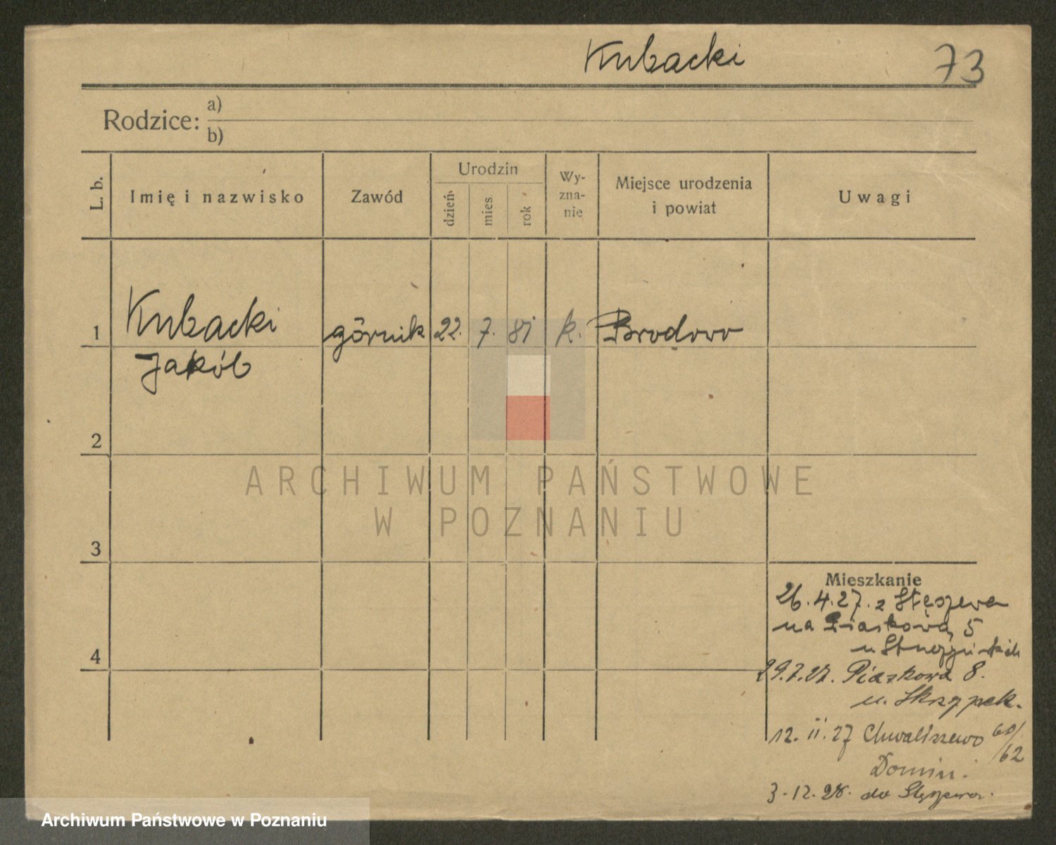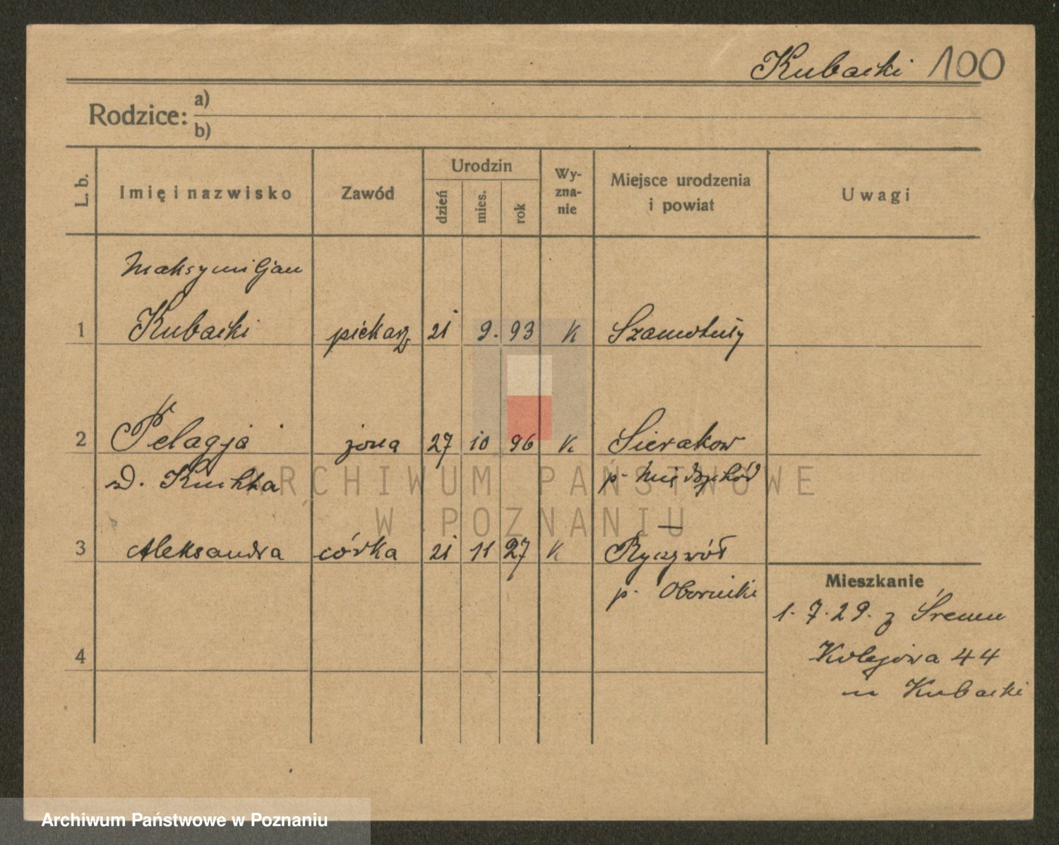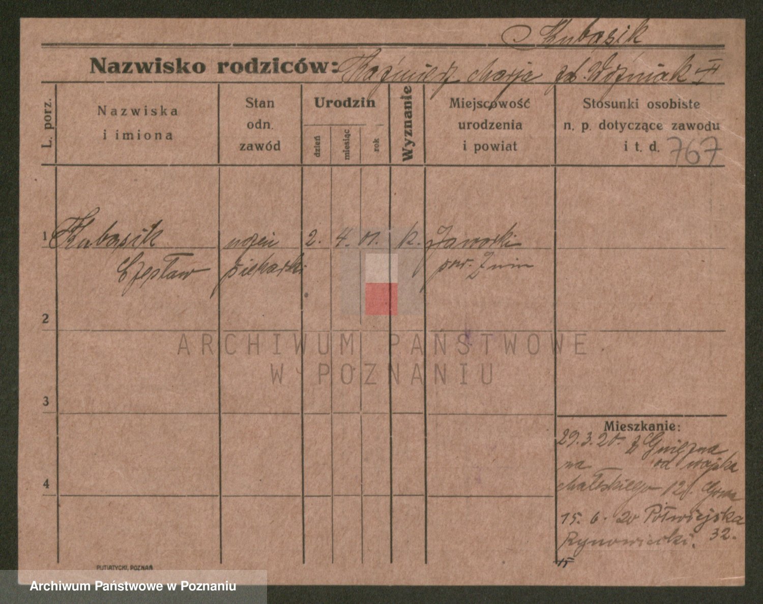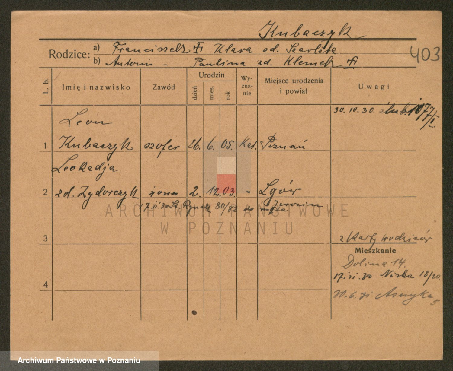 Podgląd karty osobowej dostępny jest po kliknięciu na nazwisko lub ikonkę karty. Można dokonywać powiększenia (ikony na górze) lub przechodzić między kolejnymi skanami (strzałki po bokach).