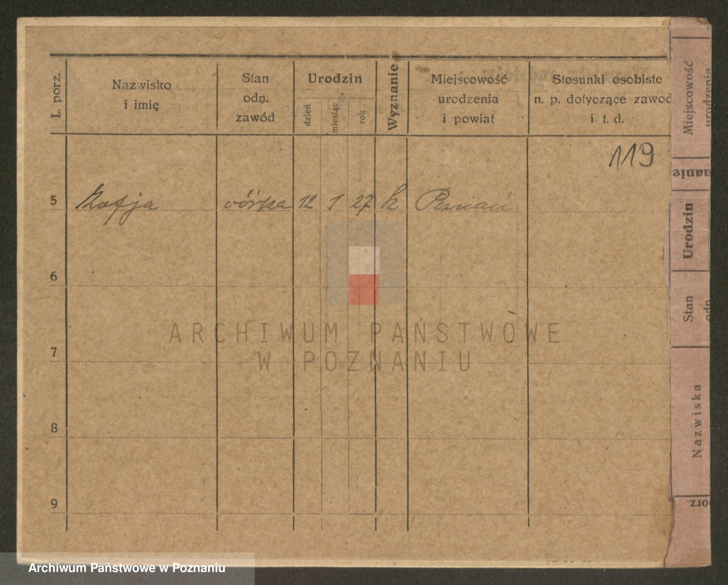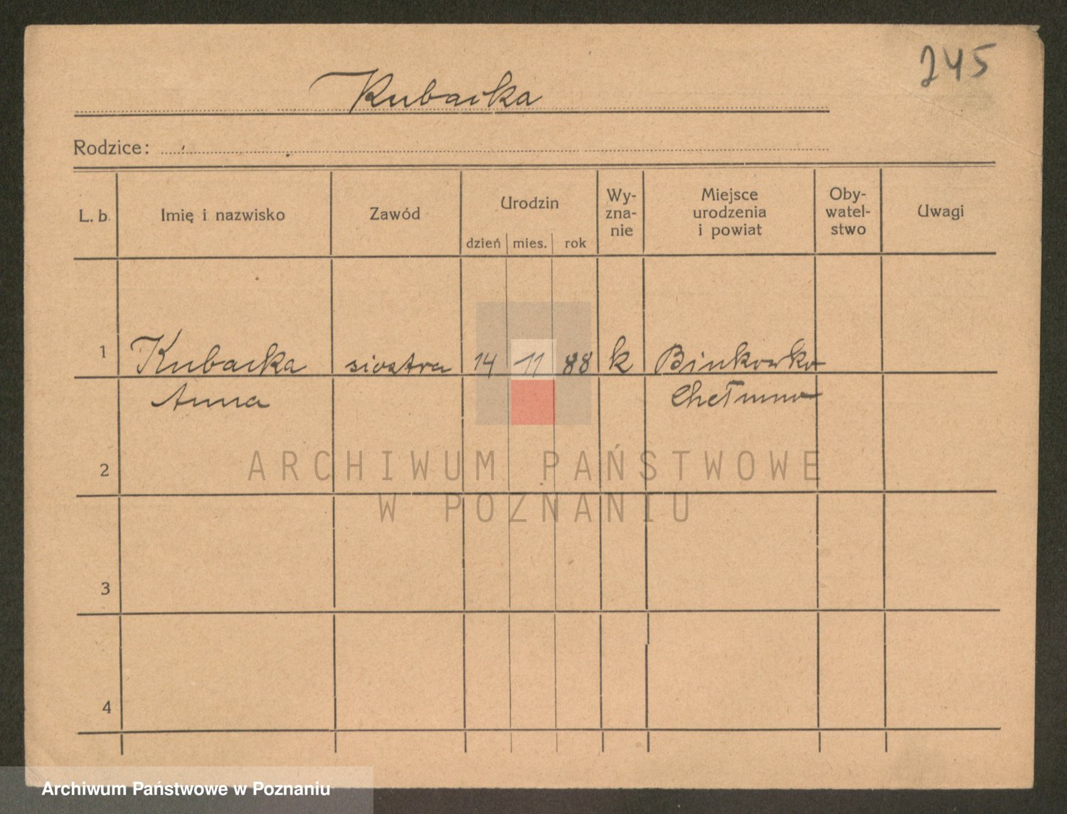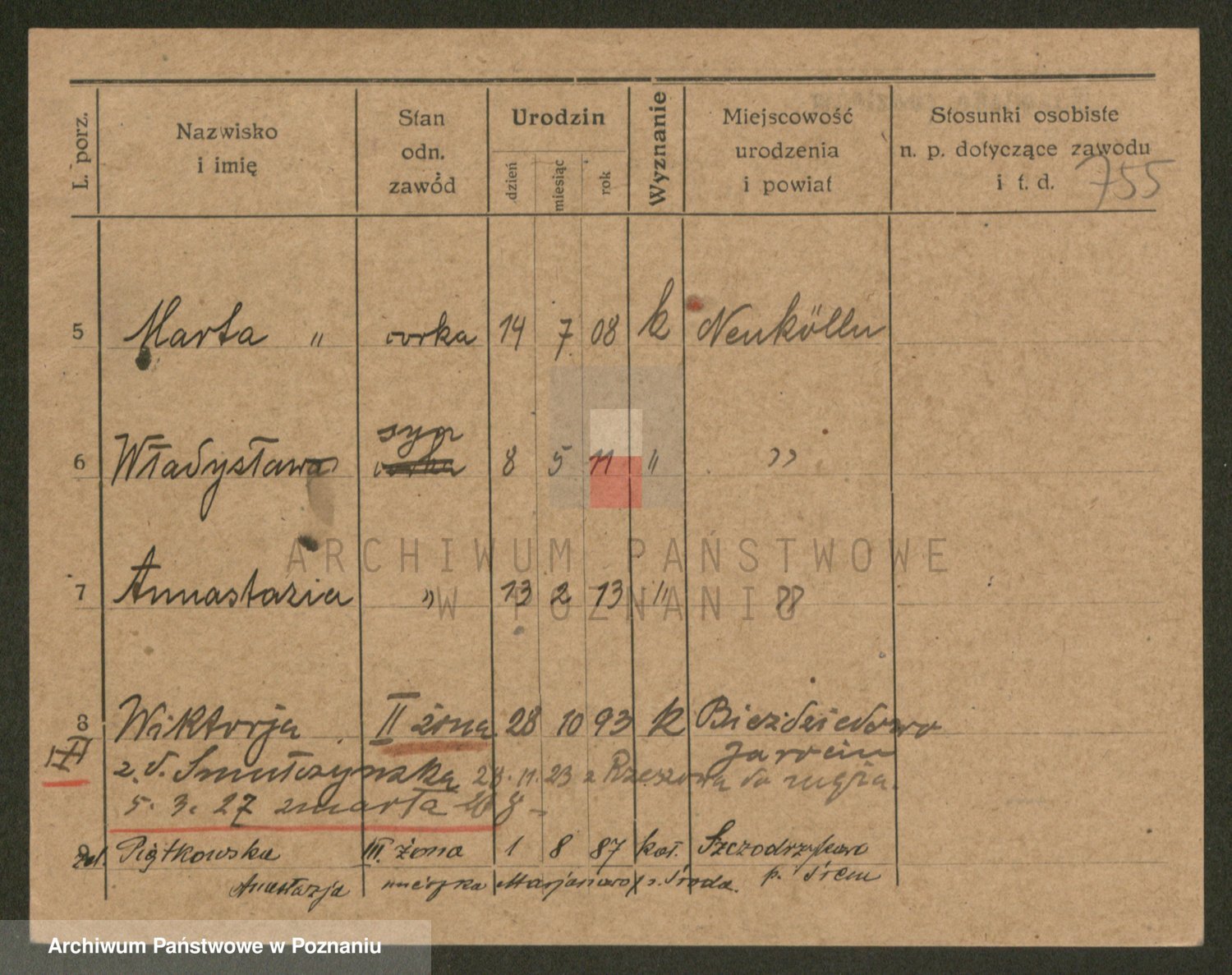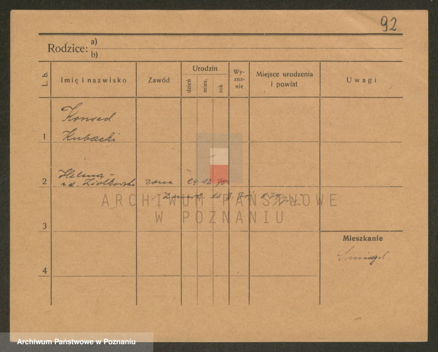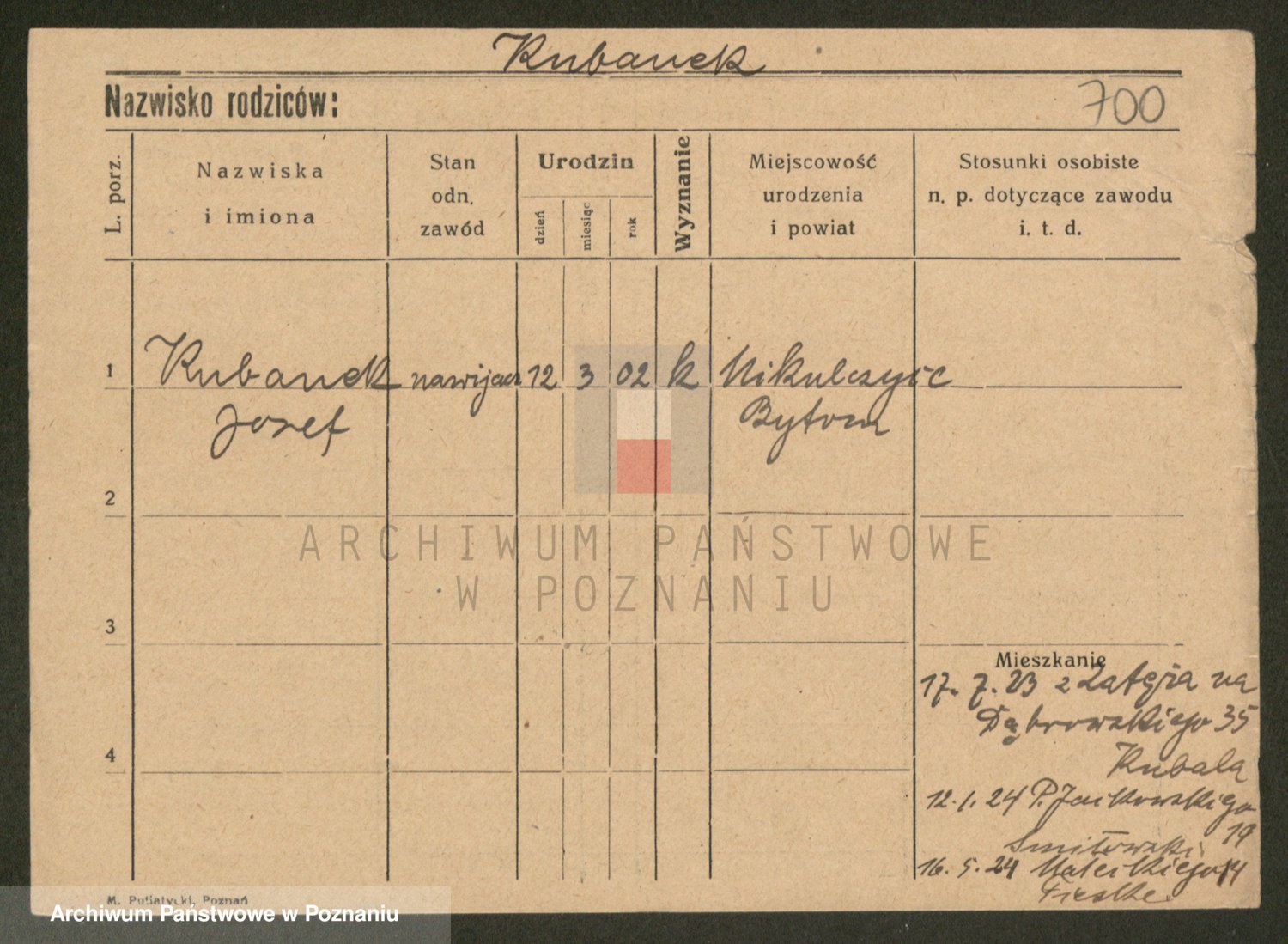 Podgląd karty osobowej dostępny jest po kliknięciu na nazwisko lub ikonkę karty. Można dokonywać powiększenia (ikony na górze) lub przechodzić między kolejnymi skanami (strzałki po bokach).